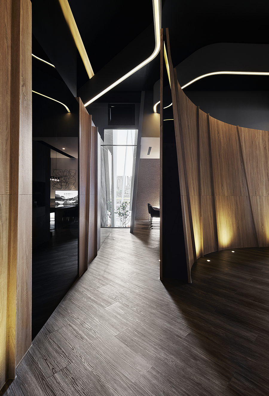 空间布局:在平面設計上,跳脫制式化的直線設計,並以繚繞的動線將空間串連,形塑出獨特、非常規的空間型態,不僅令訪客如同漫步於森林之中,還能帶來彈性多元、逸趣橫生的空間體驗。