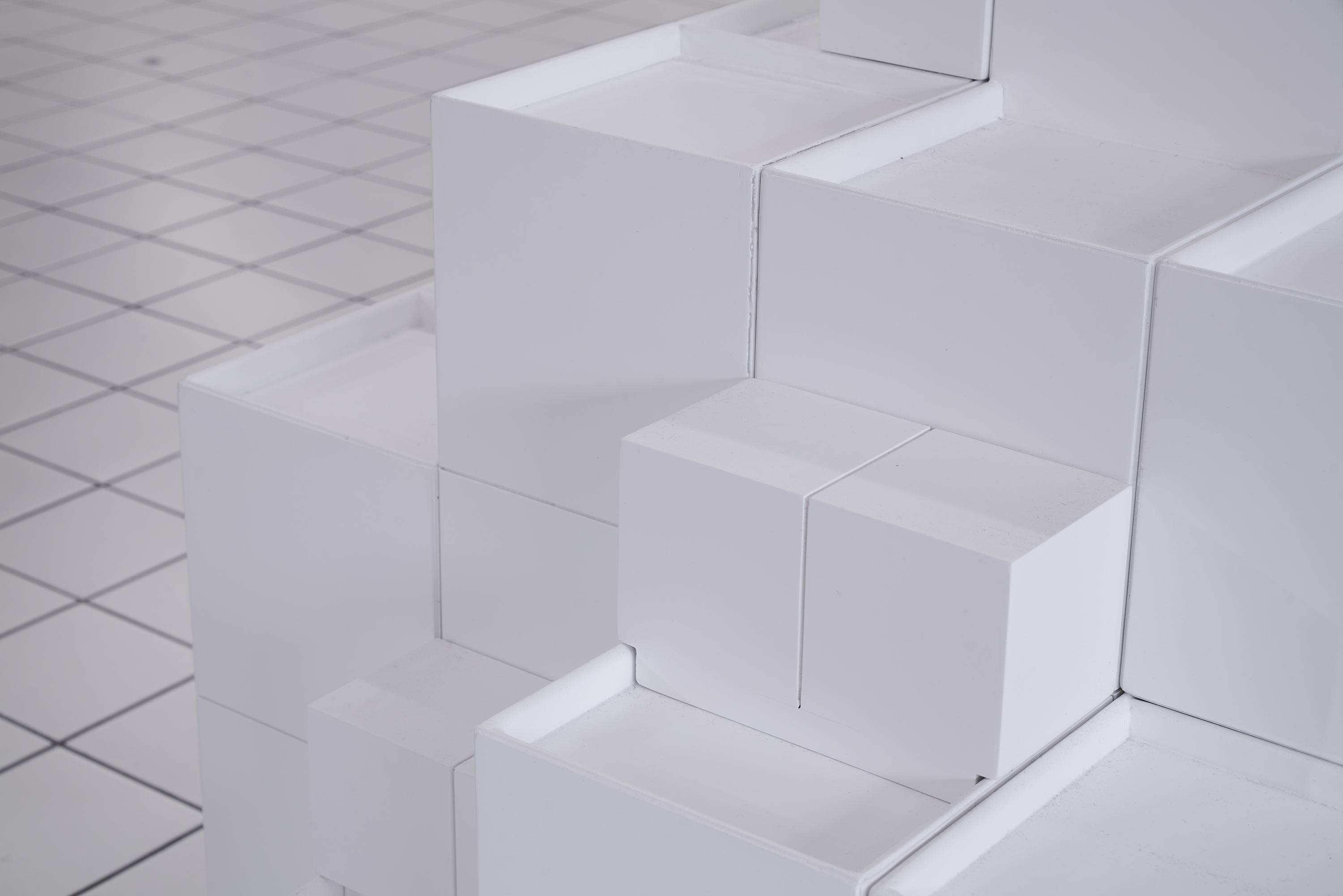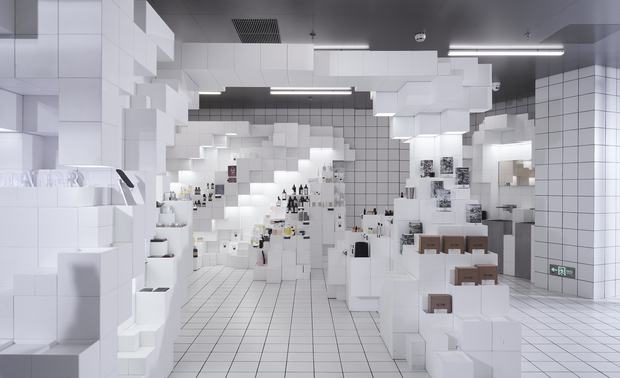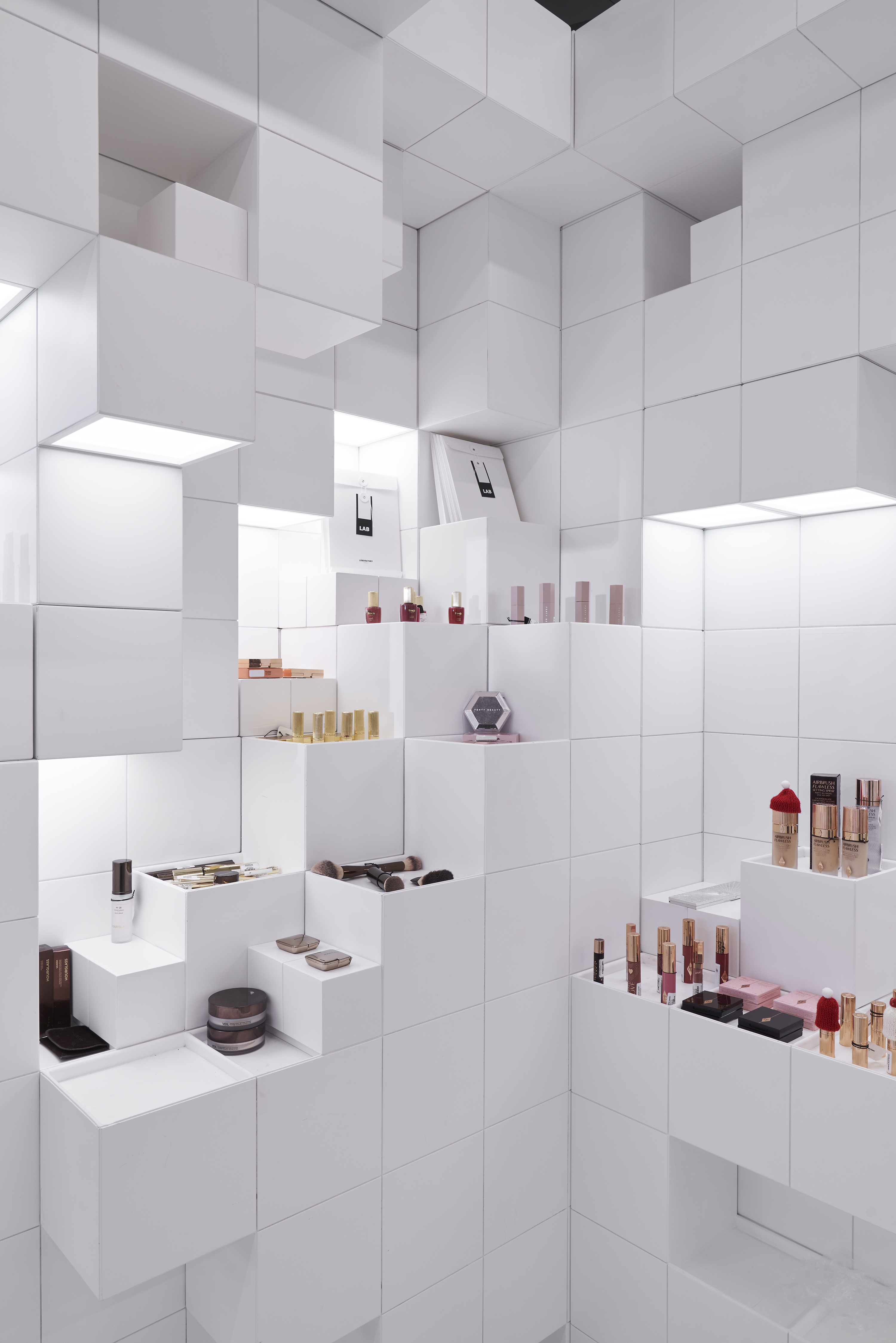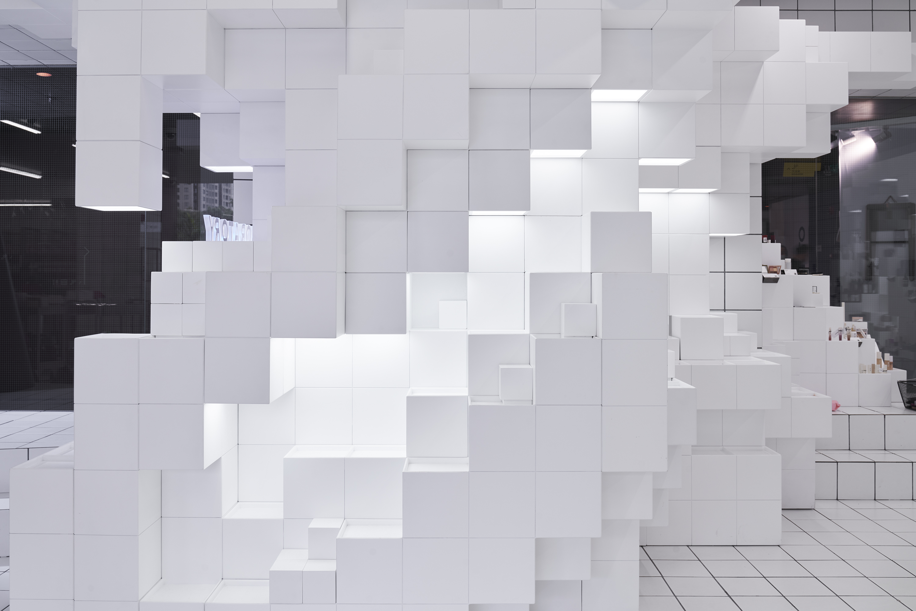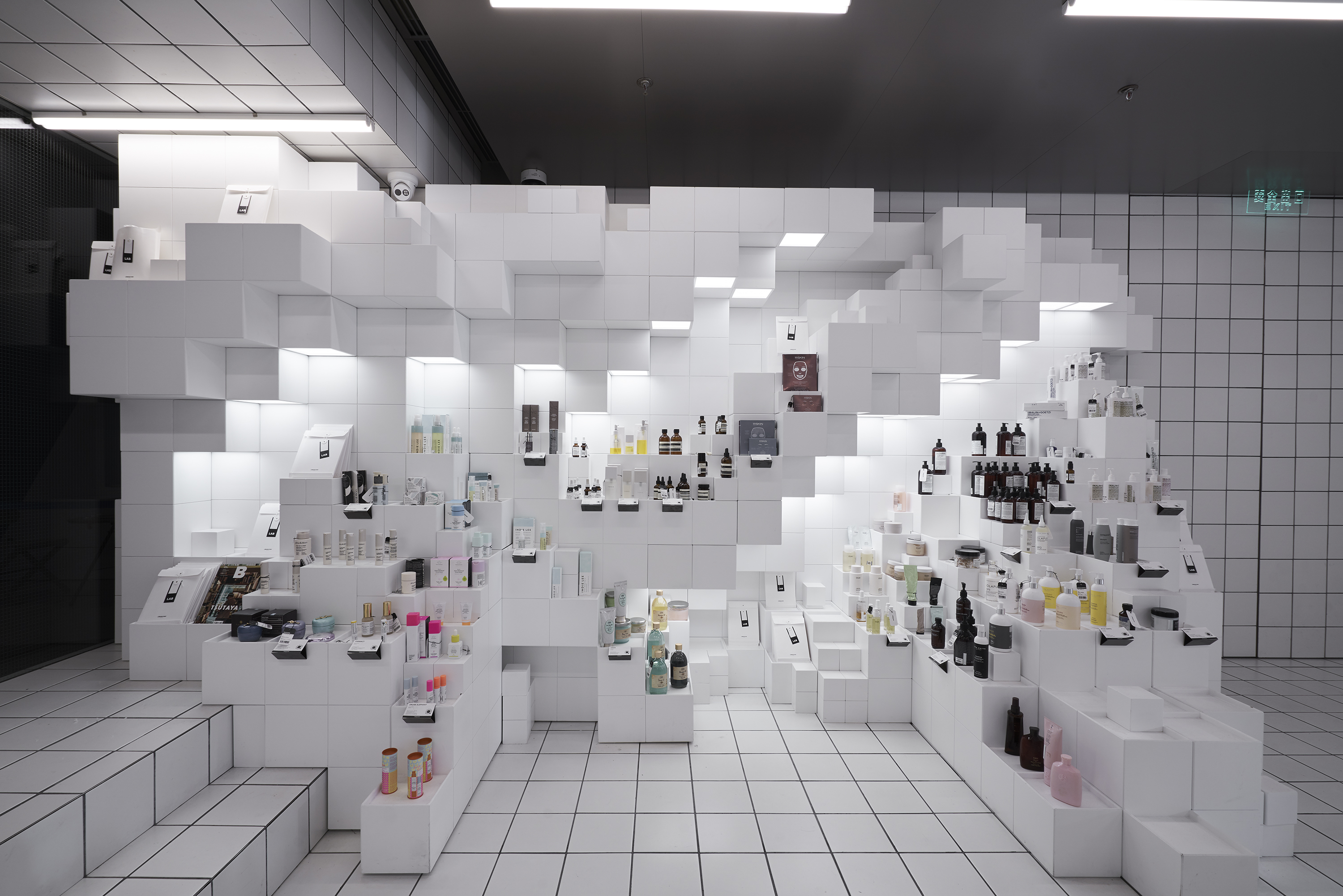 空间意境:透过皮肤与化学产品产生的细微反应与变化,如同人类的皮肤接触到美妆产品过程中的吸收,再生,演变的一个过程,因此而产生了一系列的设计演变推敲并设计出演算逻辑并运用在一种几何体块,经历过几轮下来, 最终成型的设计空间在高度,长度,与深度,都有这丰富而精致的几何变化,回应了不同形式陈列产品的可能性。