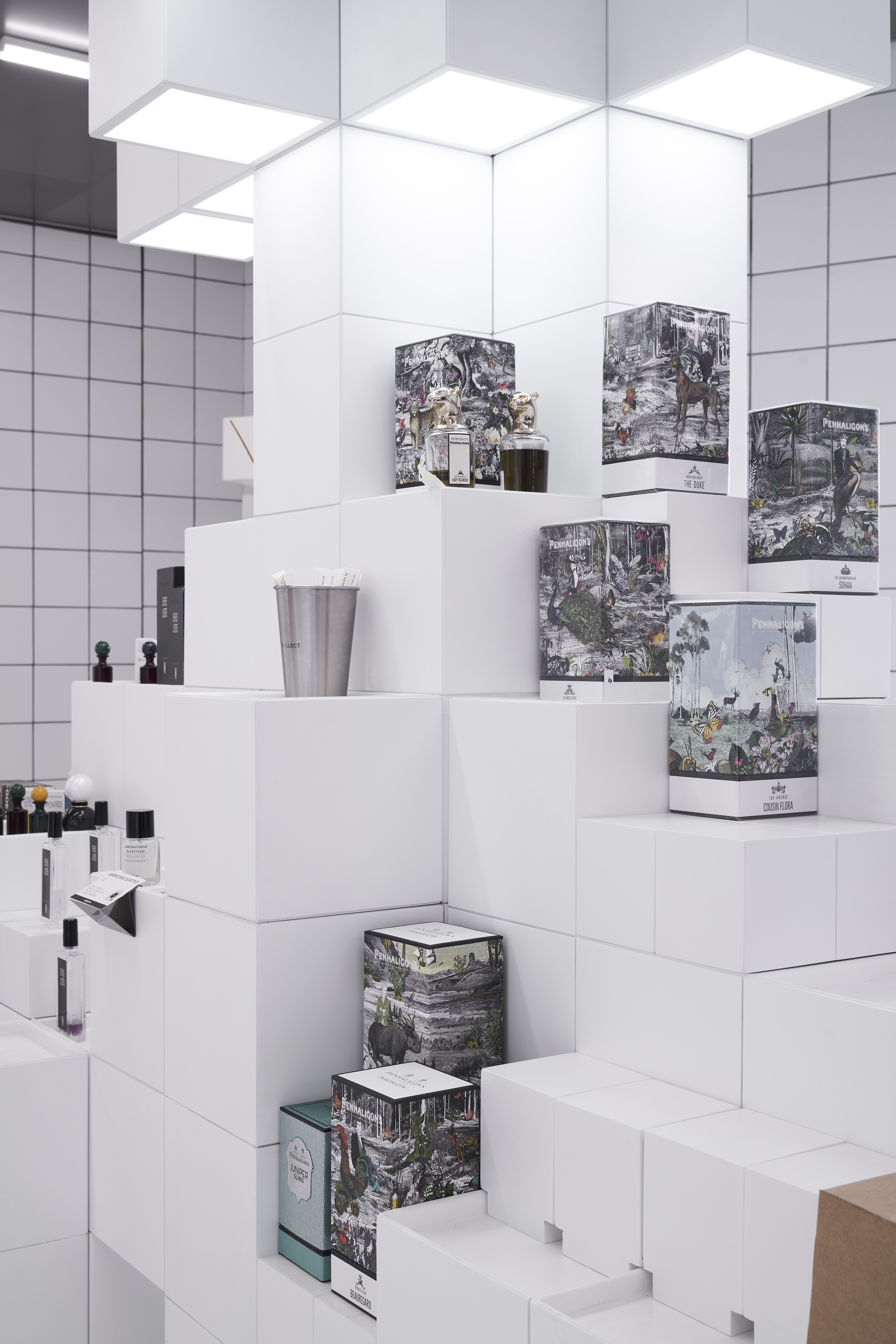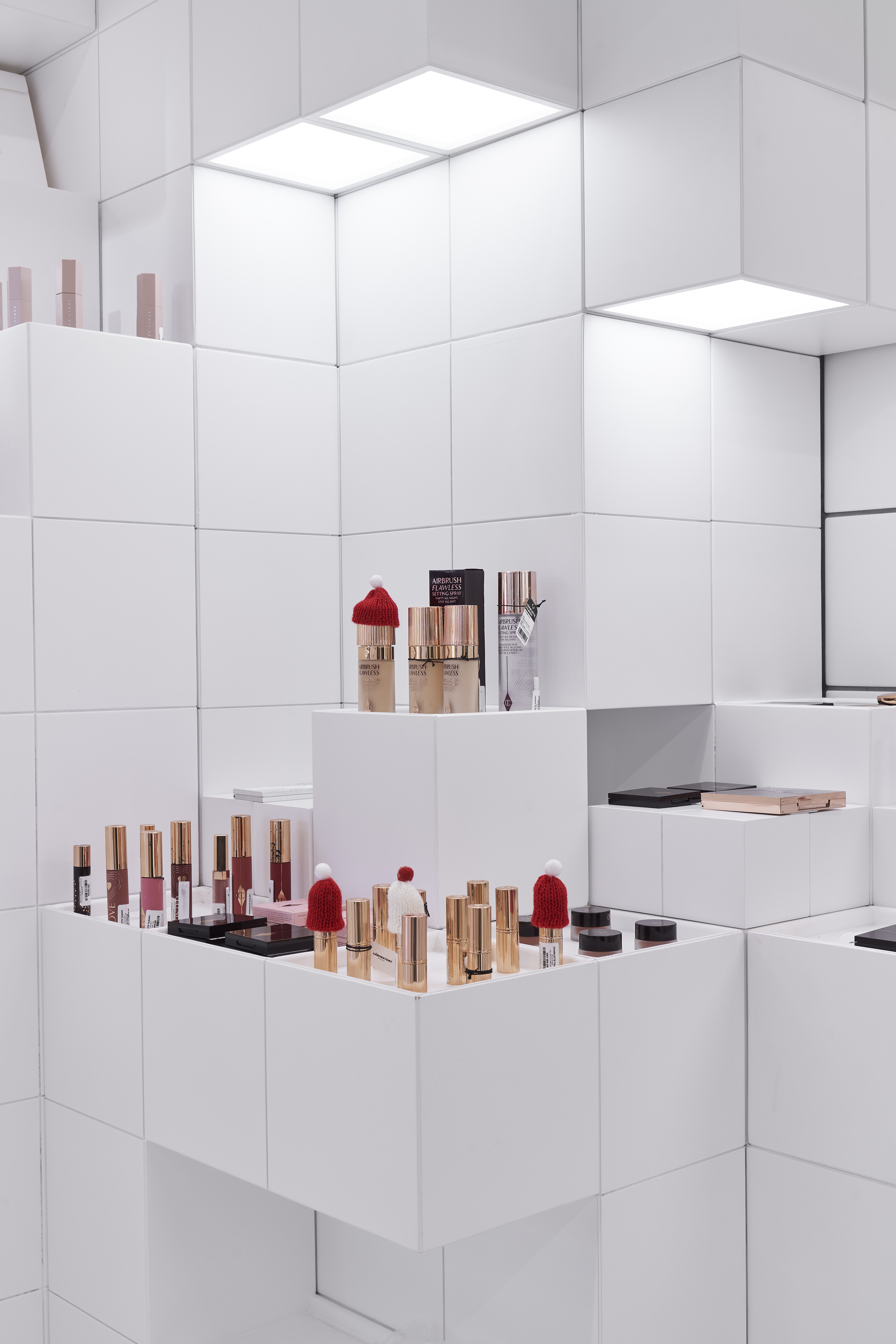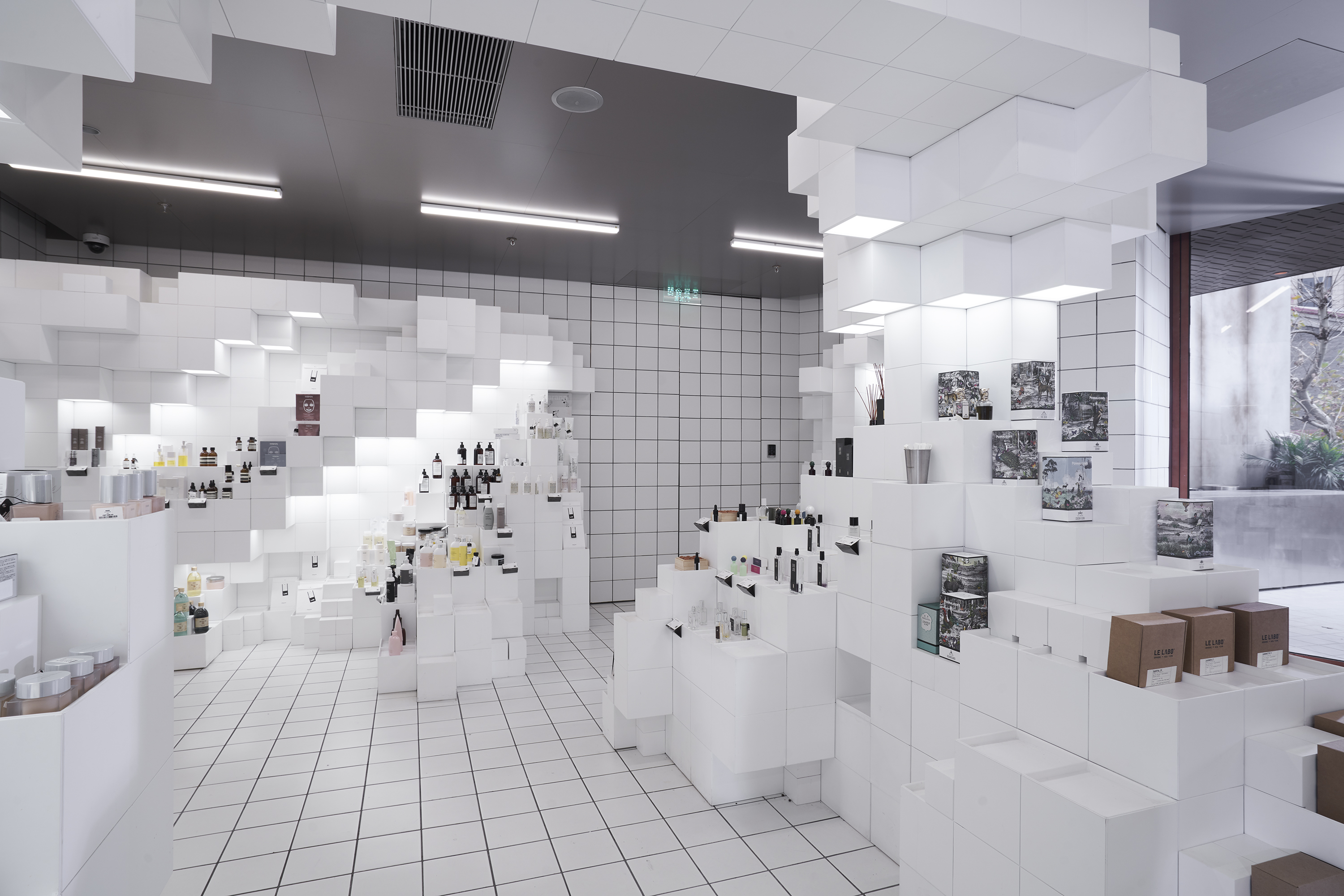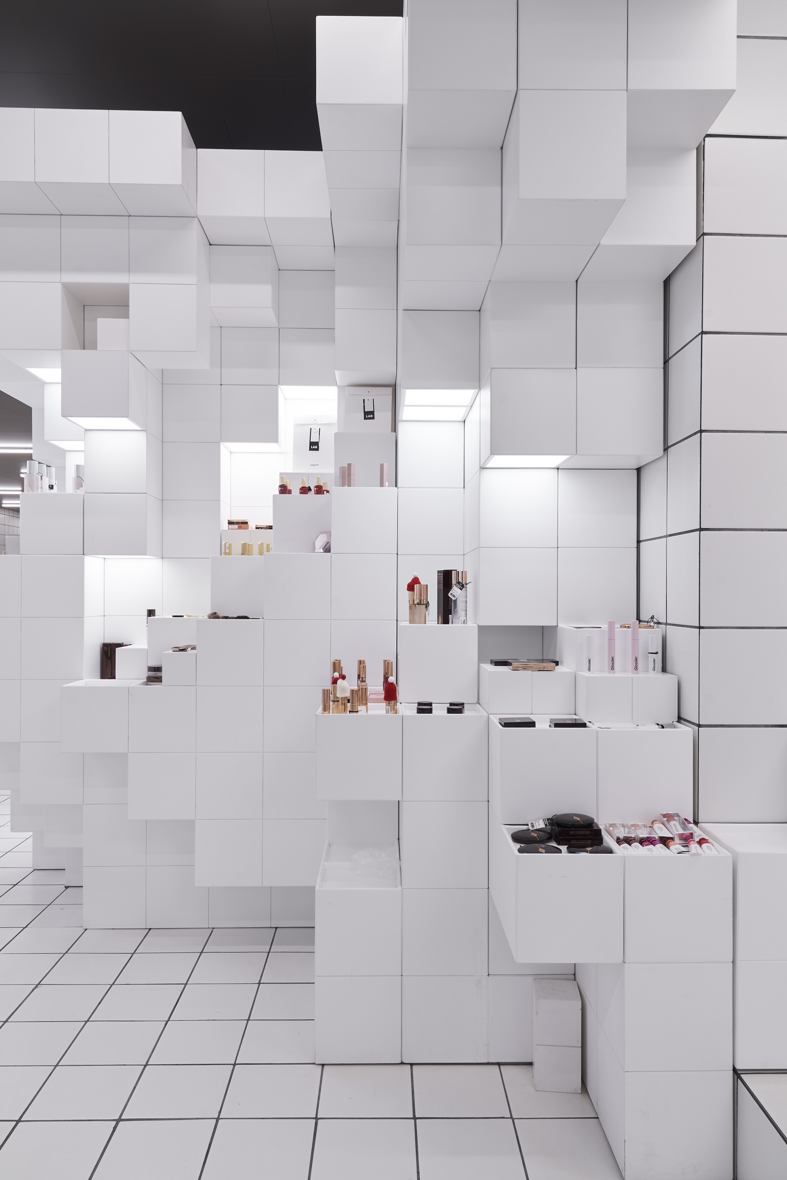 空间意境:透过皮肤与化学产品产生的细微反应与变化,如同人类的皮肤接触到美妆产品过程中的吸收,再生,演变的一个过程,因此而产生了一系列的设计演变推敲并设计出演算逻辑并运用在一种几何体块,经历过几轮下来, 最终成型的设计空间在高度,长度,与深度,都有这丰富而精致的几何变化,回应了不同形式陈列产品的可能性。