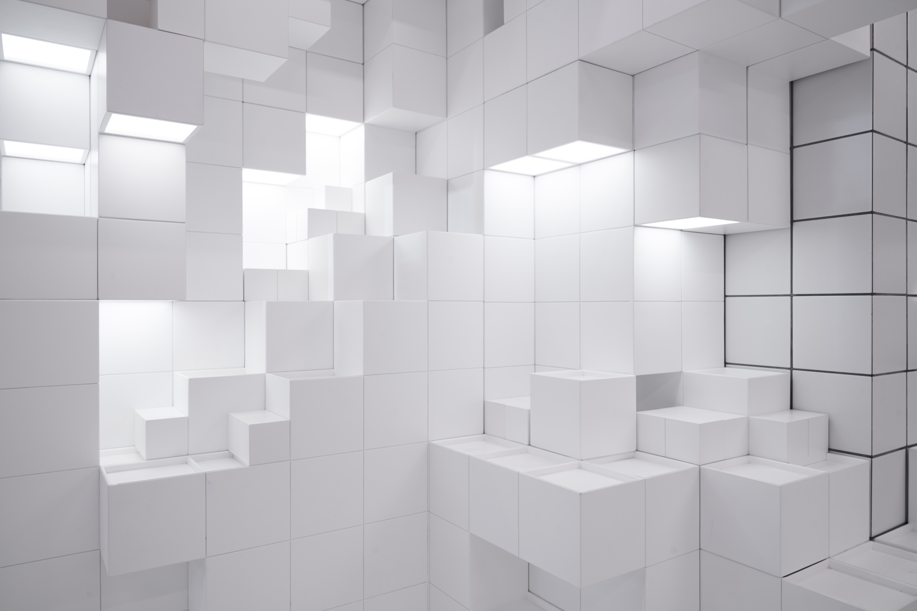 设计选材:空间中的方块是由40x40x40与20x20x20多模块组合而成。空间中采用了大面积透明玻璃面对外界,营造出进行中实验室的观感。 整体色调及材覅运用了金属,玻璃及大量的磁砖漆处理,结合白色瓷砖的效果,创造出立体的感官实验室。
