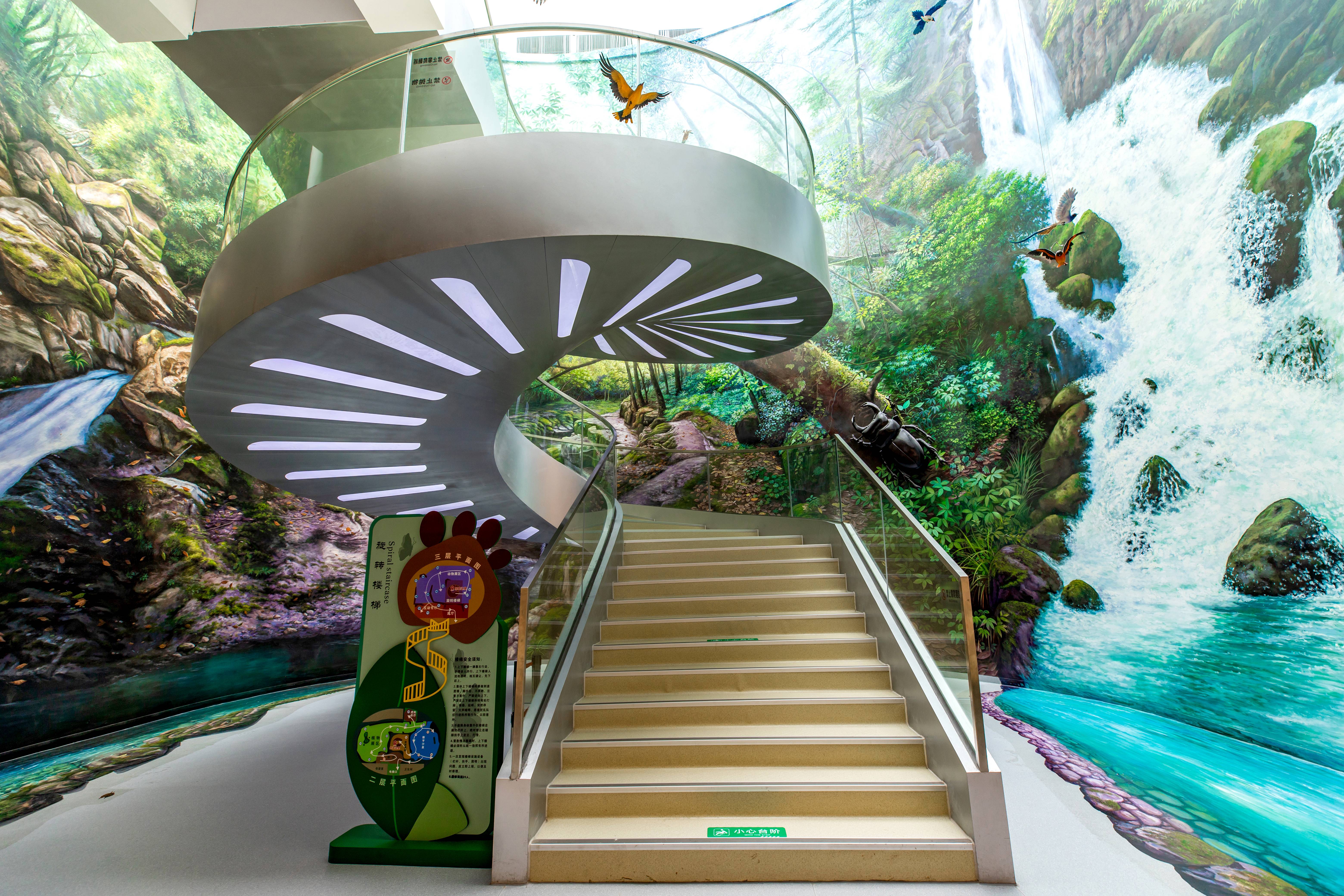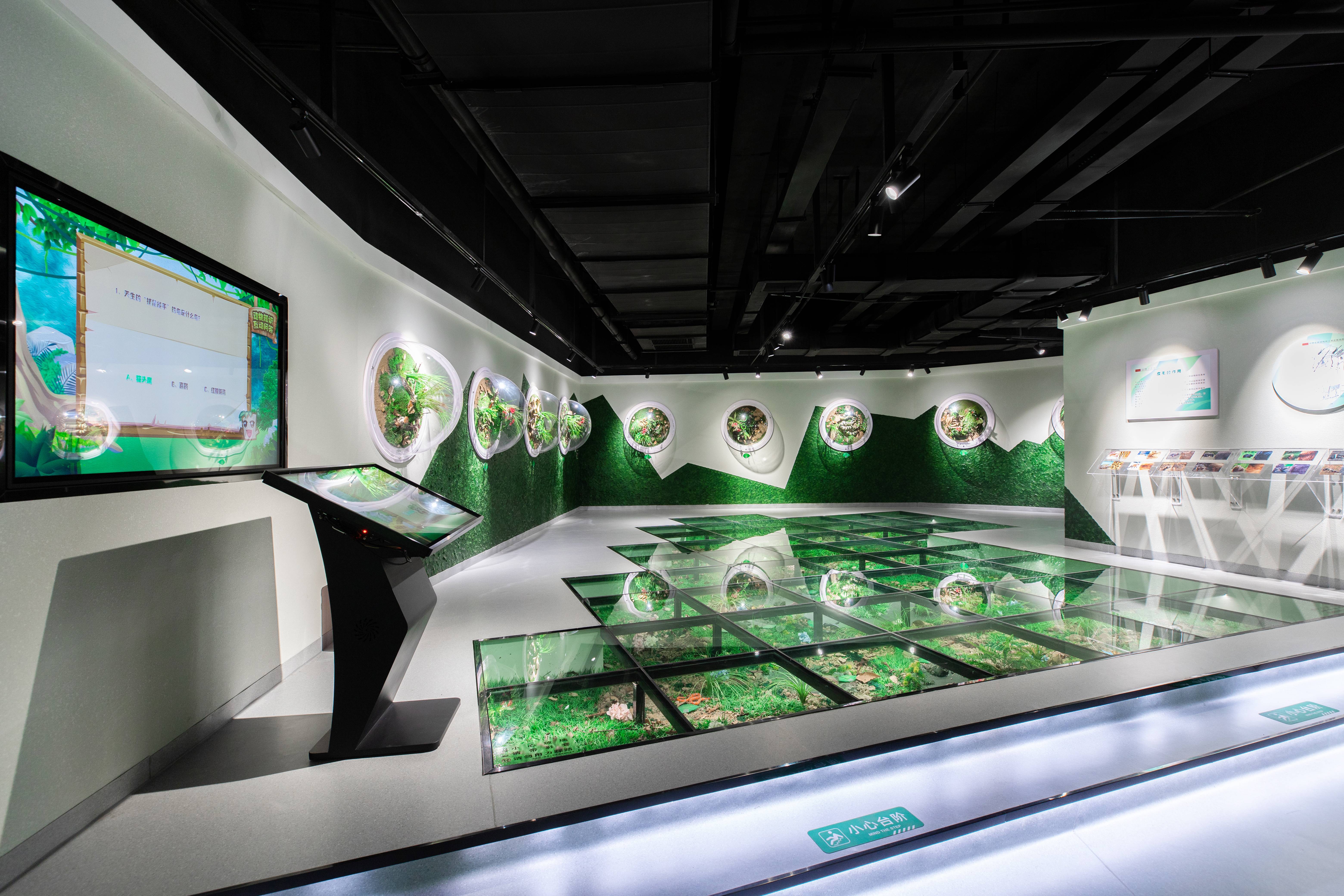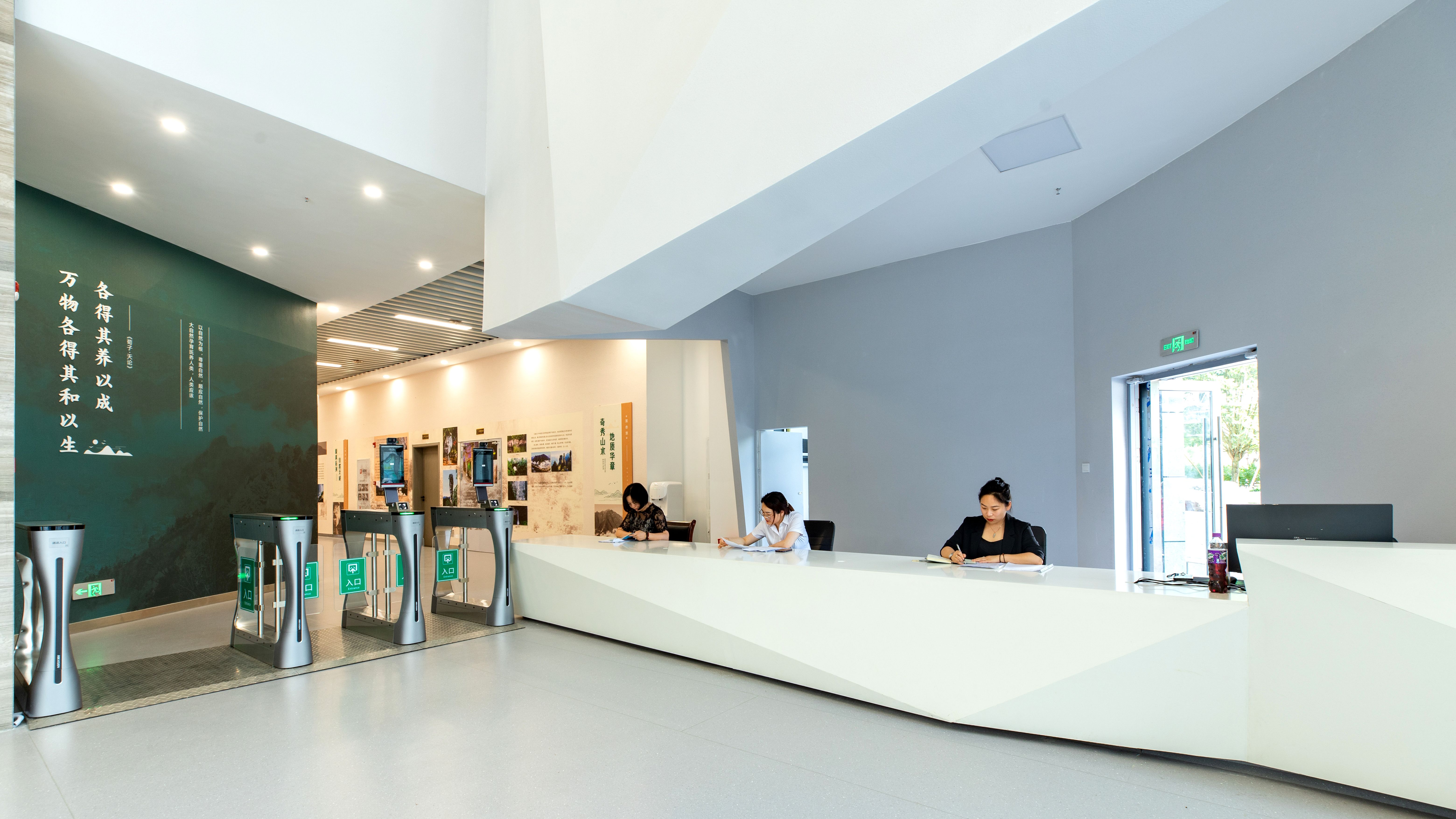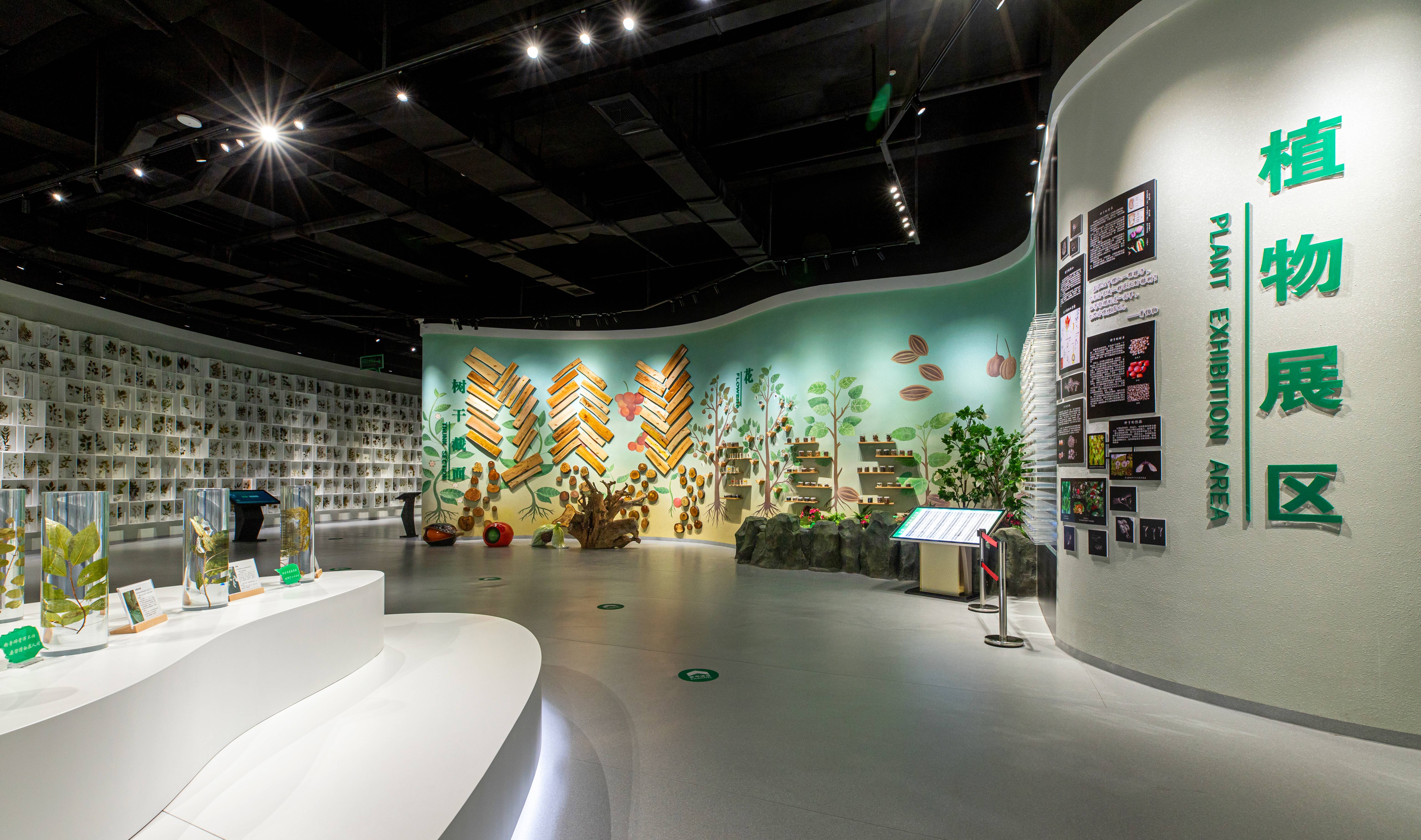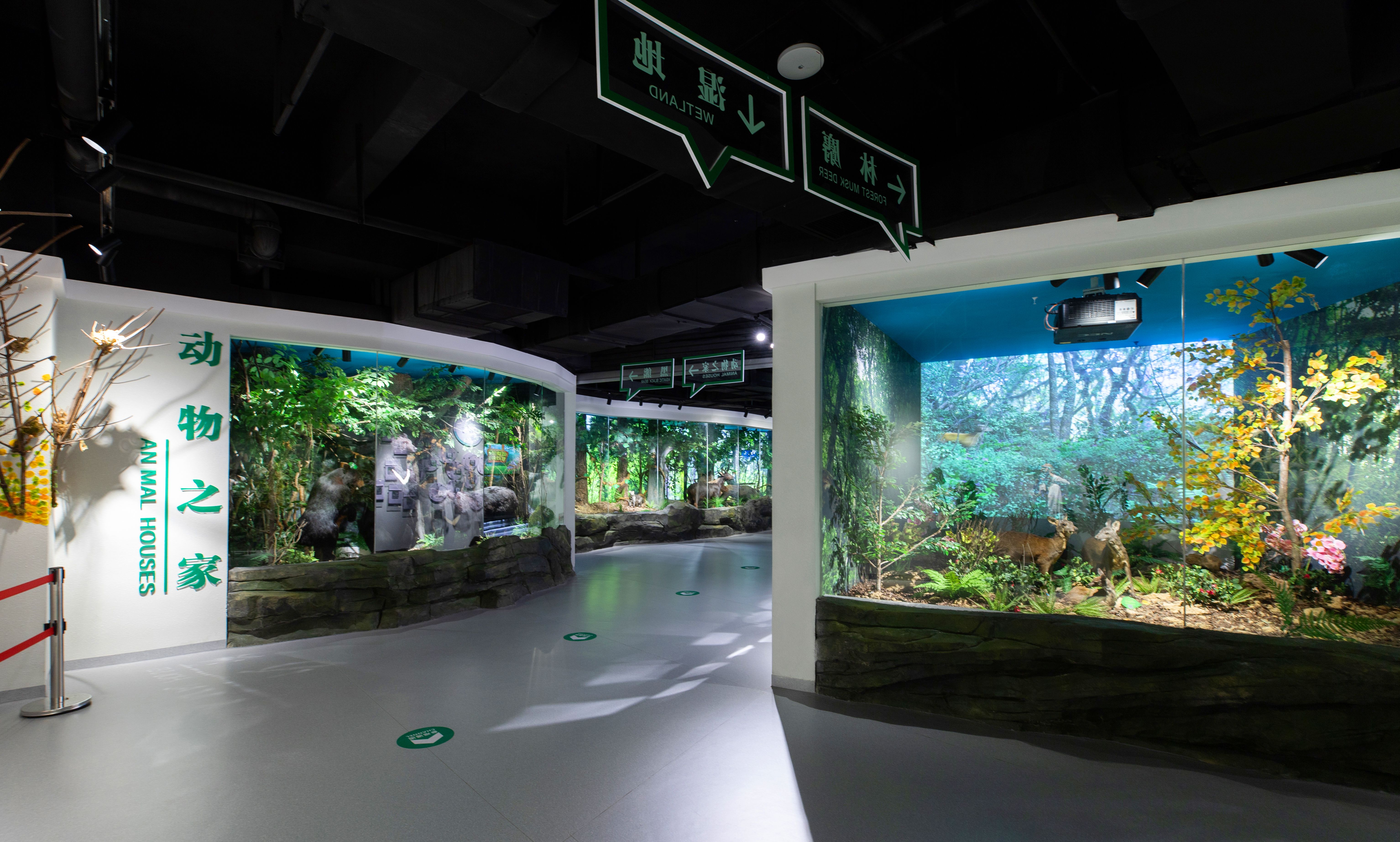 设计选材:在设计选材上,本项目使用的材料兼顾美观、实用及环保,所选用的材料也符合国家相关标准,不仅在物质层面上减少了对环境的负担,有利于保证参观者的身体健康,还在精神层面上呼应了展馆本身所要传递的“人与自然和谐相处”的精神。所选用的特色材料包括木纹洞石、人造石、金钻麻、硅藻泥、地胶、透光膜、不锈钢,均属于环保石材、涂料等。