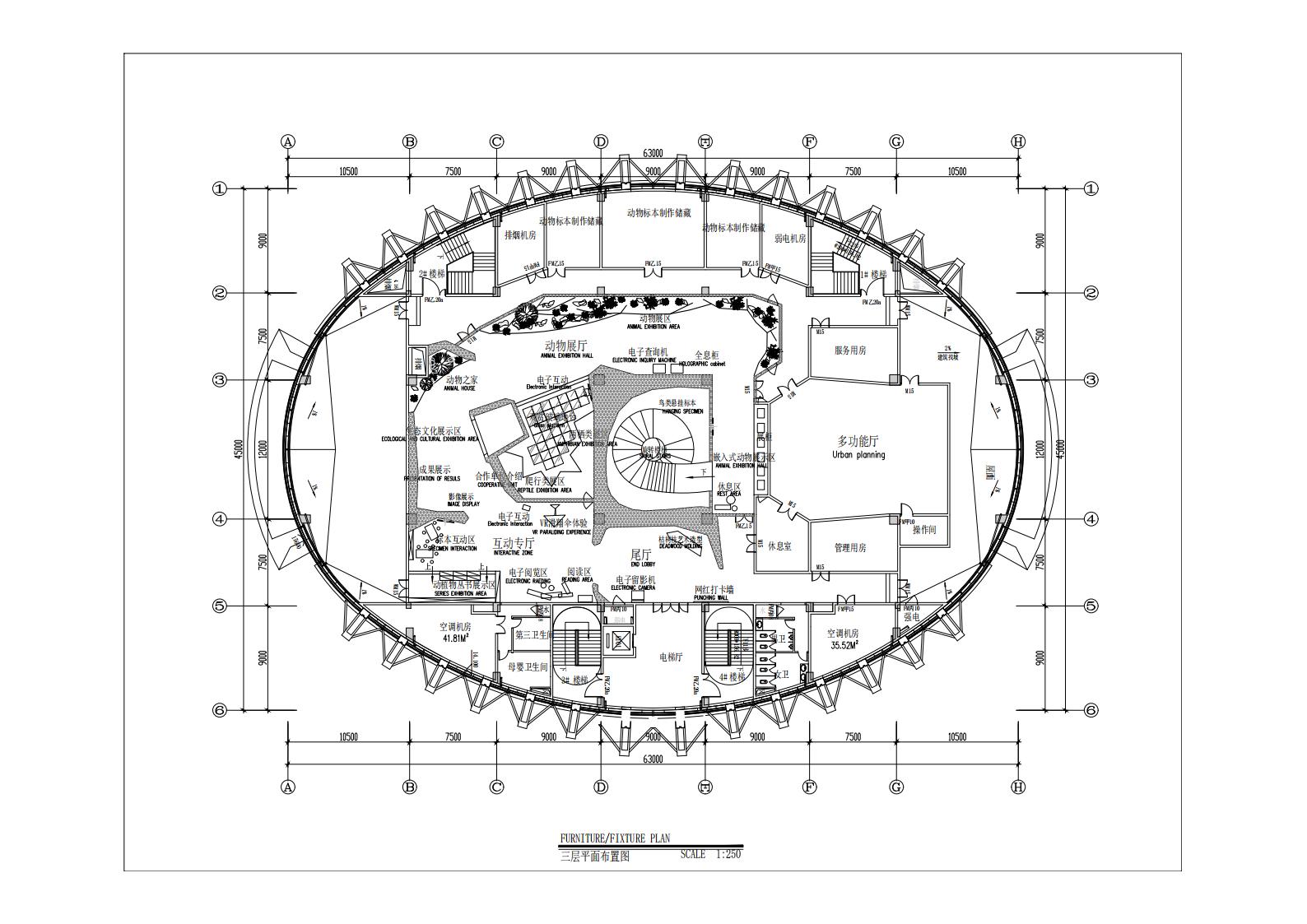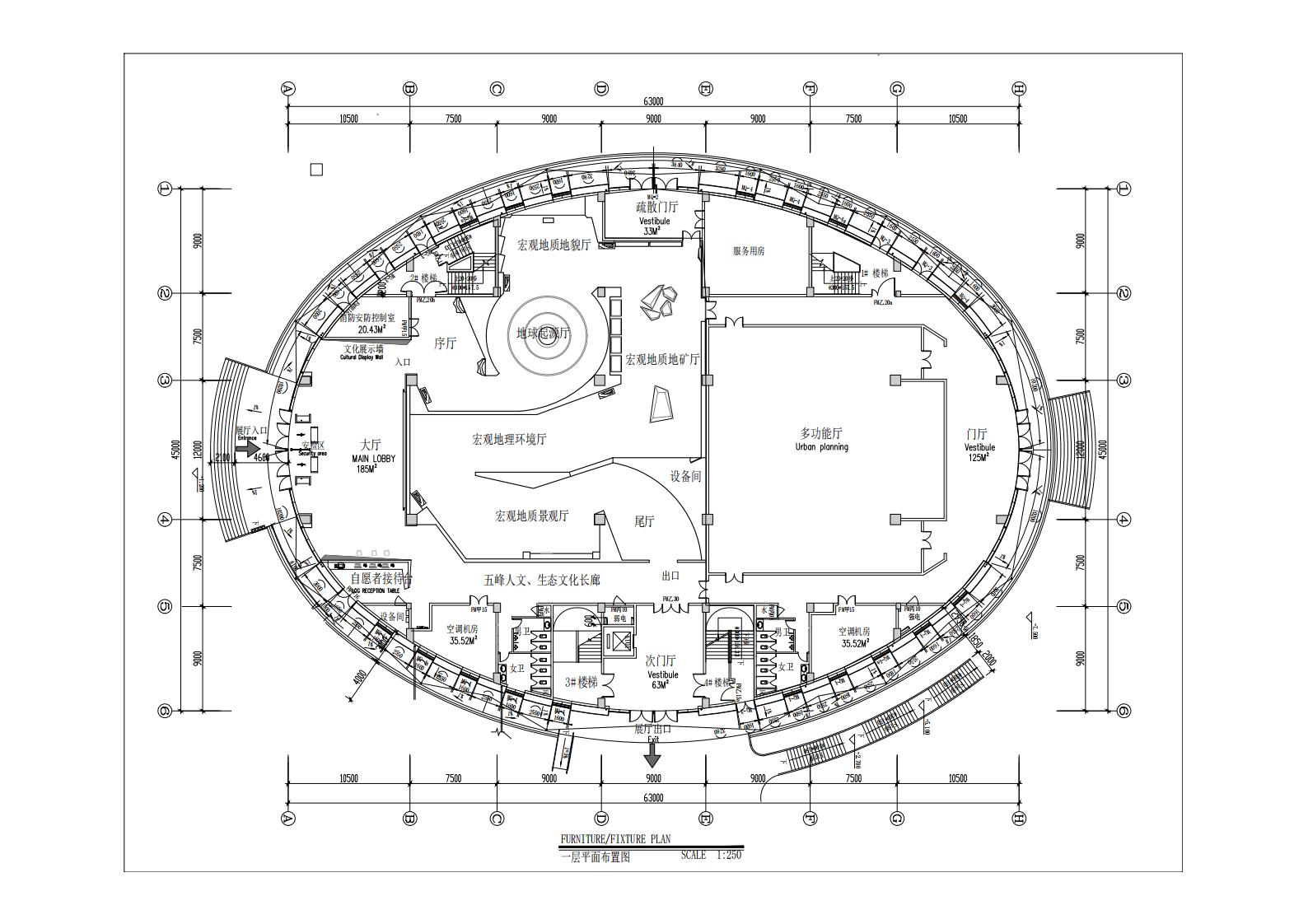 空间布局:在空间布局上,本设计基于展馆所要呈现内容的叙述逻辑,从其自身的叙事性、流动性出发,打破各个不同主题展厅之间的界限,将展馆的展品与展厅融合为一个完整的艺术作品。内部空间的布局与划分基于椭圆形的建筑平面,依照方圆结合的方式破除原有平面的不利因素,充分利用边缘空间作为楼梯、控制室等“服务空间”,保证了“被服务空间”即展厅部分的良好游览体验。设计从宏观和微观两个角度出发,通过不同形状的展墙营造出合适的尺度,既保证特定展厅的独立性、可识别性,又让整个展馆空间依照信息传播的节奏在平面、水平两个角度上串联起来,使整个展馆有机流动起来。