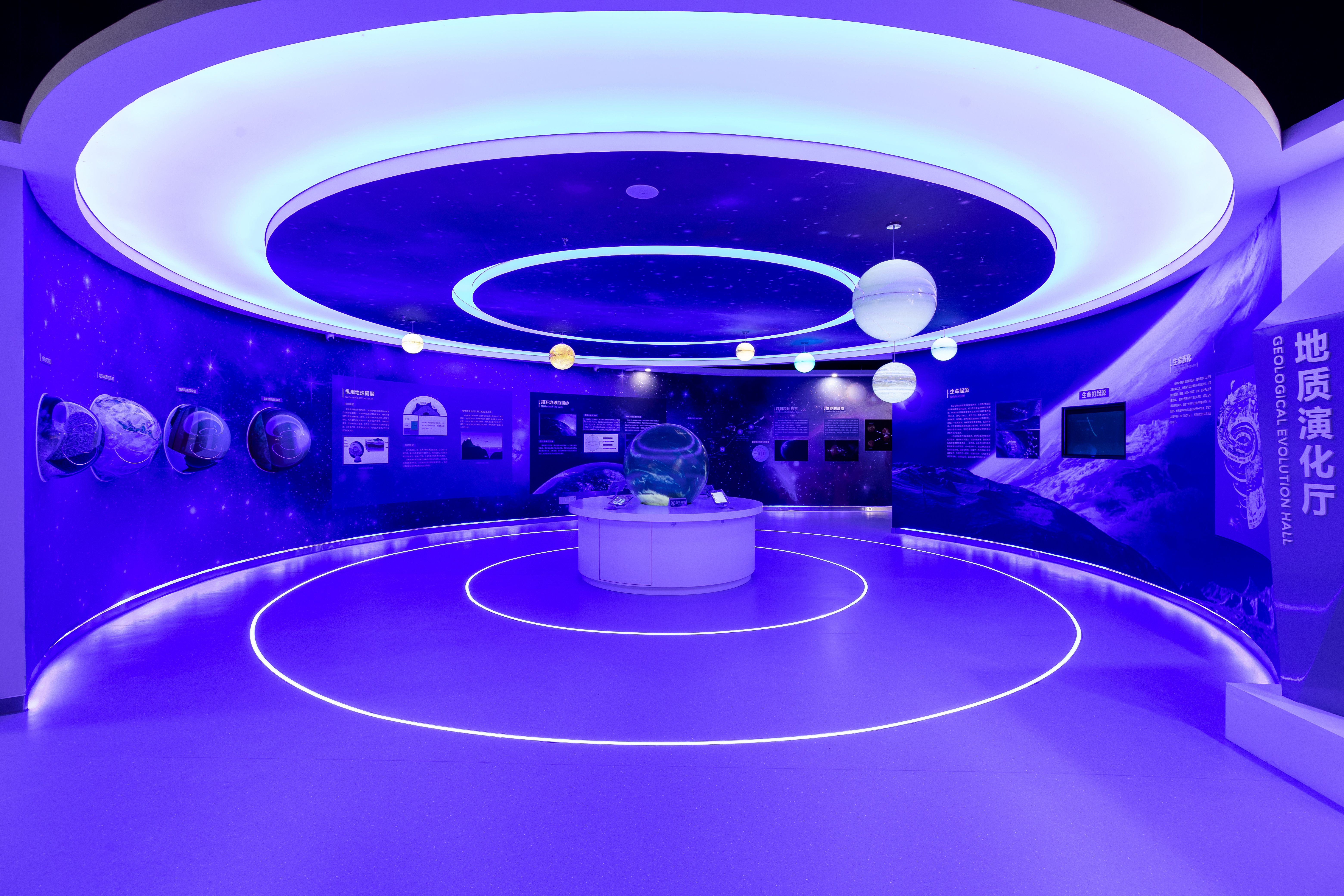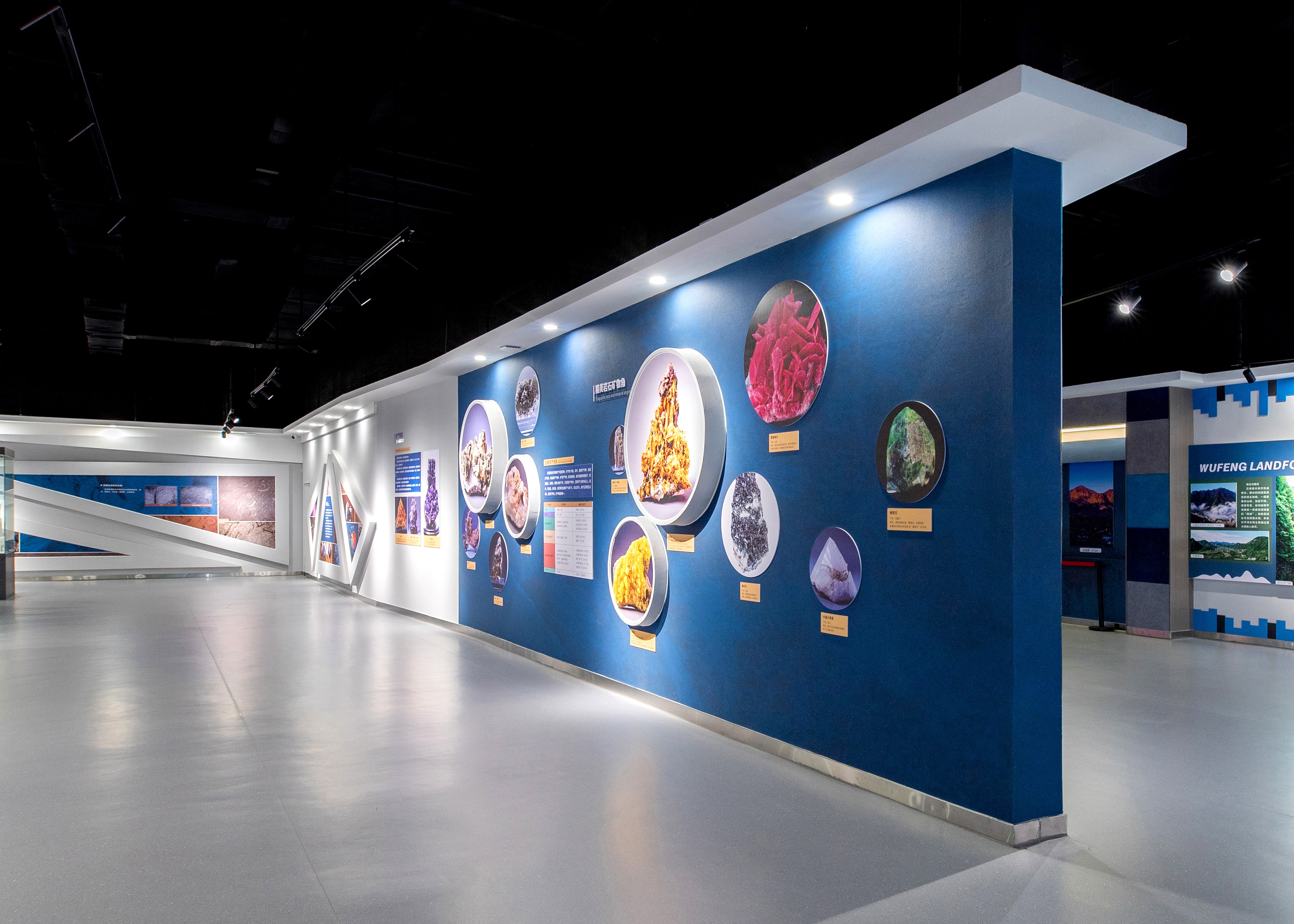 空间意境:在空间意境上,根据不同的主题选择不同的设计手段营造特定的沉浸式体验空间,从视觉、听觉、触觉上进行设计。标本馆不同于其他展厅,其展品本身作为承载信息的媒介会处于主体地位,而展馆的目的是利用合适的空间设计手段将其更好呈现出来,为人们所接受。在环境营造上,根据两大类主题分别营造出科技感、未来感和自然感、亲和感的两种氛围。在地质地矿、植物、兽类、昆虫、模式标本、植被生态系统、真荣苔藓、互动体验等展区,在这些展区内设计团队抽取展品自身符号,或模拟自然形态或运用自然材质、自然色系,烘托空间氛围。而在地球起源厅、地质演变厅内,多运用几何、抽象的设计手法,在灯光和色彩选择上也选用冷色,突出宇宙的浩瀚感,配合声音打造沉浸式体验空间。