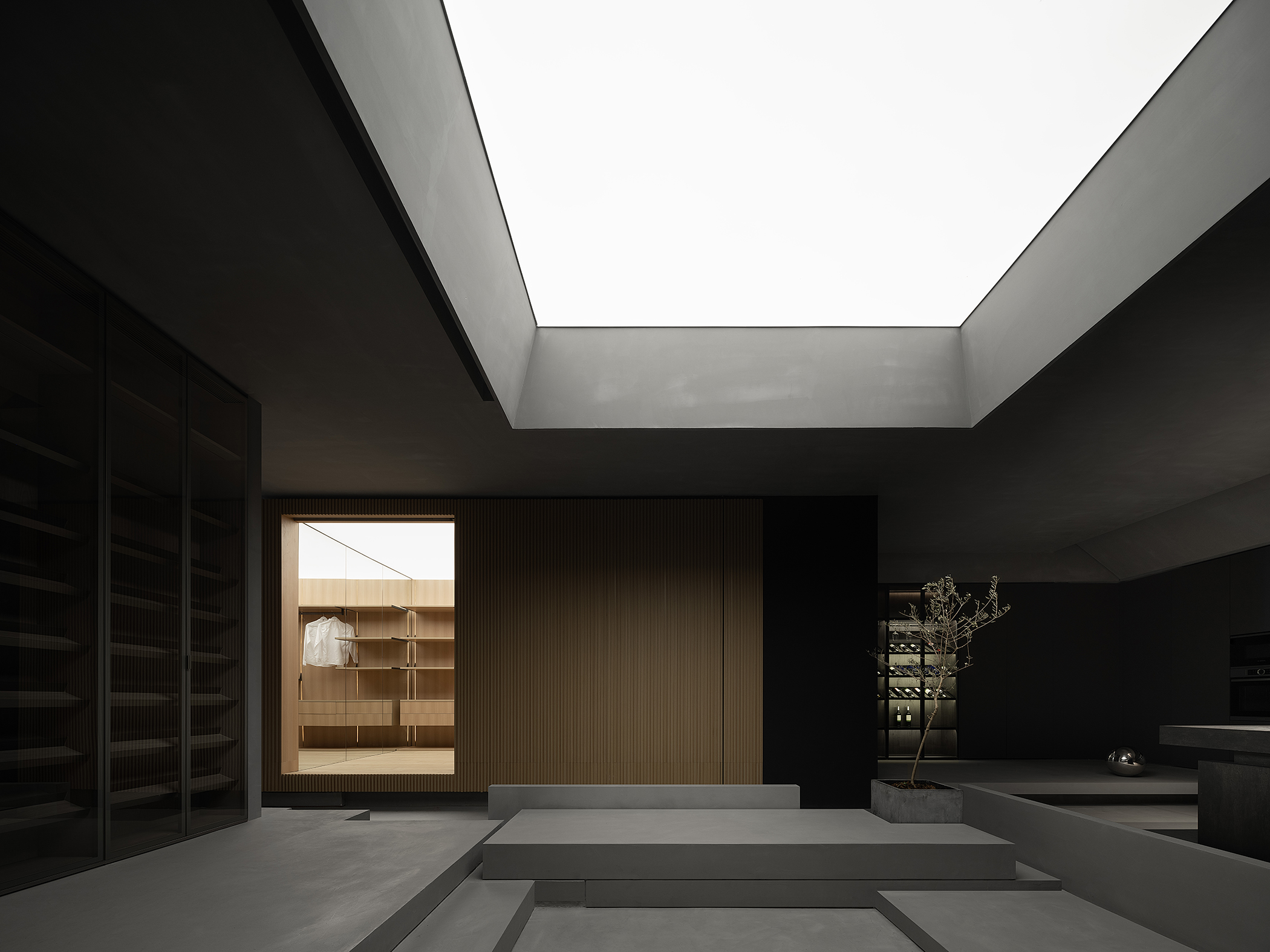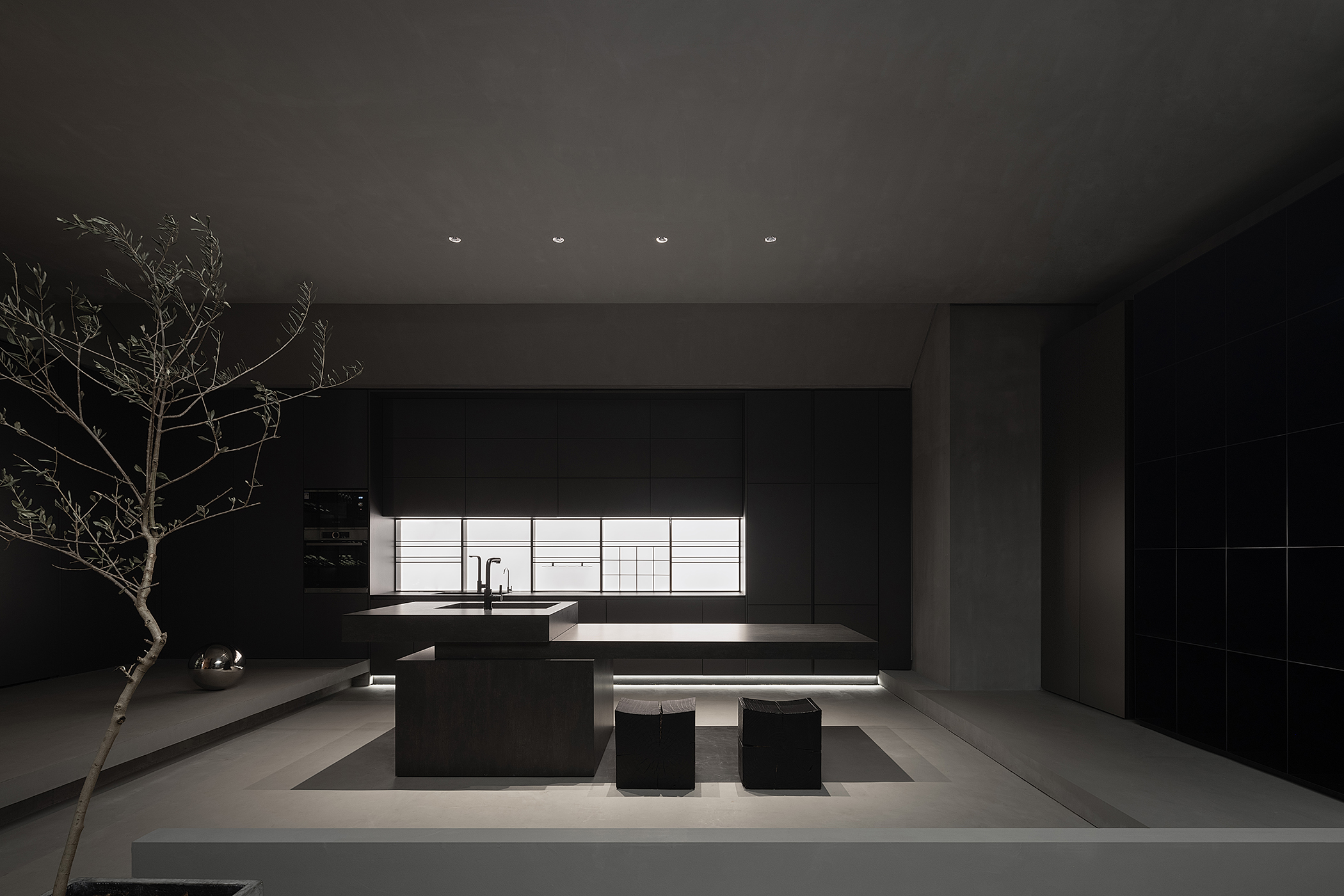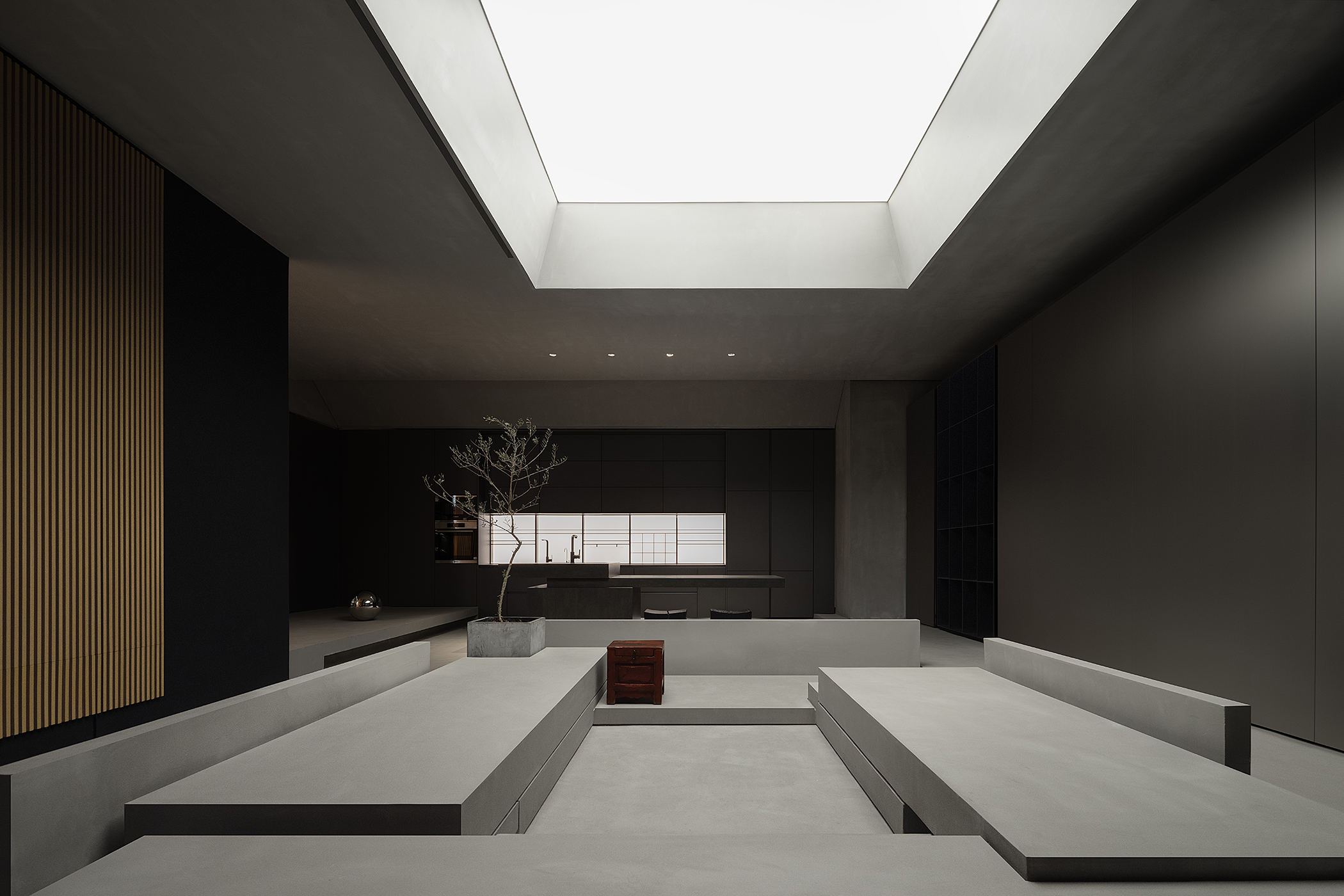 设计选材:整体空间墙地壁尽可能在同一调性之中,使空间更加空灵,让人在其中得以体验片刻的宁静,沉寂,从而以这种氛围烘托出产品的调性。客厅,引入大量自然光,节省能源。