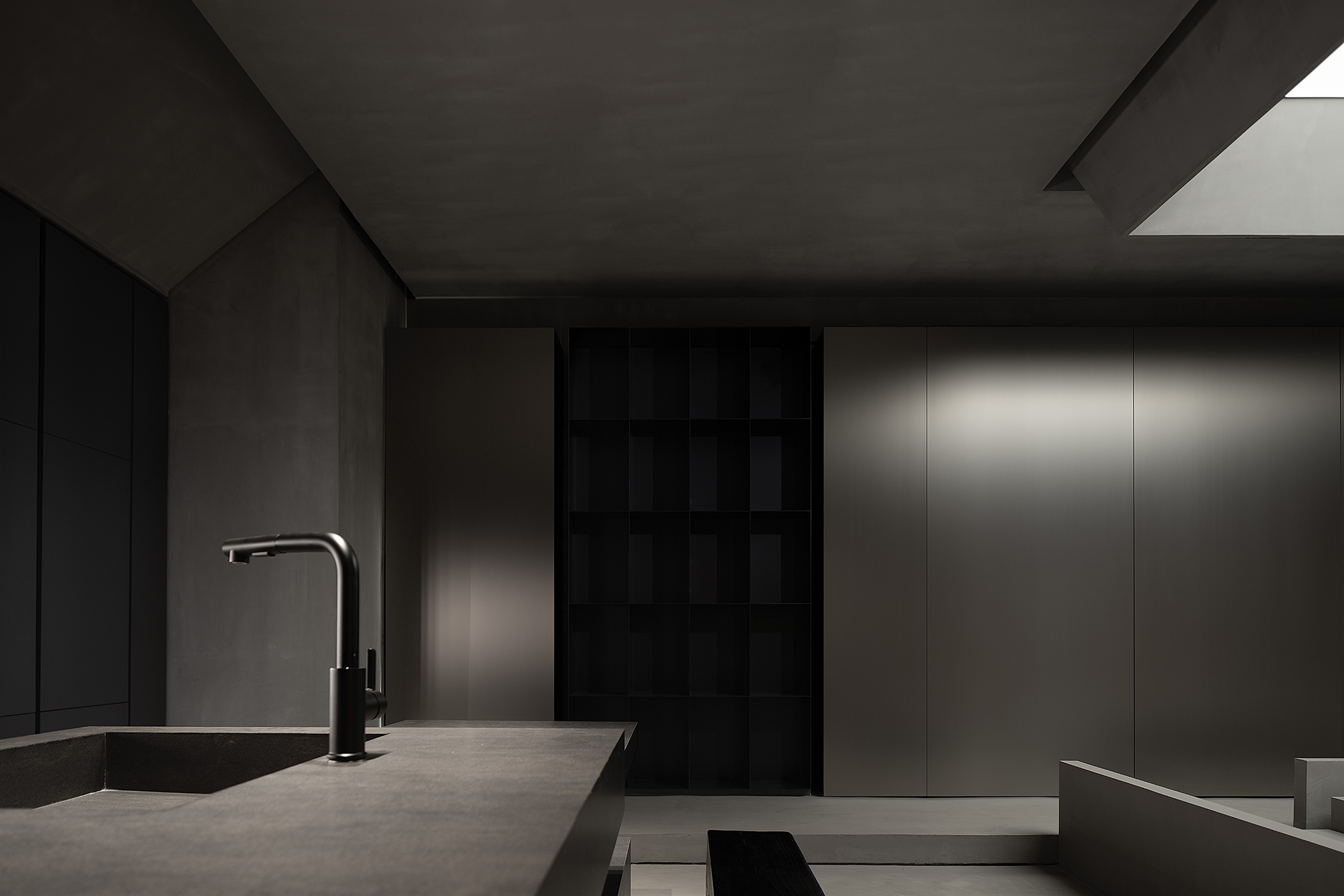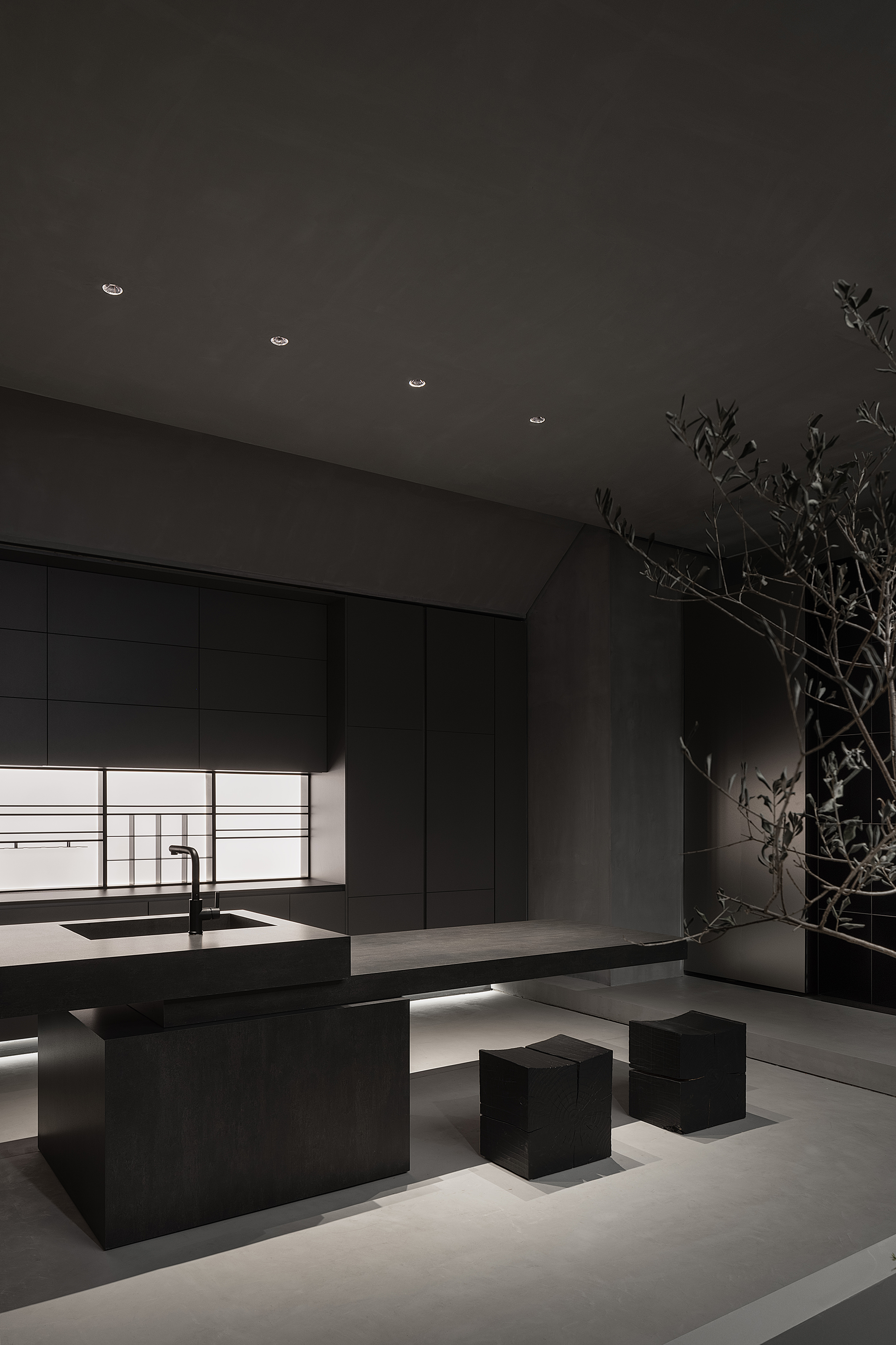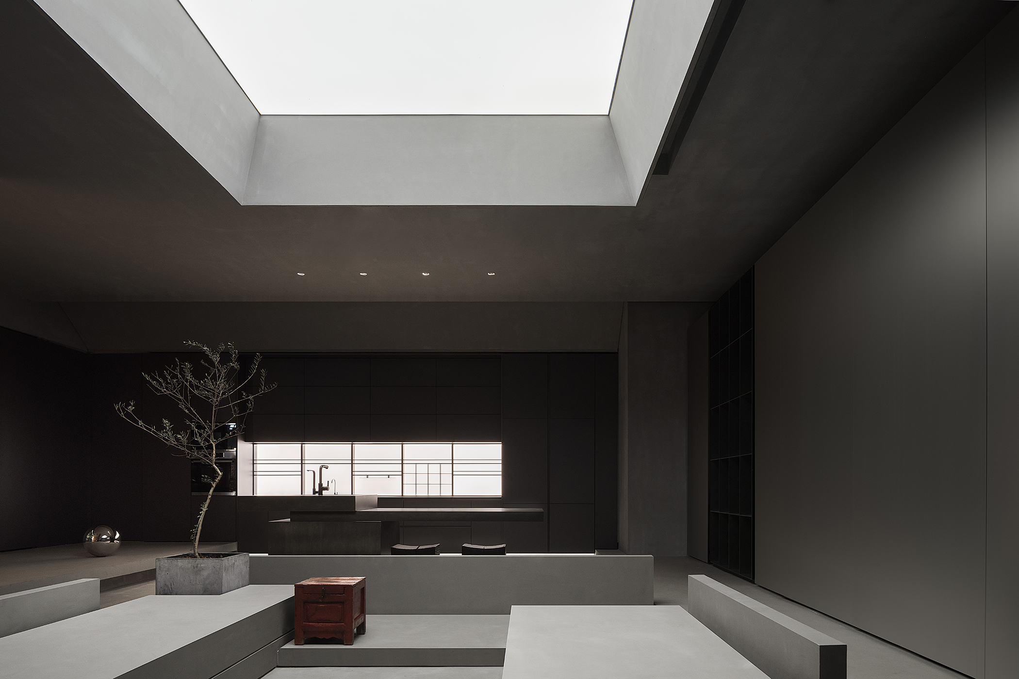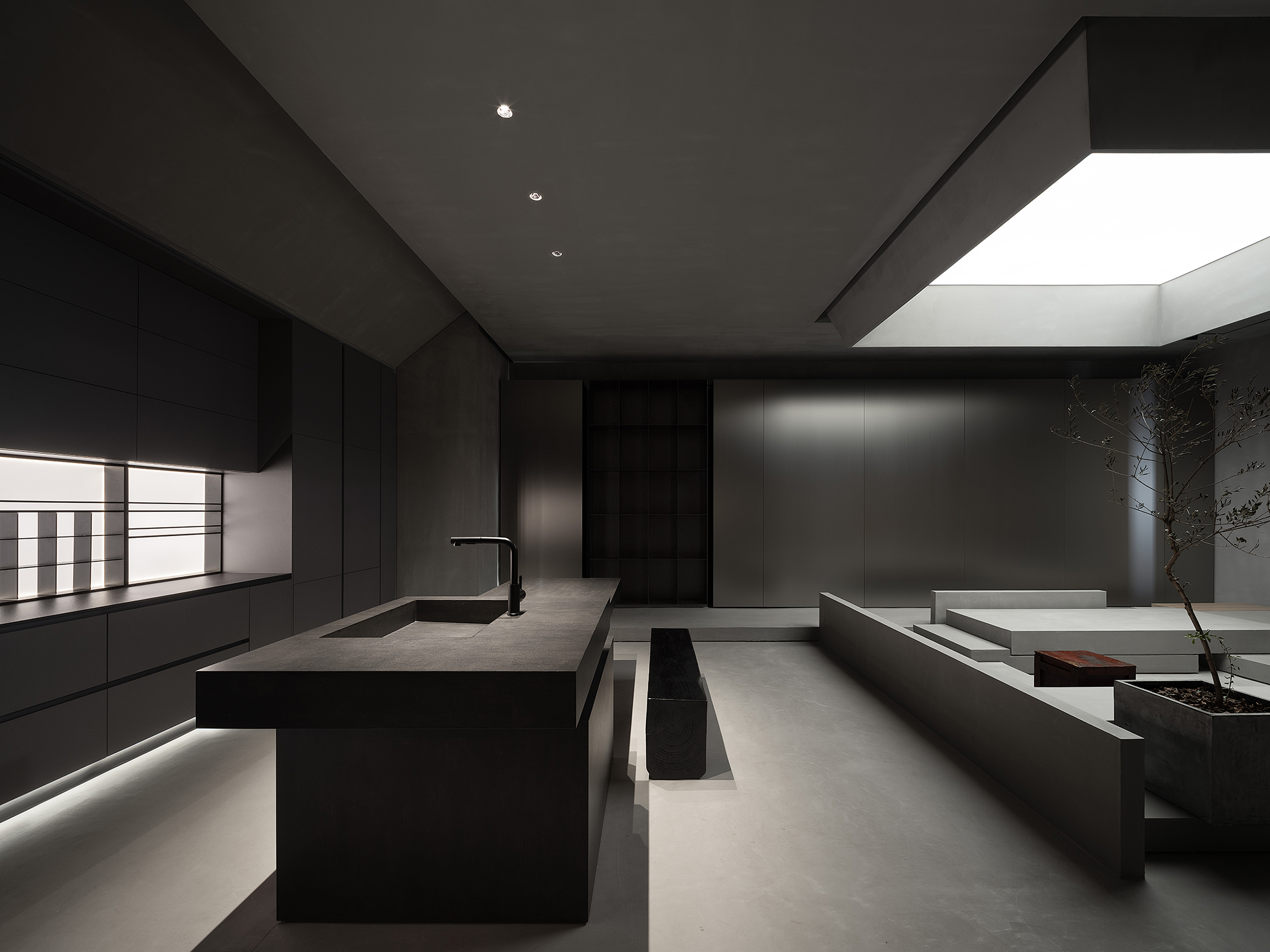 设计选材:整体空间墙地壁尽可能在同一调性之中,使空间更加空灵,让人在其中得以体验片刻的宁静,沉寂,从而以这种氛围烘托出产品的调性。客厅,引入大量自然光,节省能源。