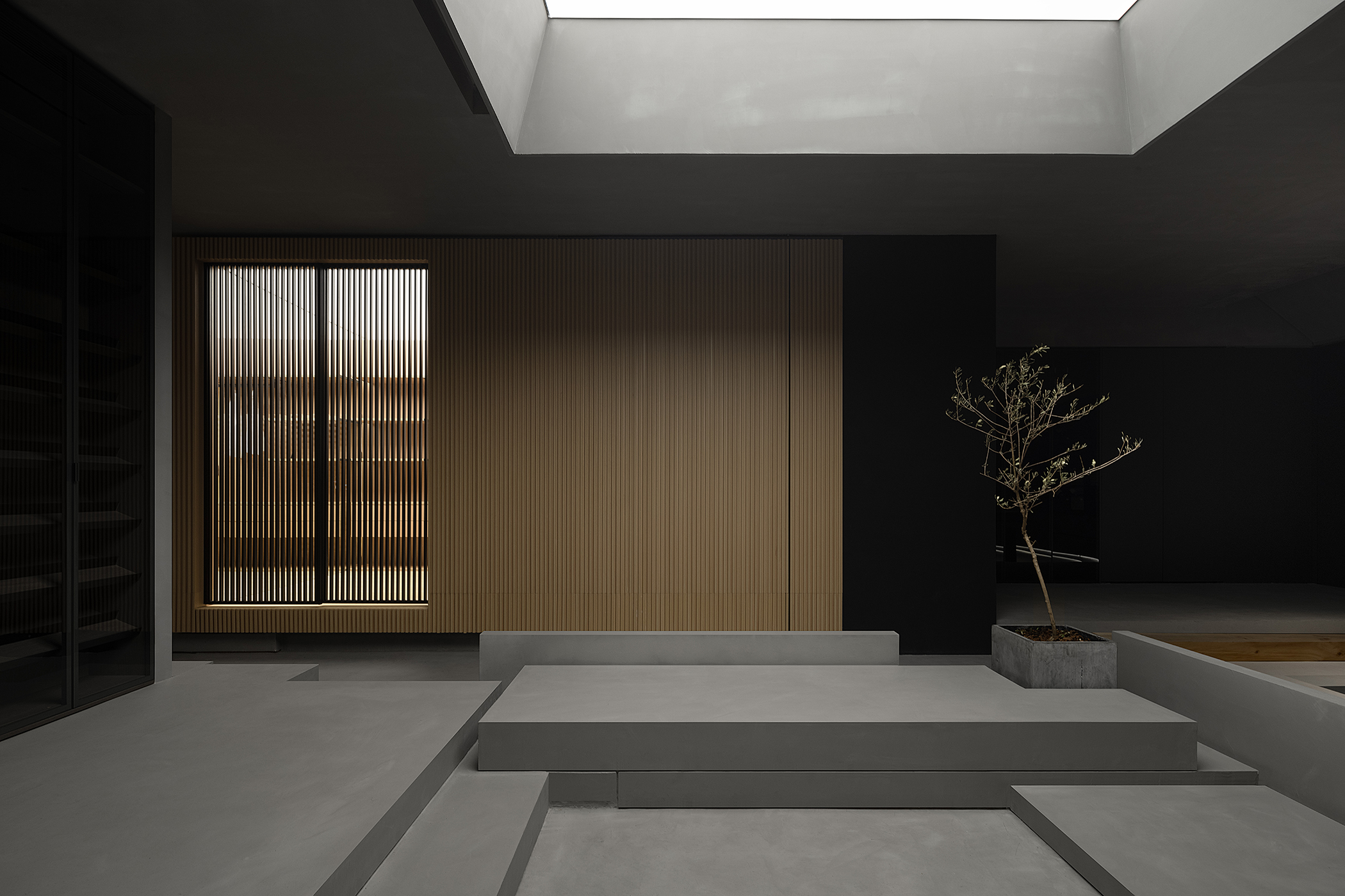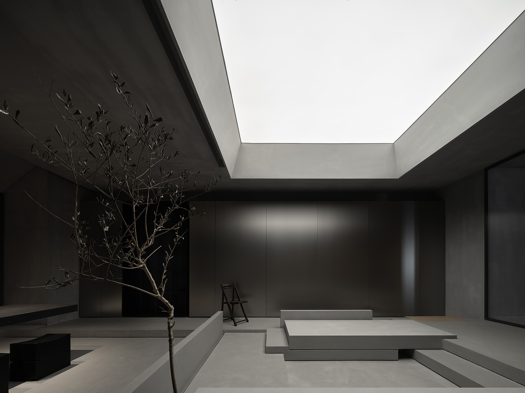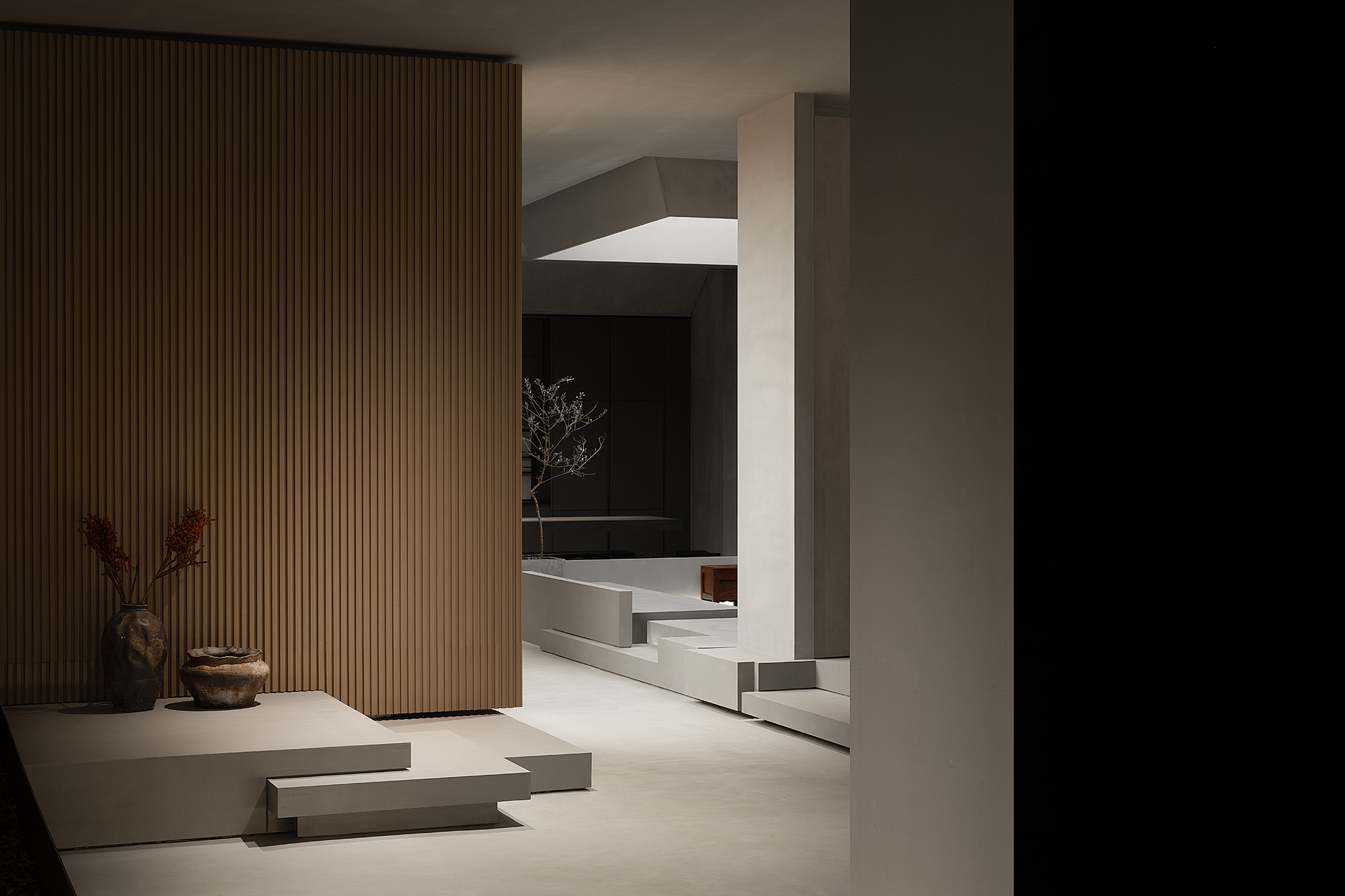 2.建筑客厅:休闲区摒弃了传统的成品类座椅的形式,将座椅功能融入到阶梯硬装造型中,在满足功能的同时符合空间的整体性。大部分空间由中性色调的微水泥塑造,整体空间墙地壁尽可能在同一调性之中,使空间更加空灵,让人在其中得以体验片刻的宁静,沉寂,从而以这种氛围烘托出产品的调性。