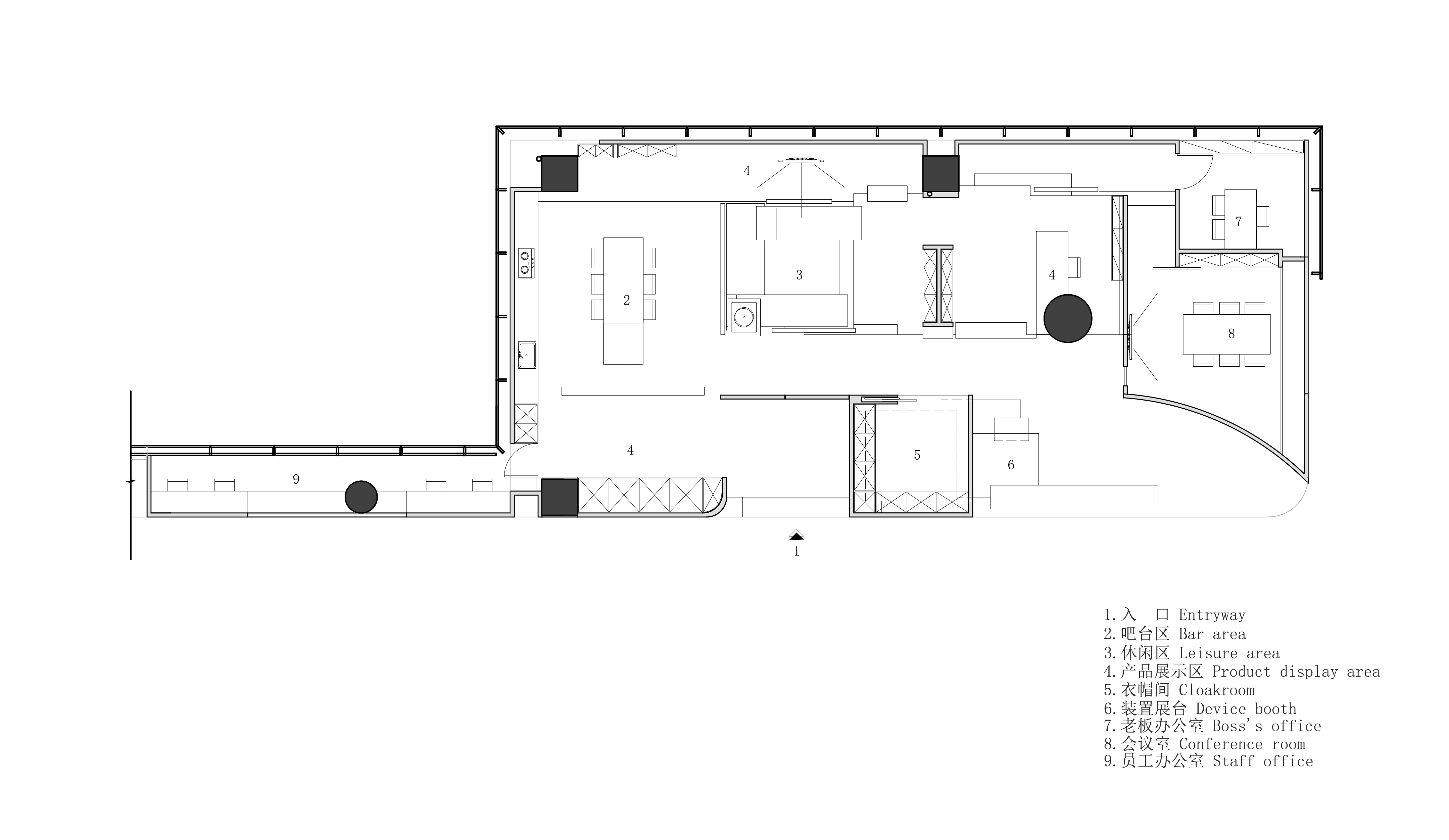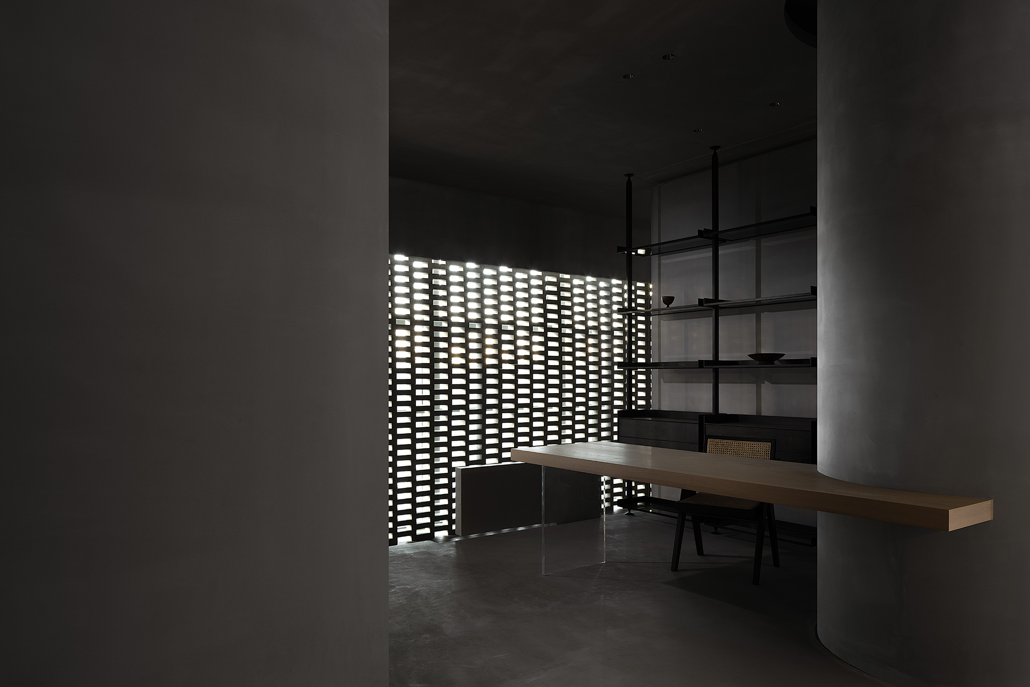空间布局:1.引入:通过店门造型进行视觉引导的方式,将视觉中心引入店铺内部,营造开放又隐秘的视觉感受,引人入胜。让人经过众多商业气息的展厅后有一个新的发现,如艺术中心般的展厅,更好的烘托产品的艺术性与品质的同时强调材料本身与空间的高度融合。