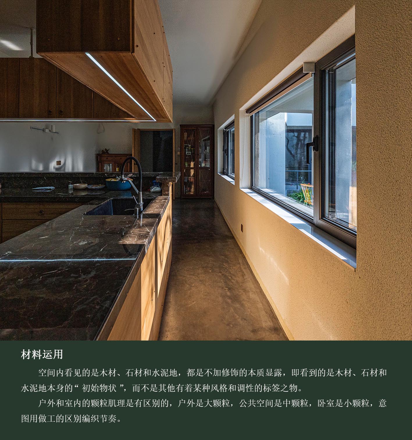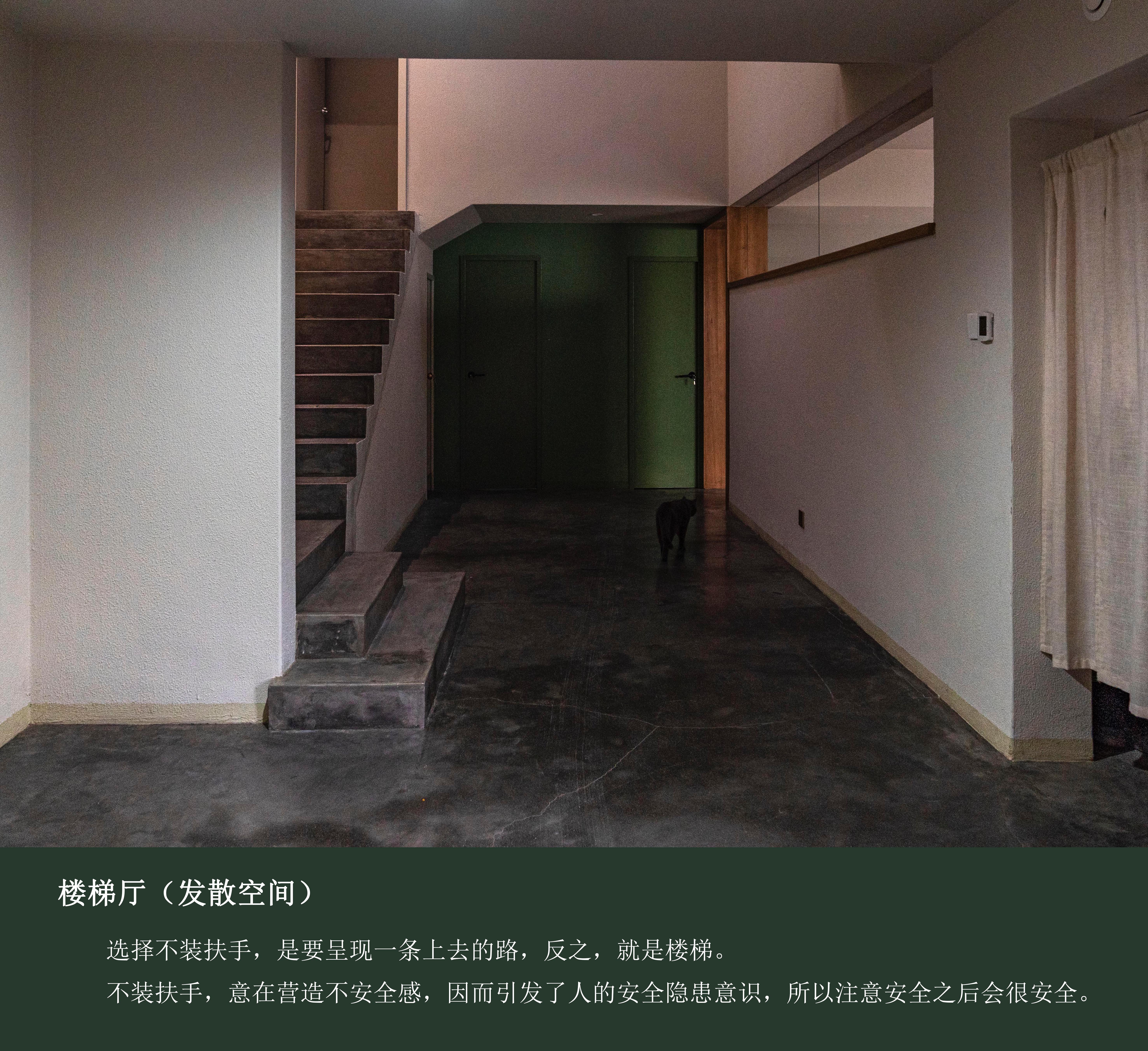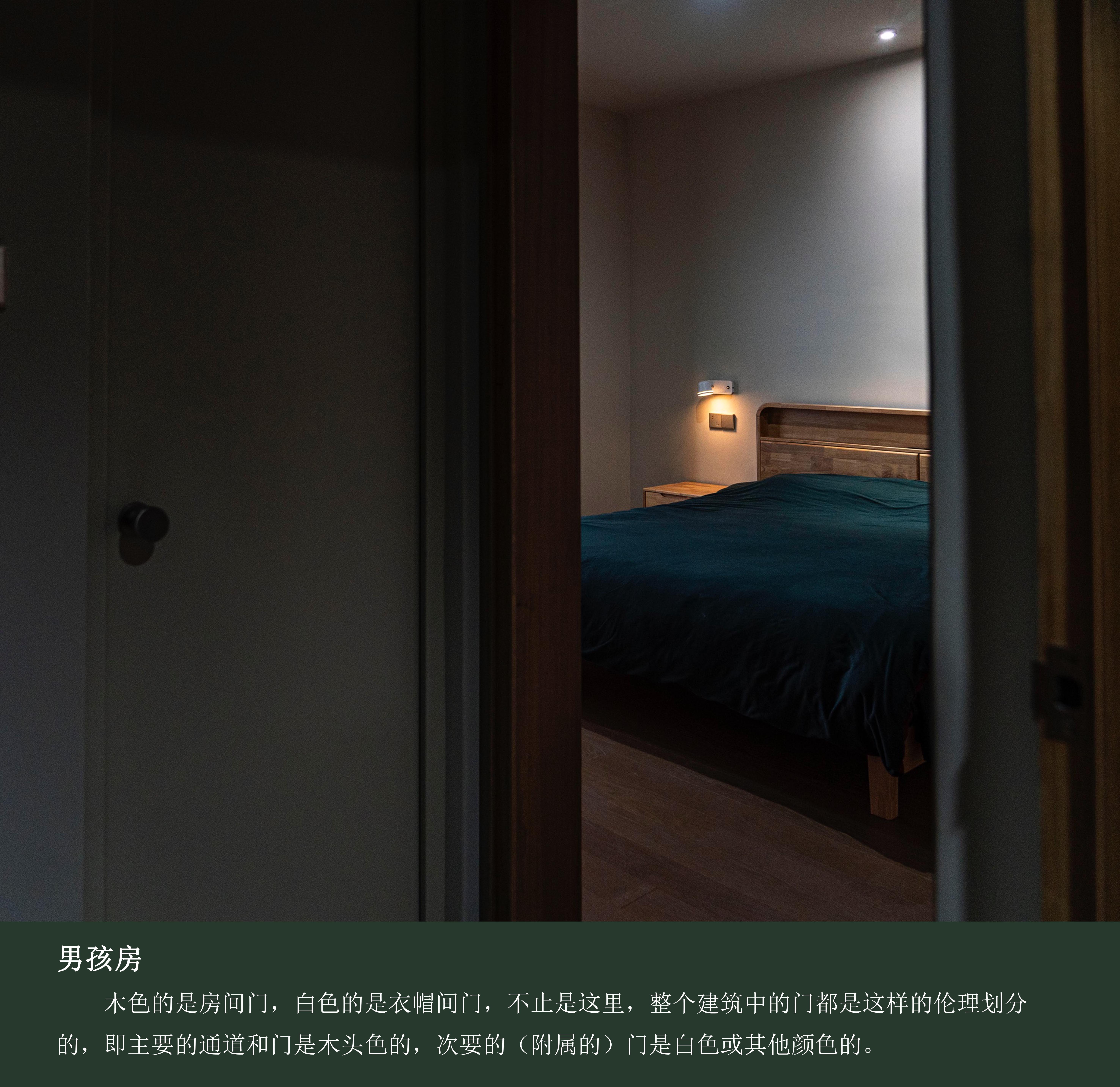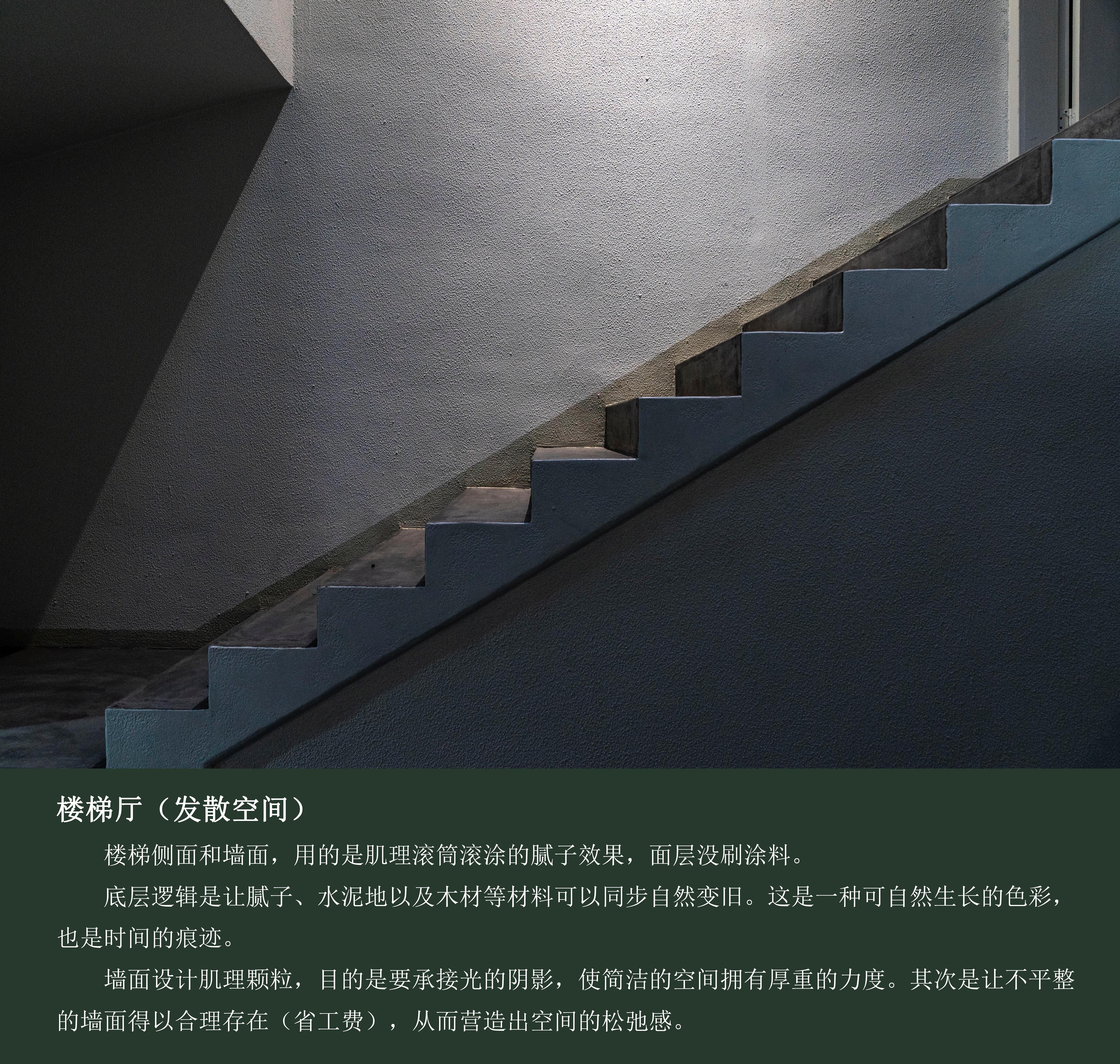 4,关于色彩:有色涂料的运用,目的不是好看,意在功能性的空间界面划分,连同其他材料的色泽共同赋予空间色彩(非颜色属性)。也可以通过不同材质的颜色来定义等级秩序,比如木本色的门(门套)关联的是主空间,白色的门则是附属空间,肌理腻子没刷乳胶漆,原因是腻子有自然黄变的特质,这种自然的旧色是可贵的,他们和水泥以及木材的同步老化,是美妙的时间痕迹,这些都是有生命力的空间色彩。