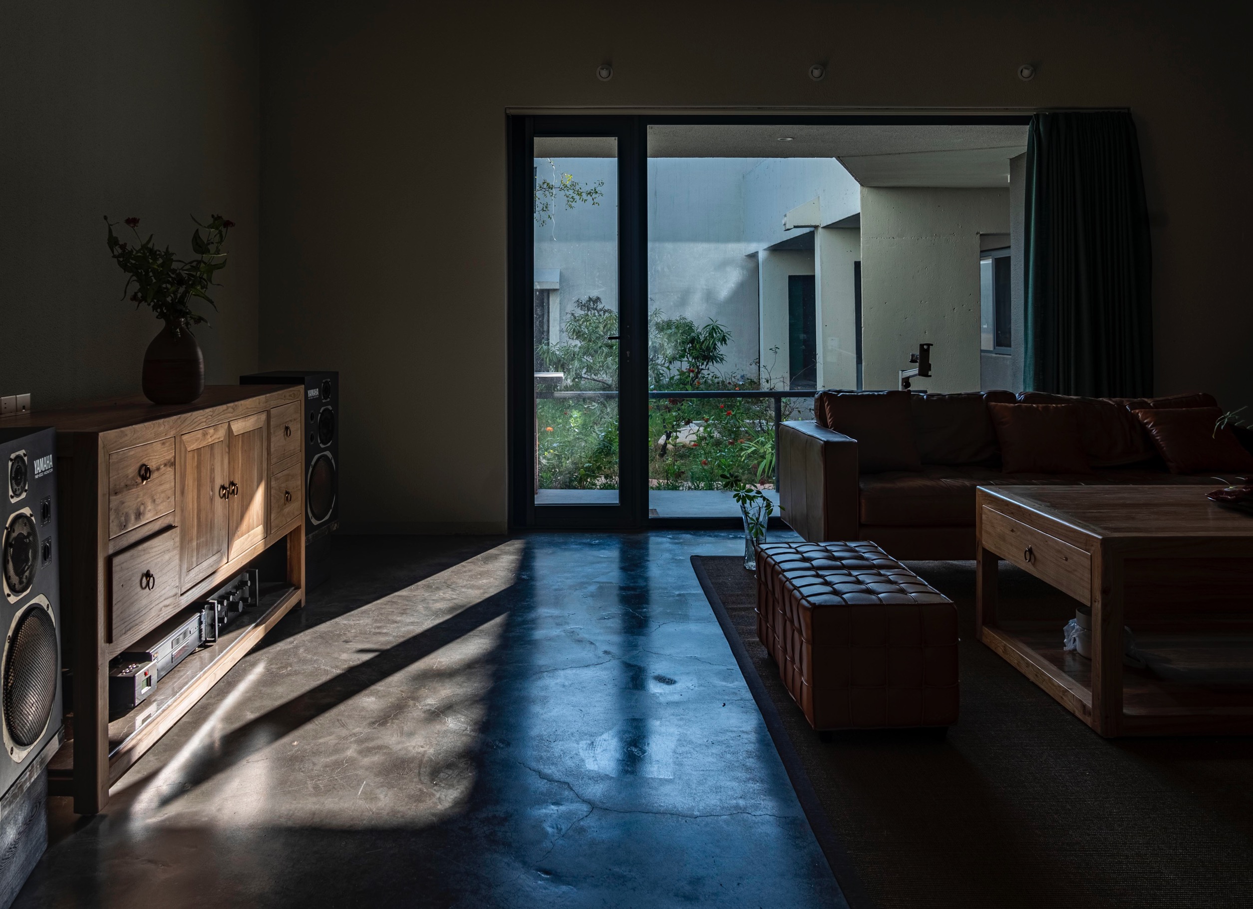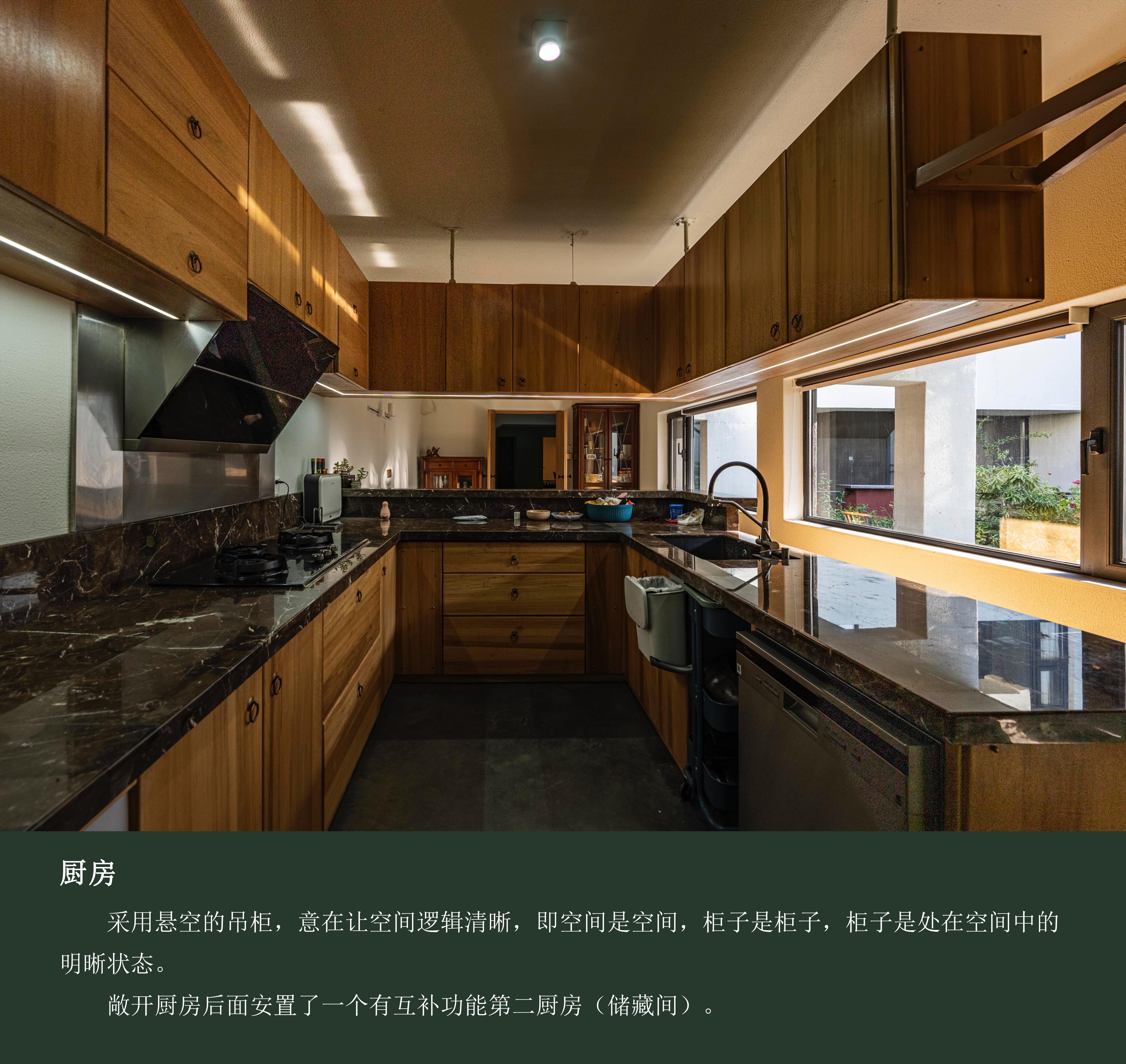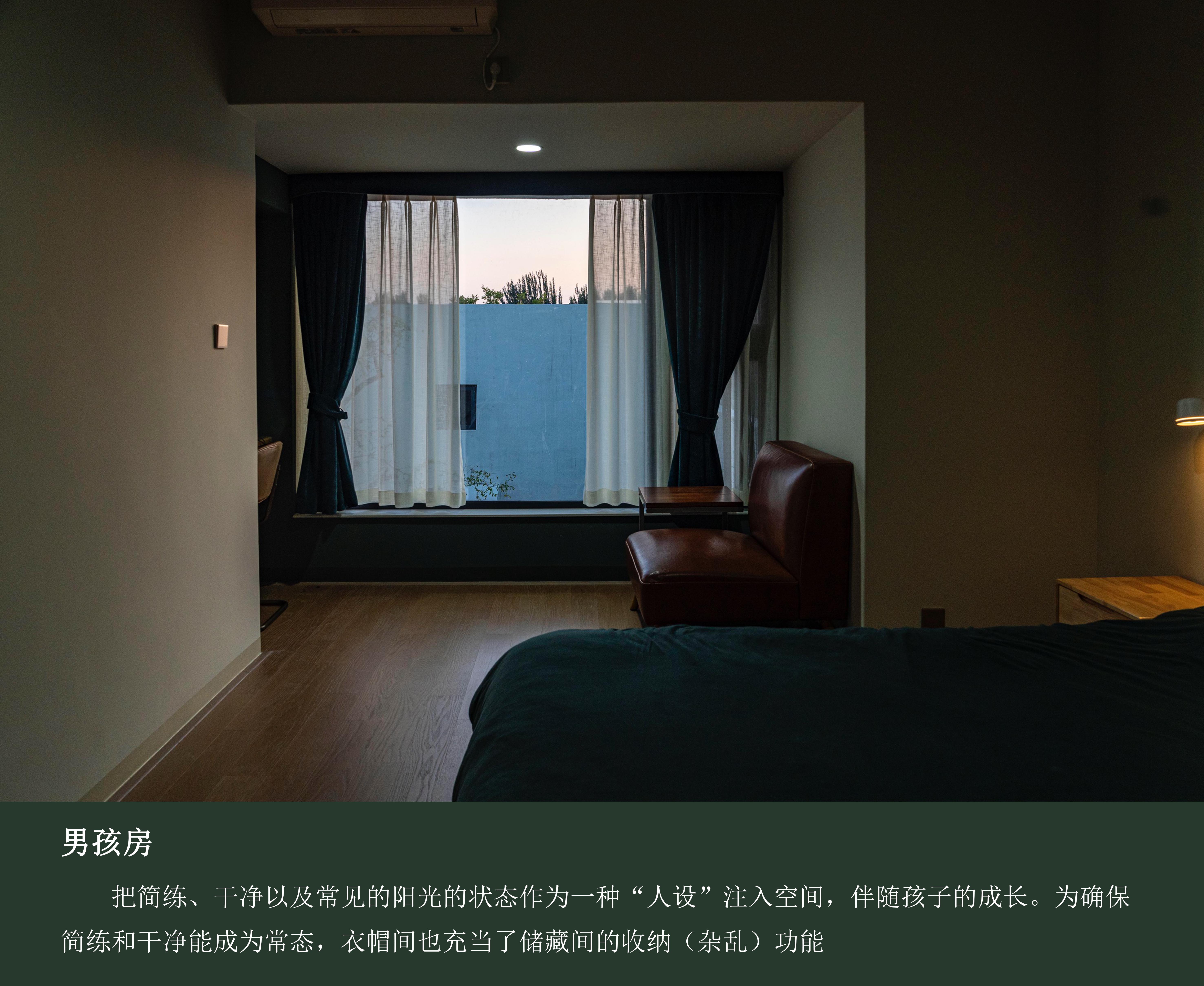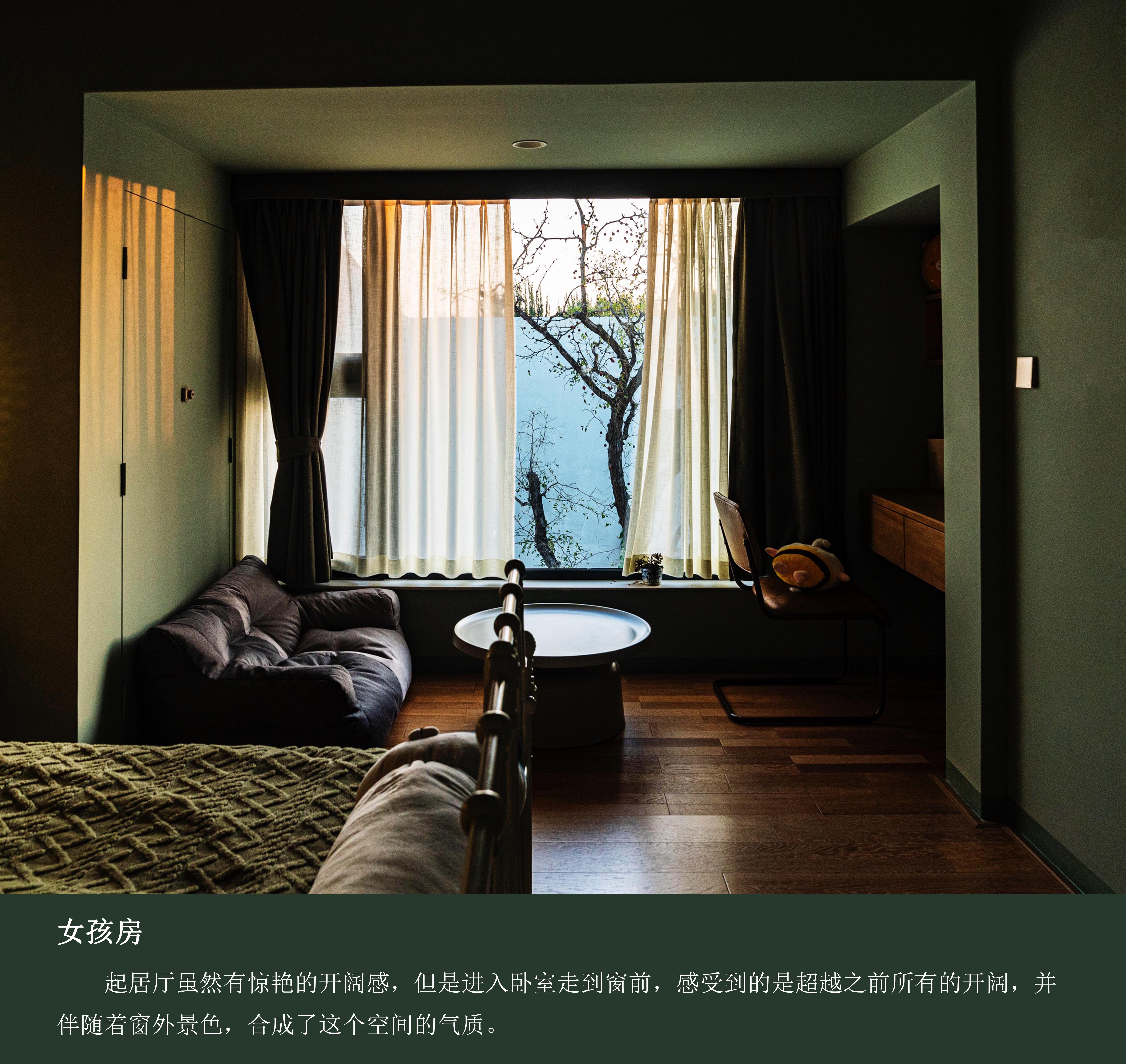 4,关于色彩:有色涂料的运用,目的不是好看,意在功能性的空间界面划分,连同其他材料的色泽共同赋予空间色彩(非颜色属性)。也可以通过不同材质的颜色来定义等级秩序,比如木本色的门(门套)关联的是主空间,白色的门则是附属空间,肌理腻子没刷乳胶漆,原因是腻子有自然黄变的特质,这种自然的旧色是可贵的,他们和水泥以及木材的同步老化,是美妙的时间痕迹,这些都是有生命力的空间色彩。