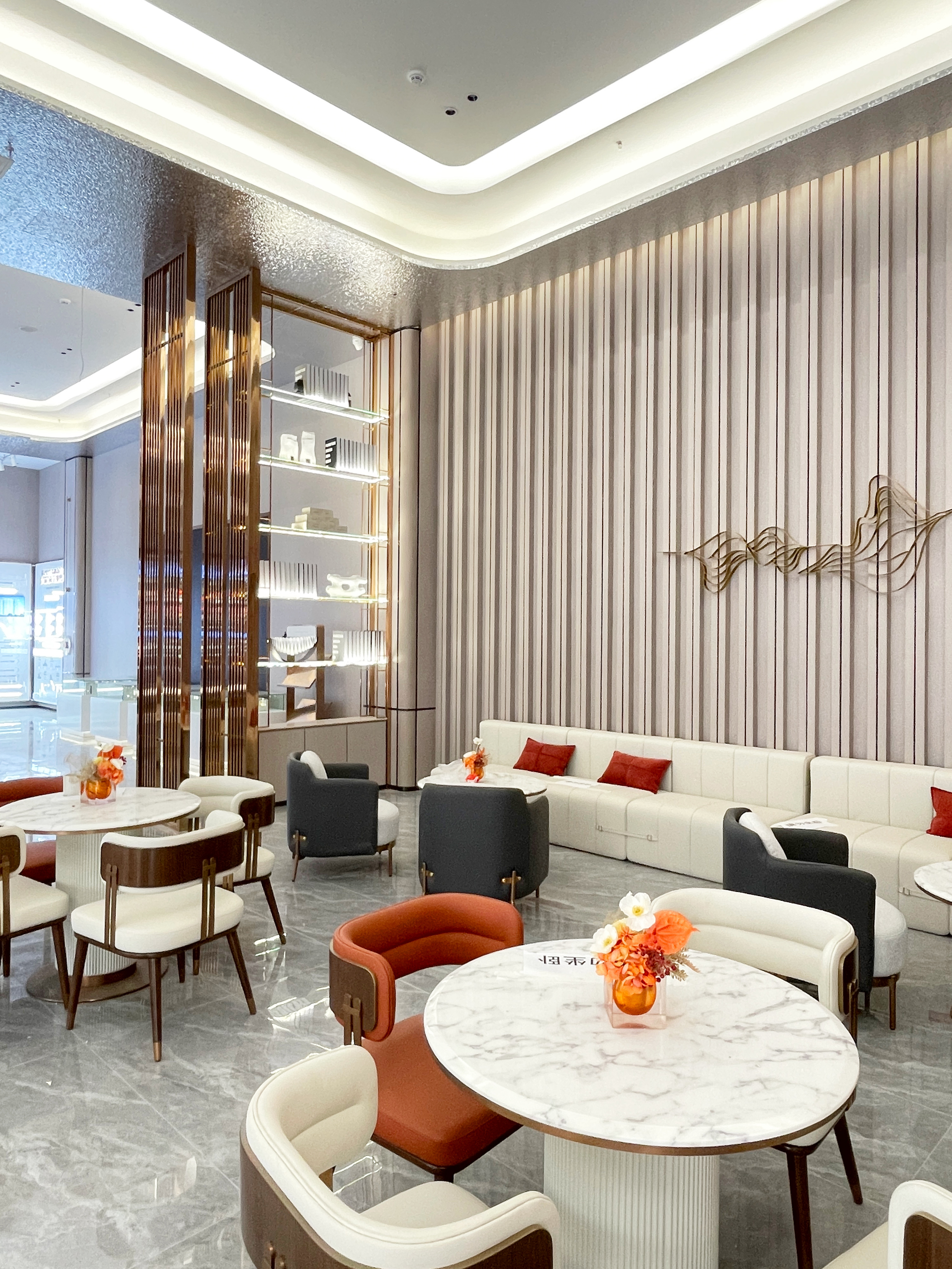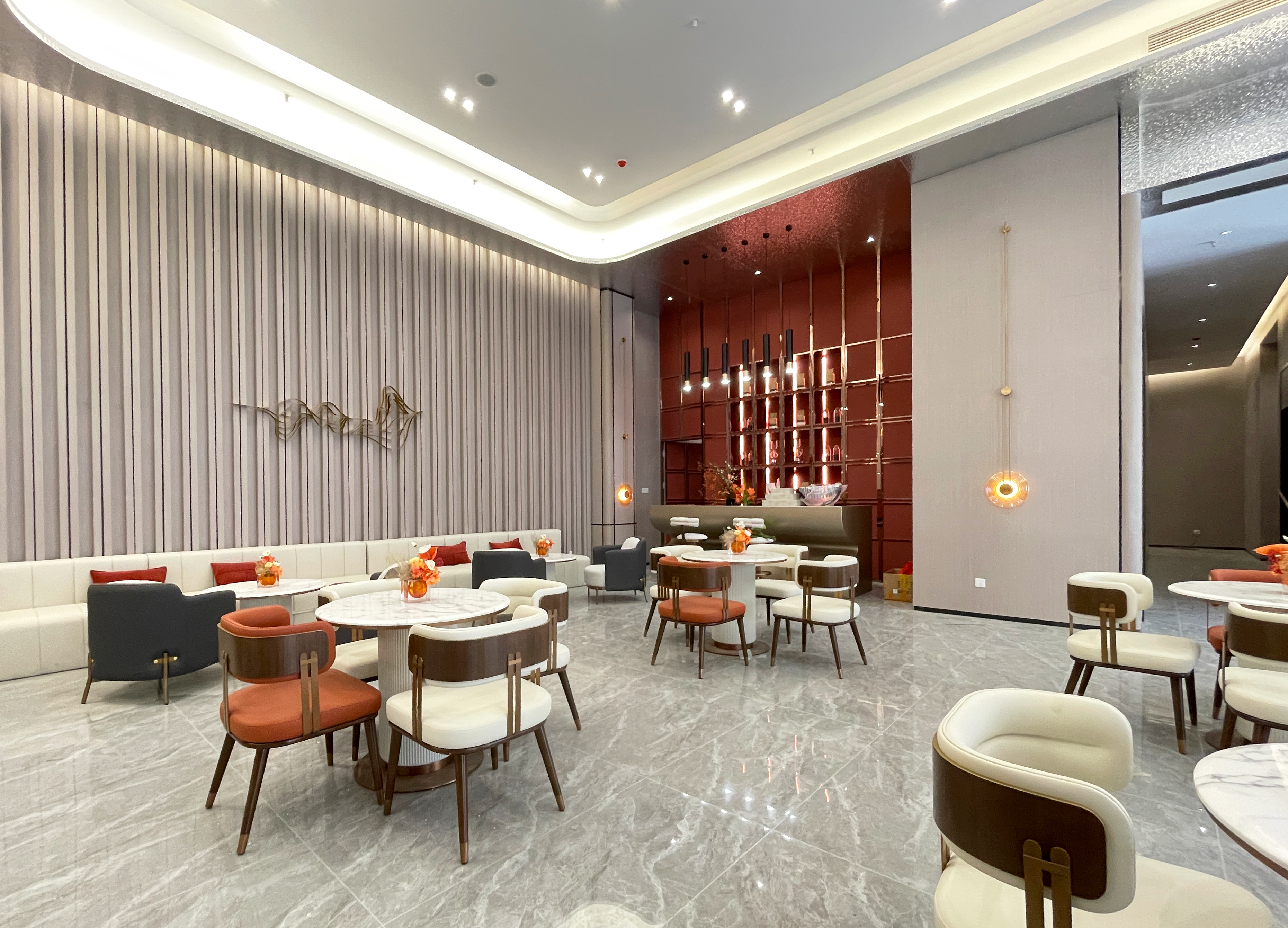 设计选材:以热情奔放的橙红色,以温柔的米白暖调进行辅佐,利用皮革、石材和金属的雅致质感来组合出摩登时尚的环境氛围。