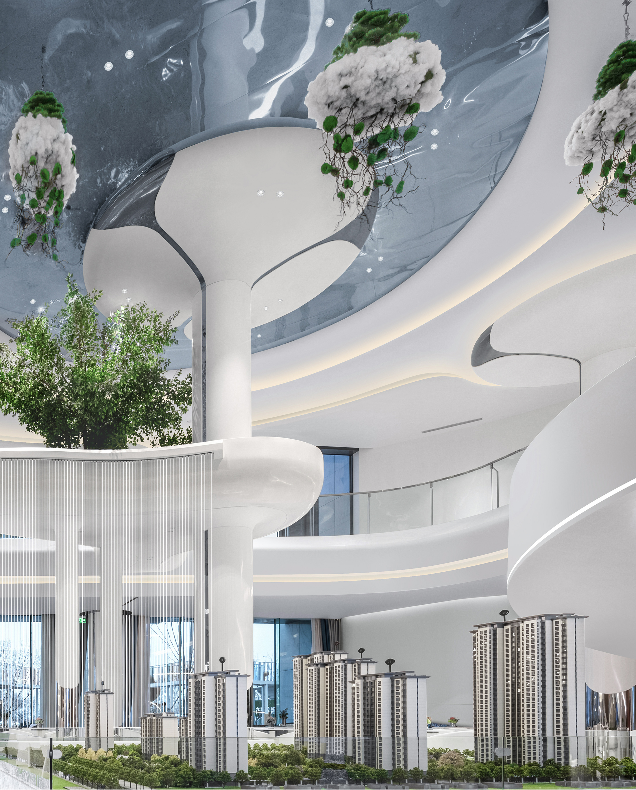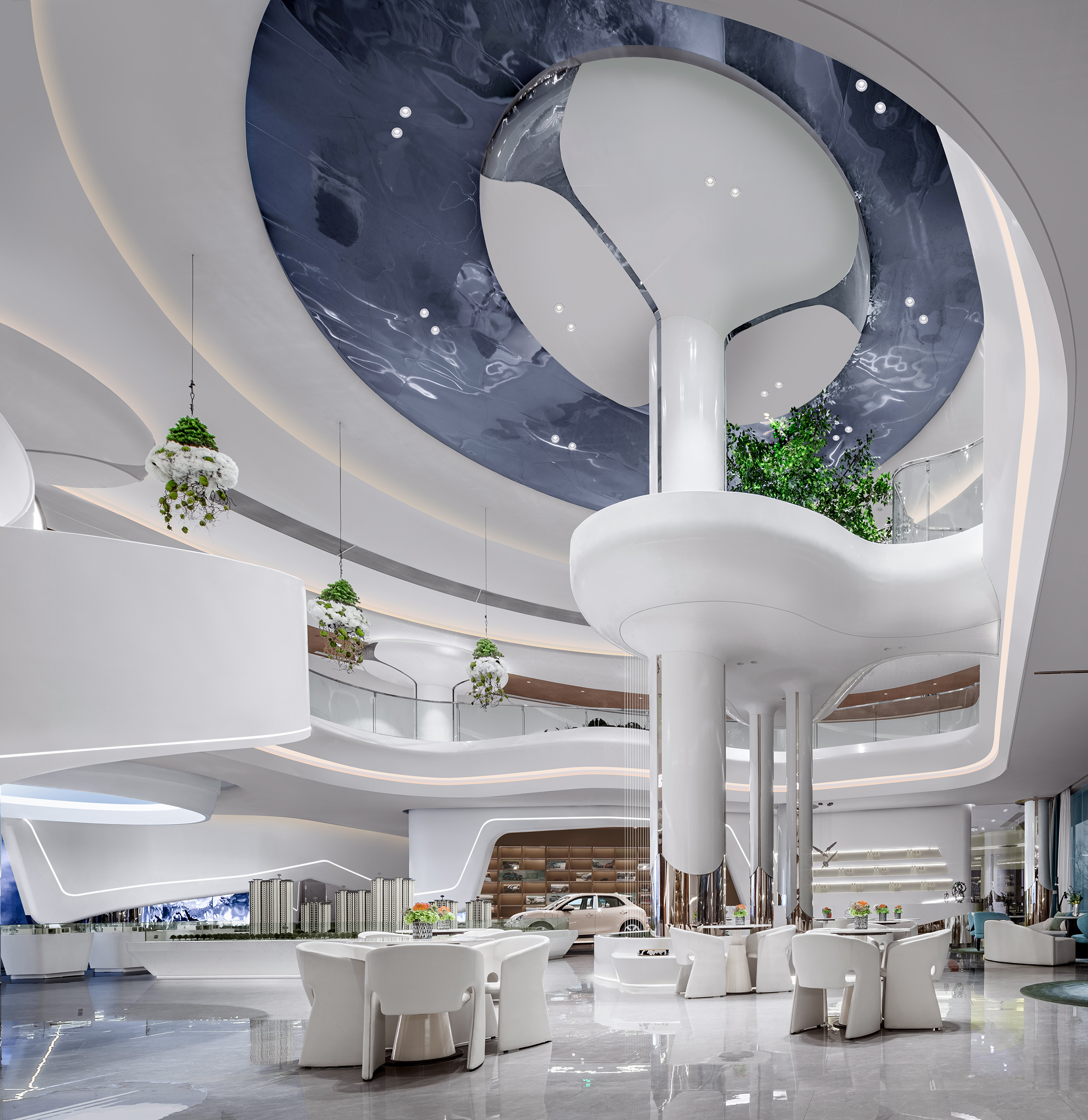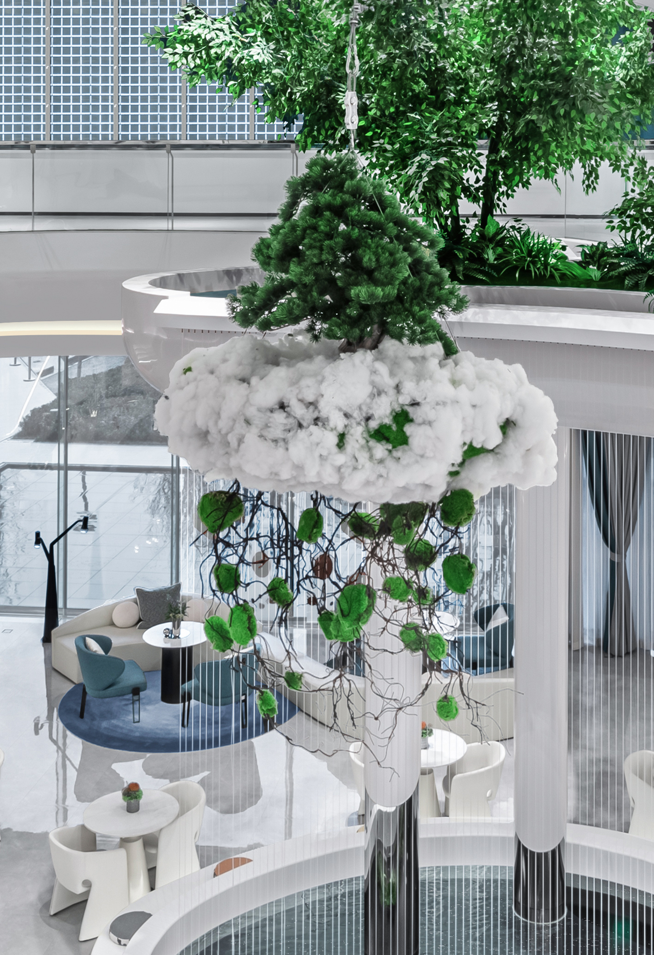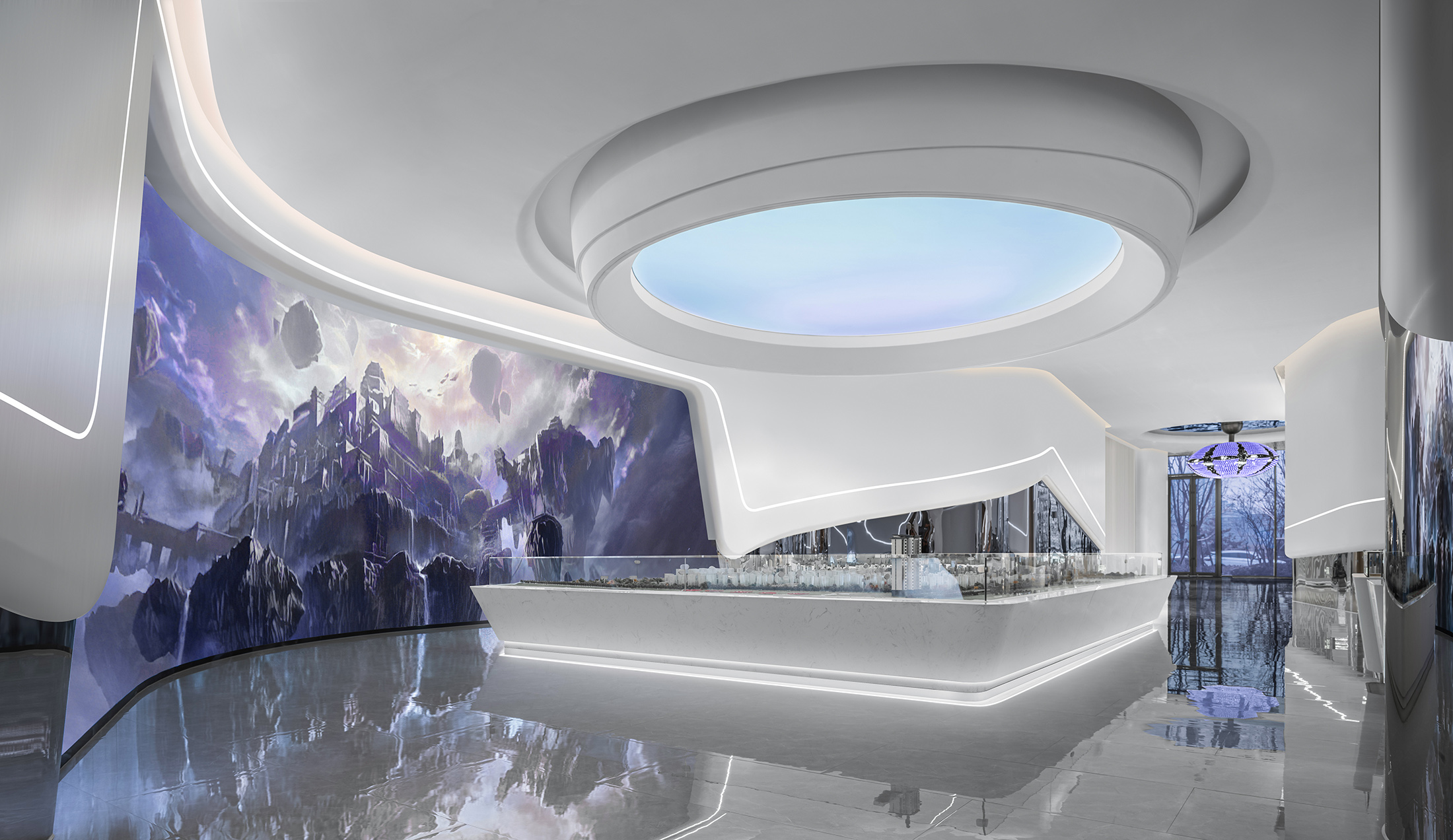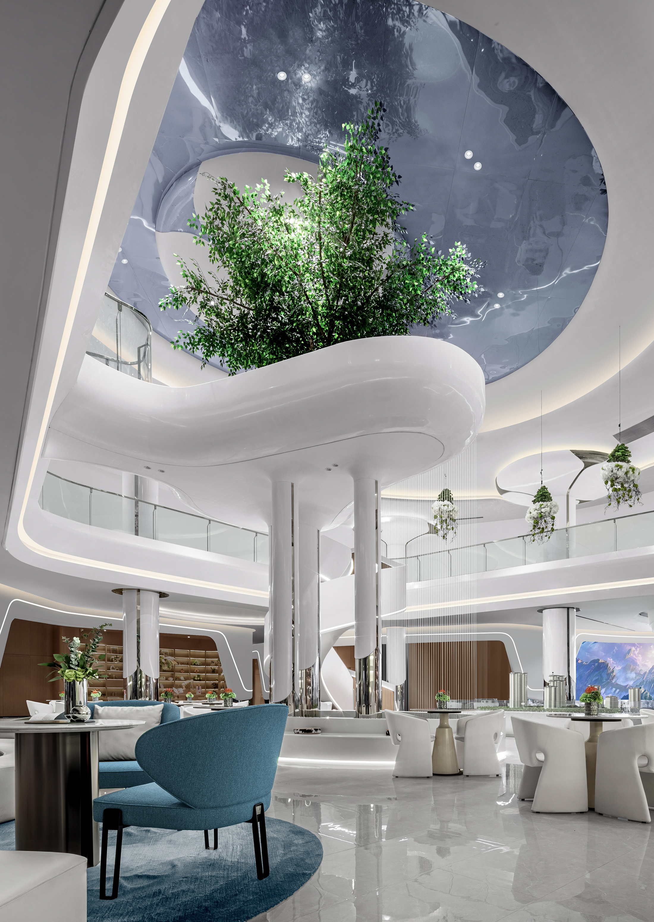 心中的天空之城也应有河流,设计让空间倒置,用镜面波纹钢让河流弯延流淌于天际,让人仿佛置身于梦境中,跟随悬浮船,经过漂浮树,一起去探寻更为神奇的秘境。奔赴未来世界,抬升天空之城的动力,来源于城市底部的动力造型装置,未来感的设计让它像发动机巨大的尾喷,红蓝幻动的色彩如喷涌的能量之源,带动一座座岛屿之城,徐徐上升,展现出气势宏大的叙事场景。本案空间设计将现实与愿景通过场景化表现,从视觉感官与情感连接上,将人带入沉浸式体验场域,白色灵动的建筑表皮在空间游走,瀑水于空中倾泻,绿植在云端生长,尽头是深遂的宇宙,设计师把哈弗城融于奇幻的场景中,使之成为心中的理想之城。