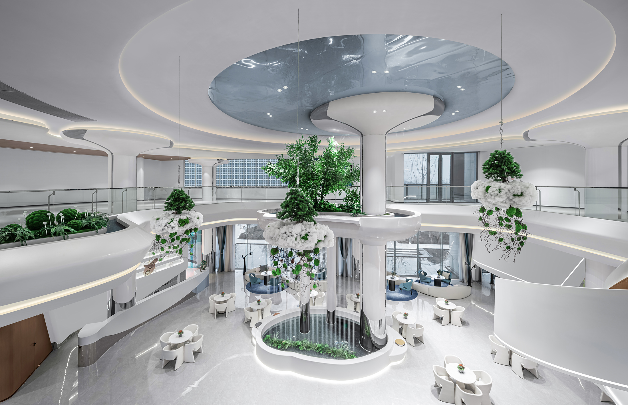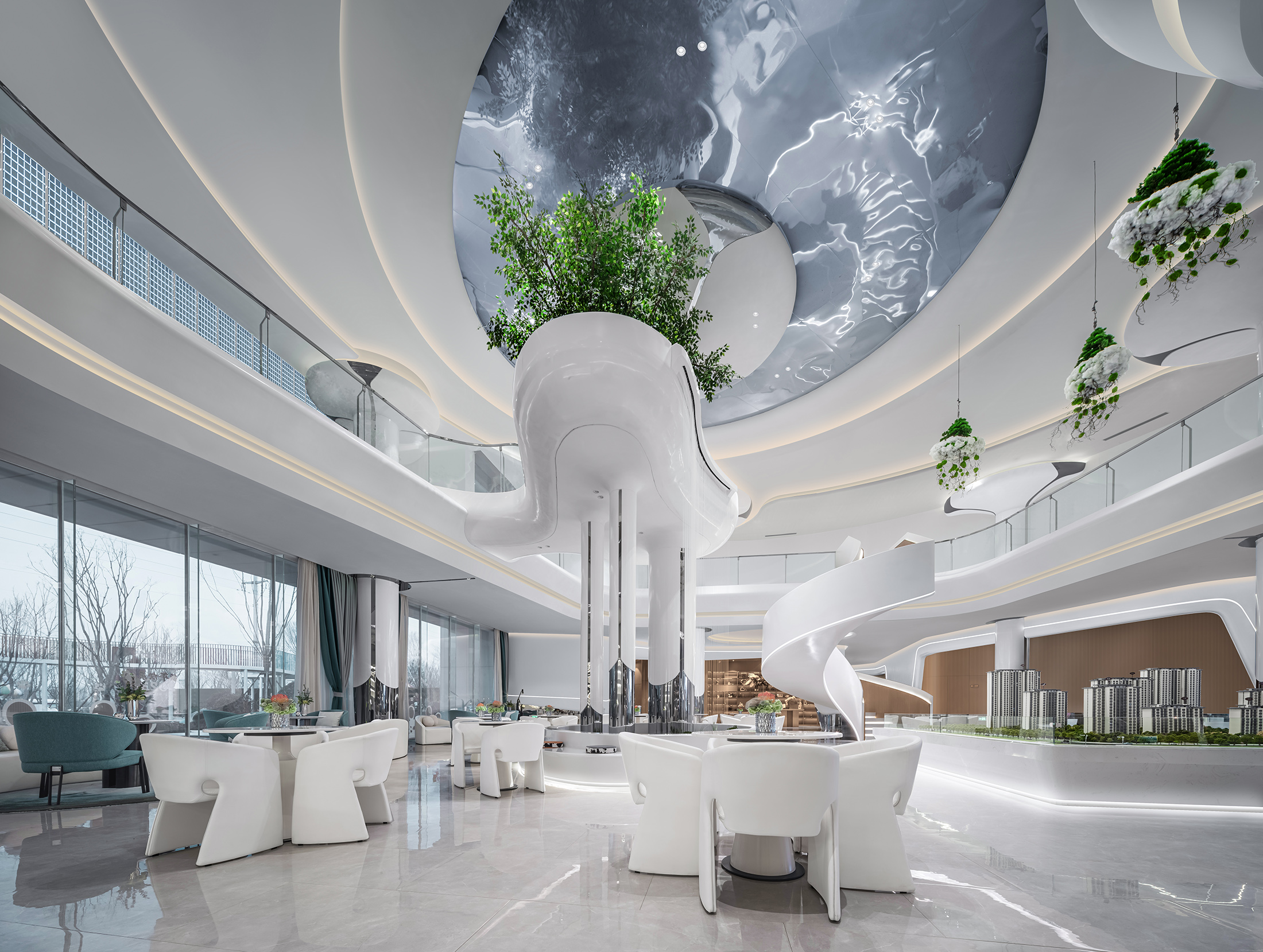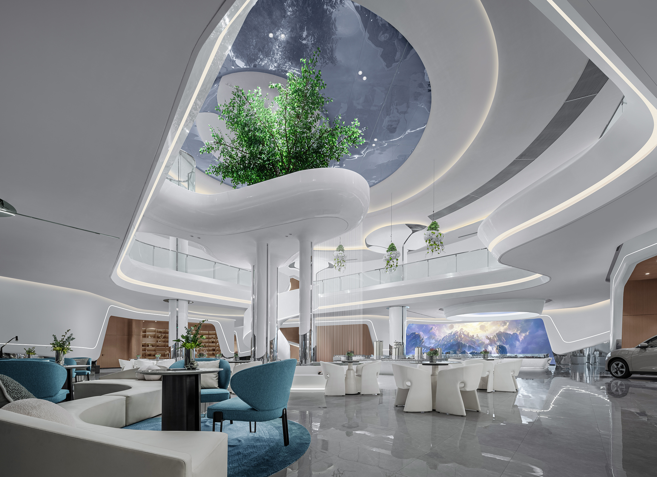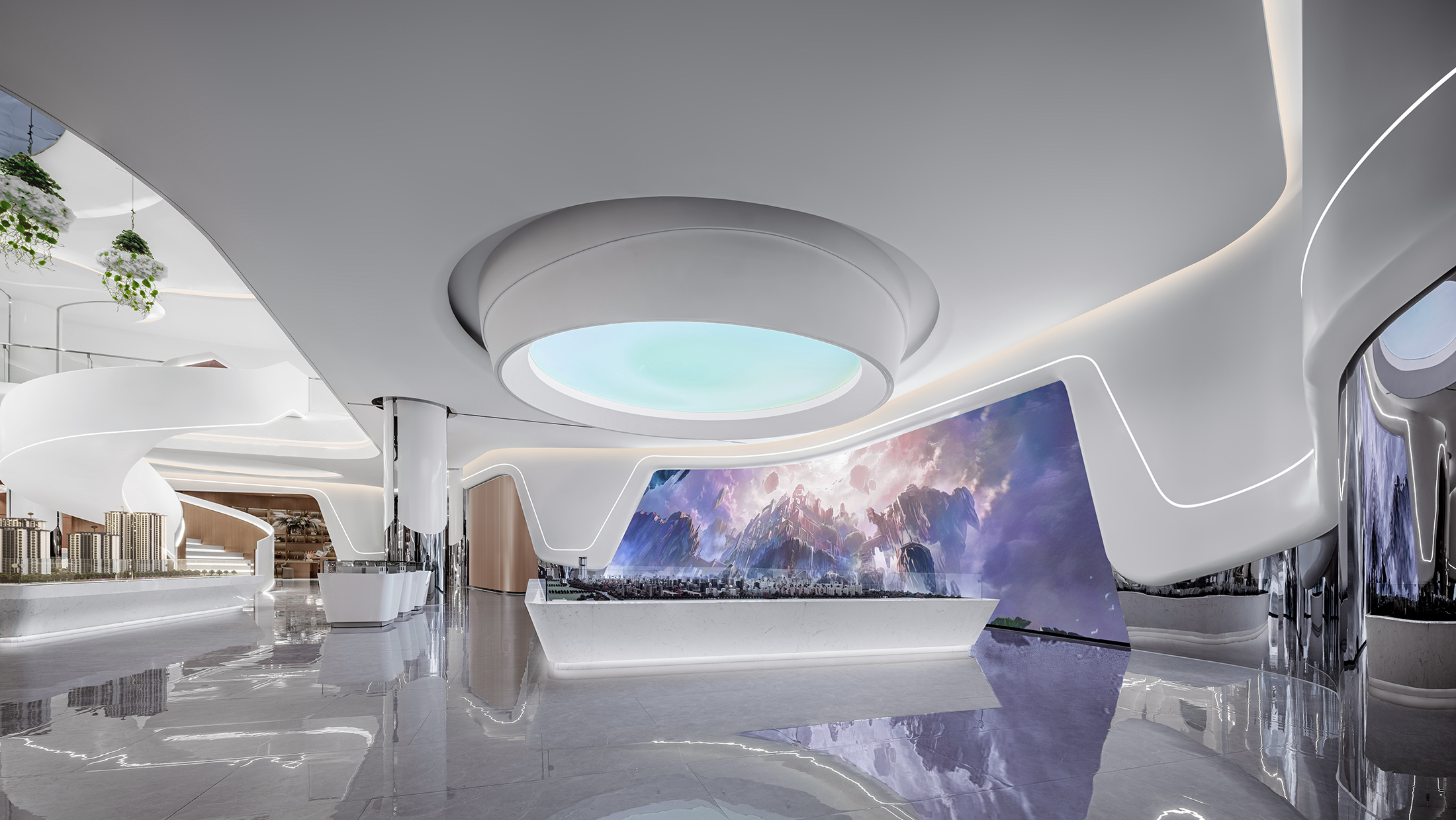 心中的天空之城也应有河流,设计让空间倒置,用镜面波纹钢让河流弯延流淌于天际,让人仿佛置身于梦境中,跟随悬浮船,经过漂浮树,一起去探寻更为神奇的秘境。奔赴未来世界,抬升天空之城的动力,来源于城市底部的动力造型装置,未来感的设计让它像发动机巨大的尾喷,红蓝幻动的色彩如喷涌的能量之源,带动一座座岛屿之城,徐徐上升,展现出气势宏大的叙事场景。本案空间设计将现实与愿景通过场景化表现,从视觉感官与情感连接上,将人带入沉浸式体验场域,白色灵动的建筑表皮在空间游走,瀑水于空中倾泻,绿植在云端生长,尽头是深遂的宇宙,设计师把哈弗城融于奇幻的场景中,使之成为心中的理想之城。