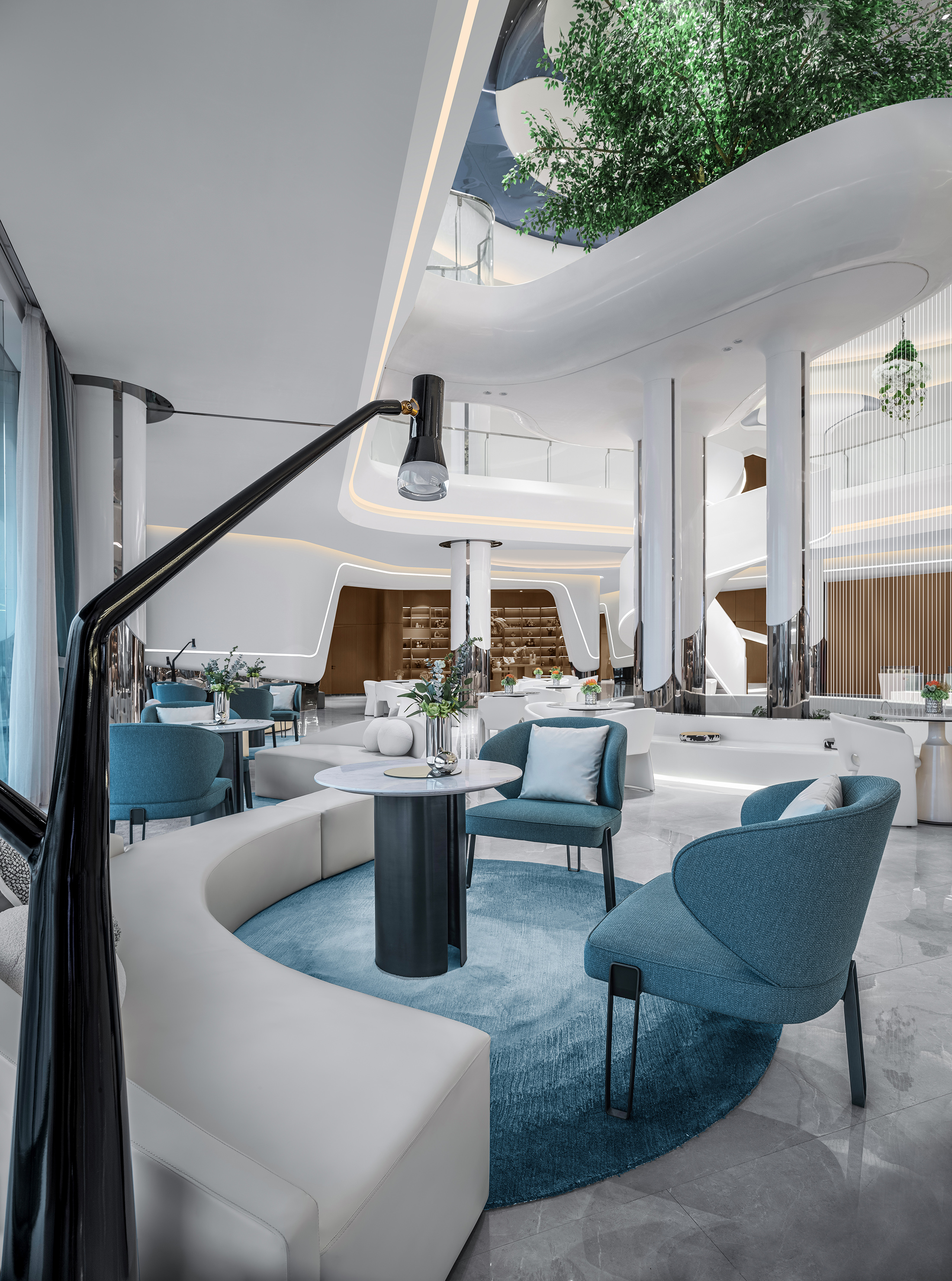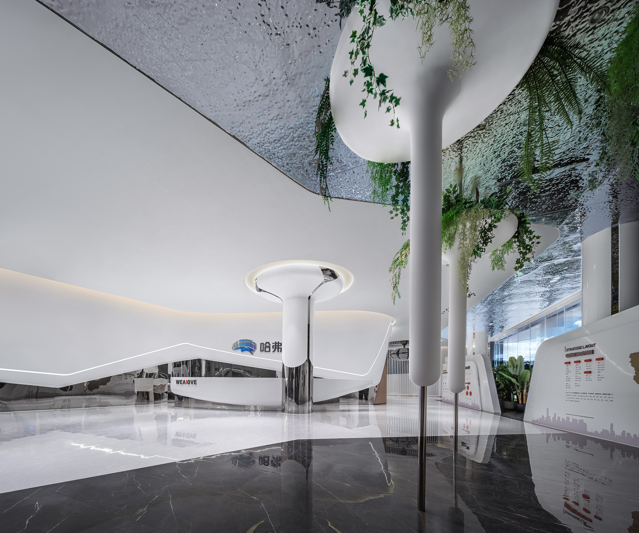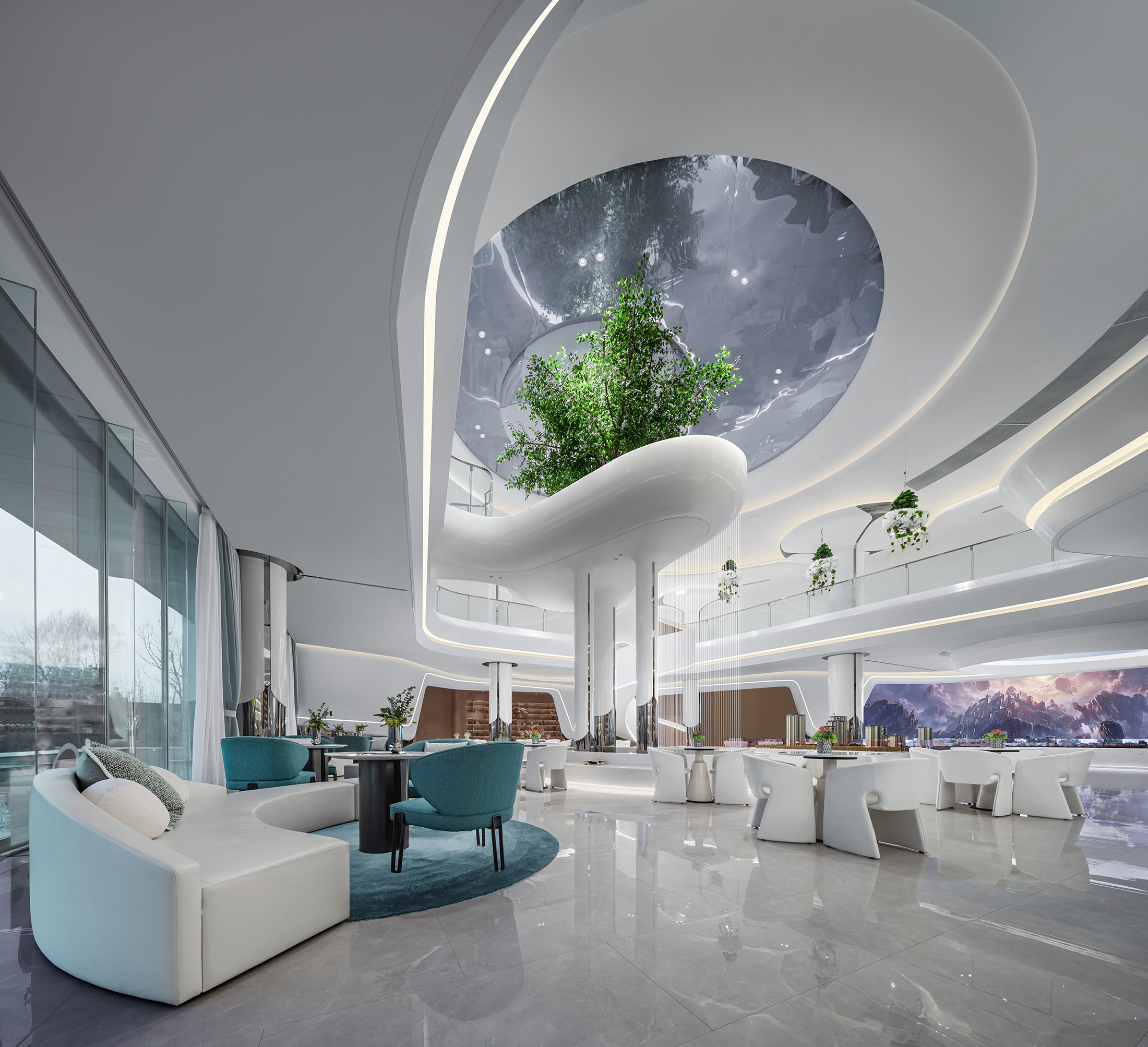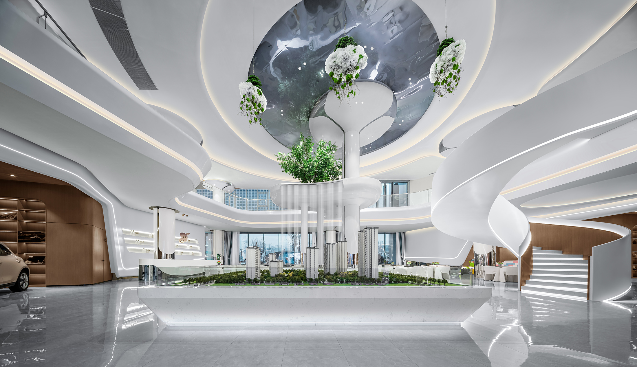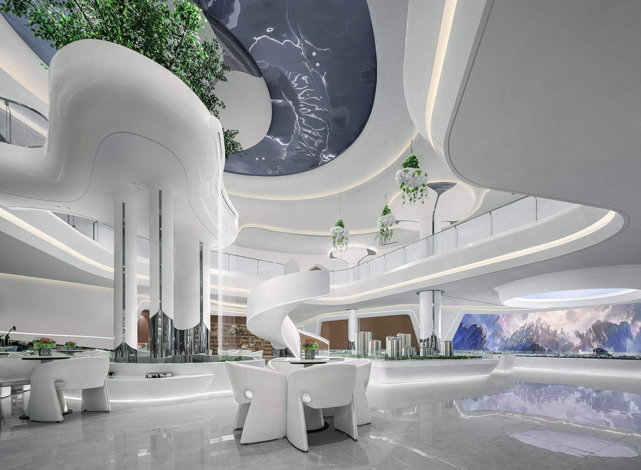 心中的天空之城也应有河流,设计让空间倒置,用镜面波纹钢让河流弯延流淌于天际,让人仿佛置身于梦境中,跟随悬浮船,经过漂浮树,一起去探寻更为神奇的秘境。奔赴未来世界,抬升天空之城的动力,来源于城市底部的动力造型装置,未来感的设计让它像发动机巨大的尾喷,红蓝幻动的色彩如喷涌的能量之源,带动一座座岛屿之城,徐徐上升,展现出气势宏大的叙事场景。本案空间设计将现实与愿景通过场景化表现,从视觉感官与情感连接上,将人带入沉浸式体验场域,白色灵动的建筑表皮在空间游走,瀑水于空中倾泻,绿植在云端生长,尽头是深遂的宇宙,设计师把哈弗城融于奇幻的场景中,使之成为心中的理想之城。