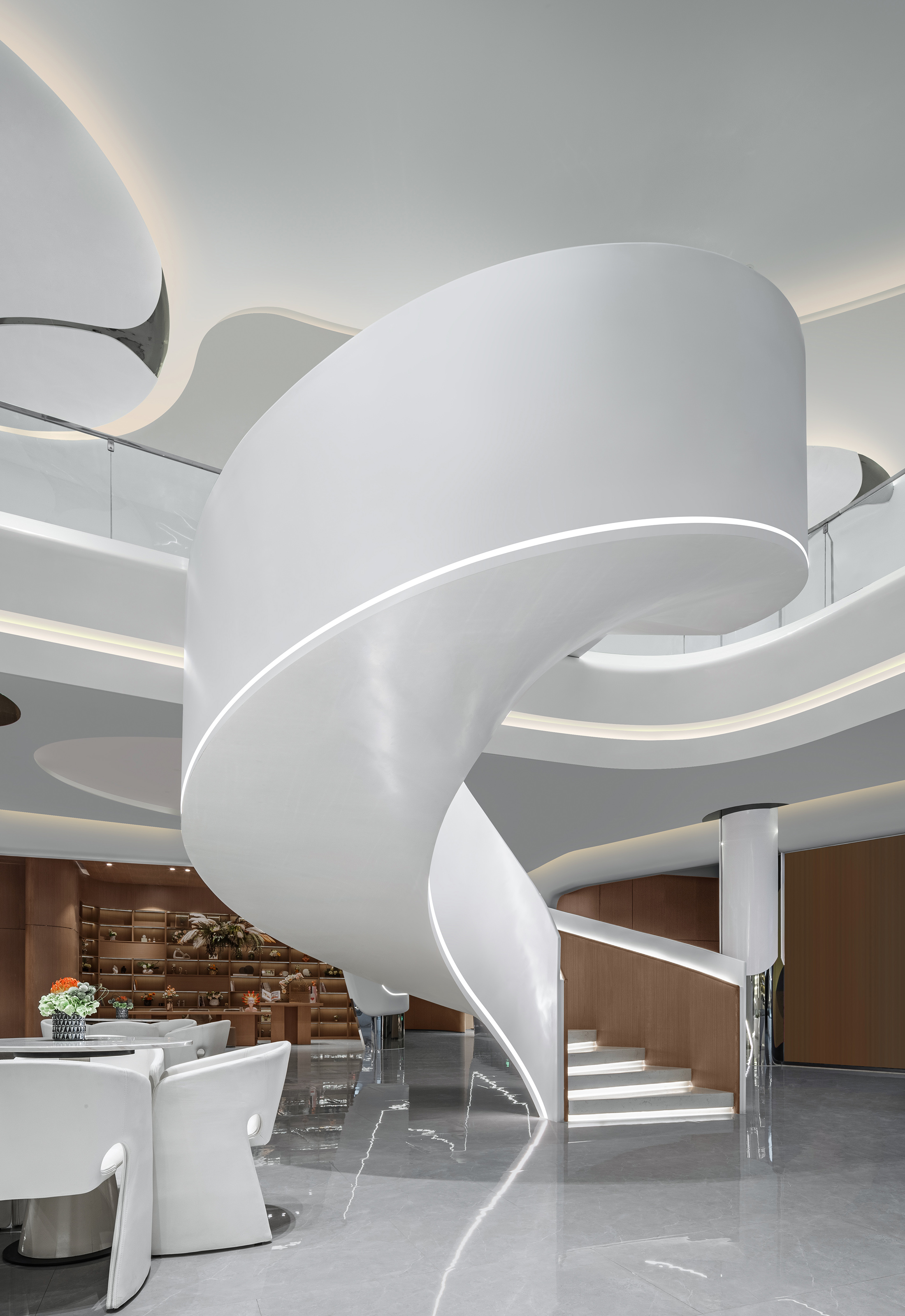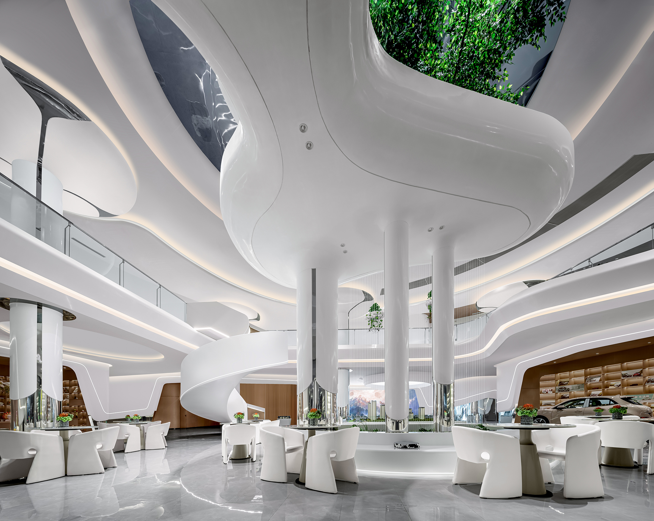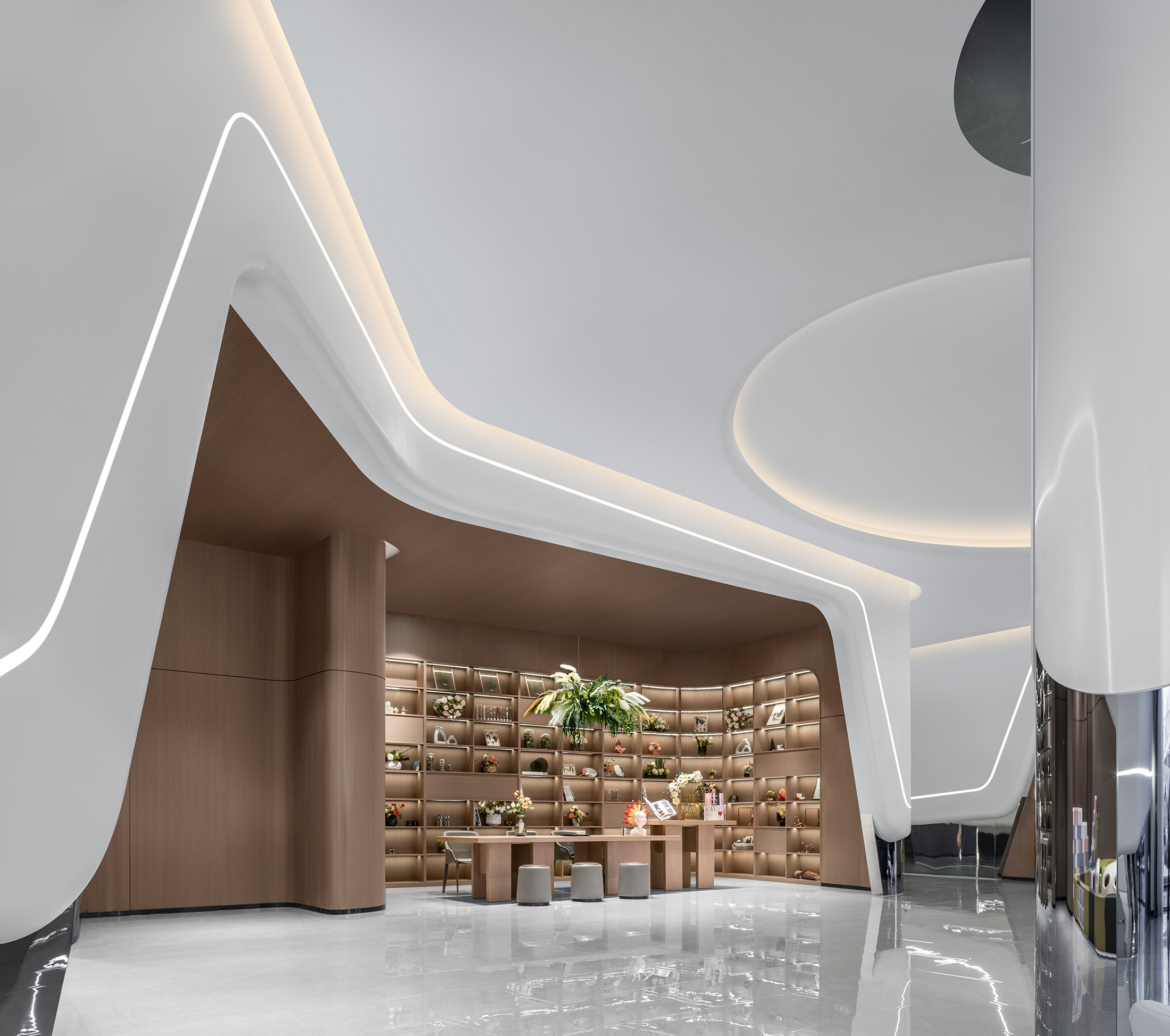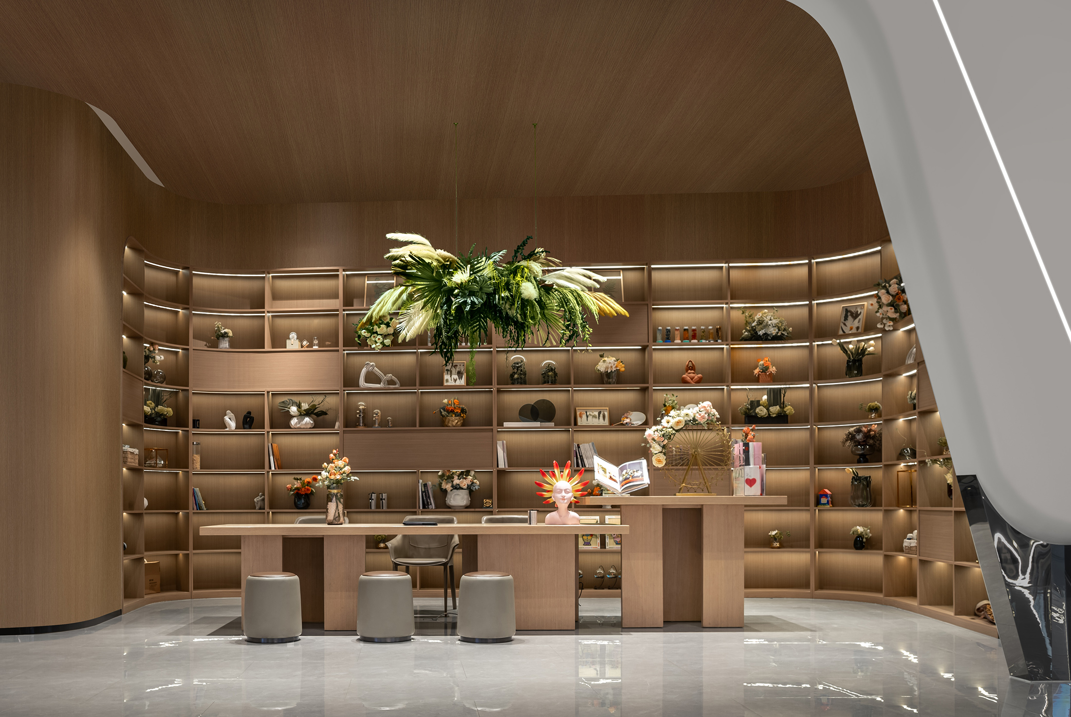 云梯、瀑台、洞穴、游廊,多重设计空间带来不同的视觉及情感体验,或宏伟、或奇幻、或温暖、或自然。自由的线条,带来灵动的空间,不断的层次与变化给人以无限的遐想。在这里,色彩是单纯的,心情是松驰的。白色表皮包裹着木色小天地,将花店、汽车展示厅、儿童娱乐区打造成一个个洞穴,温暖可爱,十分新奇,引人不由自主地想要去探究,在畅游中得到更多趣味的互动体验。