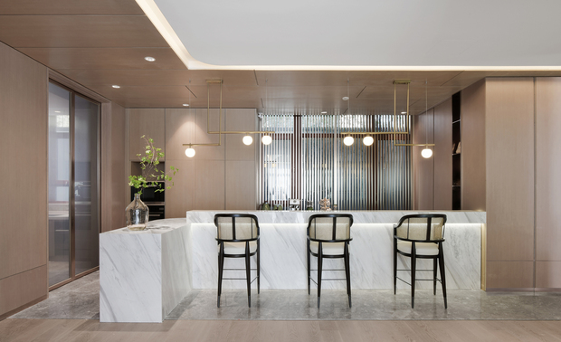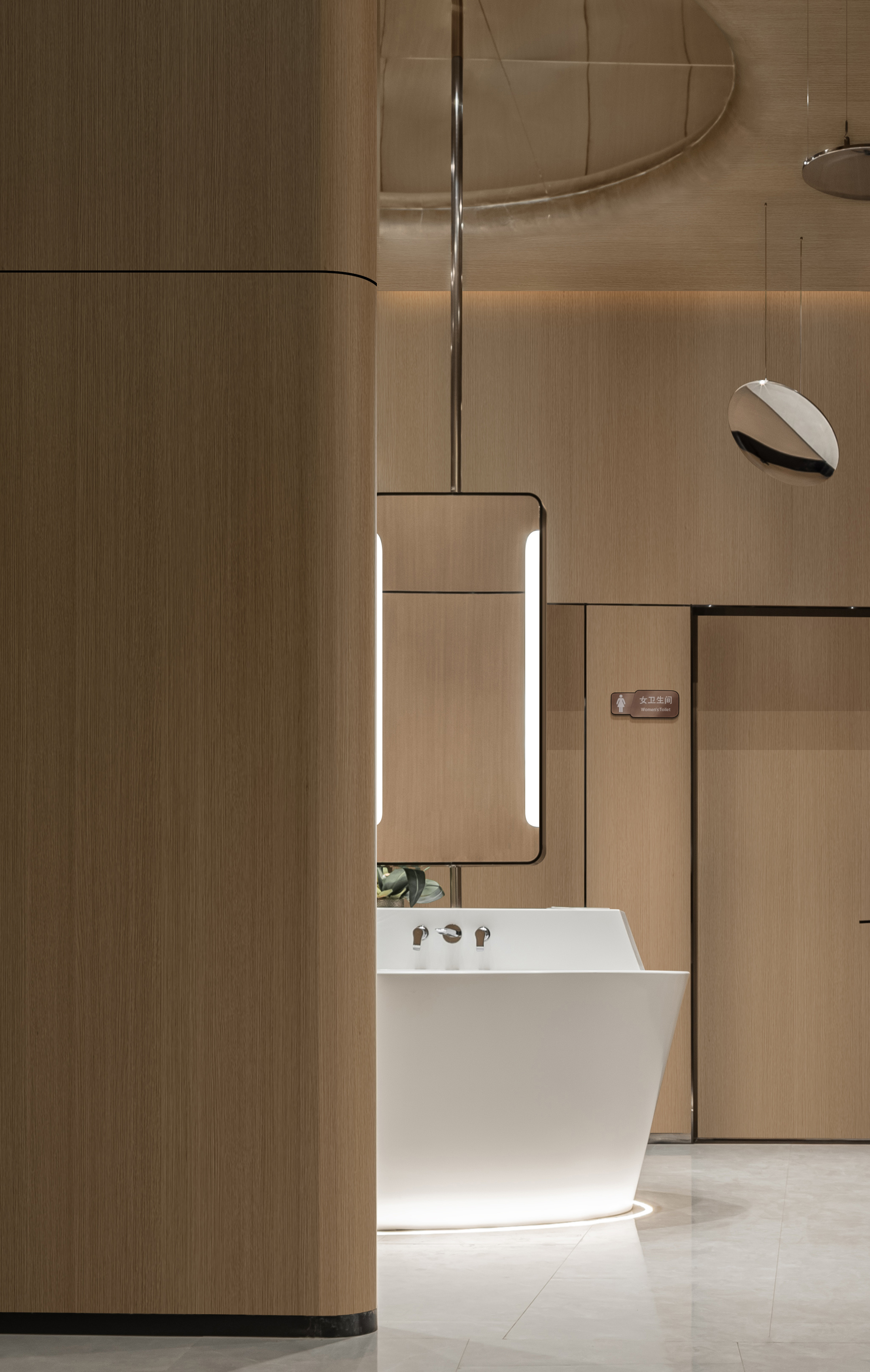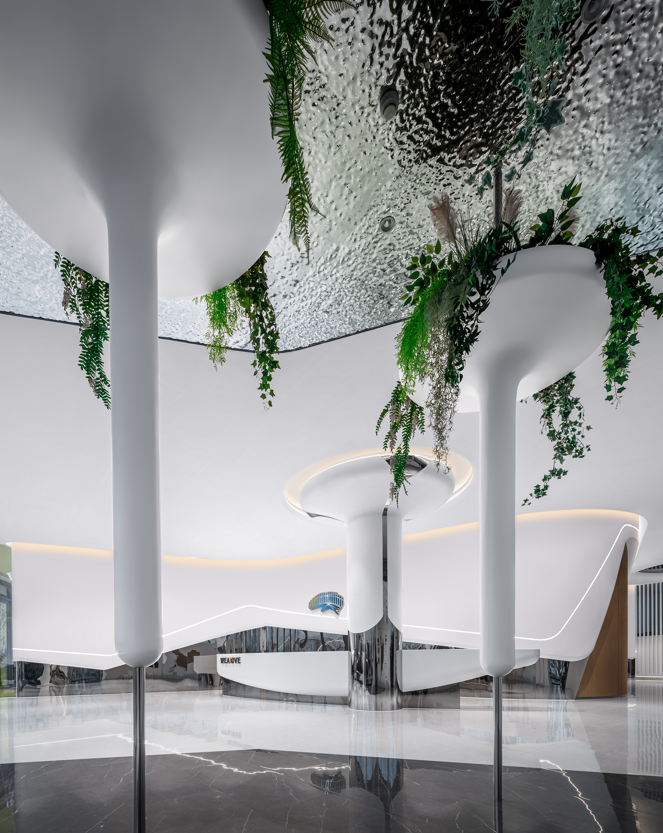 镜面不锈钢沿展于立面的底端,让整个空间于视觉上浮离地面,悬浮于空中并冉冉上升,脱离地心的力量悄无声息地形成强大的空间气场。天然绿植与花艺游走在场域的间隙中,不仅起到室内装饰的作用, 更起到了绿化环境、净化空气的作用。