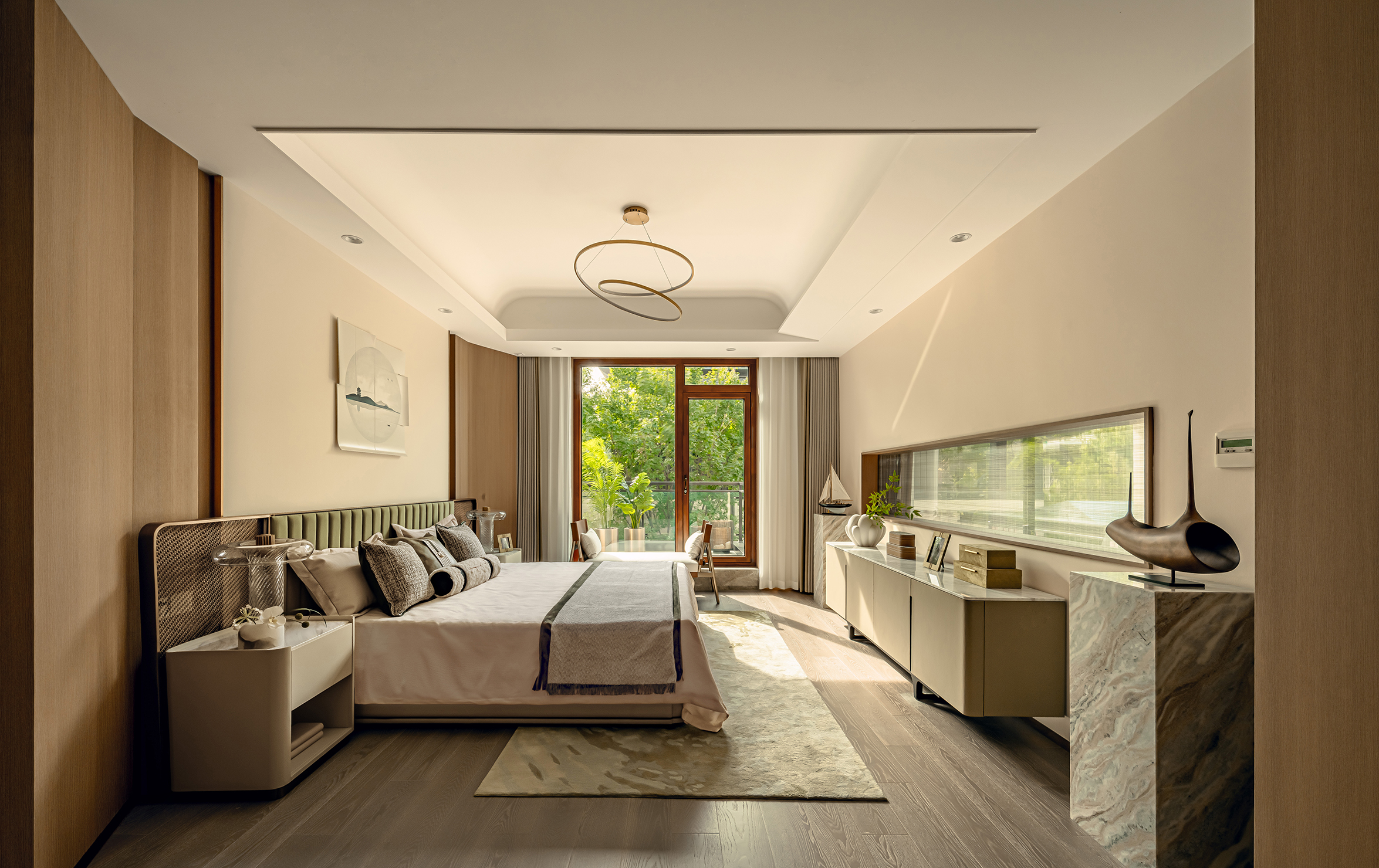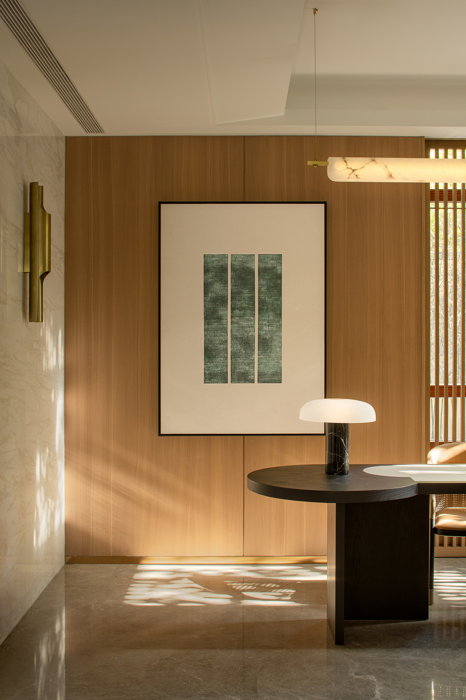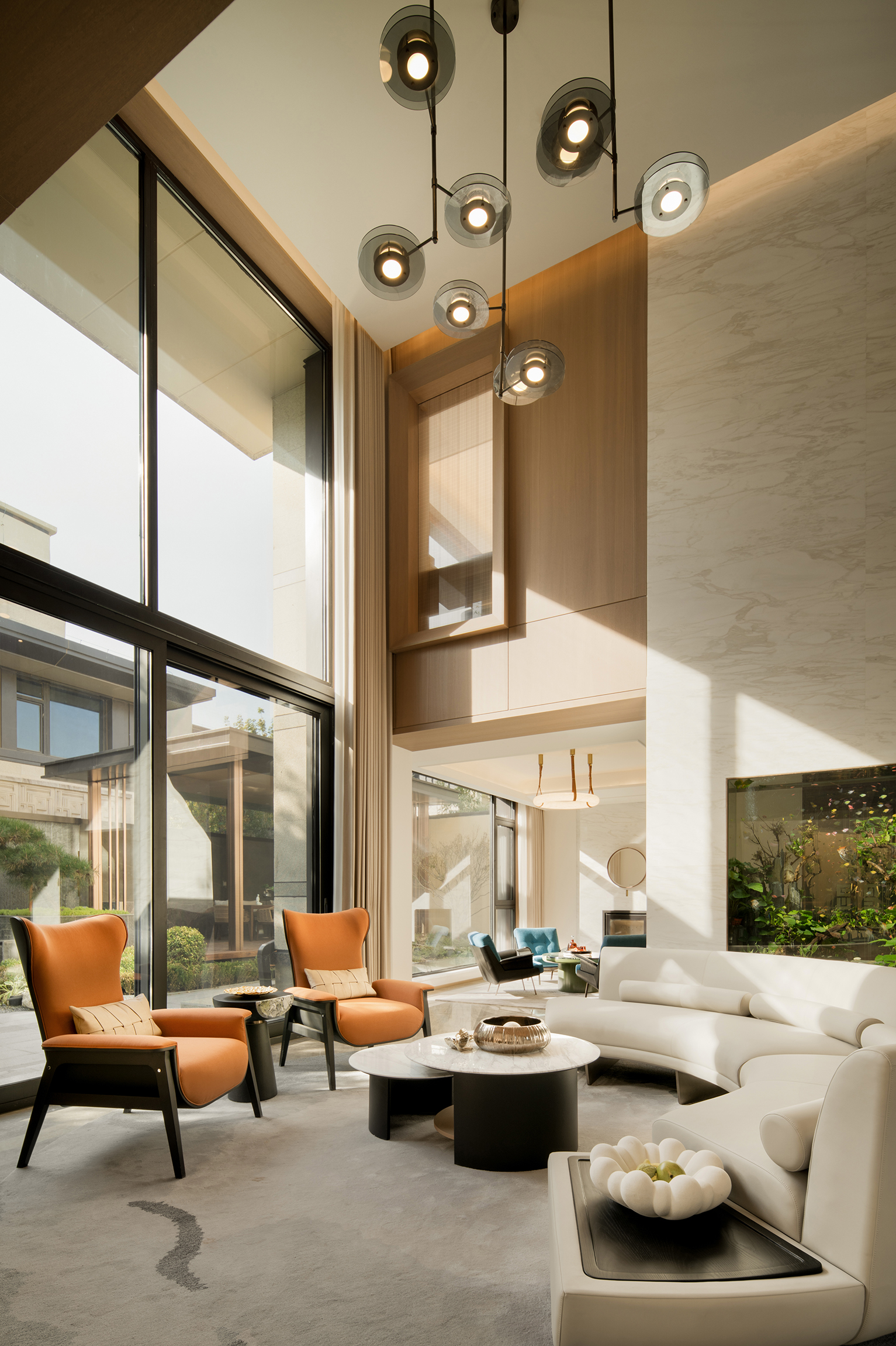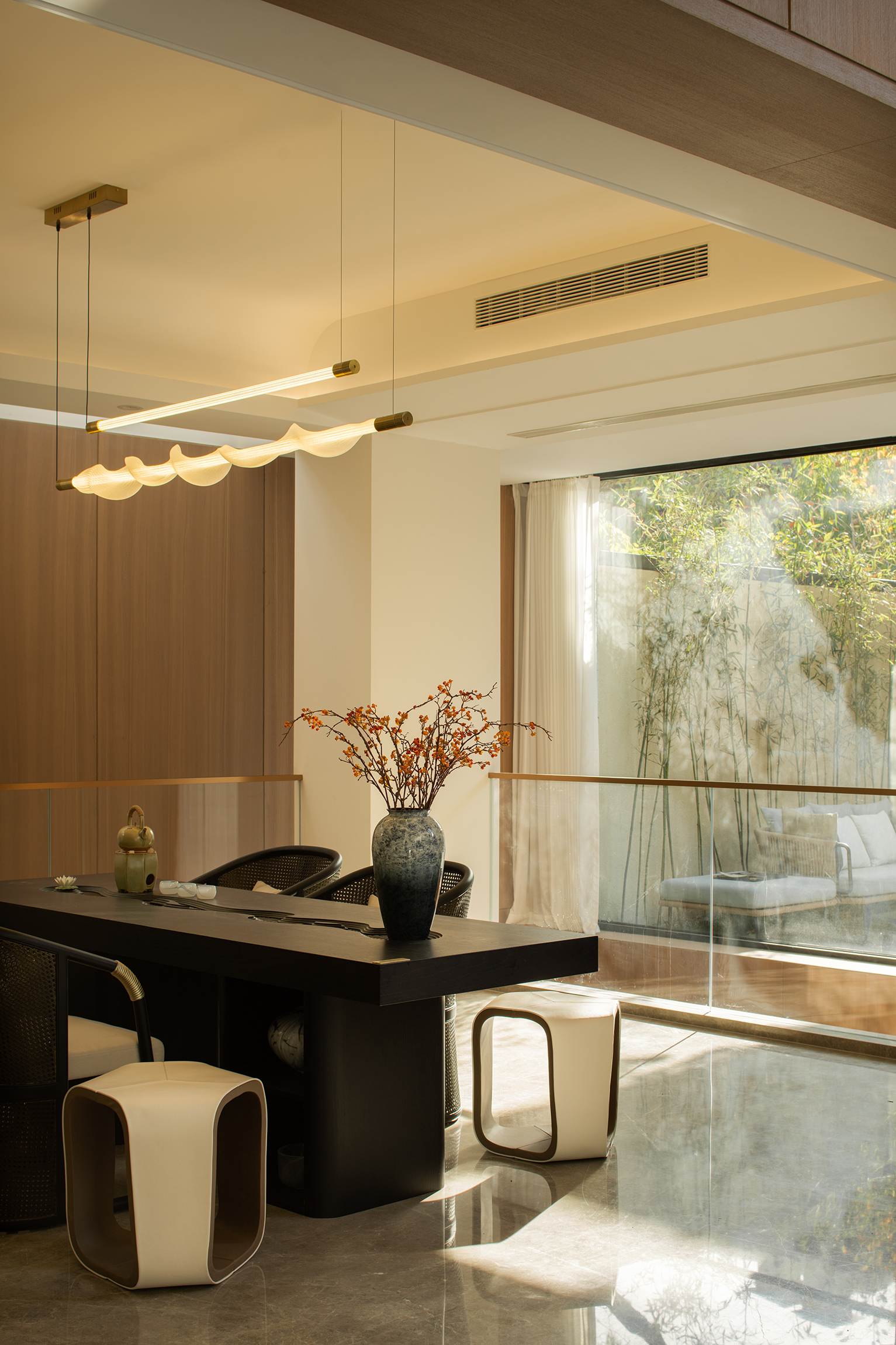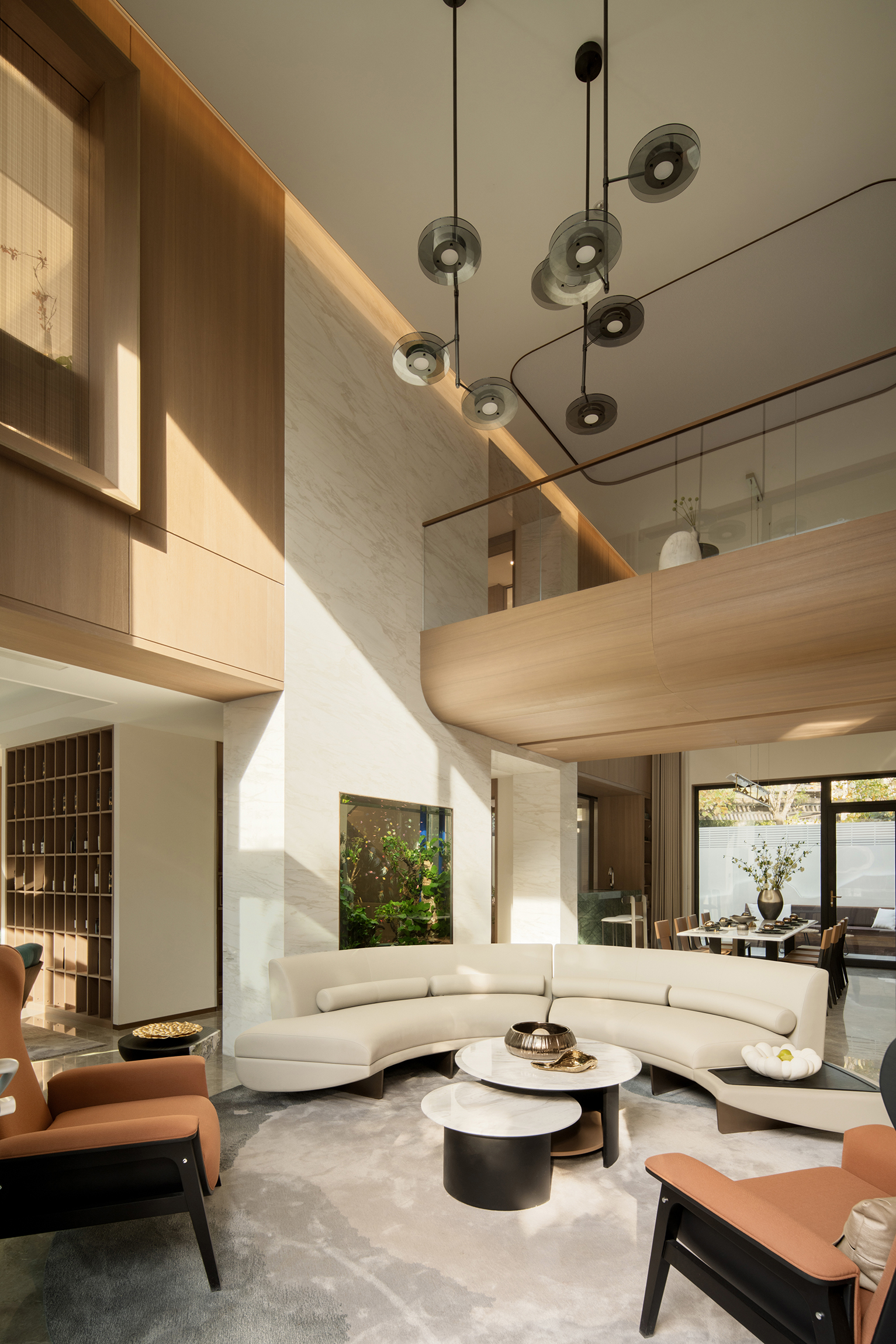 空间意境:设计师以大开大合的设计理念营造“内建筑”空间,让室内尽可能地开敞,将户外绿意和阳光全面纳入室内,使空间气韵流动。并利用穿插、飘叠、透景等设计方式,营造舷窗、飘廊等及具诗情画意的互动空间。本案设计以一日、四季为时间线,将每个功能空间赋于情景交融的主题,通过光影的变化相串联,使人时刻置身于自然之中,随着时间的转变达至不同的心境。