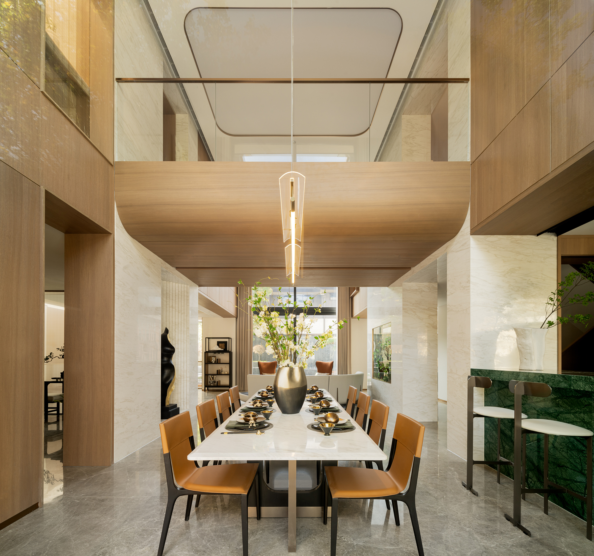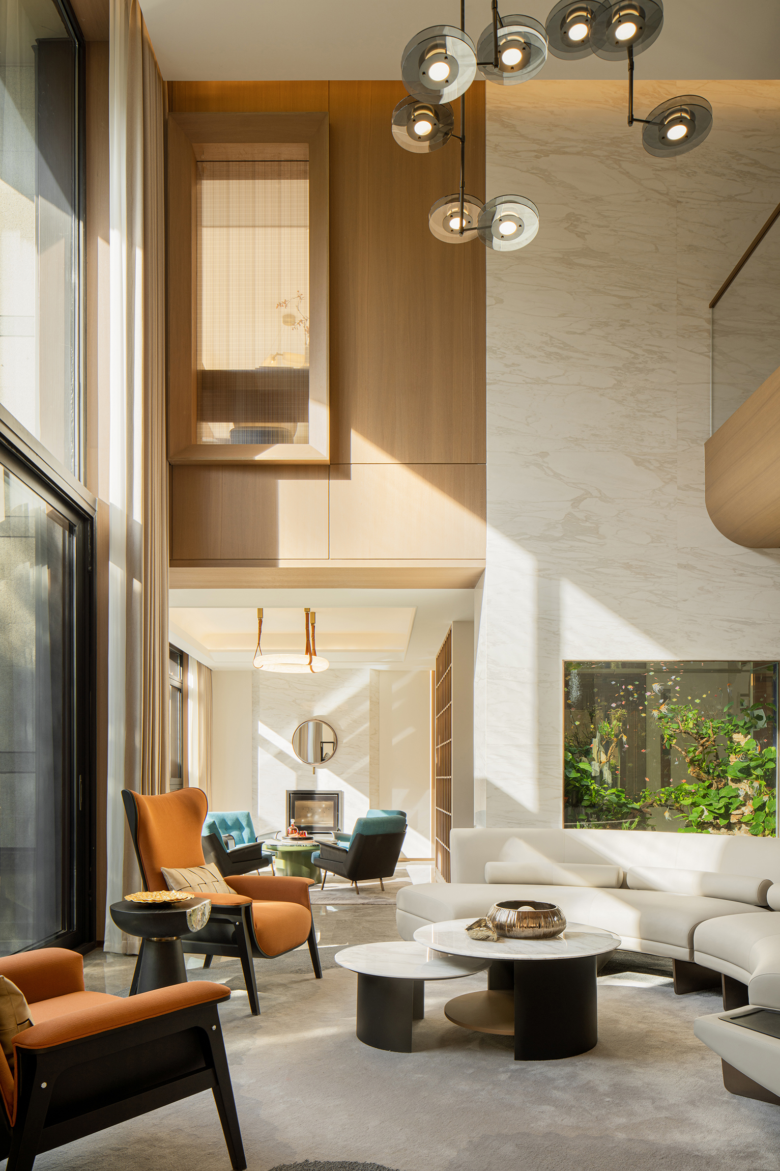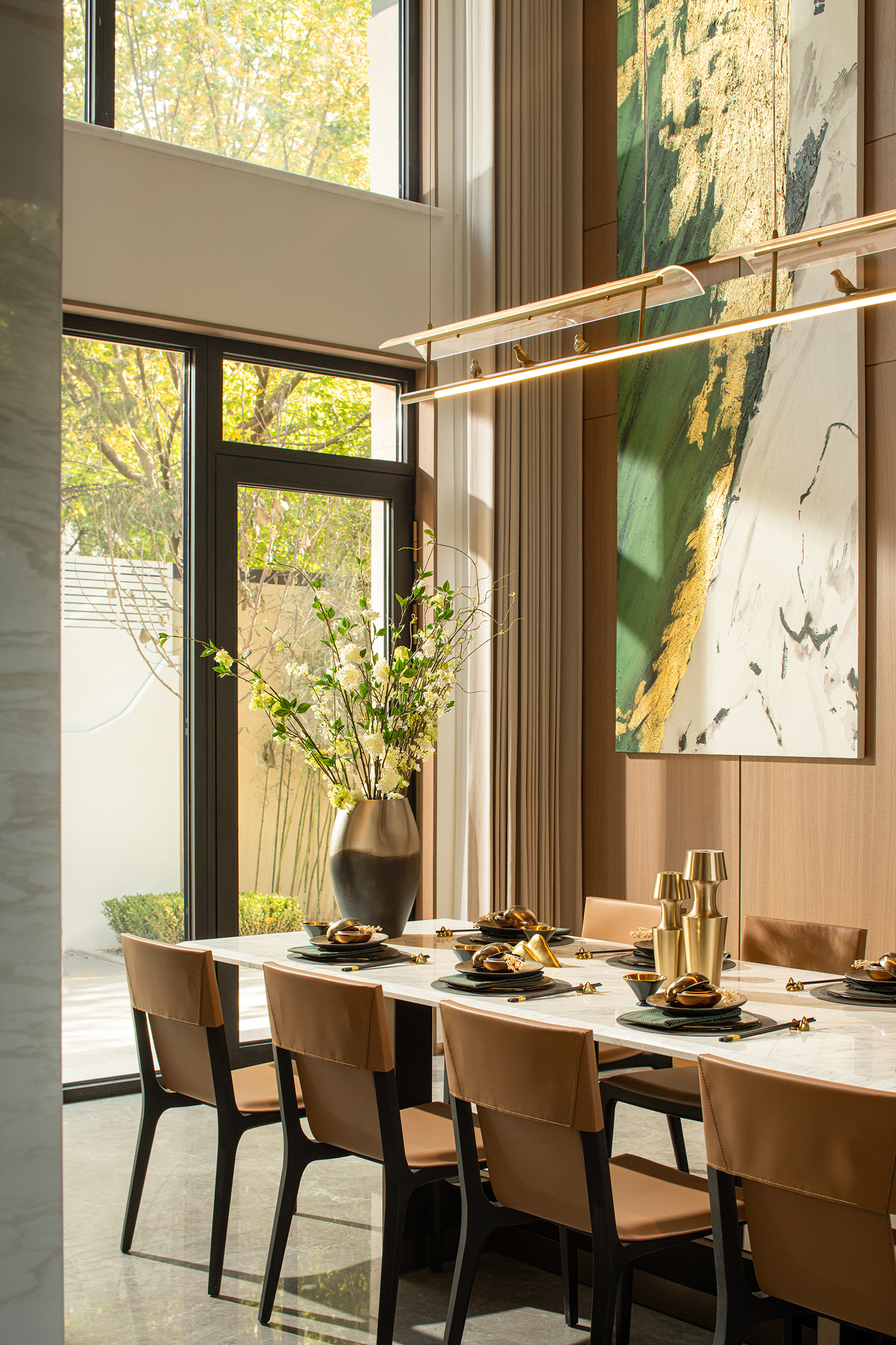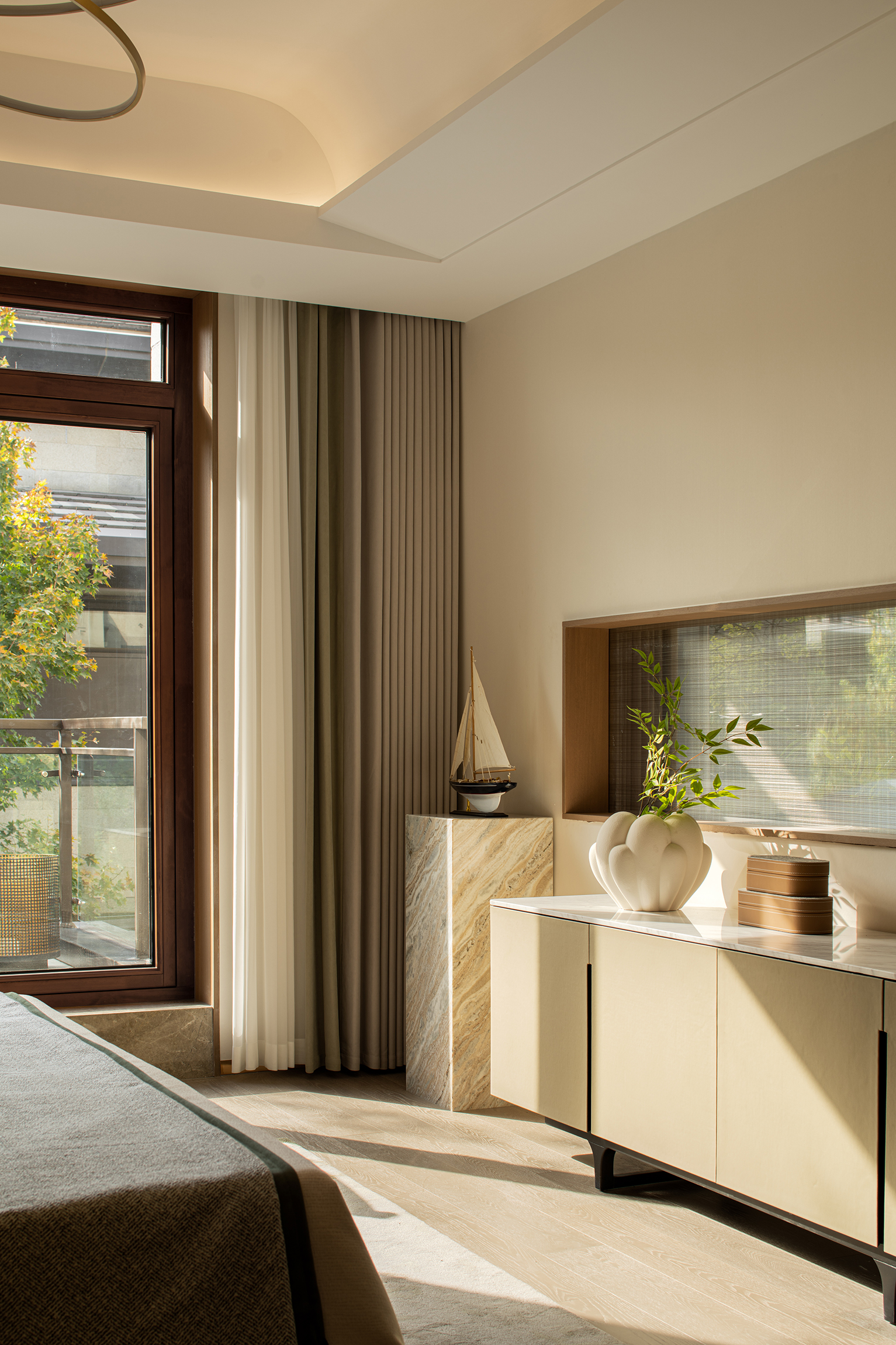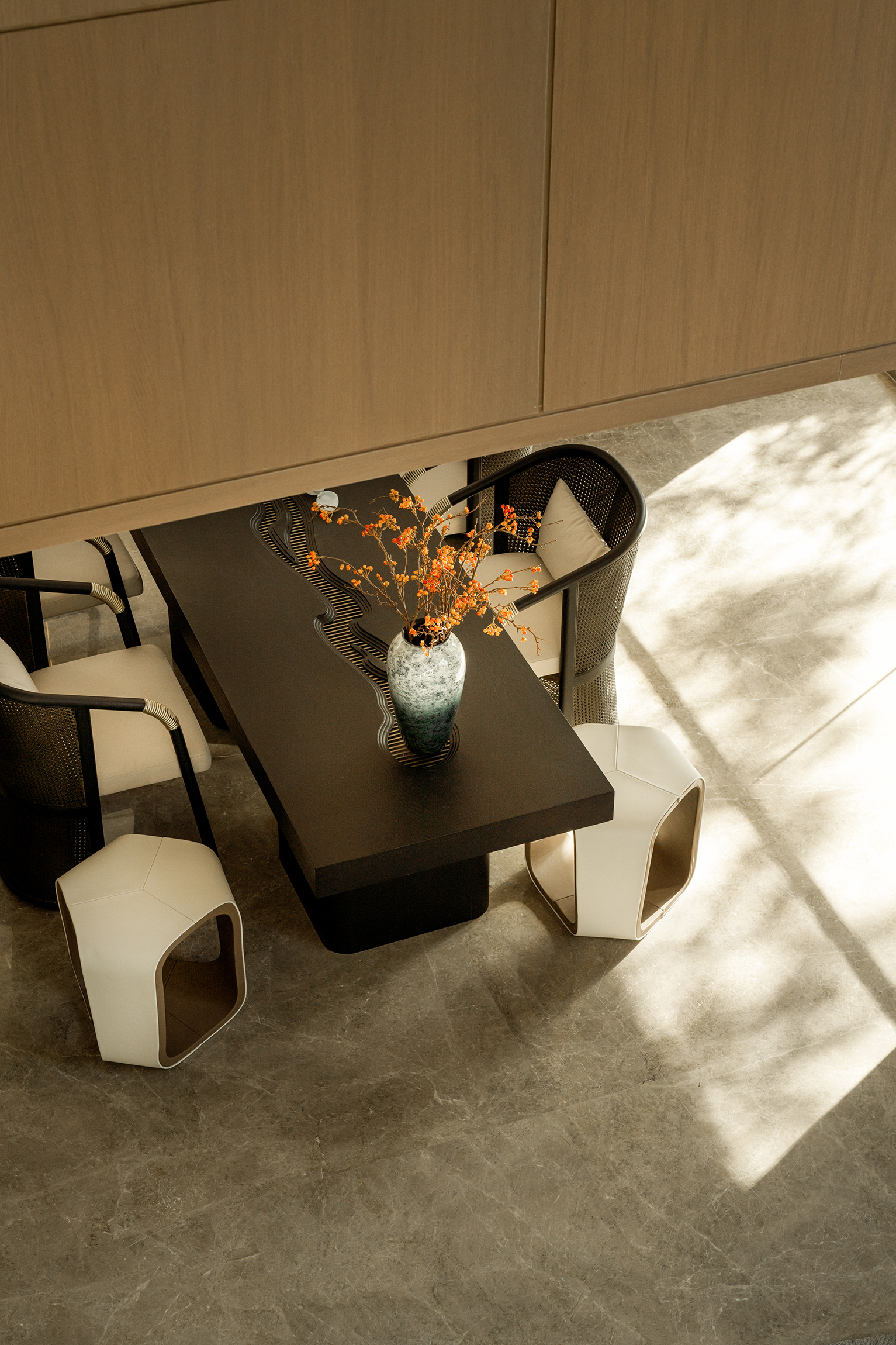 空间意境:设计师以大开大合的设计理念营造“内建筑”空间,让室内尽可能地开敞,将户外绿意和阳光全面纳入室内,使空间气韵流动。并利用穿插、飘叠、透景等设计方式,营造舷窗、飘廊等及具诗情画意的互动空间。本案设计以一日、四季为时间线,将每个功能空间赋于情景交融的主题,通过光影的变化相串联,使人时刻置身于自然之中,随着时间的转变达至不同的心境。