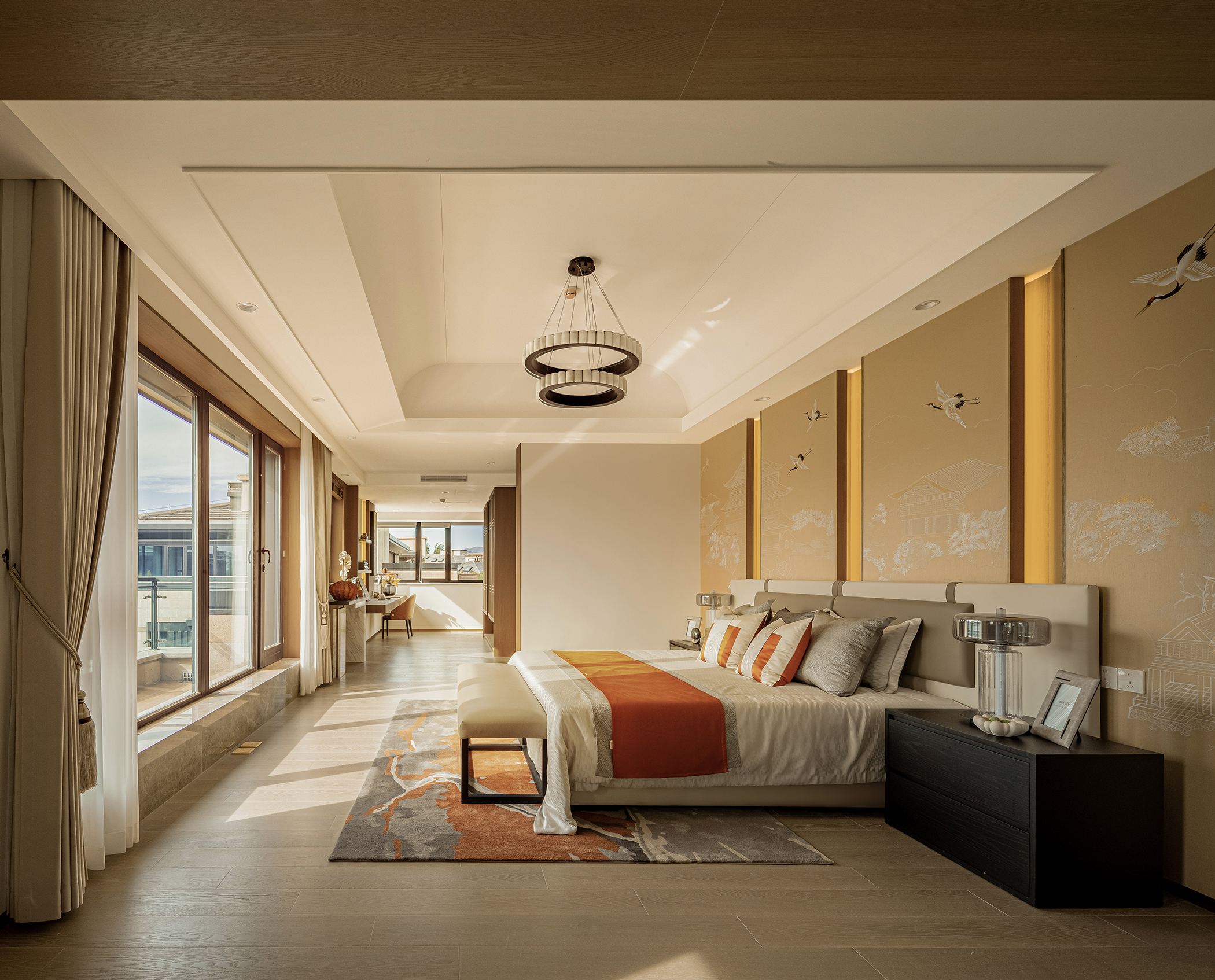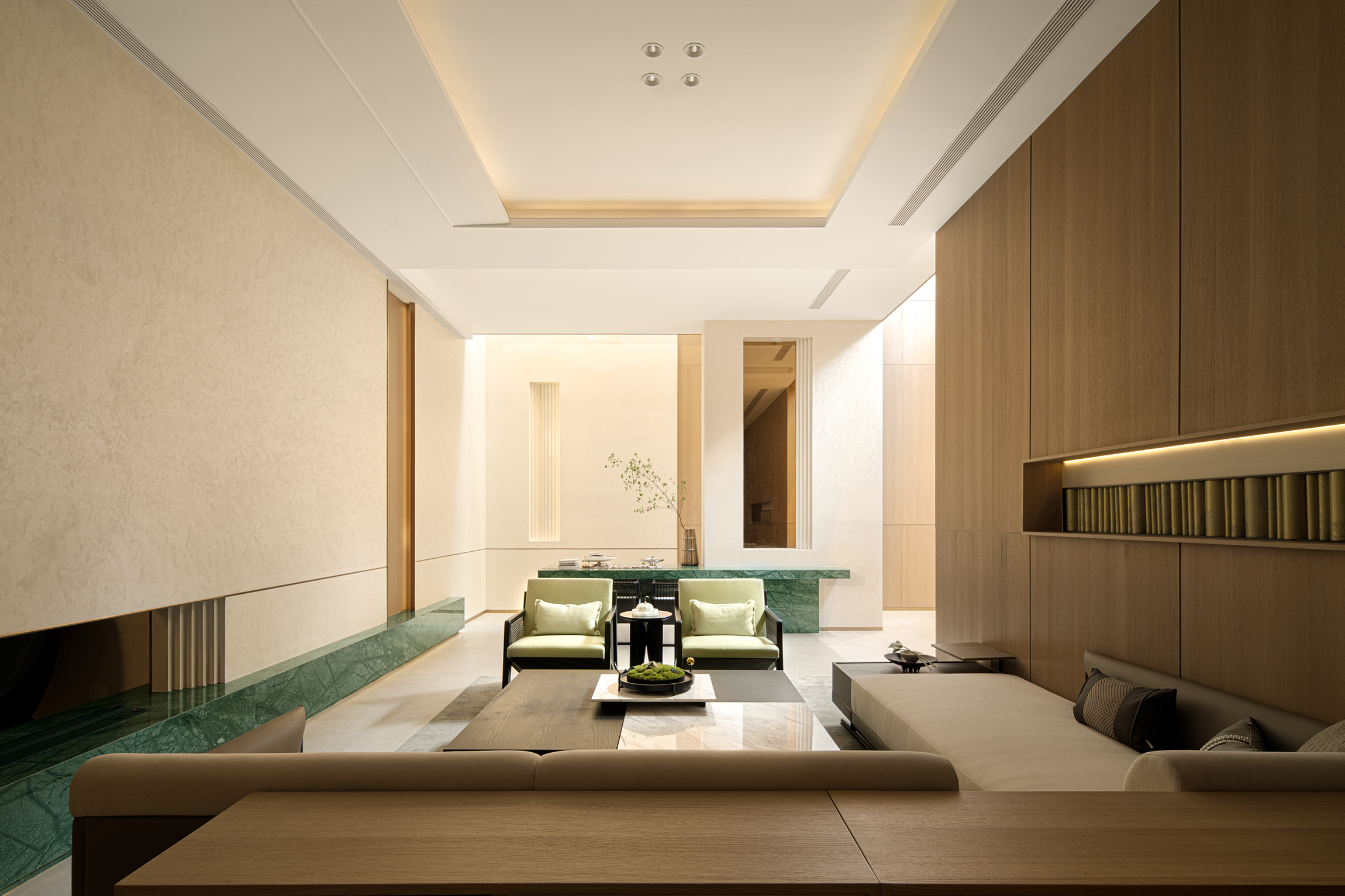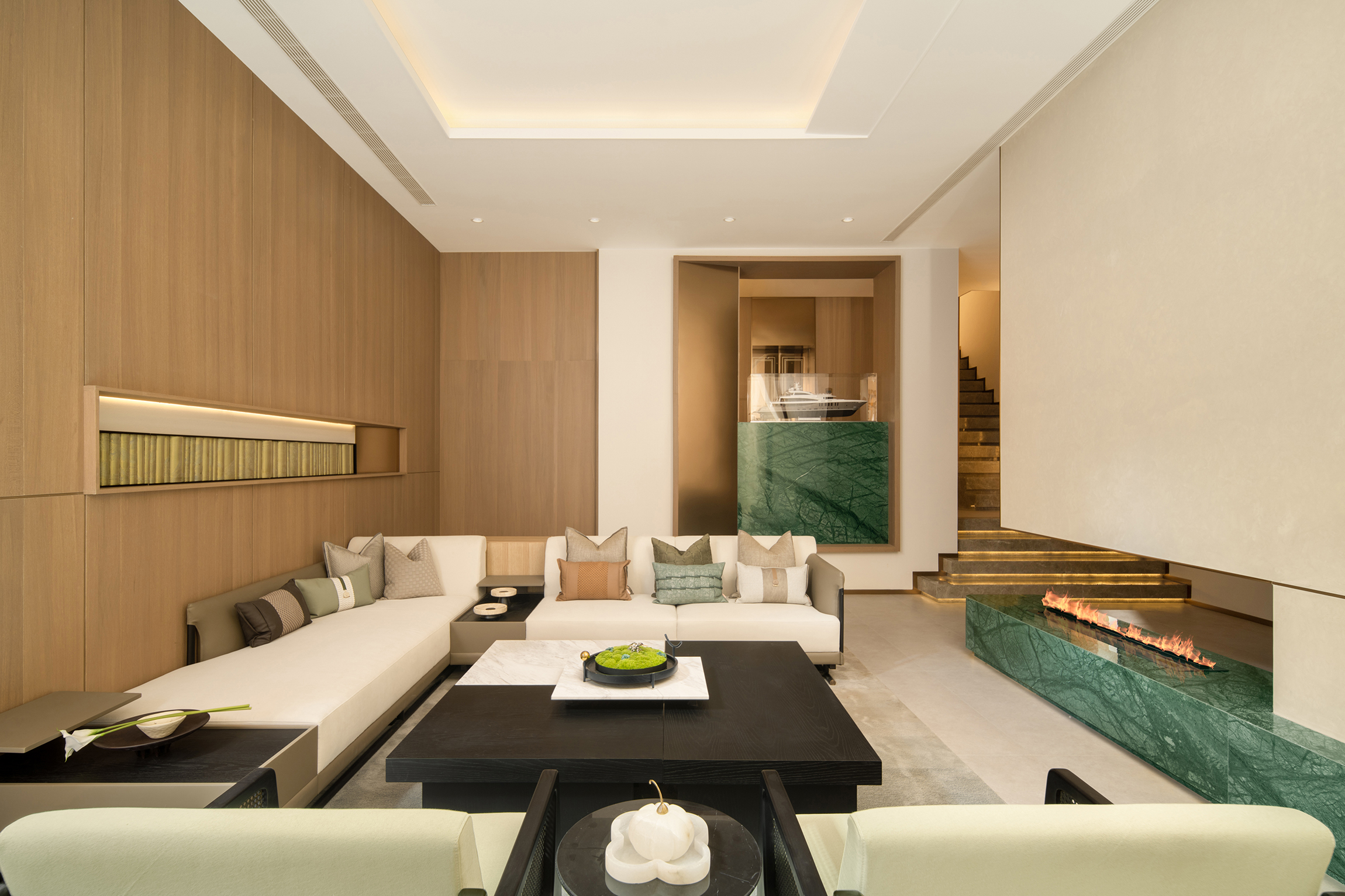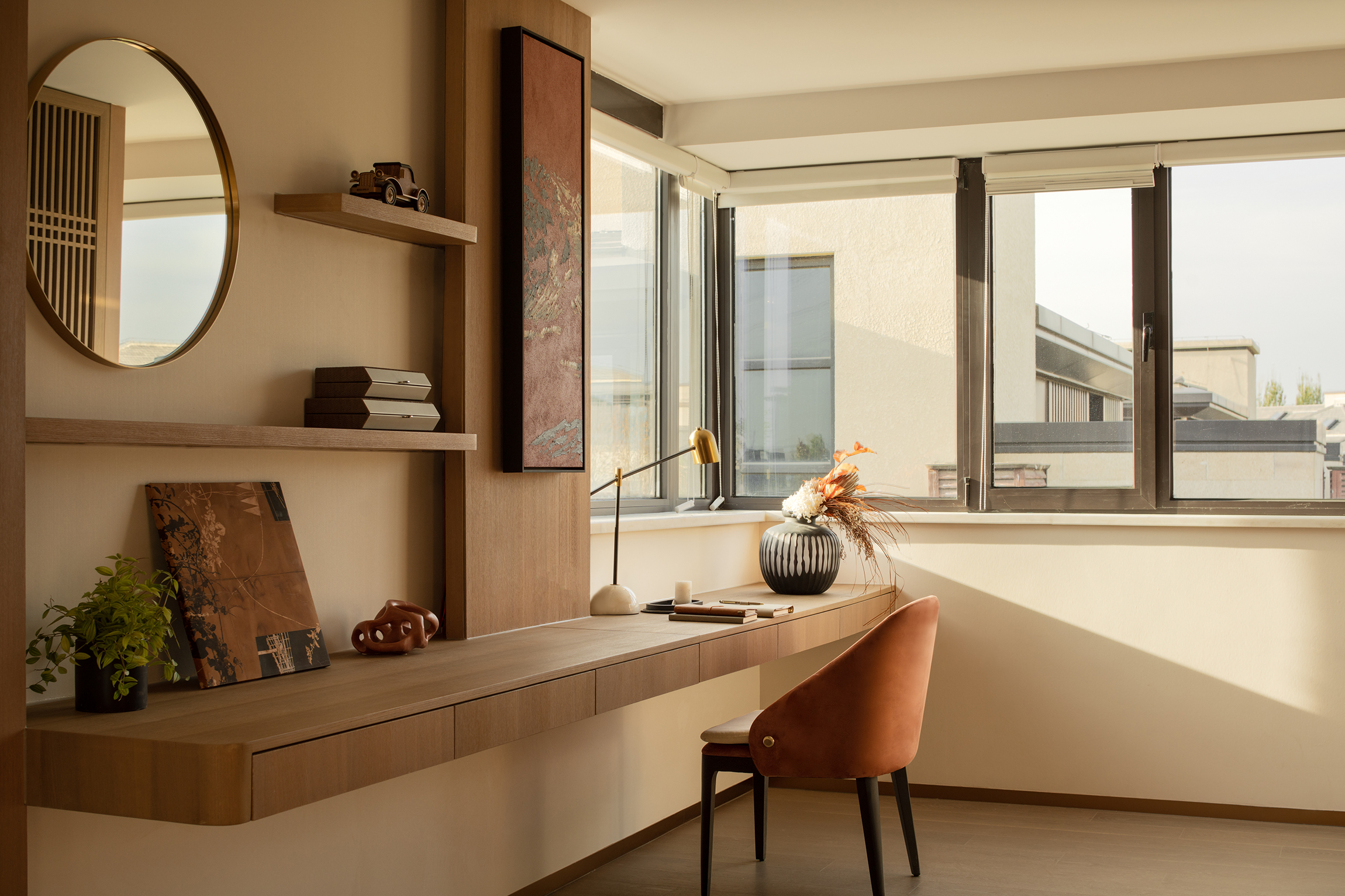 空间意境:设计师以大开大合的设计理念营造“内建筑”空间,让室内尽可能地开敞,将户外绿意和阳光全面纳入室内,使空间气韵流动。并利用穿插、飘叠、透景等设计方式,营造舷窗、飘廊等及具诗情画意的互动空间。本案设计以一日、四季为时间线,将每个功能空间赋于情景交融的主题,通过光影的变化相串联,使人时刻置身于自然之中,随着时间的转变达至不同的心境。