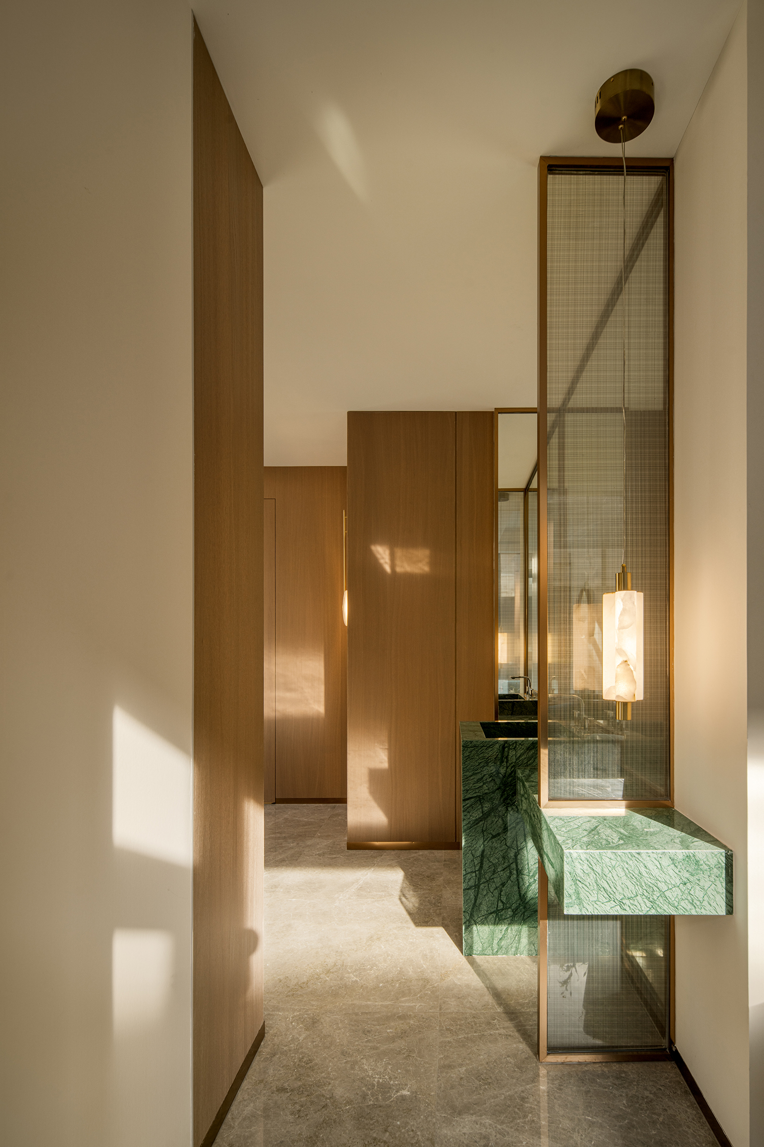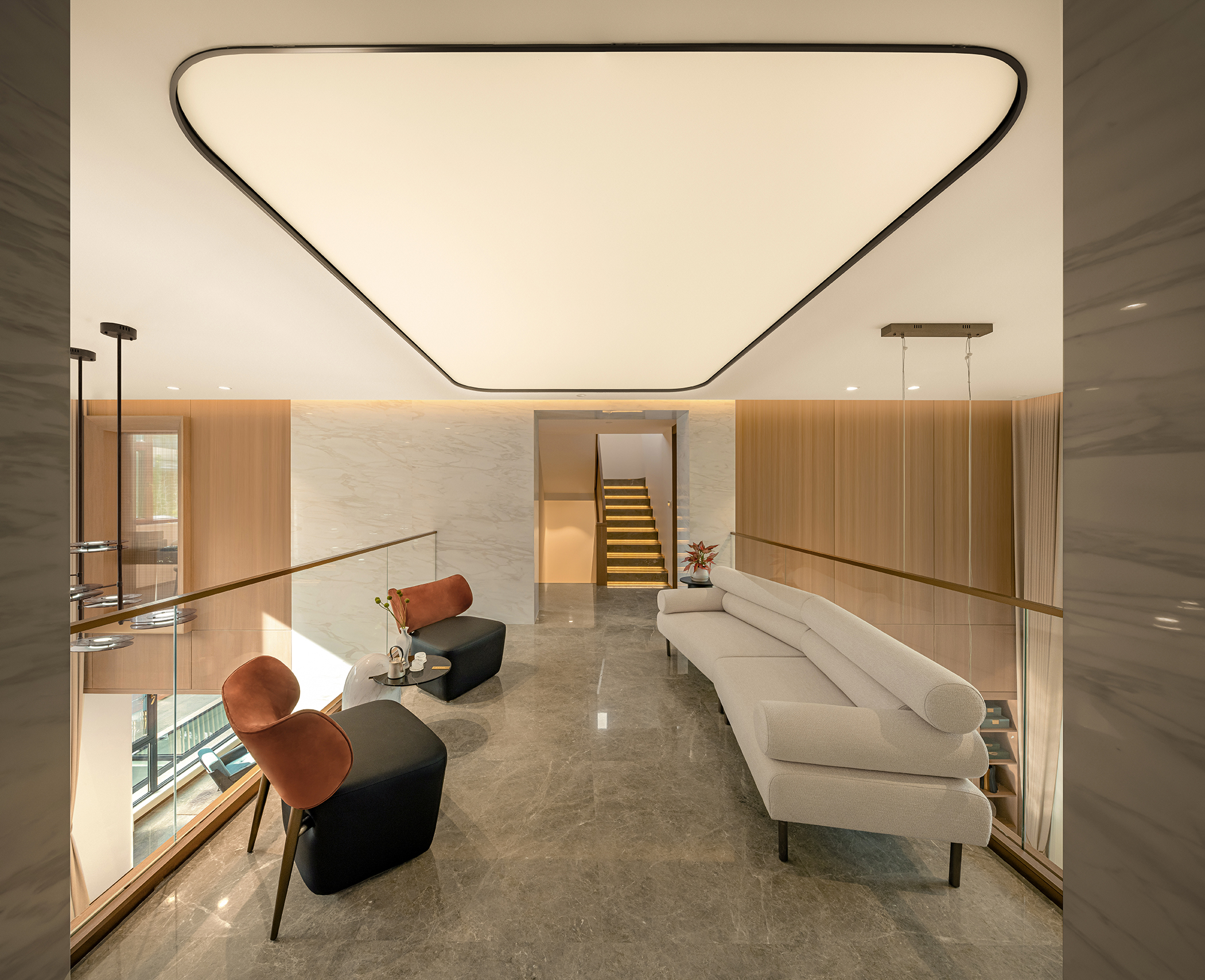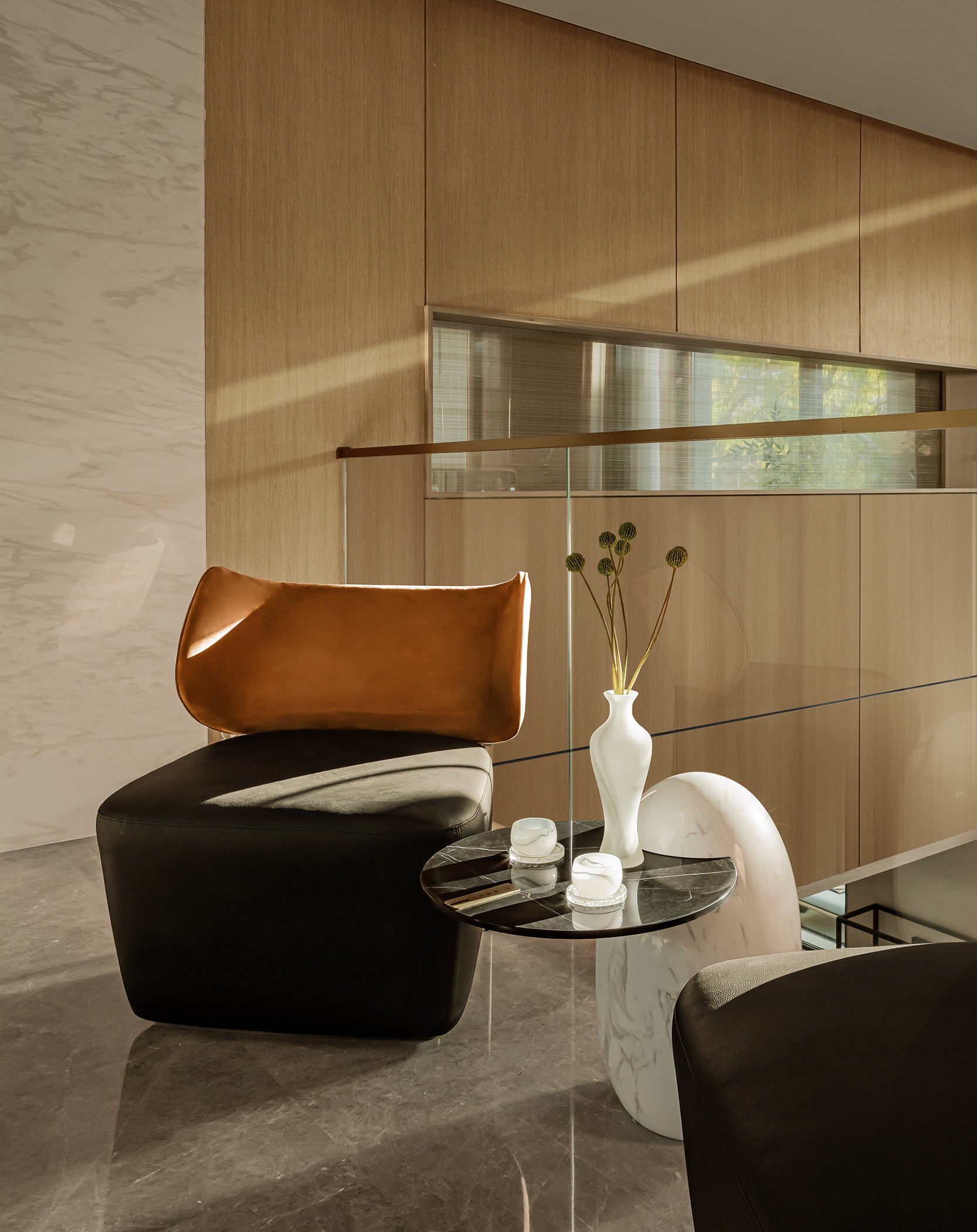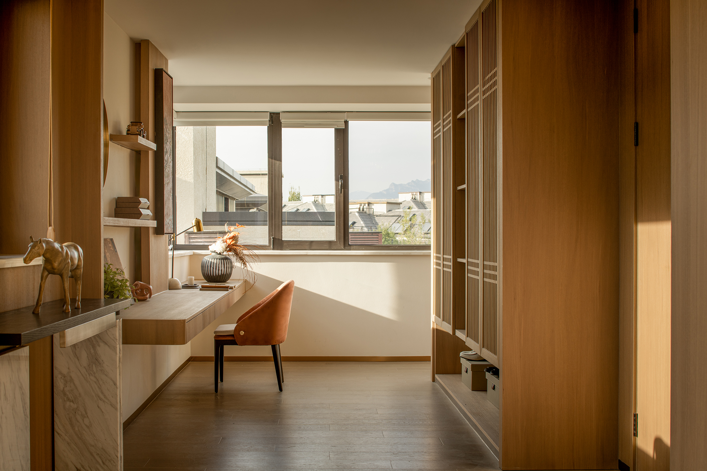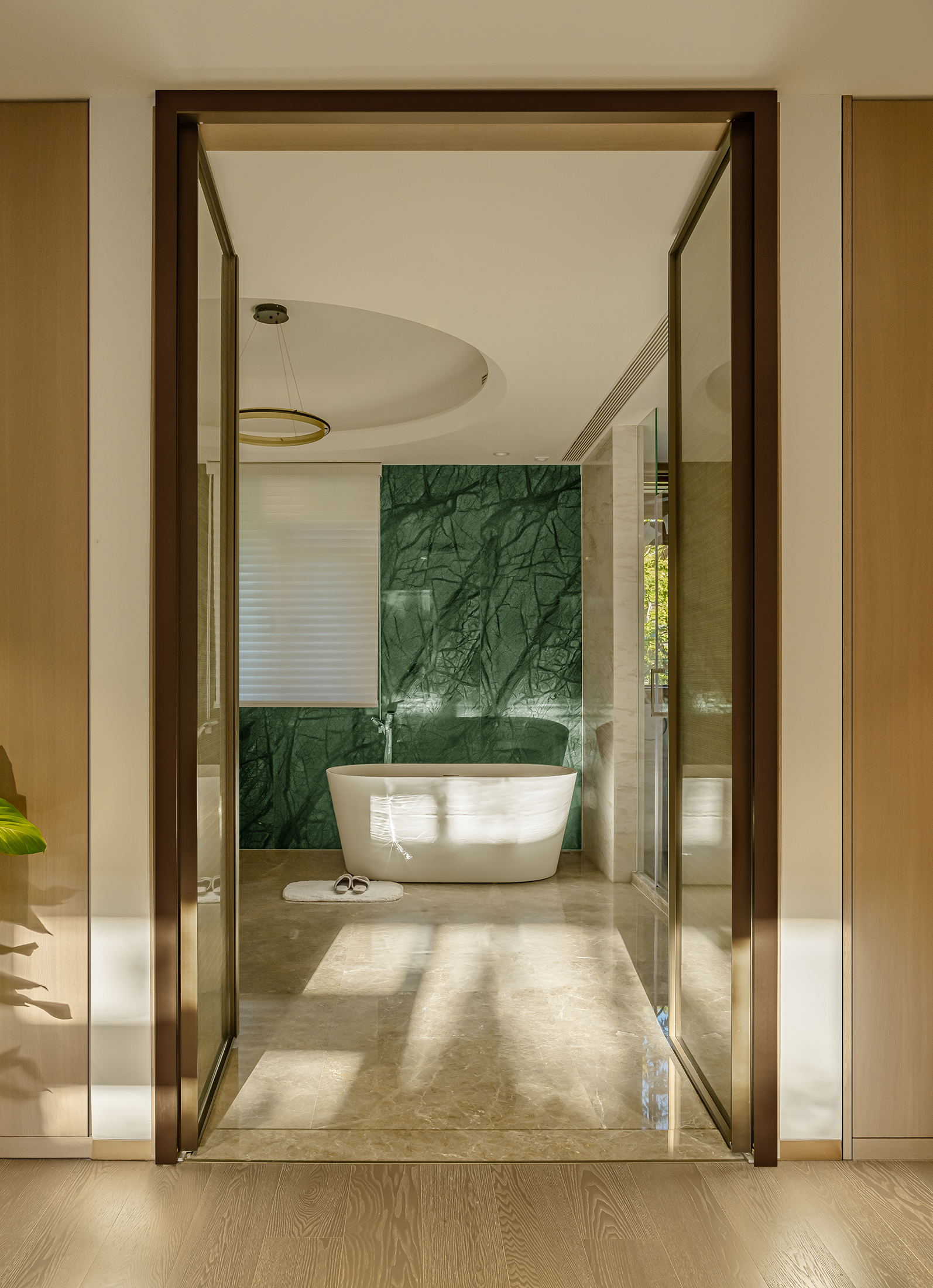 空间意境:设计师以大开大合的设计理念营造“内建筑”空间,让室内尽可能地开敞,将户外绿意和阳光全面纳入室内,使空间气韵流动。并利用穿插、飘叠、透景等设计方式,营造舷窗、飘廊等及具诗情画意的互动空间。本案设计以一日、四季为时间线,将每个功能空间赋于情景交融的主题,通过光影的变化相串联,使人时刻置身于自然之中,随着时间的转变达至不同的心境。