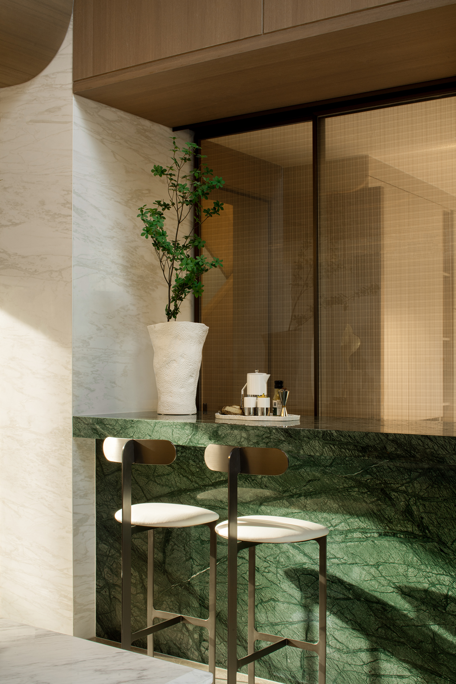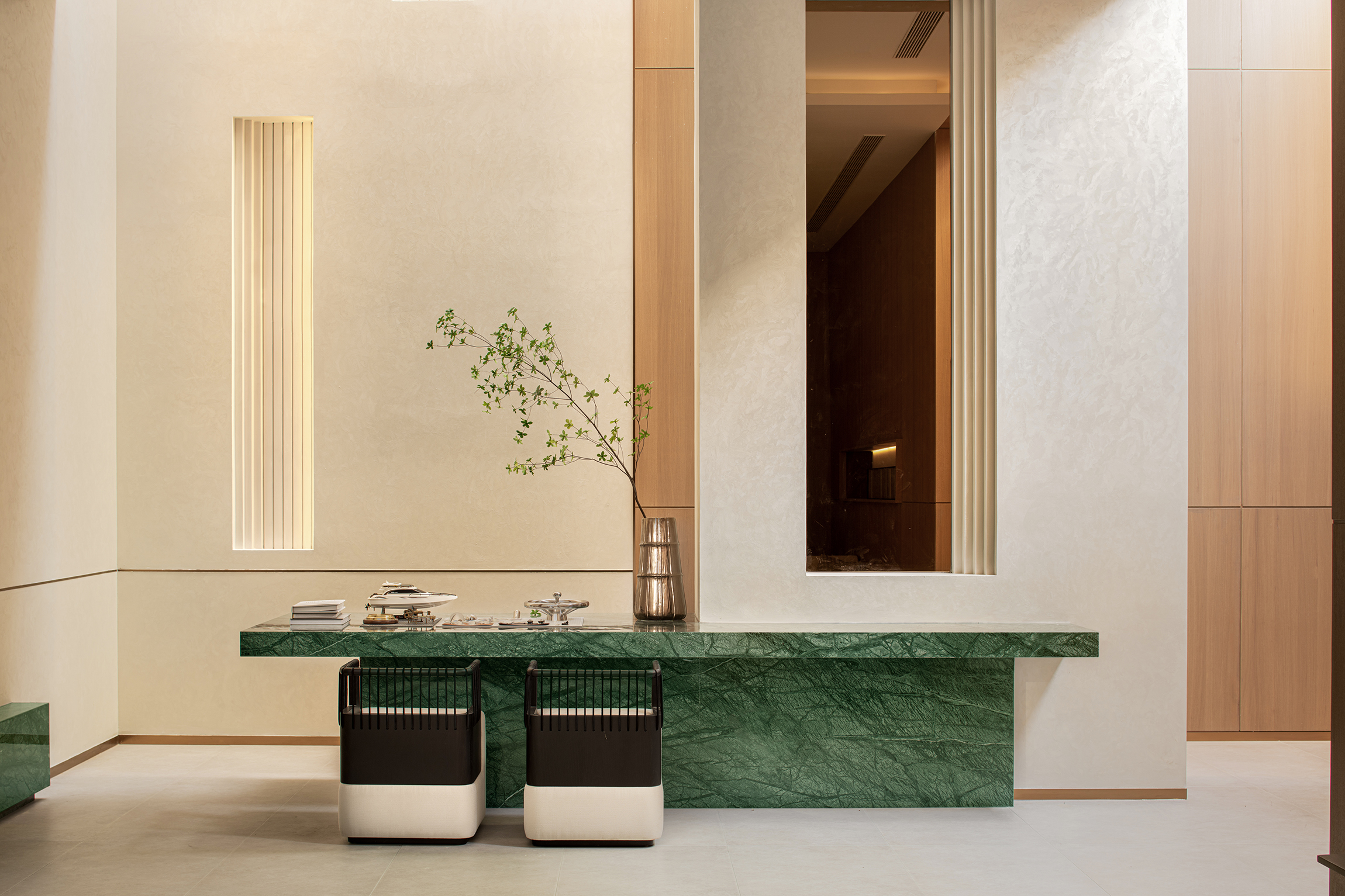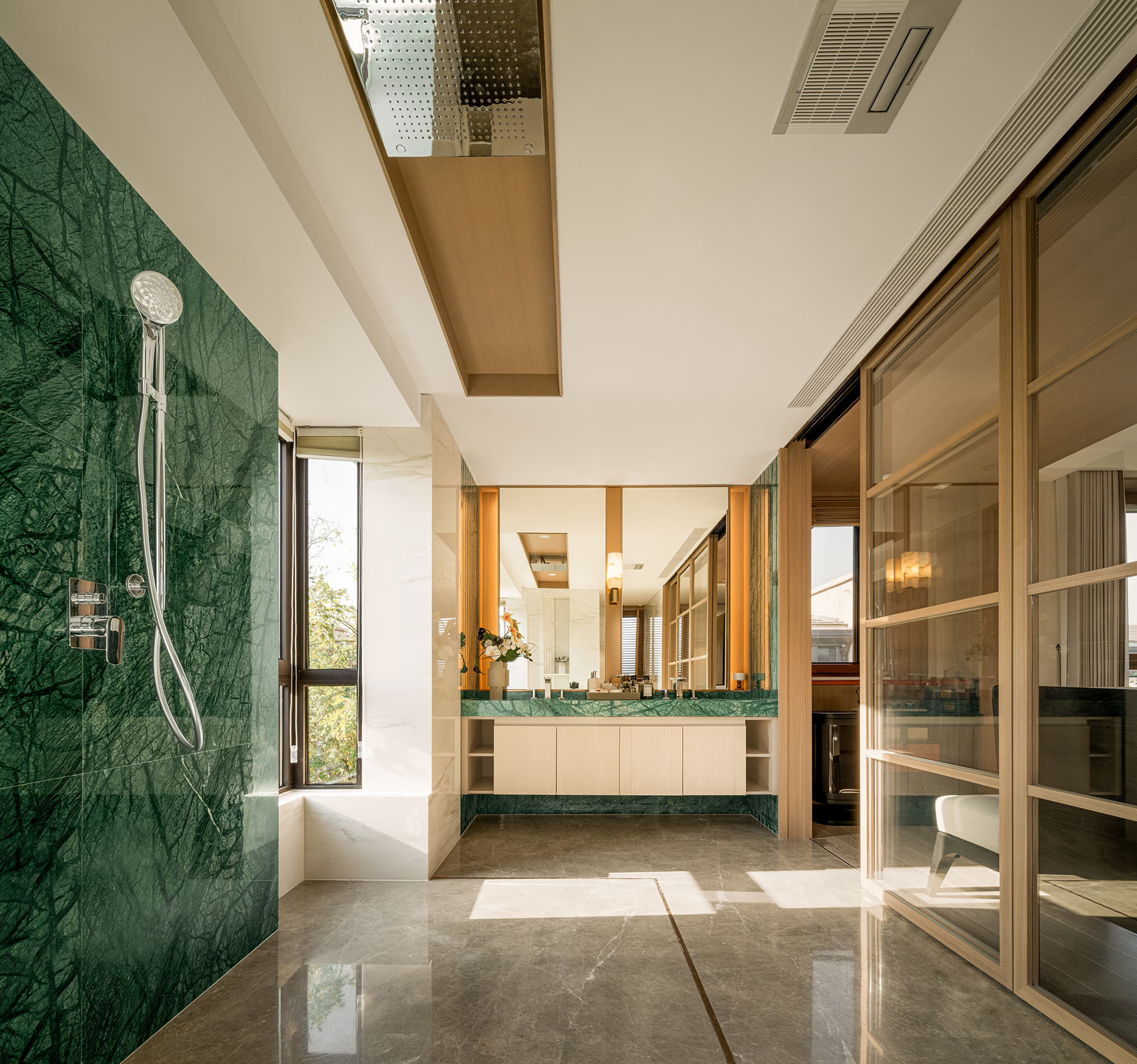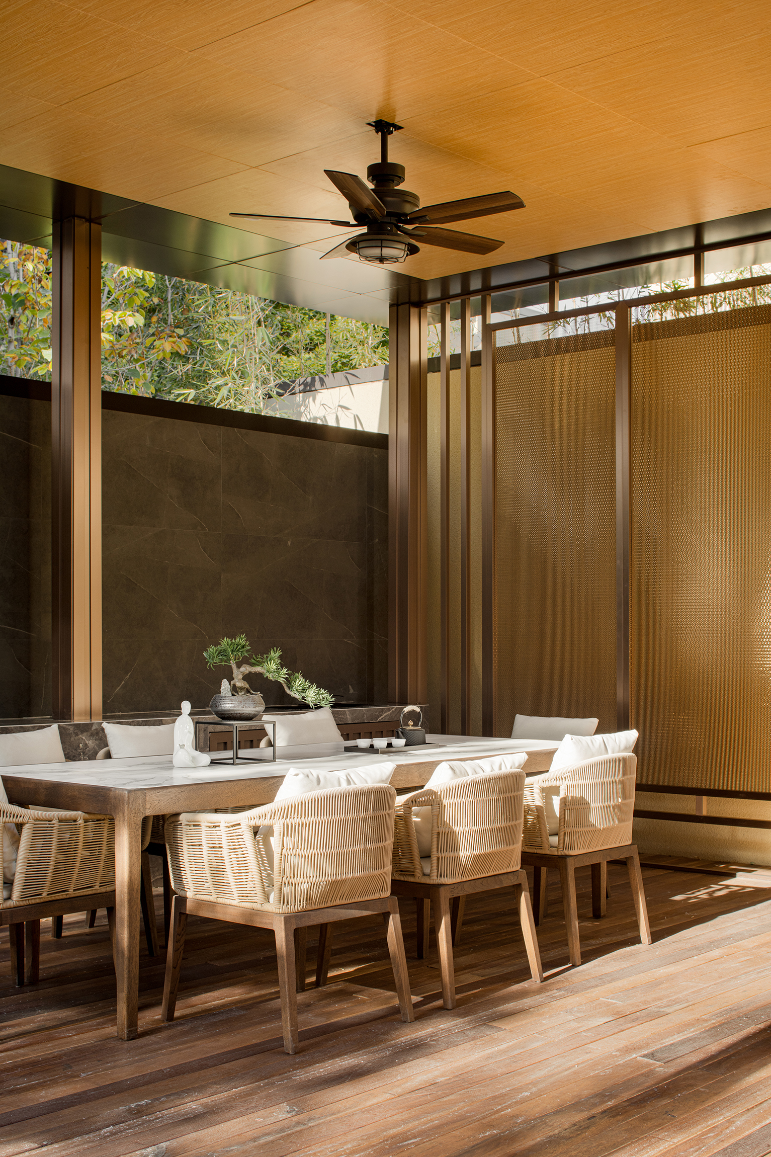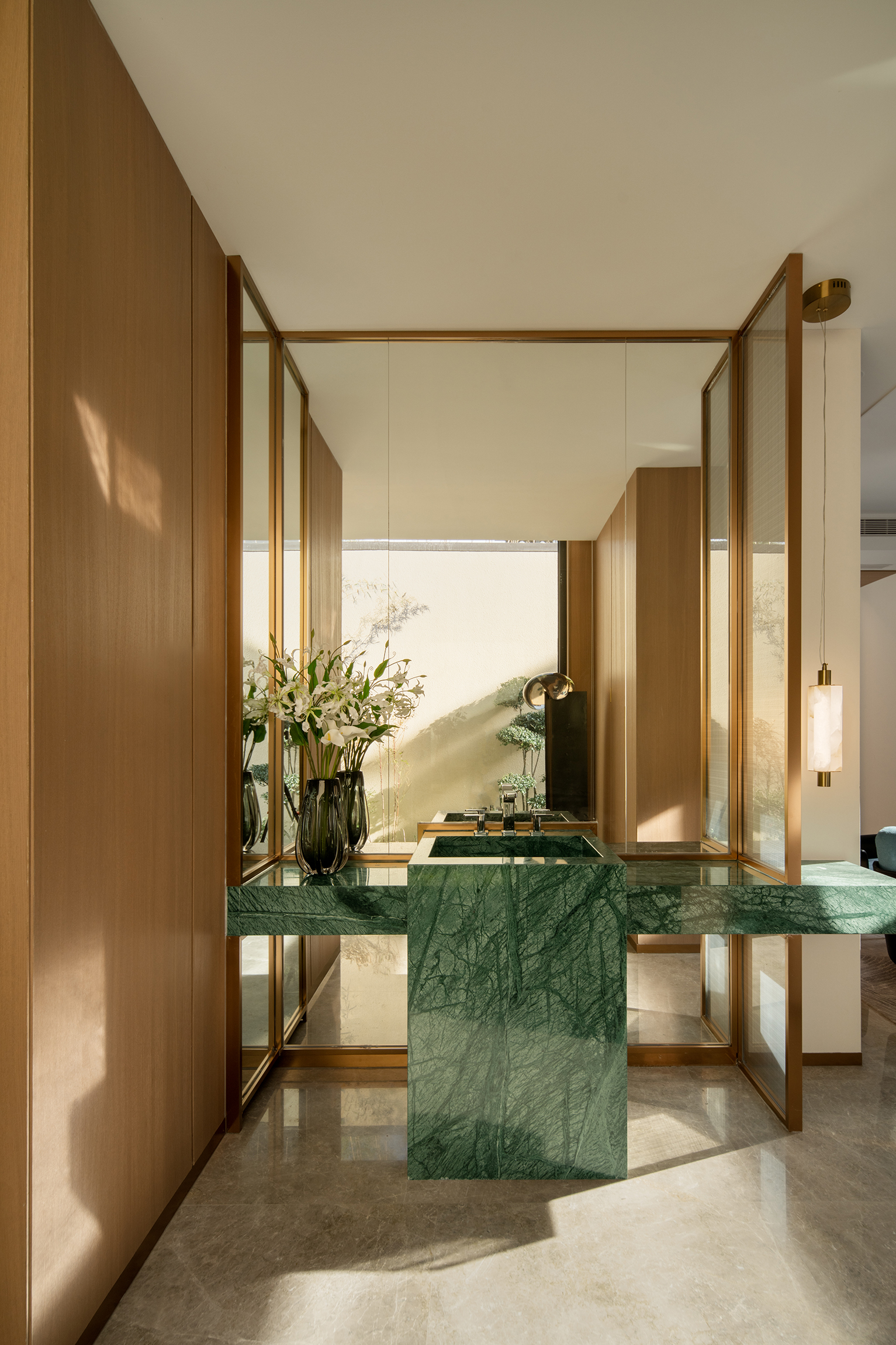 空间意境:设计师以大开大合的设计理念营造“内建筑”空间,让室内尽可能地开敞,将户外绿意和阳光全面纳入室内,使空间气韵流动。并利用穿插、飘叠、透景等设计方式,营造舷窗、飘廊等及具诗情画意的互动空间。本案设计以一日、四季为时间线,将每个功能空间赋于情景交融的主题,通过光影的变化相串联,使人时刻置身于自然之中,随着时间的转变达至不同的心境。