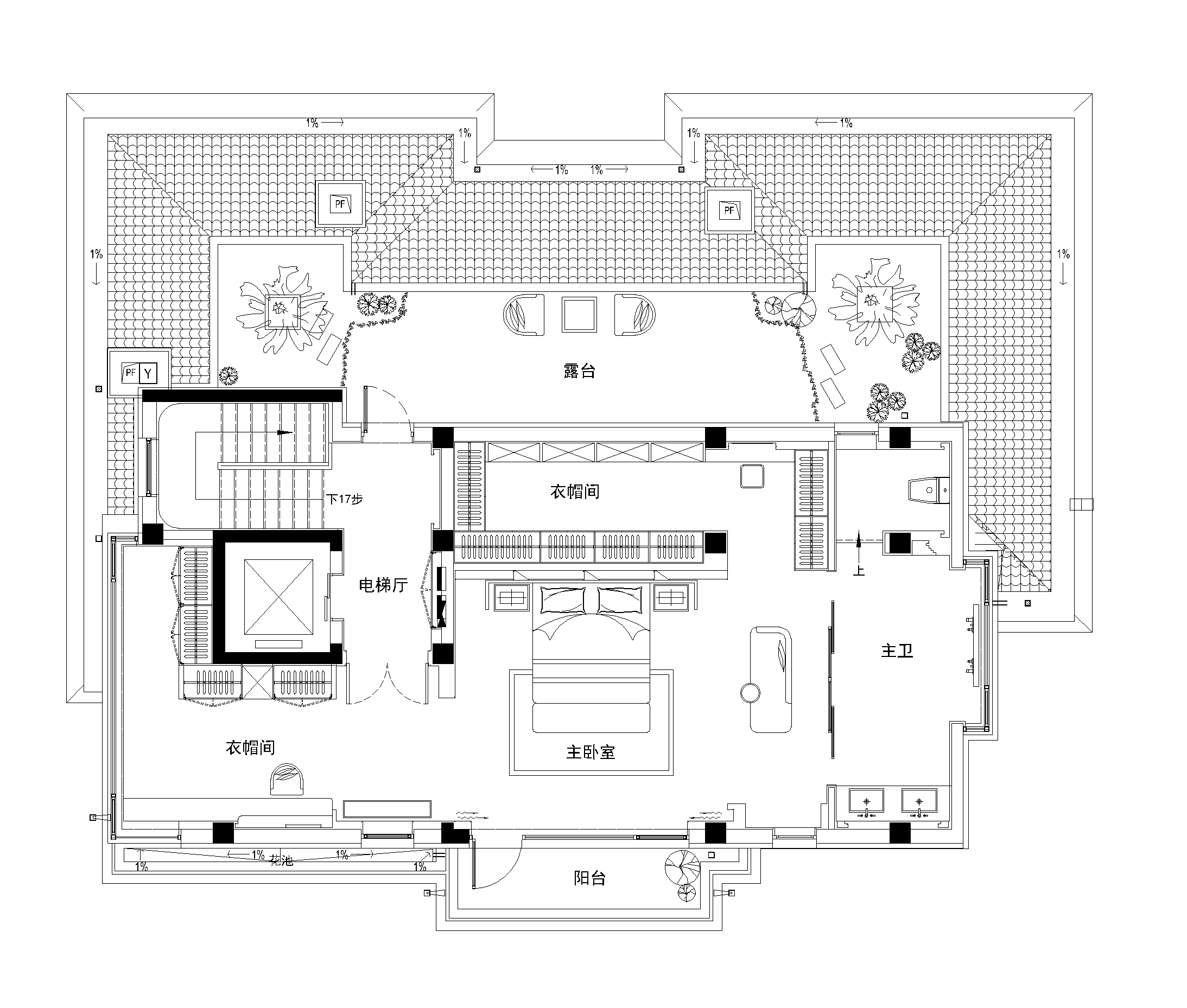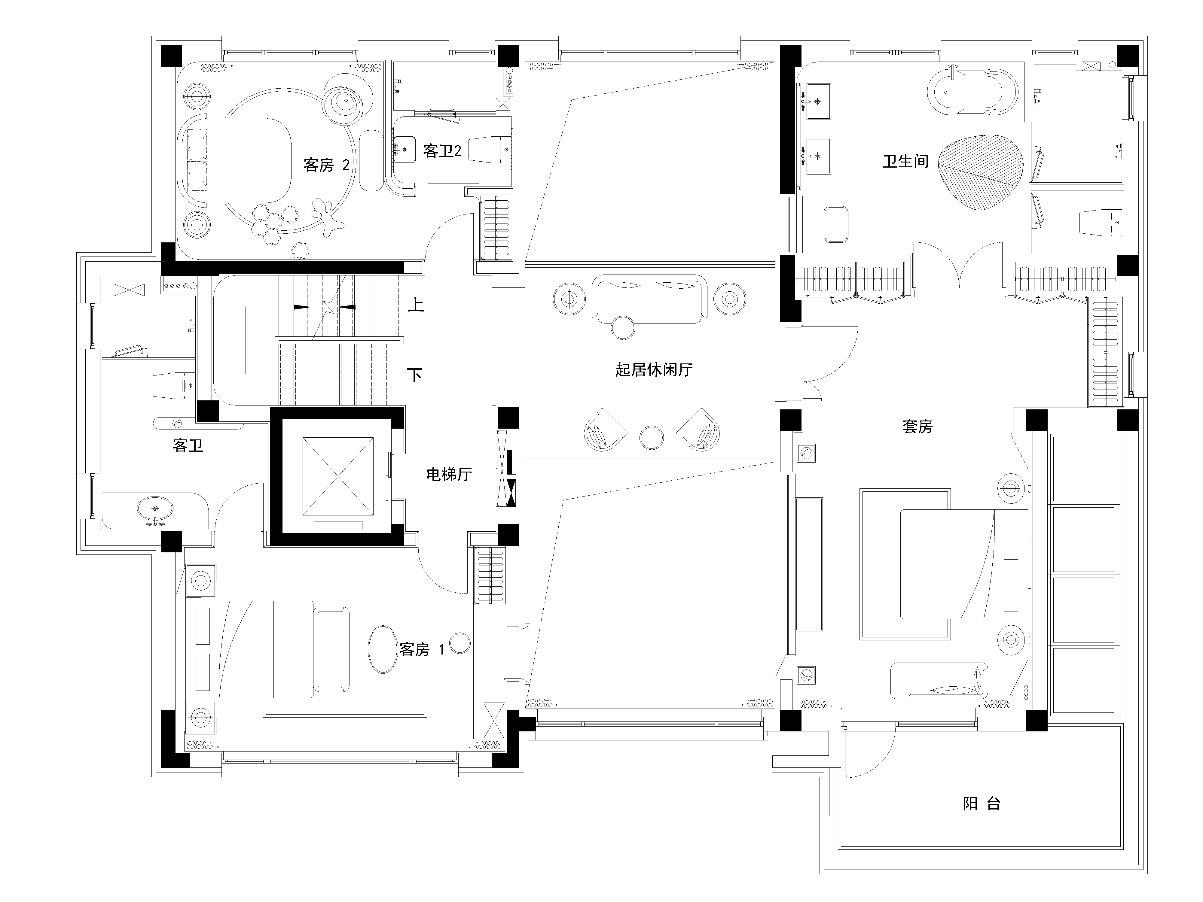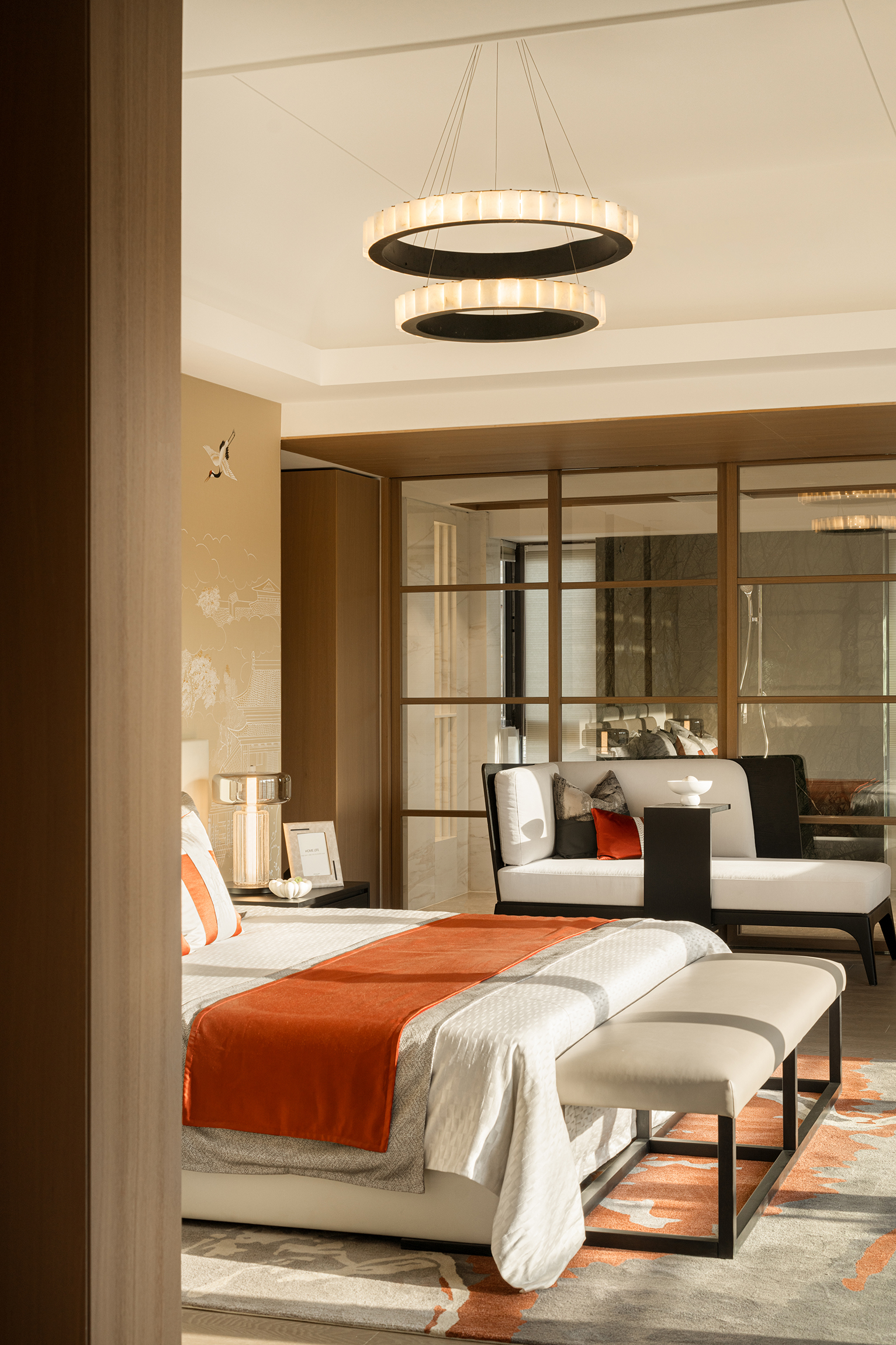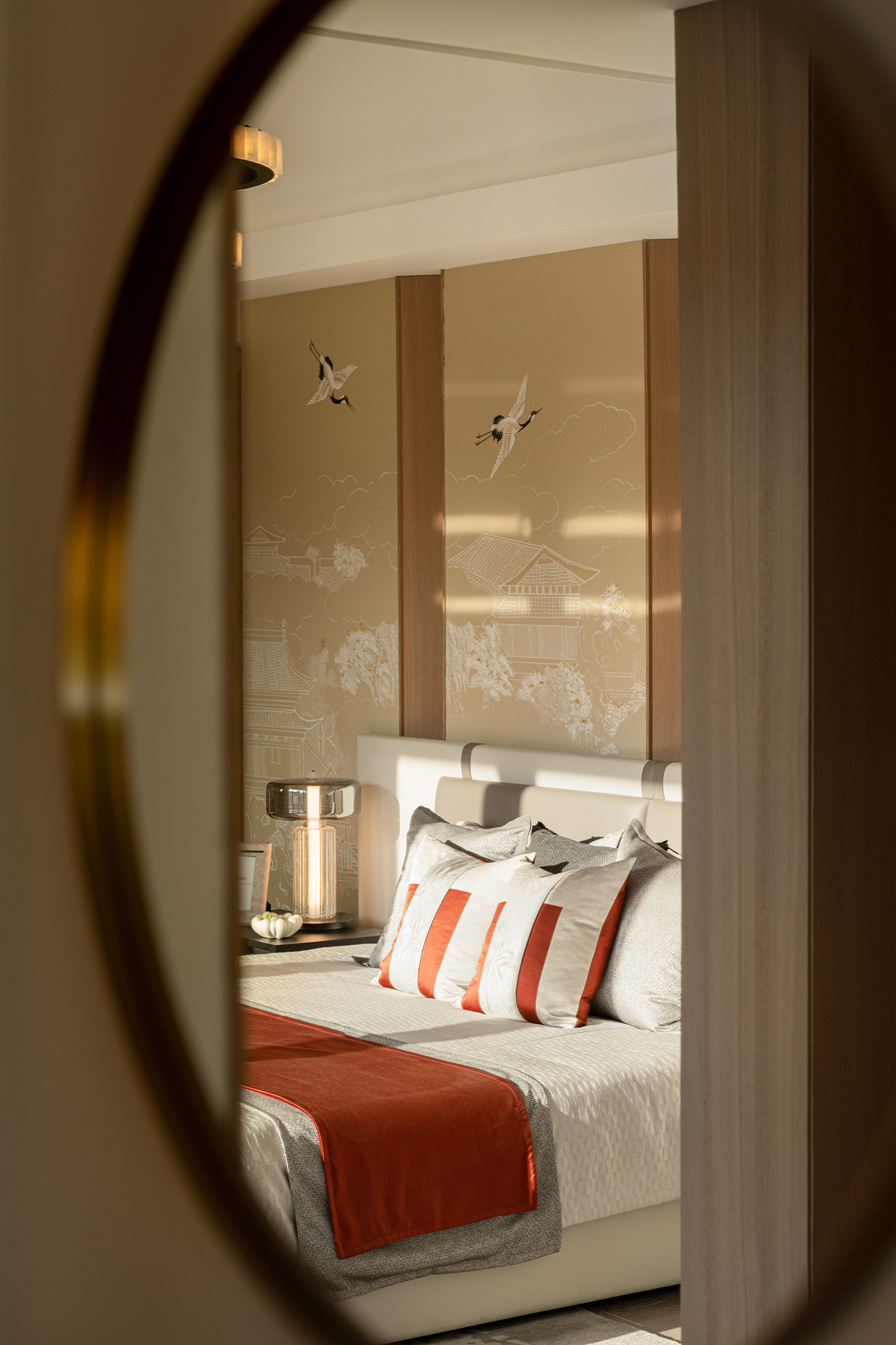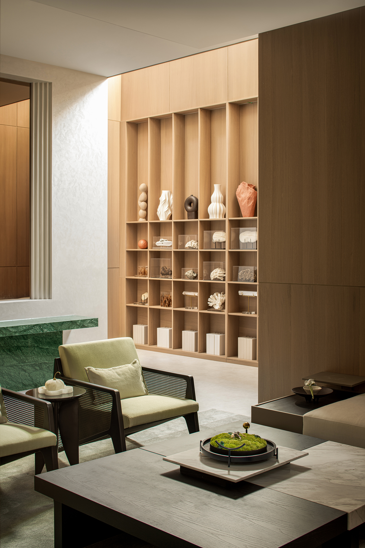 空间意境:设计师以大开大合的设计理念营造“内建筑”空间,让室内尽可能地开敞,将户外绿意和阳光全面纳入室内,使空间气韵流动。并利用穿插、飘叠、透景等设计方式,营造舷窗、飘廊等及具诗情画意的互动空间。本案设计以一日、四季为时间线,将每个功能空间赋于情景交融的主题,通过光影的变化相串联,使人时刻置身于自然之中,随着时间的转变达至不同的心境。
