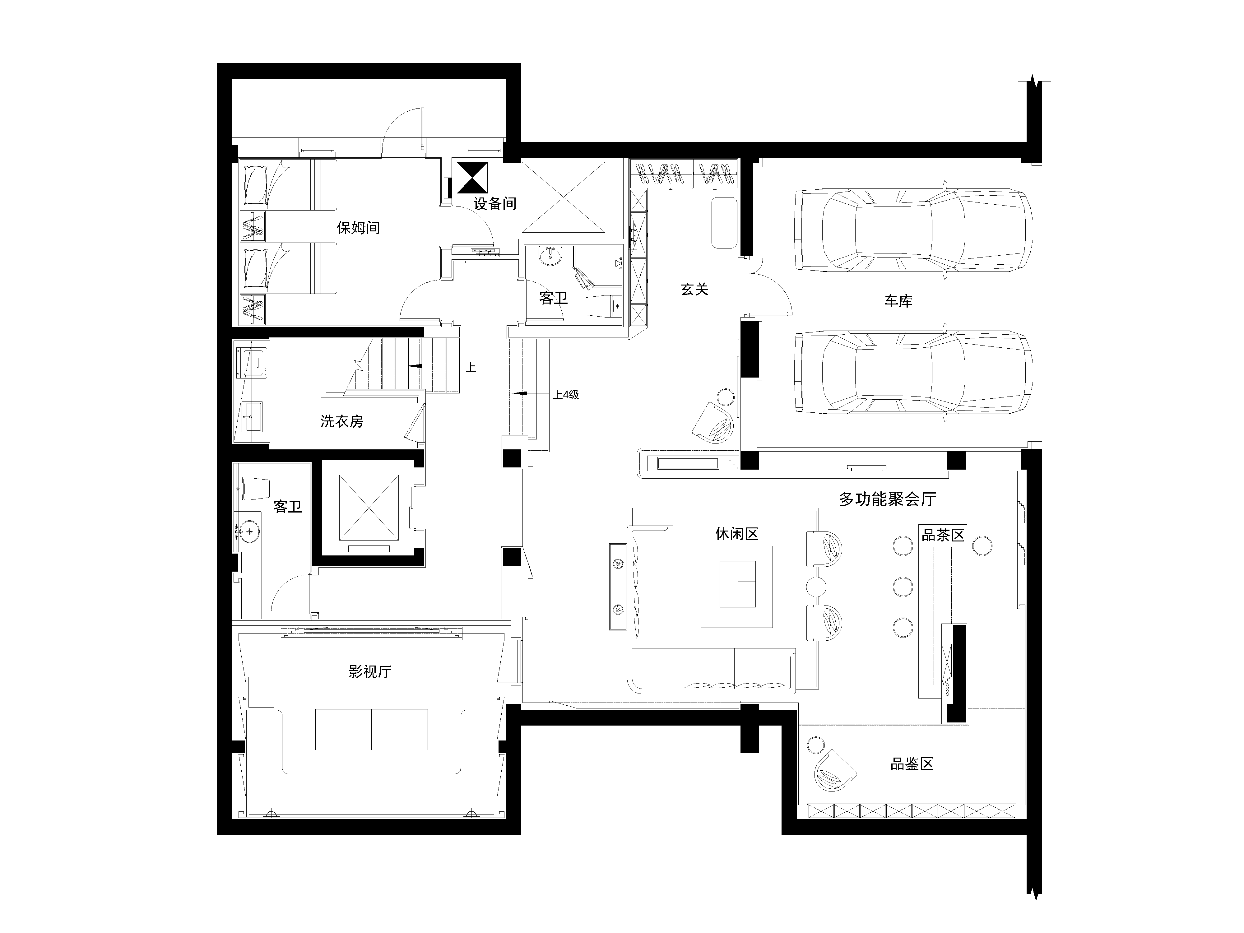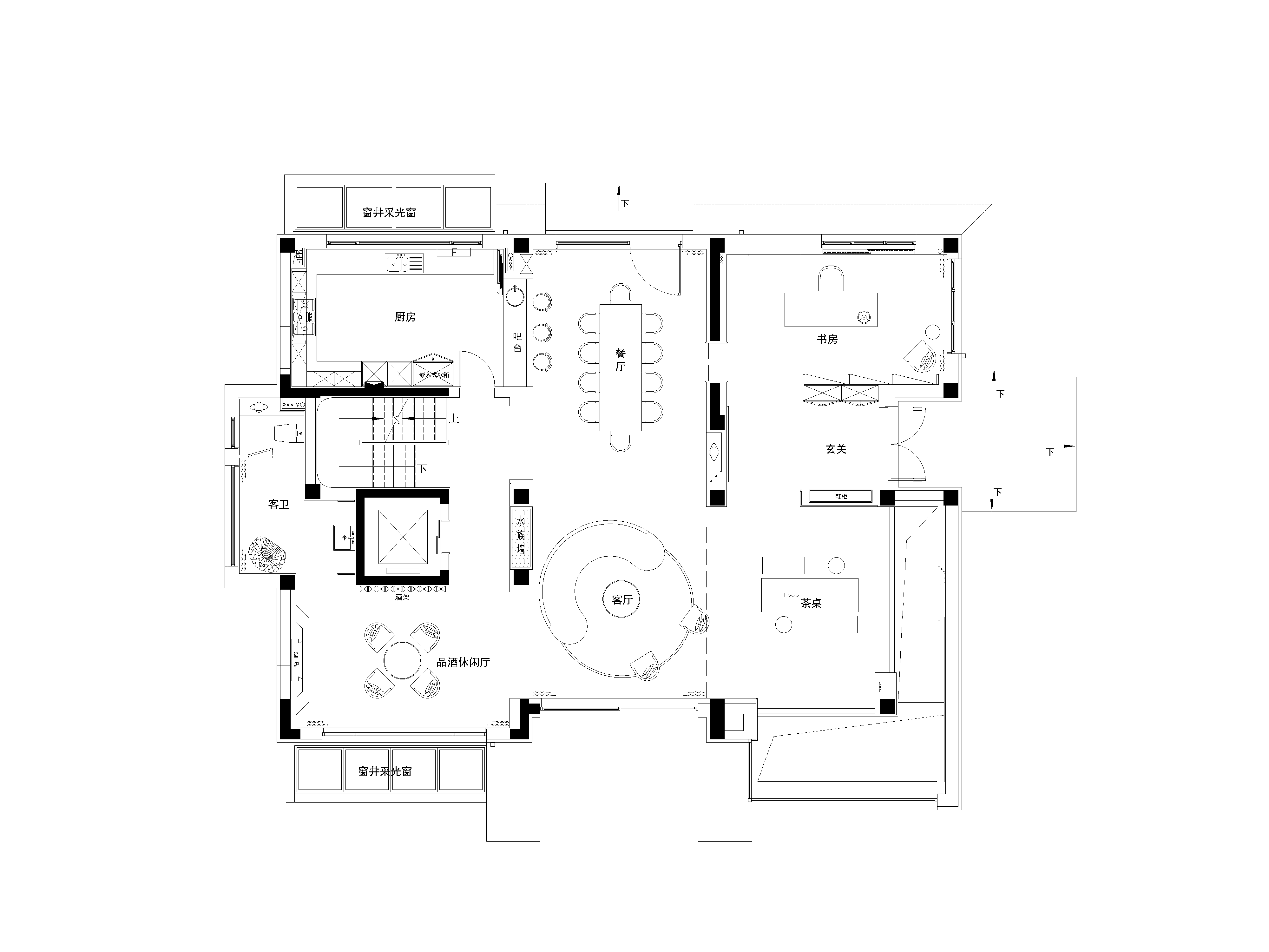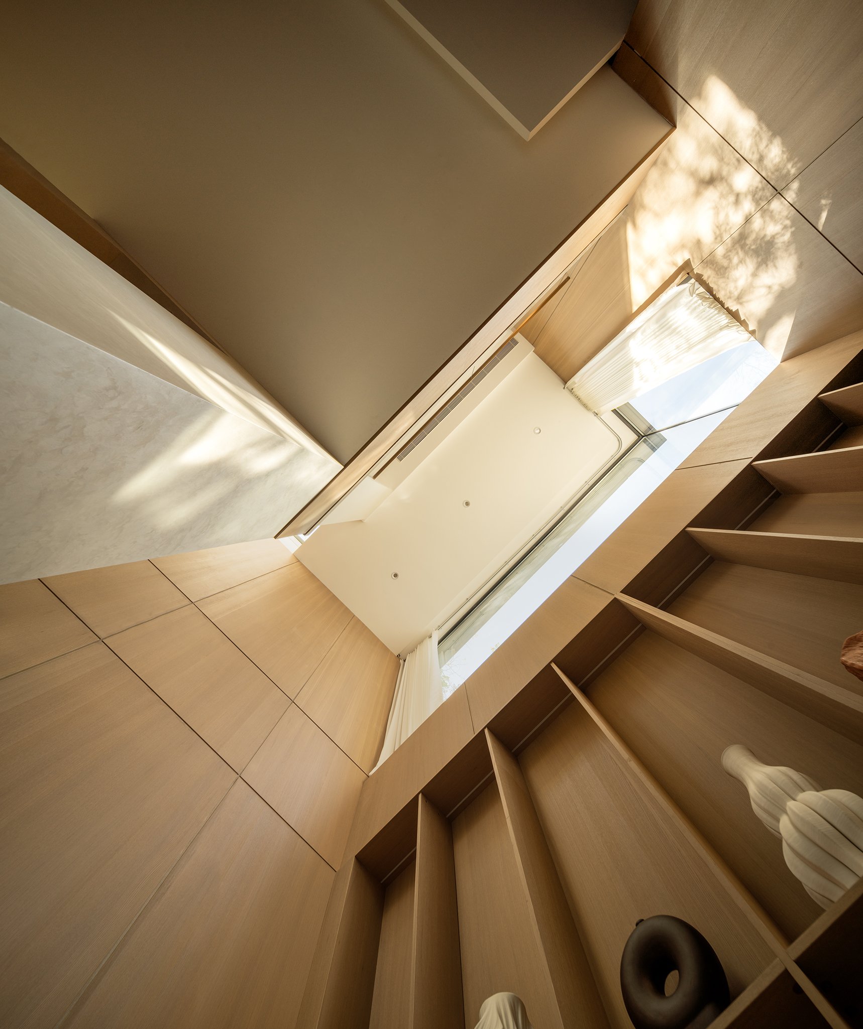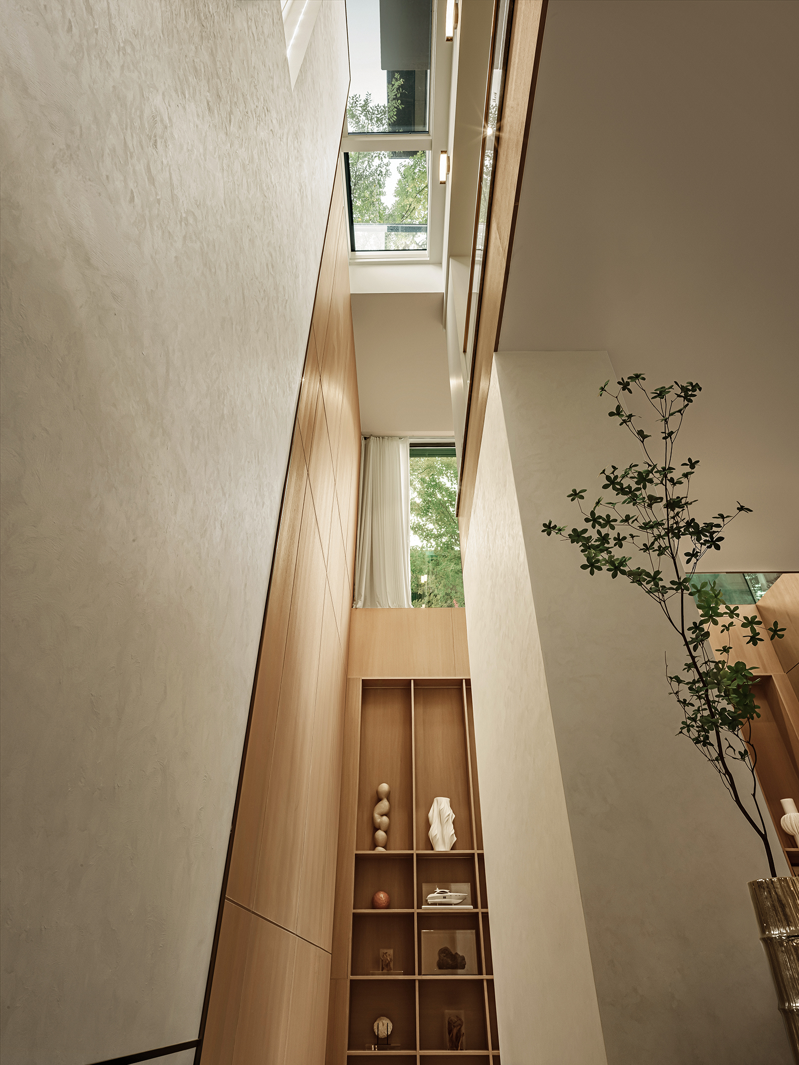 空间布局:自然是一幅天作的巨大画卷,南北两侧的超大落地窗对院落景观进行框景,一副绿意画作映入眼帘,一场人与自然的对话就此展开。这幅自然艺术品可于地下室、飘廊、一、二层被多角度地欣赏,细品四季更迭留下的痕迹。飘廊的设计将餐厅、客厅与二层空间串联了起来,空间被释放后变得灵动活跃。室内外空间的边界因此模糊,室内外情景相融,自然舒适的居住氛围油然而生。地下室原本的采光天井被升至二层,空间进行了竖向与横向的延伸,增强了空间的连续性与互动性。