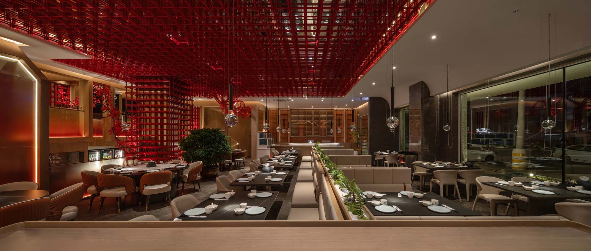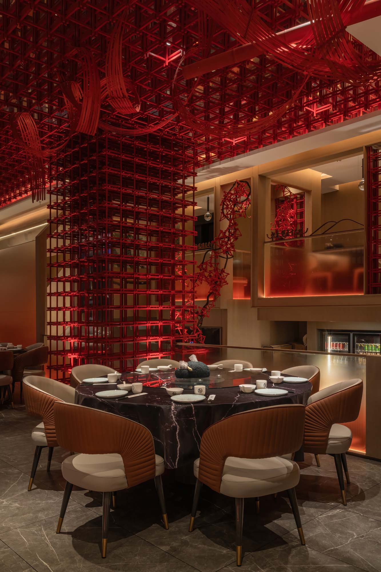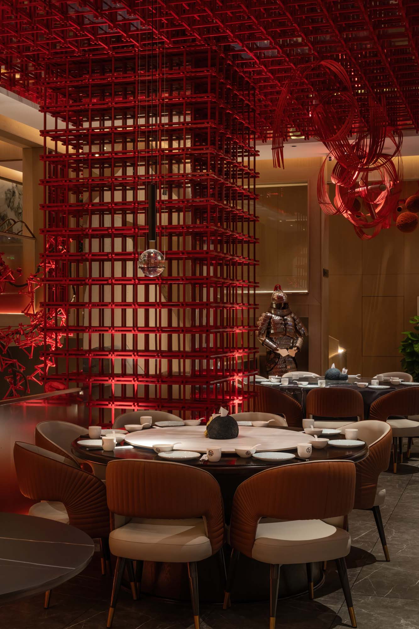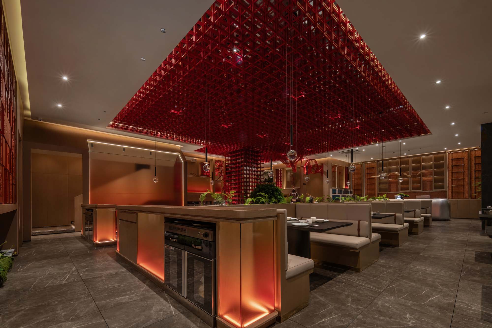 空间意境:夸张的方形红格栅穹顶,一如“中国结”灵感的绽放,在入门的一刻即营造了视觉记忆的第一触点,唤醒了整个餐饮空间的艺术灵感。错综复杂、纵横交错的中国结编织纹理,借由设计师的艺术之手,被放大数万倍呈现于空间之中,层层叠叠,细致入微,宛如一件匠心细作,呼应着品牌注重细节、倾注匠心的独特精神。每一个红色的节点,皆是岁月的注脚,承载着丰富的文化内涵,连接着过去与未来,更是顾客与美味相结缘的缘分线索。