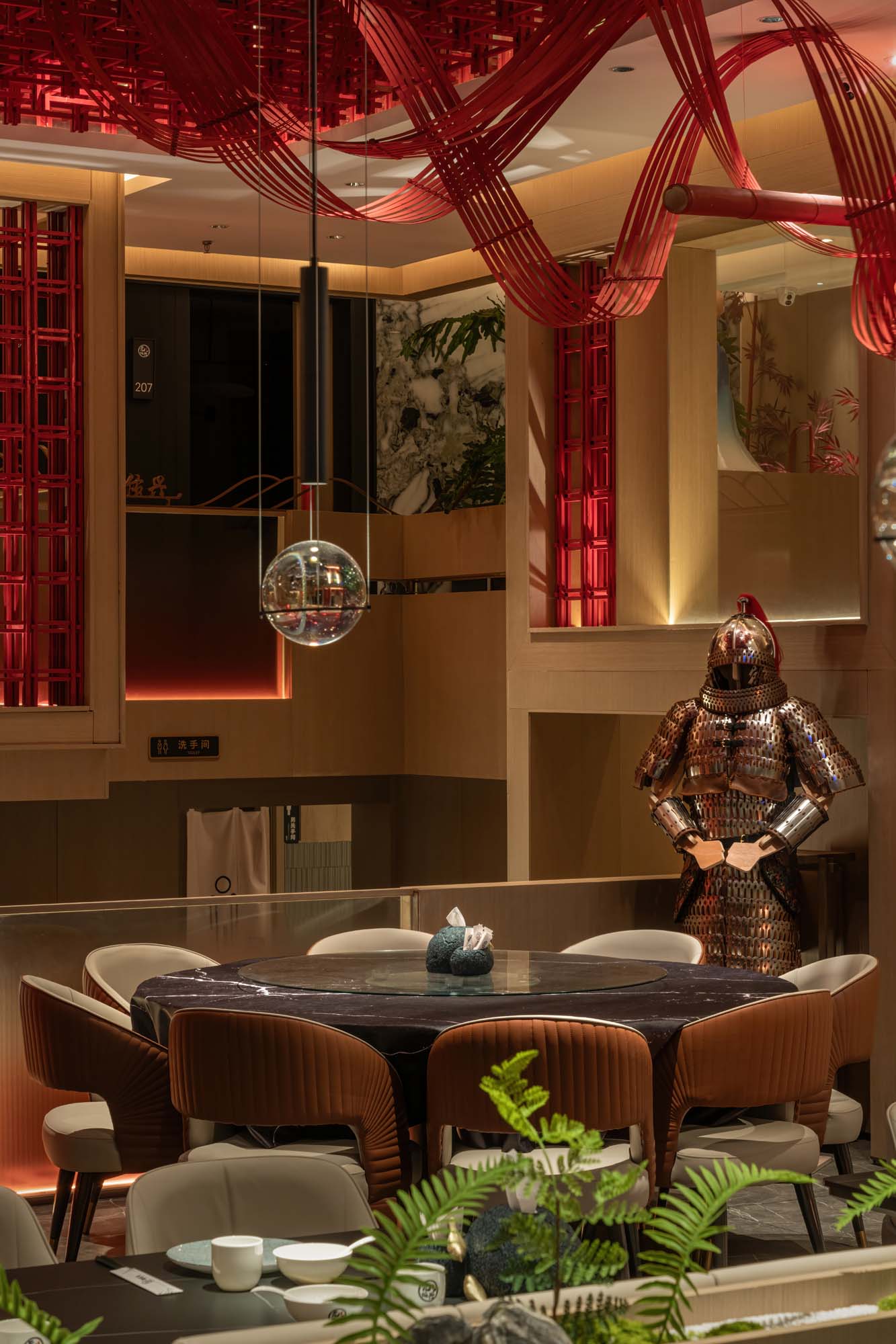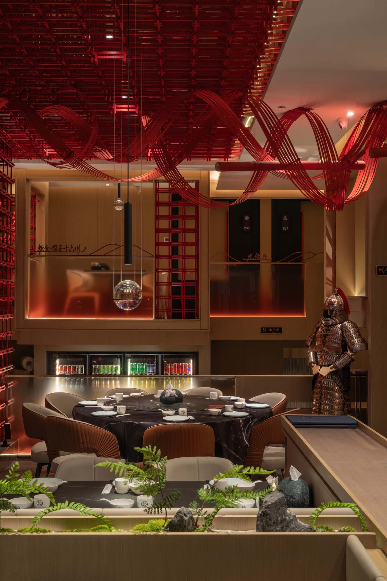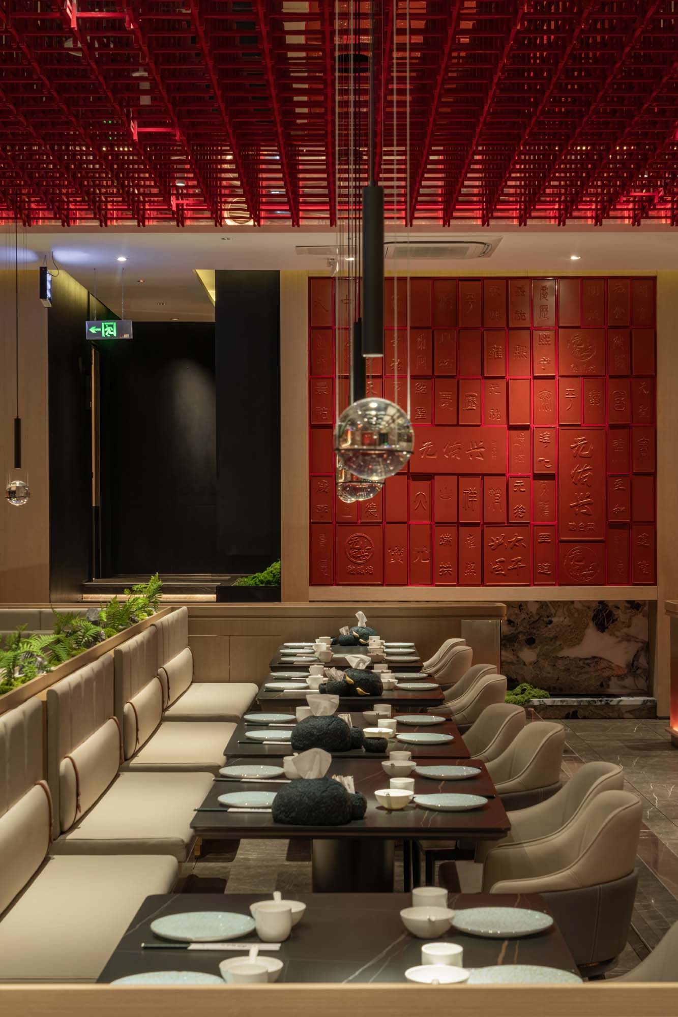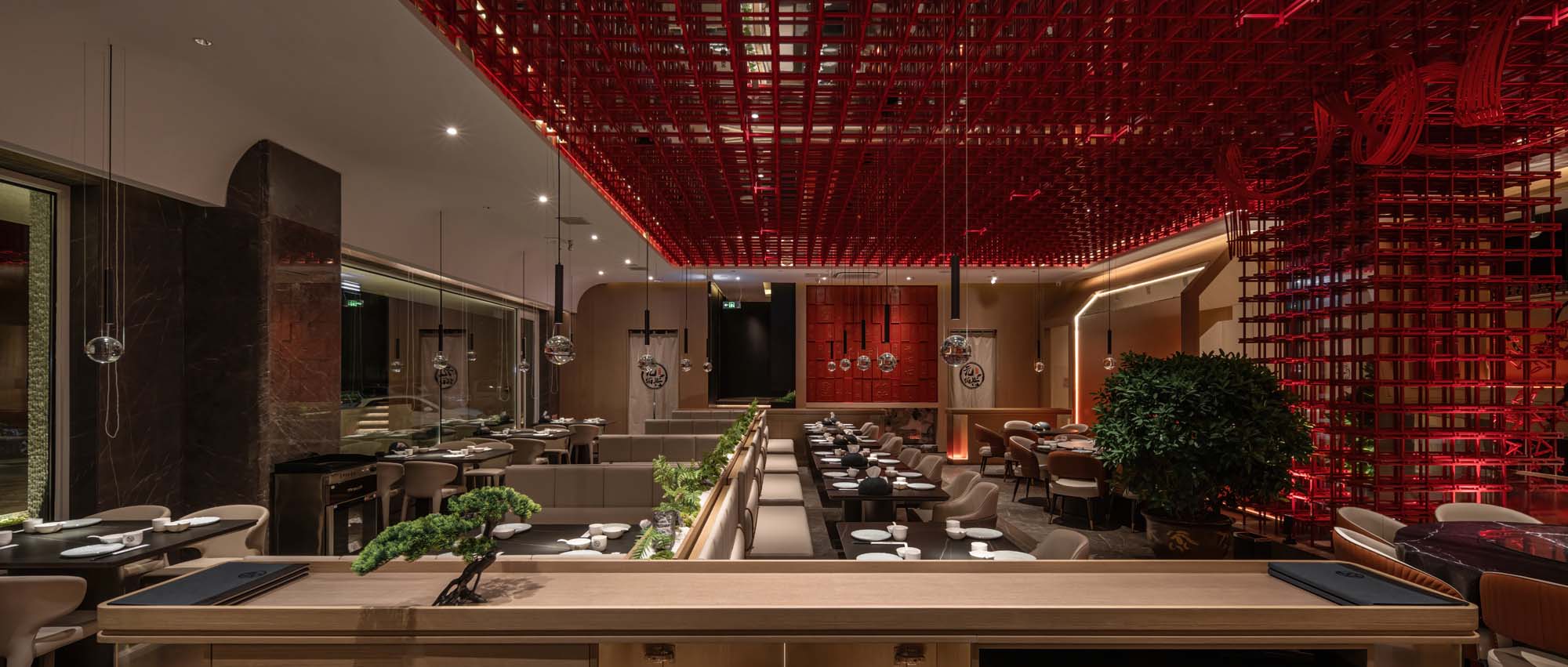 空间意境:夸张的方形红格栅穹顶,一如“中国结”灵感的绽放,在入门的一刻即营造了视觉记忆的第一触点,唤醒了整个餐饮空间的艺术灵感。错综复杂、纵横交错的中国结编织纹理,借由设计师的艺术之手,被放大数万倍呈现于空间之中,层层叠叠,细致入微,宛如一件匠心细作,呼应着品牌注重细节、倾注匠心的独特精神。每一个红色的节点,皆是岁月的注脚,承载着丰富的文化内涵,连接着过去与未来,更是顾客与美味相结缘的缘分线索。