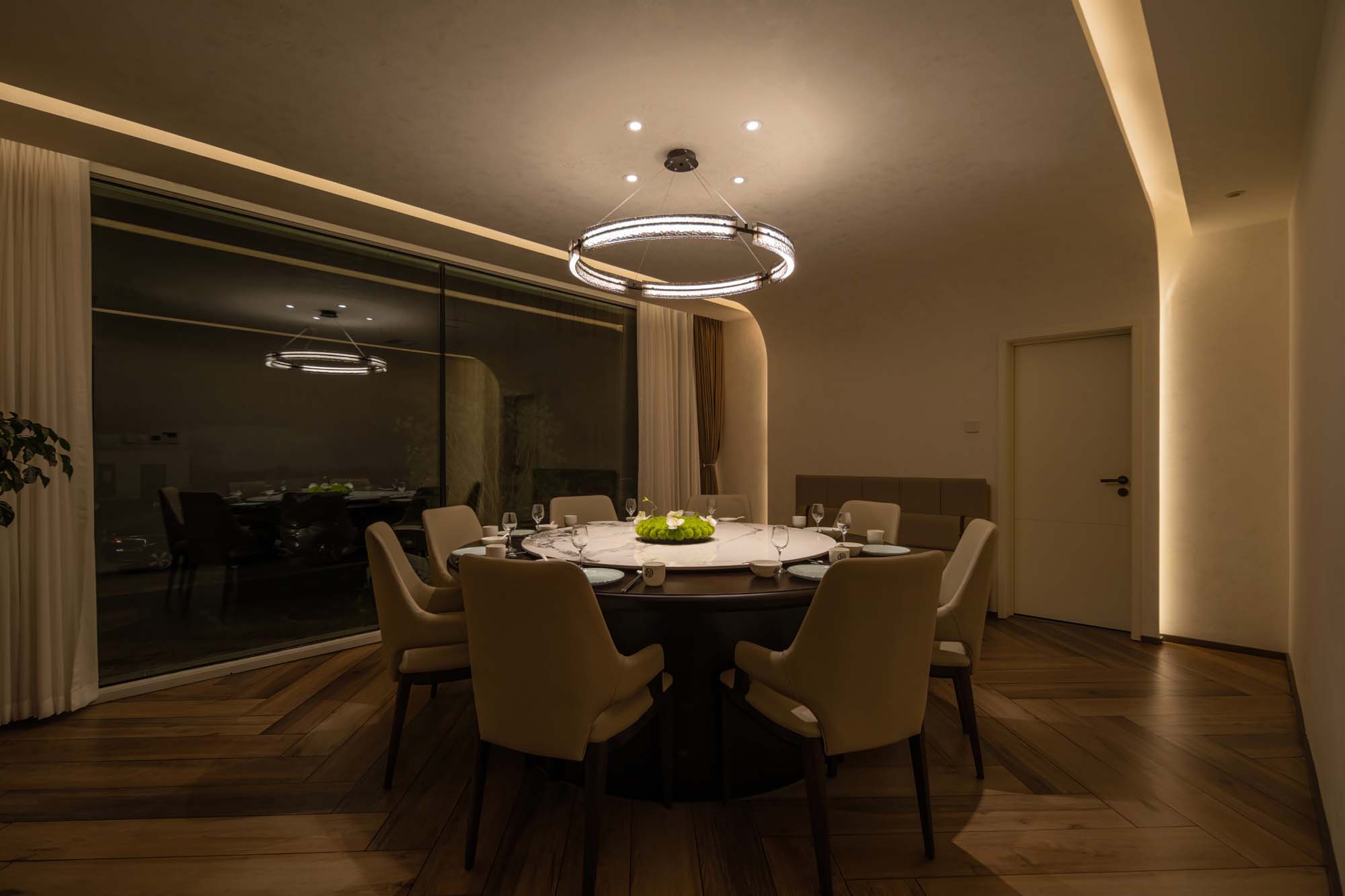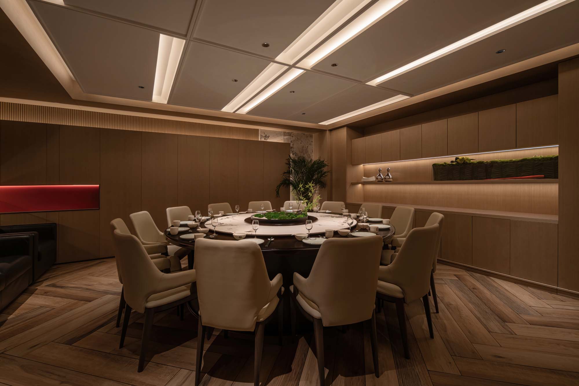 二层包房内的色彩和材质回归自然,整面的落地窗打开了视野,让室内的光影与室外的风景相辅相成,使得空间的界线变得模糊而美好。 -