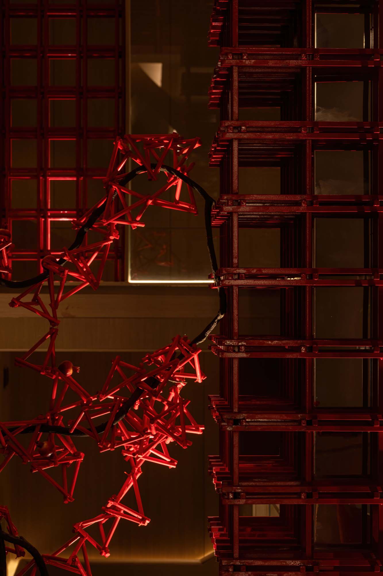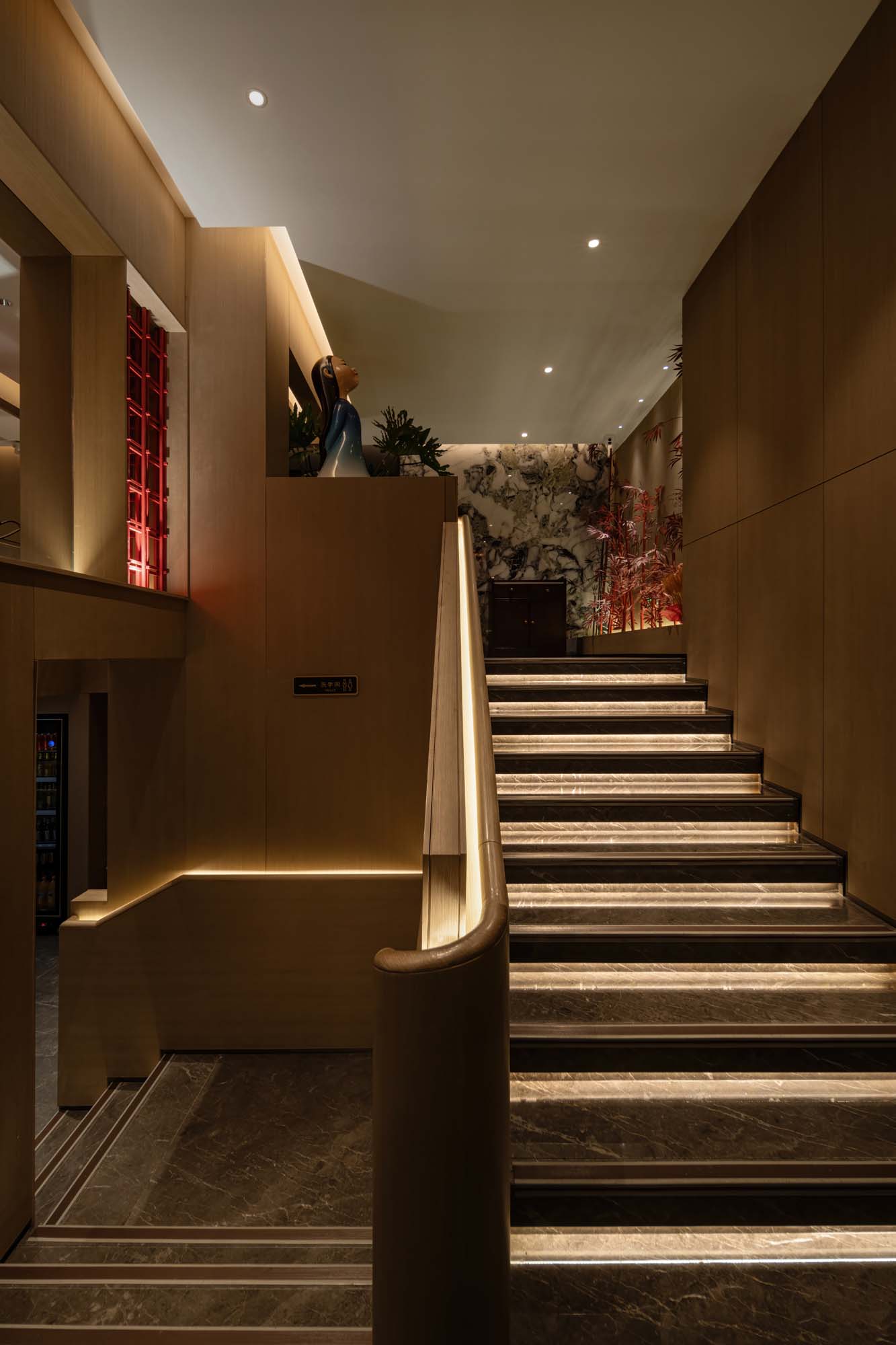楼梯间拾级蜿蜒而上,仿佛踏入了时光隧道,竹子被渲染成红色,在楼梯间优雅地舞动,犹如一场空灵的舞蹈,以独特的方式迎接每一位到来的顾客。这种设计不仅是对中国结主题的呼应,更是一场艺术与自然的邂逅,将迎宾的独特方式融入空间的每一个角落。