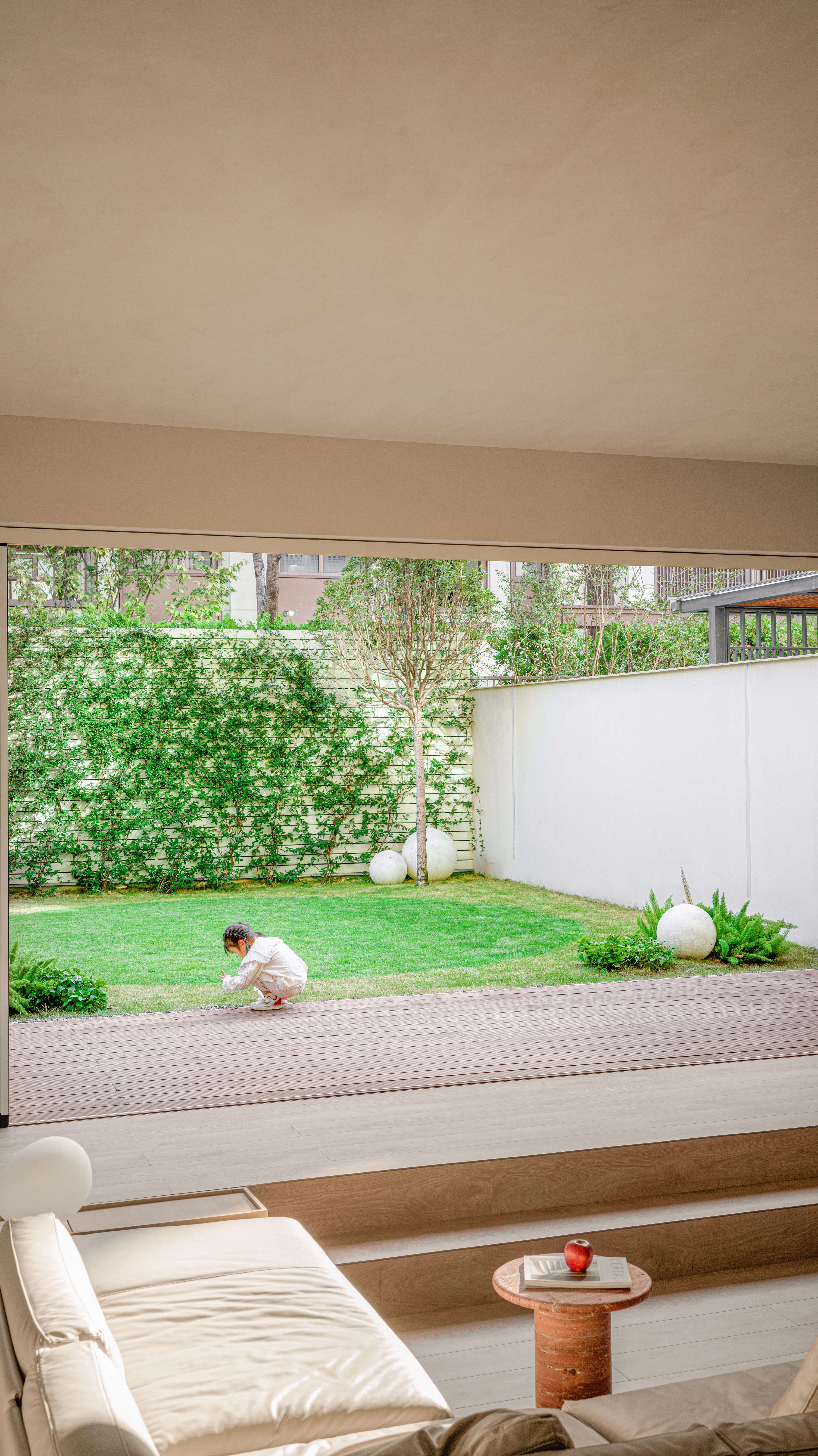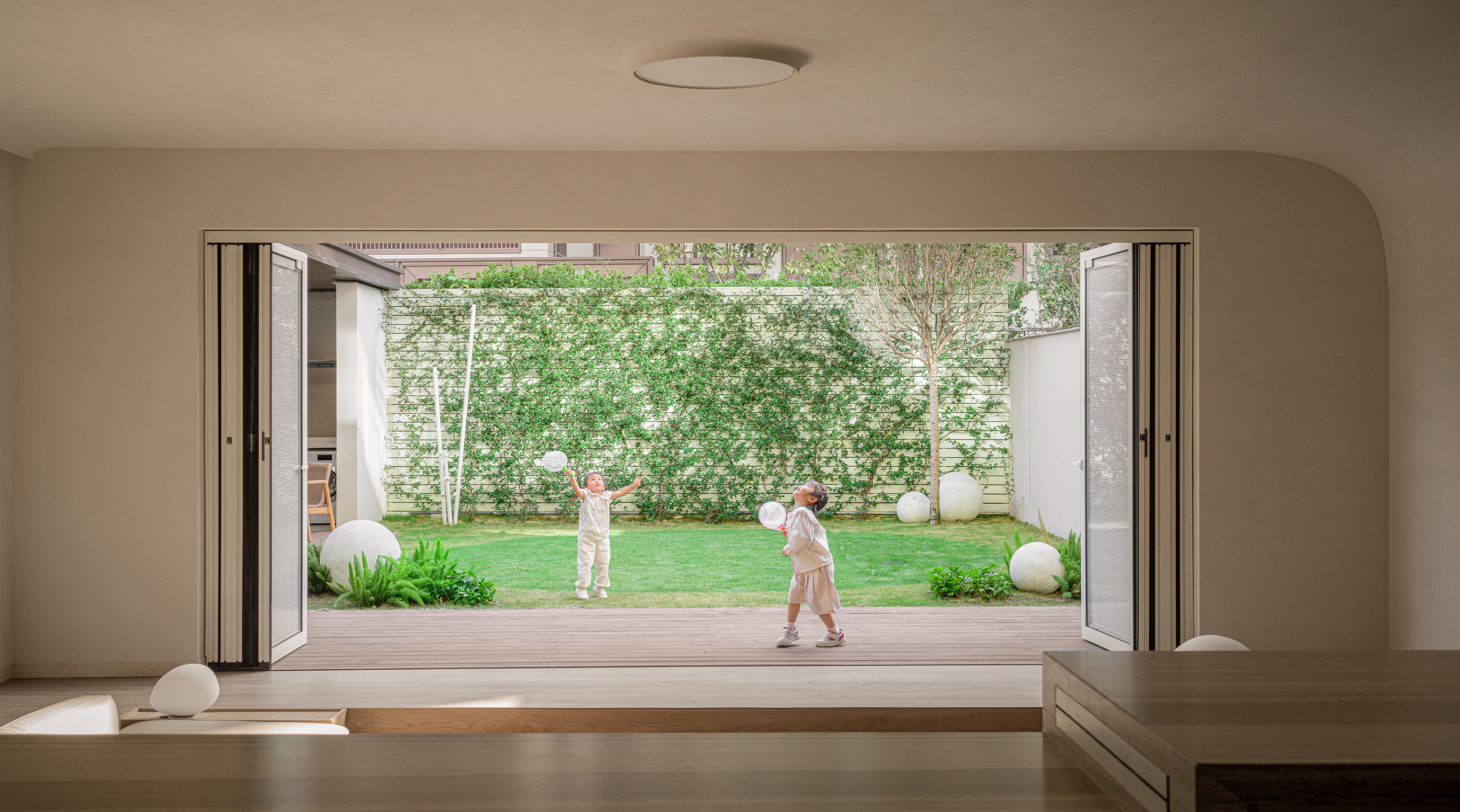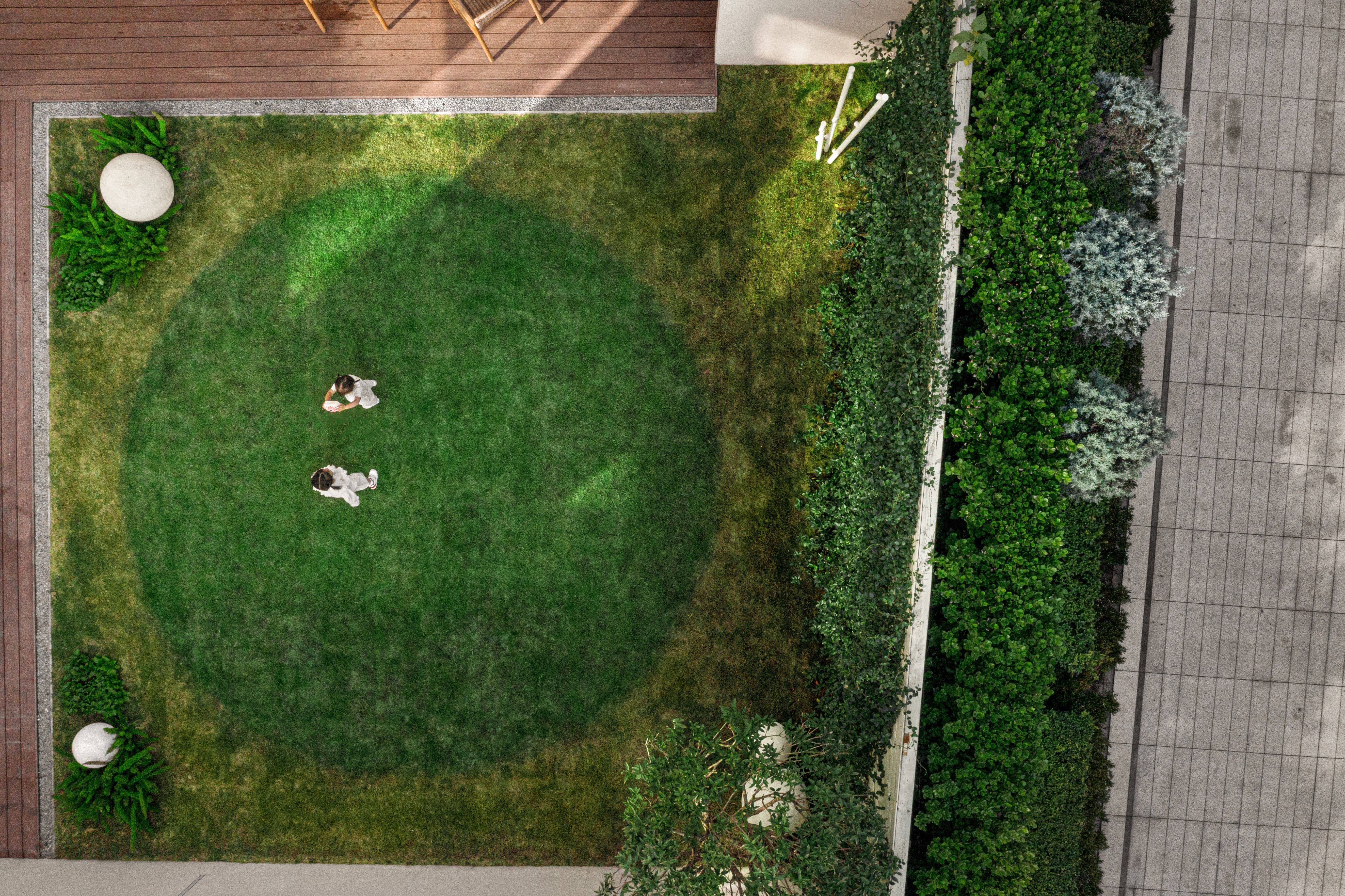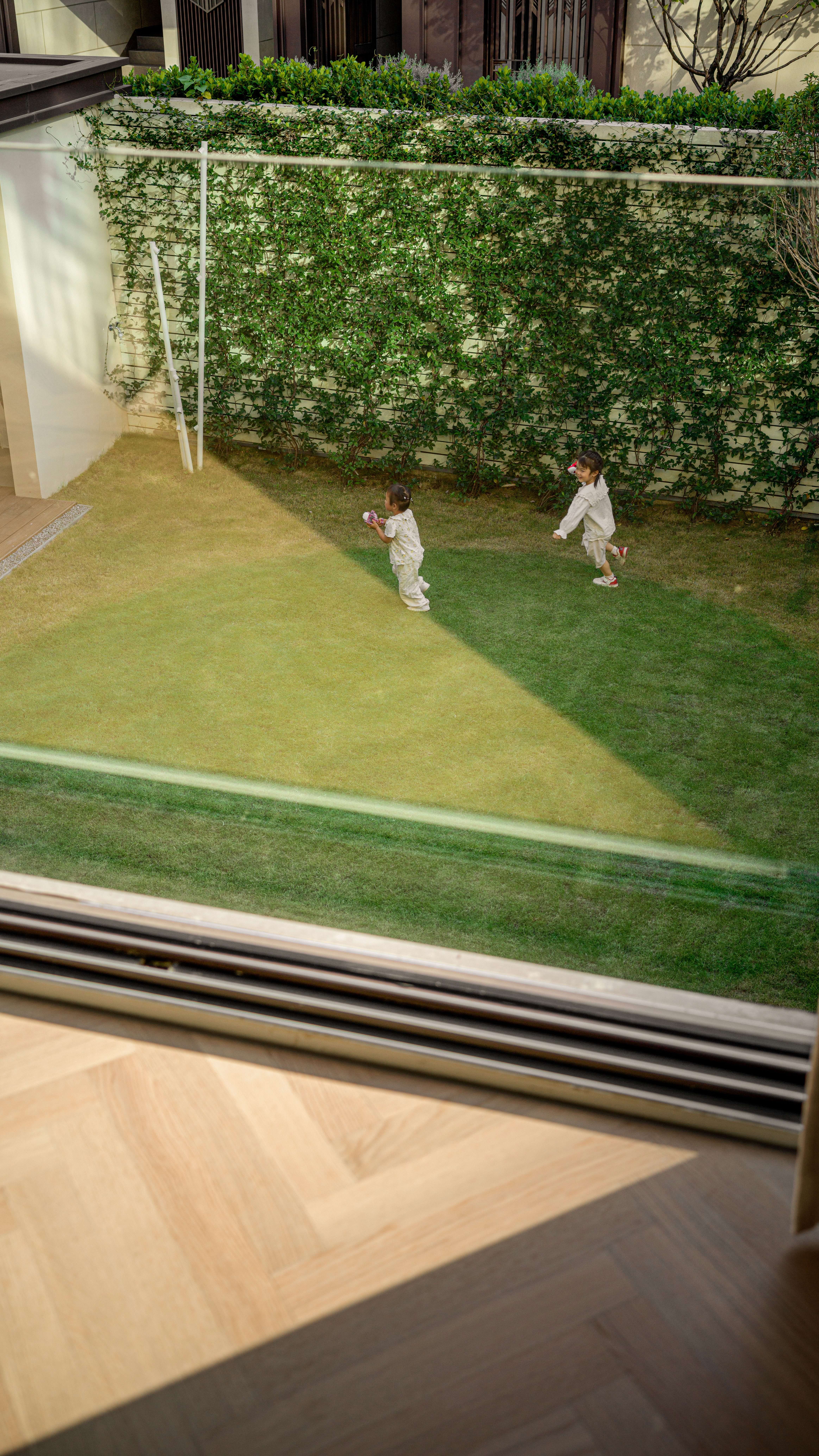 空间意境:运用“宅院一体式”建筑设计手法,将室内外空间有机的结合在一起,在建筑包围的内部打造出一个绿色、自然的环境,让钢筋混凝土产生呼吸之感,向自然浸透寻找自由,看见花木的生命力,模糊边界带来的距离感,强调人与自然、空间最舒适的状态,建立室内空间与户外的亲密关系,随季节更替,感受四时之景。在花园草坪处我们尊重天性,以小孩子天生喜欢兜圈奔跑起来的圆弧成像,将方形的花园用两种颜色的草坪区分,环状循环没有尽头般地形成「花园跑场」。