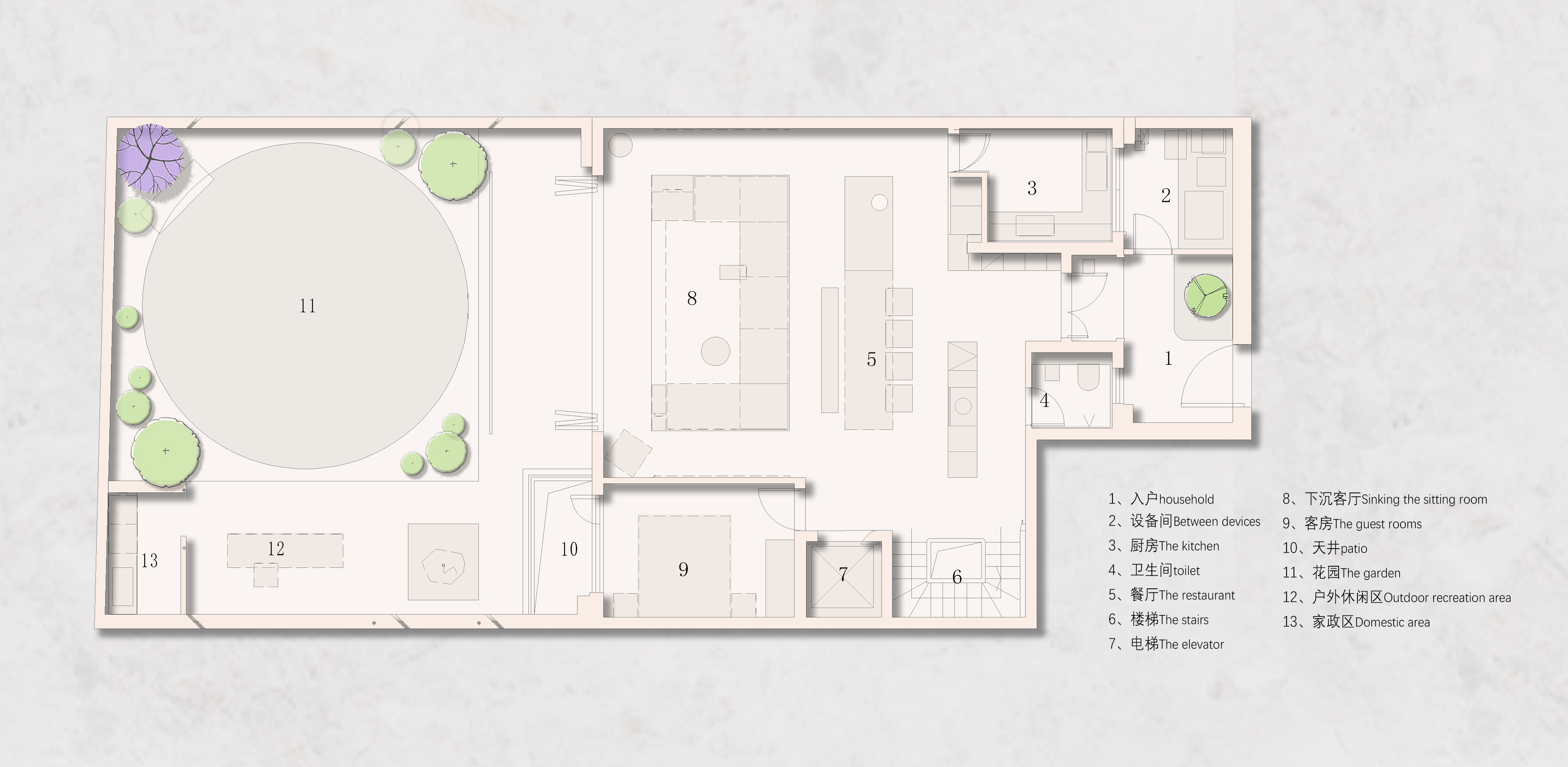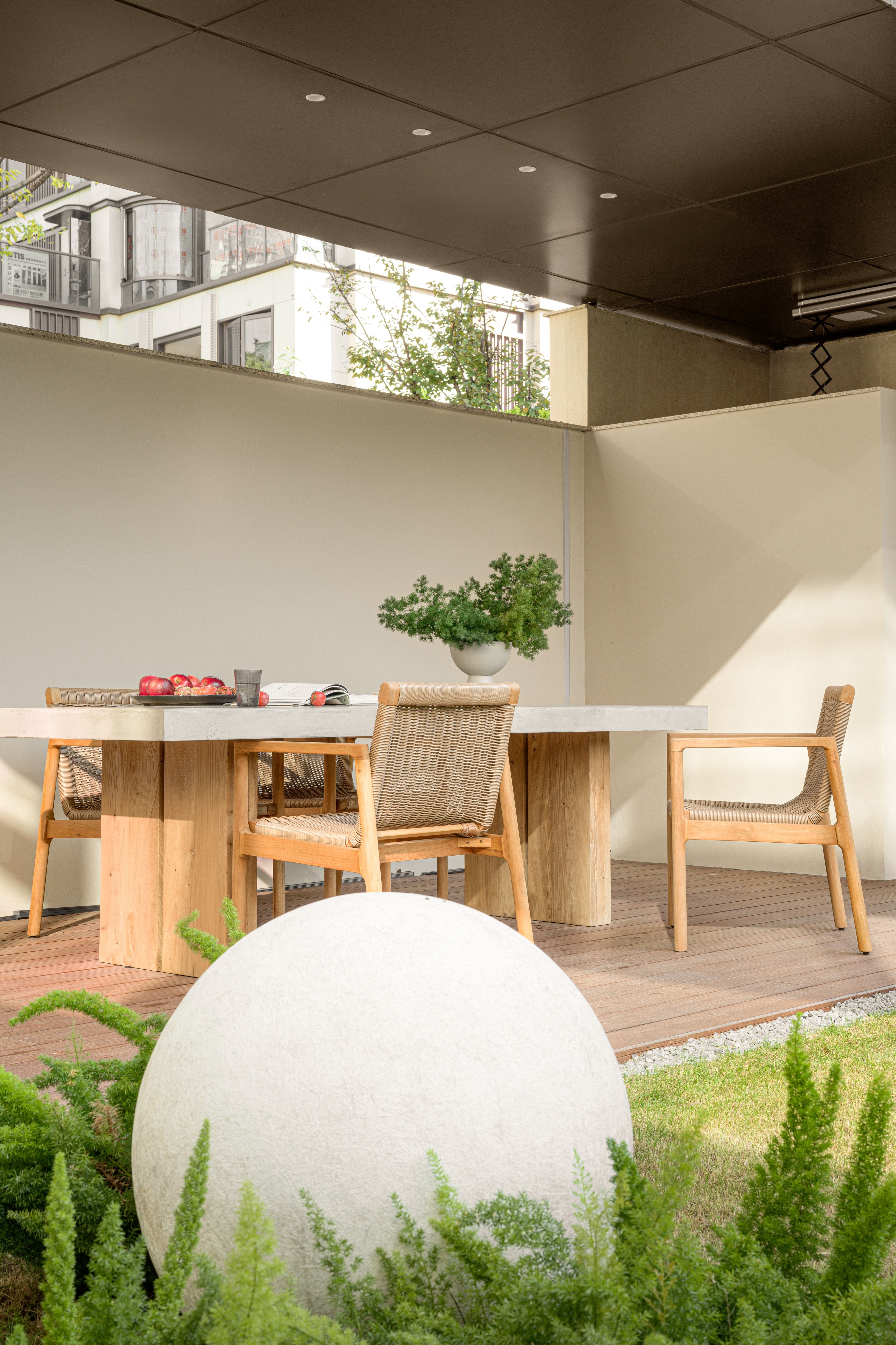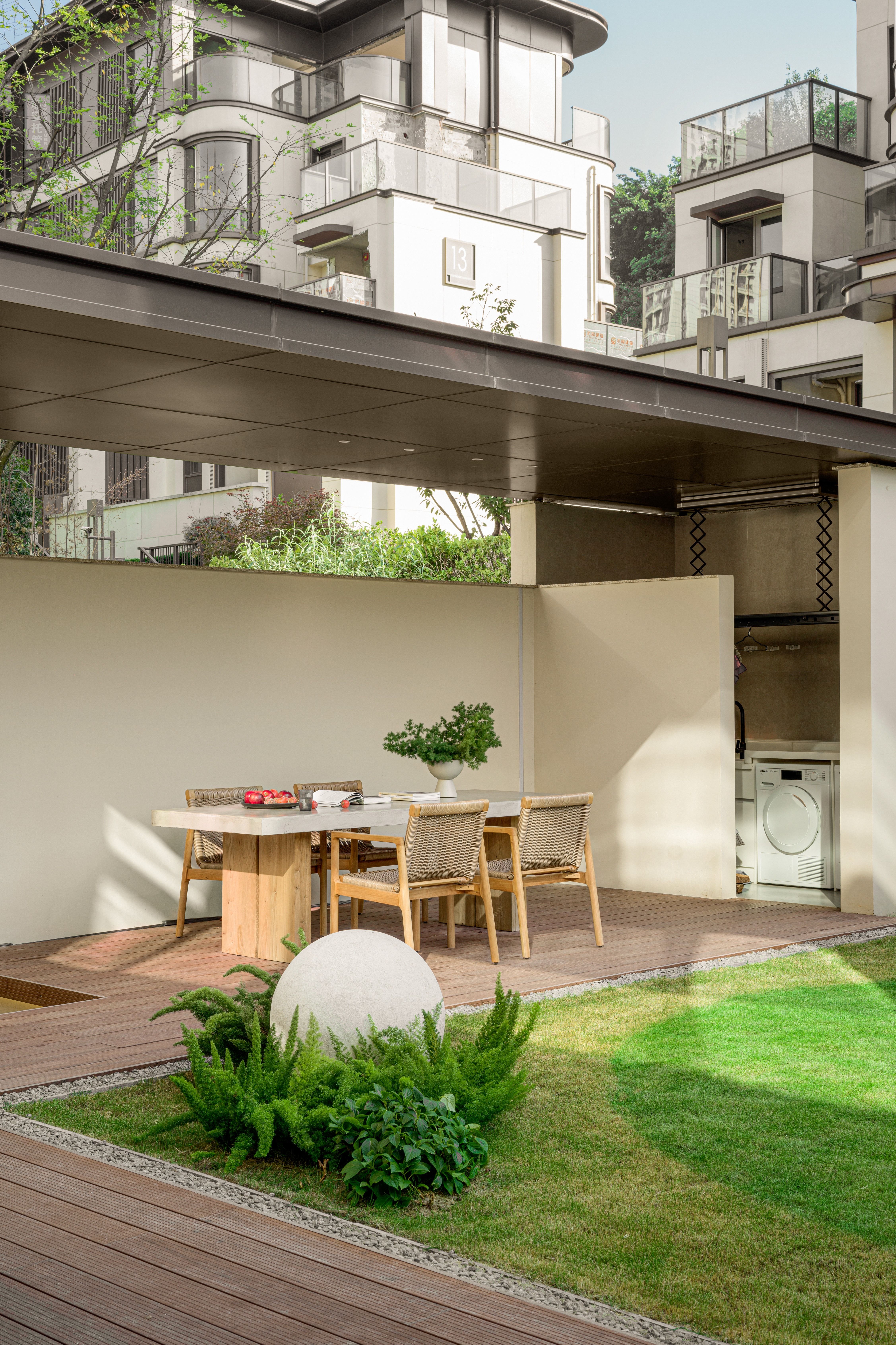 空间意境:运用“宅院一体式”建筑设计手法,将室内外空间有机的结合在一起,在建筑包围的内部打造出一个绿色、自然的环境,让钢筋混凝土产生呼吸之感,向自然浸透寻找自由,看见花木的生命力,模糊边界带来的距离感,强调人与自然、空间最舒适的状态,建立室内空间与户外的亲密关系,随季节更替,感受四时之景。在花园草坪处我们尊重天性,以小孩子天生喜欢兜圈奔跑起来的圆弧成像,将方形的花园用两种颜色的草坪区分,环状循环没有尽头般地形成「花园跑场」。
