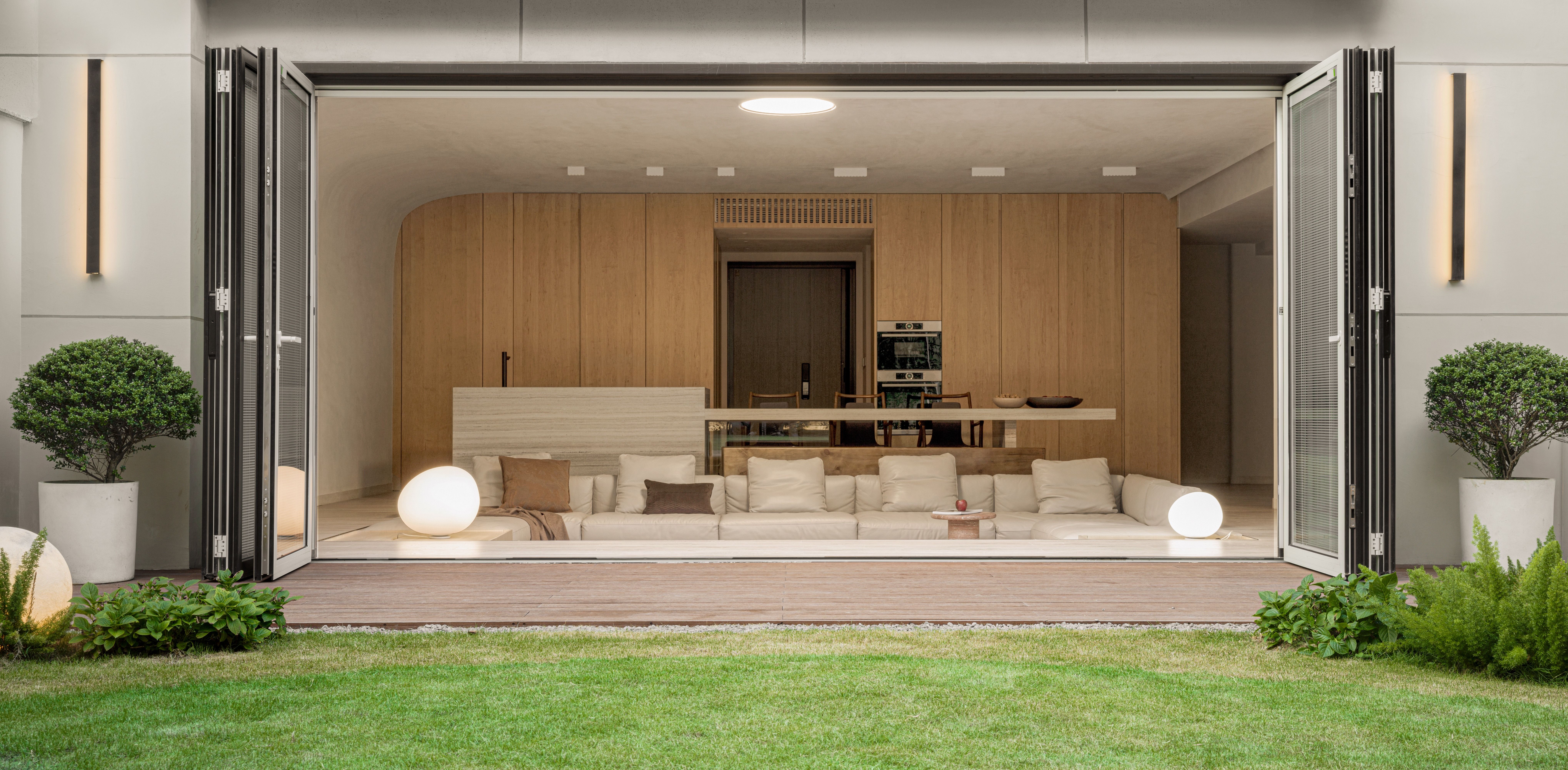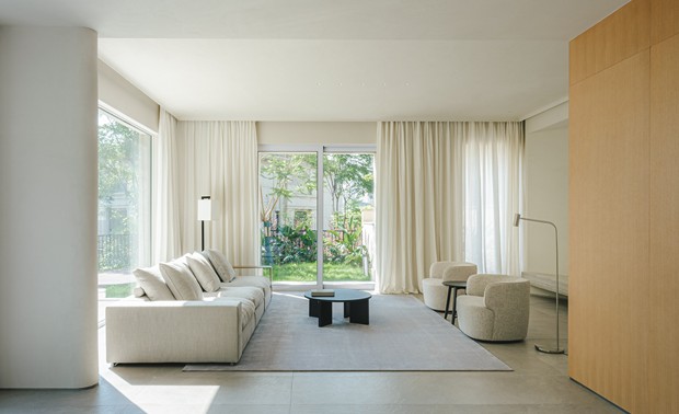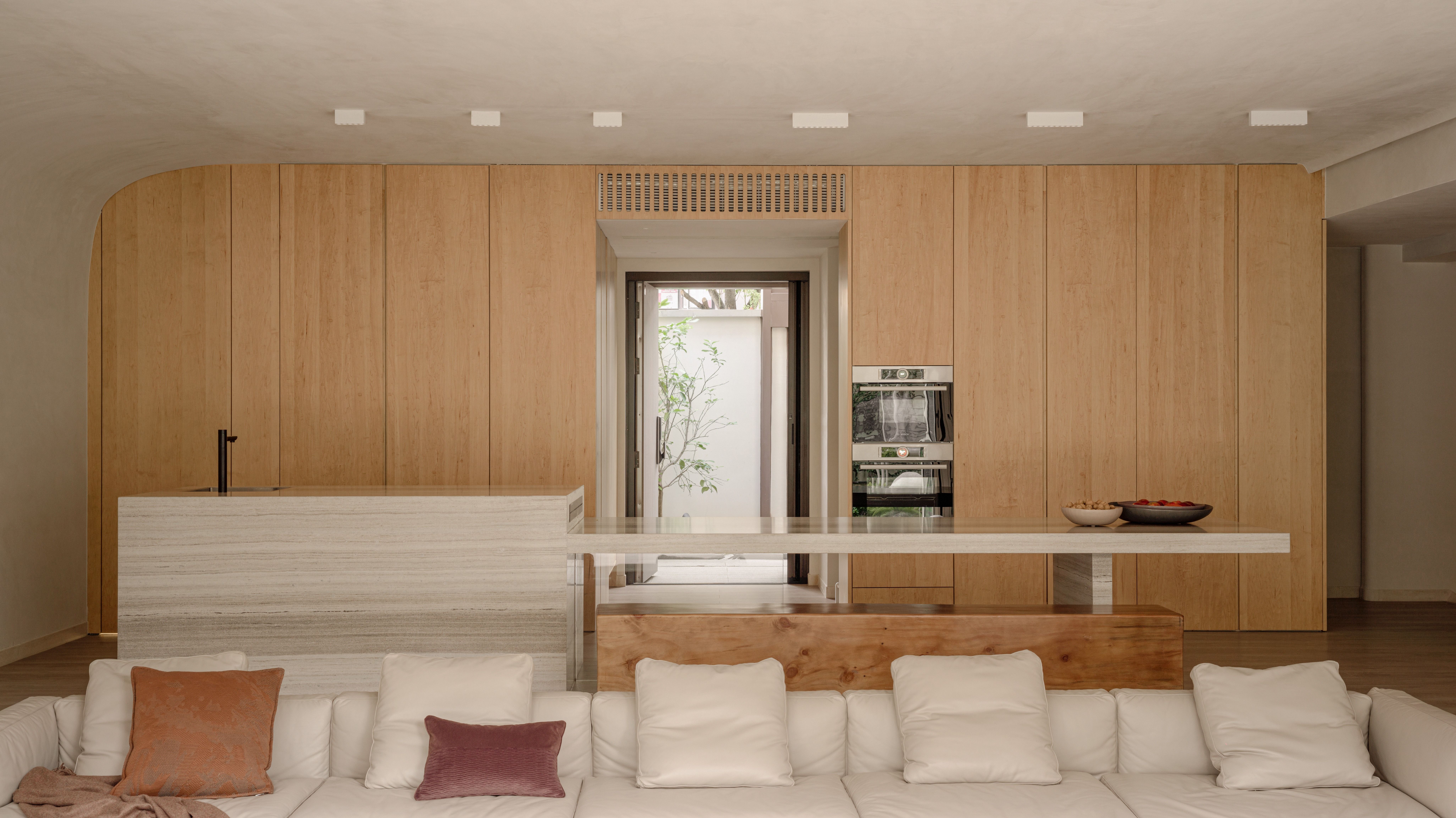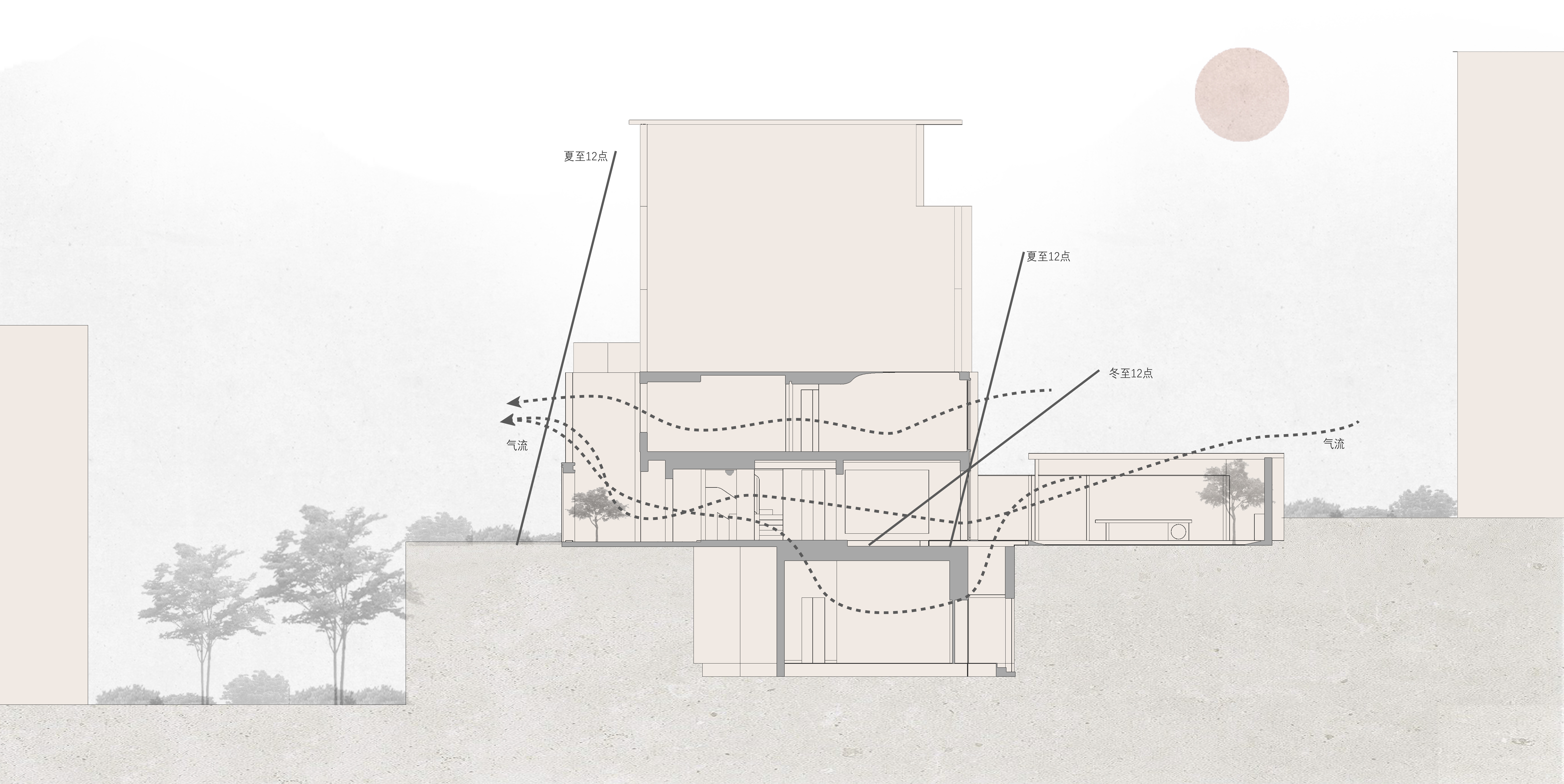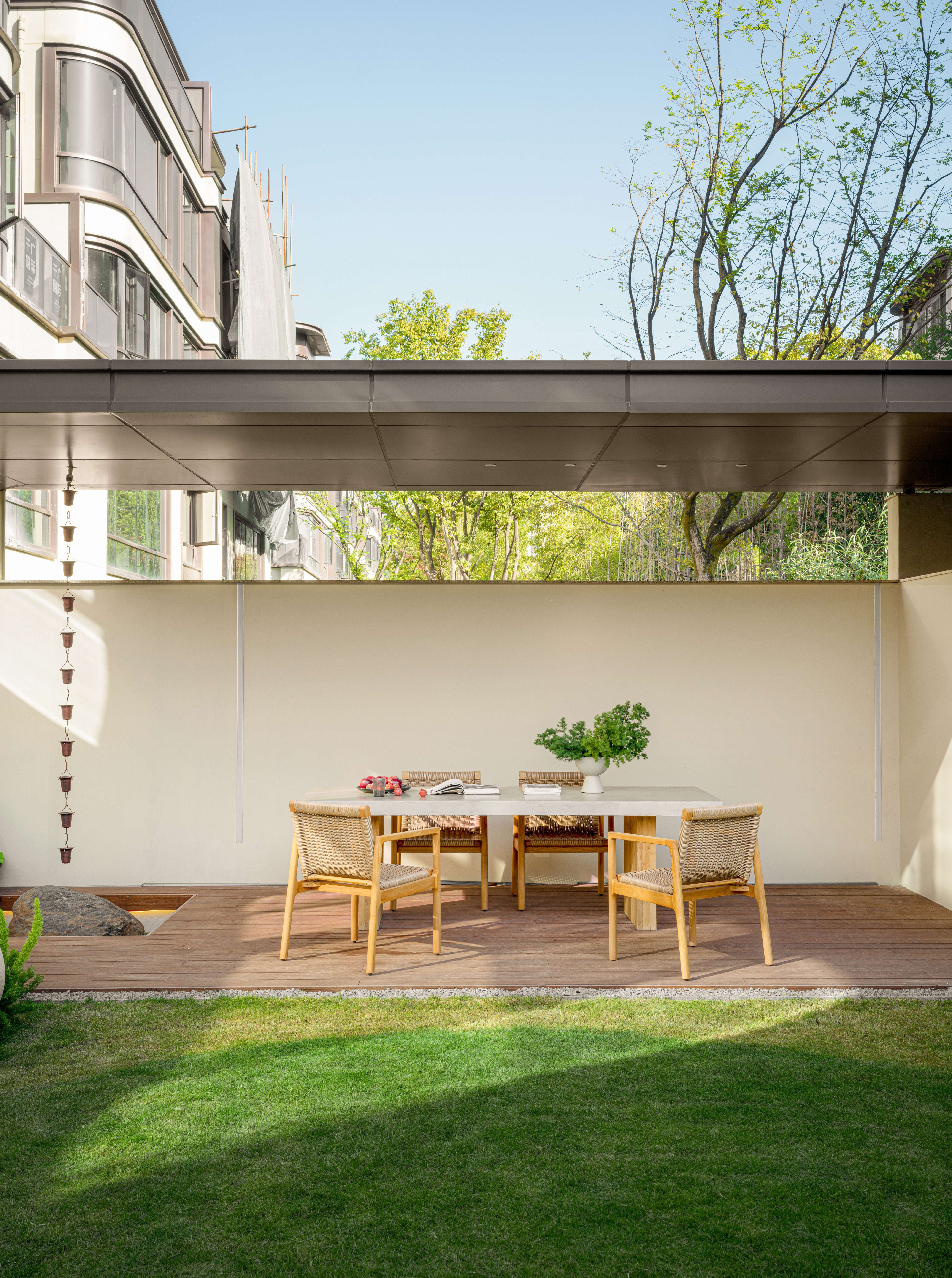 空间意境:运用“宅院一体式”建筑设计手法,将室内外空间有机的结合在一起,在建筑包围的内部打造出一个绿色、自然的环境,让钢筋混凝土产生呼吸之感,向自然浸透寻找自由,看见花木的生命力,模糊边界带来的距离感,强调人与自然、空间最舒适的状态,建立室内空间与户外的亲密关系,随季节更替,感受四时之景。在花园草坪处我们尊重天性,以小孩子天生喜欢兜圈奔跑起来的圆弧成像,将方形的花园用两种颜色的草坪区分,环状循环没有尽头般地形成「花园跑场」。
