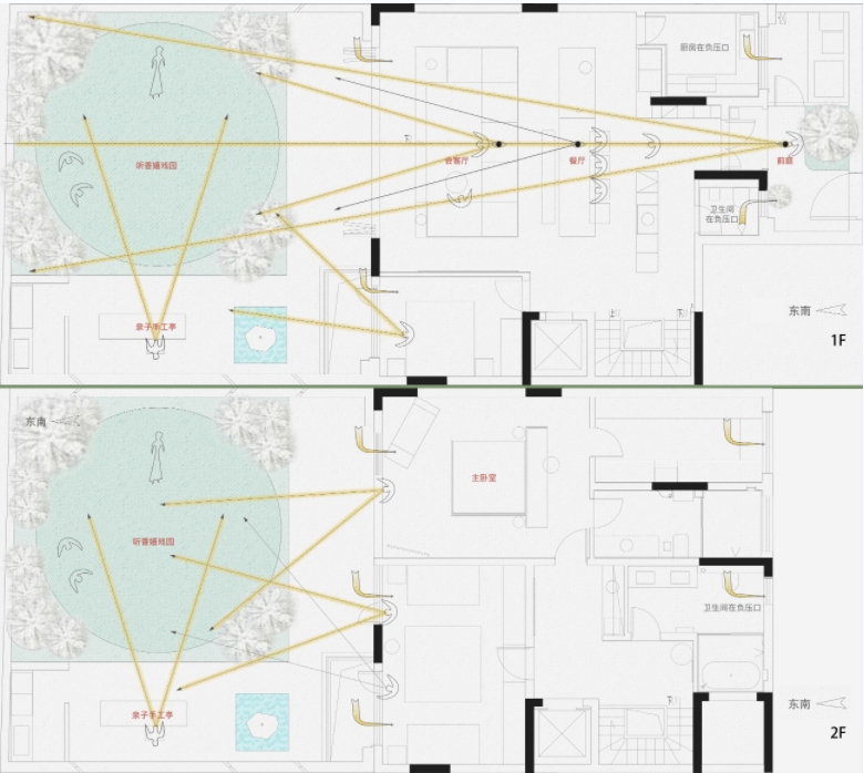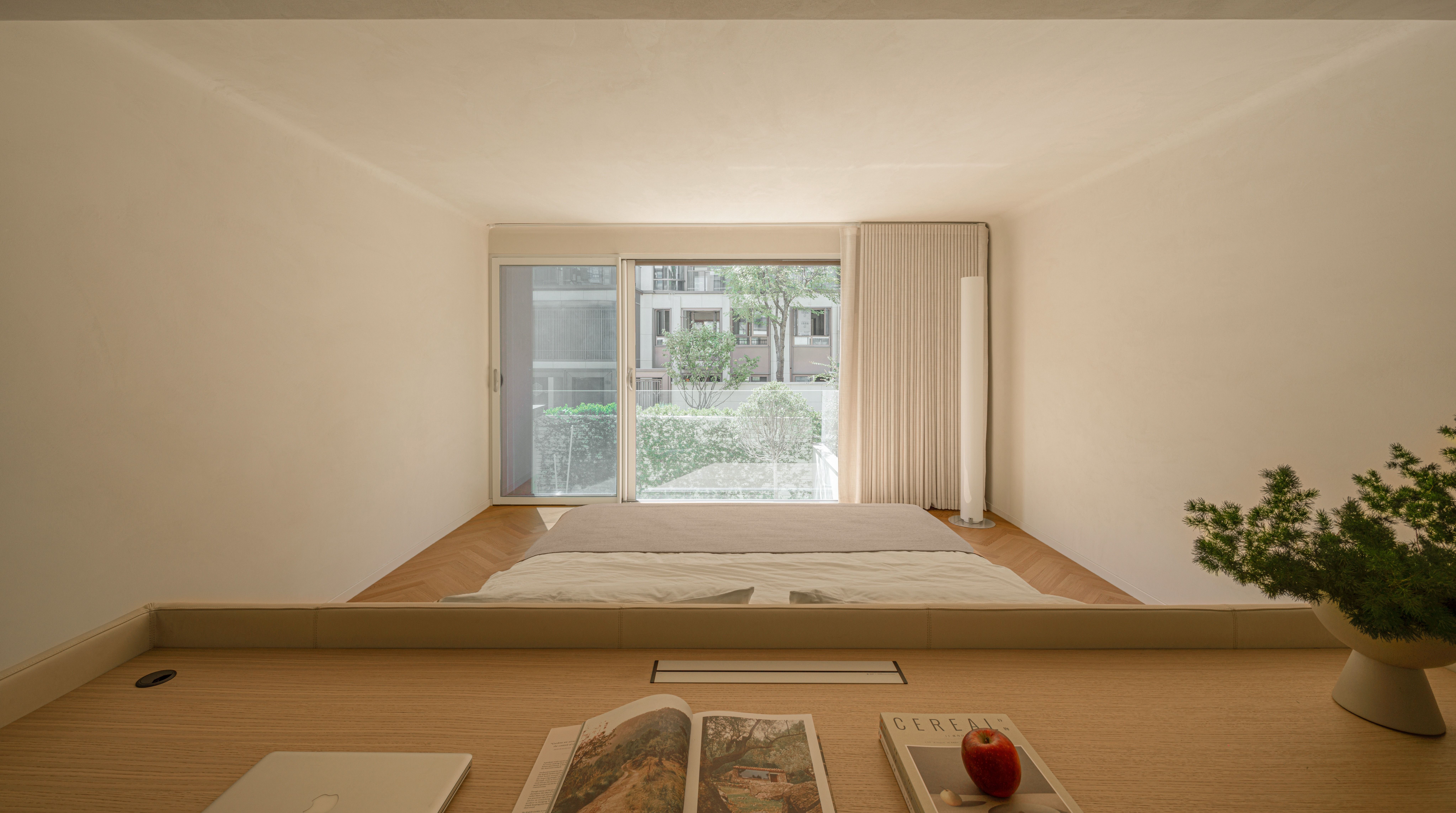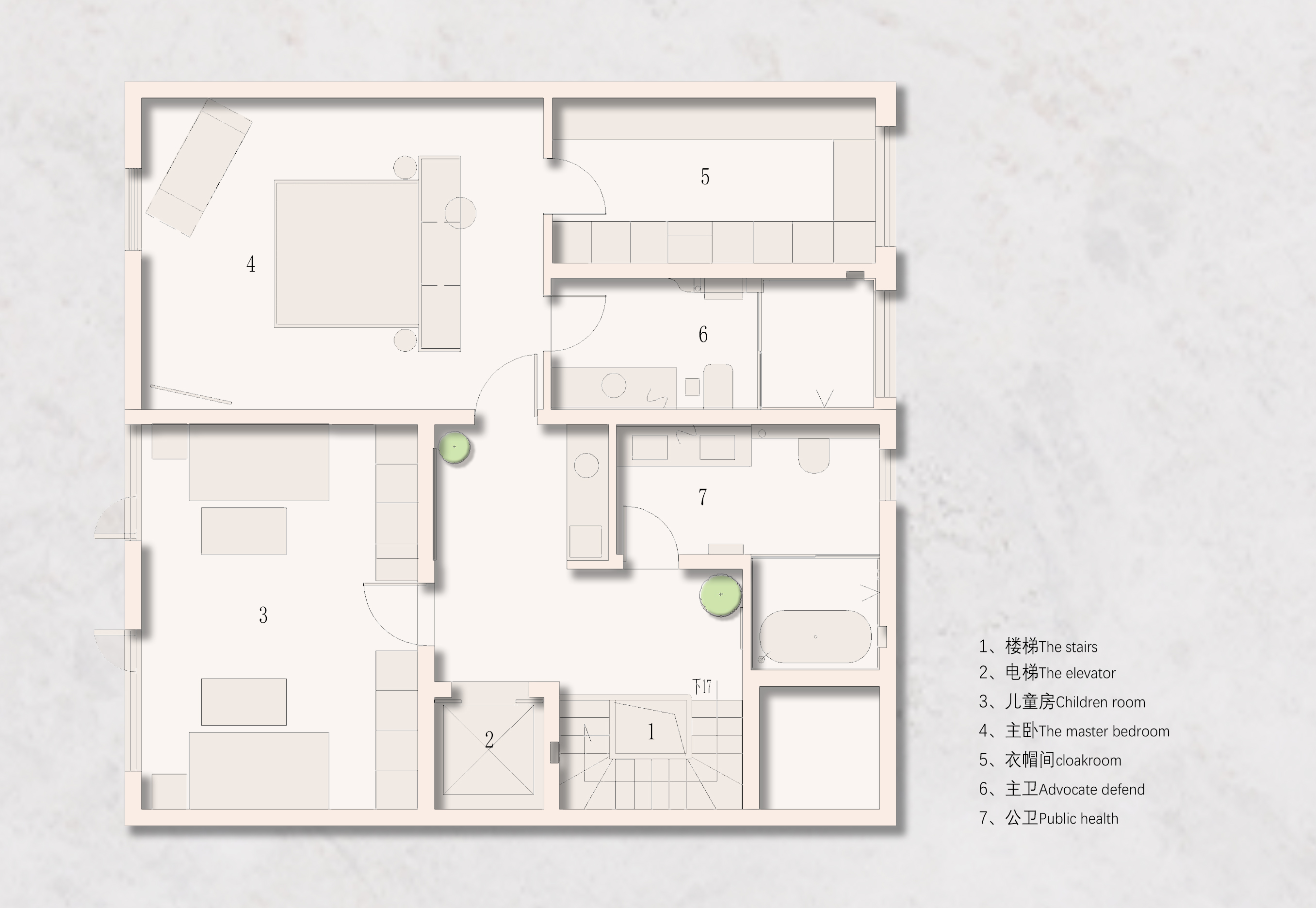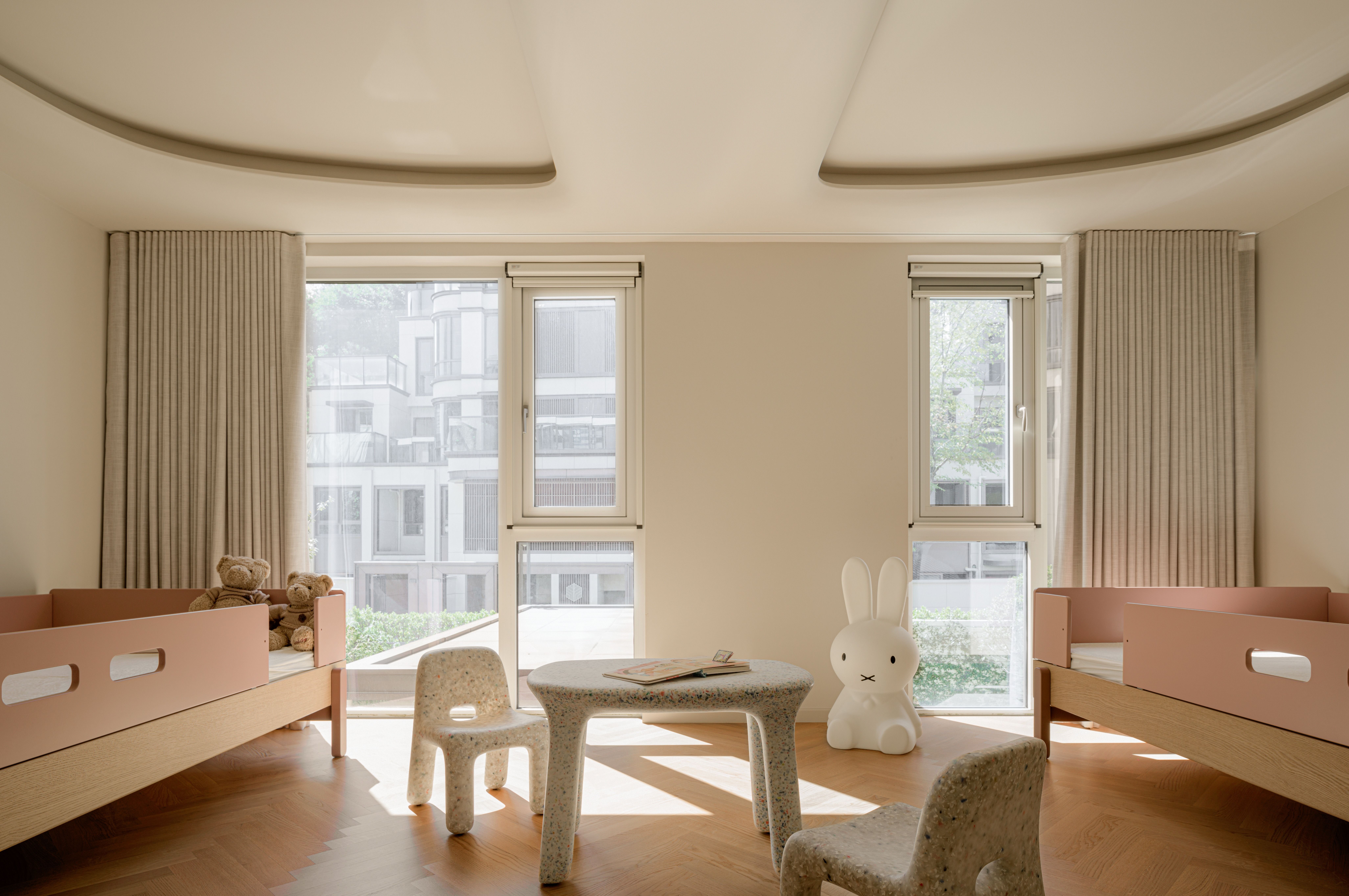 空间布局:从入户的第一眼开始,视觉焦点便在光的指引下顺着剧场,梯田式布局空间通透而充满层次地到达花园区域。利用向上攀爬的藤蔓以数量、体积、微运动的变化,转化为柔的坚韧,静的力量。为解决一层空间层高低矮的压抑感,我们将顶梁包裹起来拉通顶面,嵌入式顶灯和灯带腾出顶部空间,以开阔的横向视角减少纵向压迫感,下沉式会客厅将人围合的同时也为纵向空间创造更多层高。头排下沉式沙发休闲区模拟蹲下来与儿童交流,我们尽量把视点高度降低,仿佛父母希望传达给女儿们建立亲和的家庭关系、二排餐厅就餐、三排入户漫游。二层卧室更换原幕墙式小窗户为门窗栏杆一体系统,打开滑门让主卧室形成阳台式的灰色空间。将室外风景最大可能地纳入室内的同时,还让每个空间都和儿童奔跑的花园剧场产生了亲密的围合关系。唤起对自然、对外界的亲昵本能,以及空间和家人之间关注与被关注的关系。将原本两间独立的儿童房连通为一间,让姐妹俩再日复一日的光阴中互帮互助,相互滋养,真正做到「同生共长」,在设计中注入家文化的表现和传承,决定将花园作为最重要阶层区域的瞬间,便决定了这所房子将承载,孩子健康成长和家人互相关注的使命,潜移默化给予女儿成长养分。