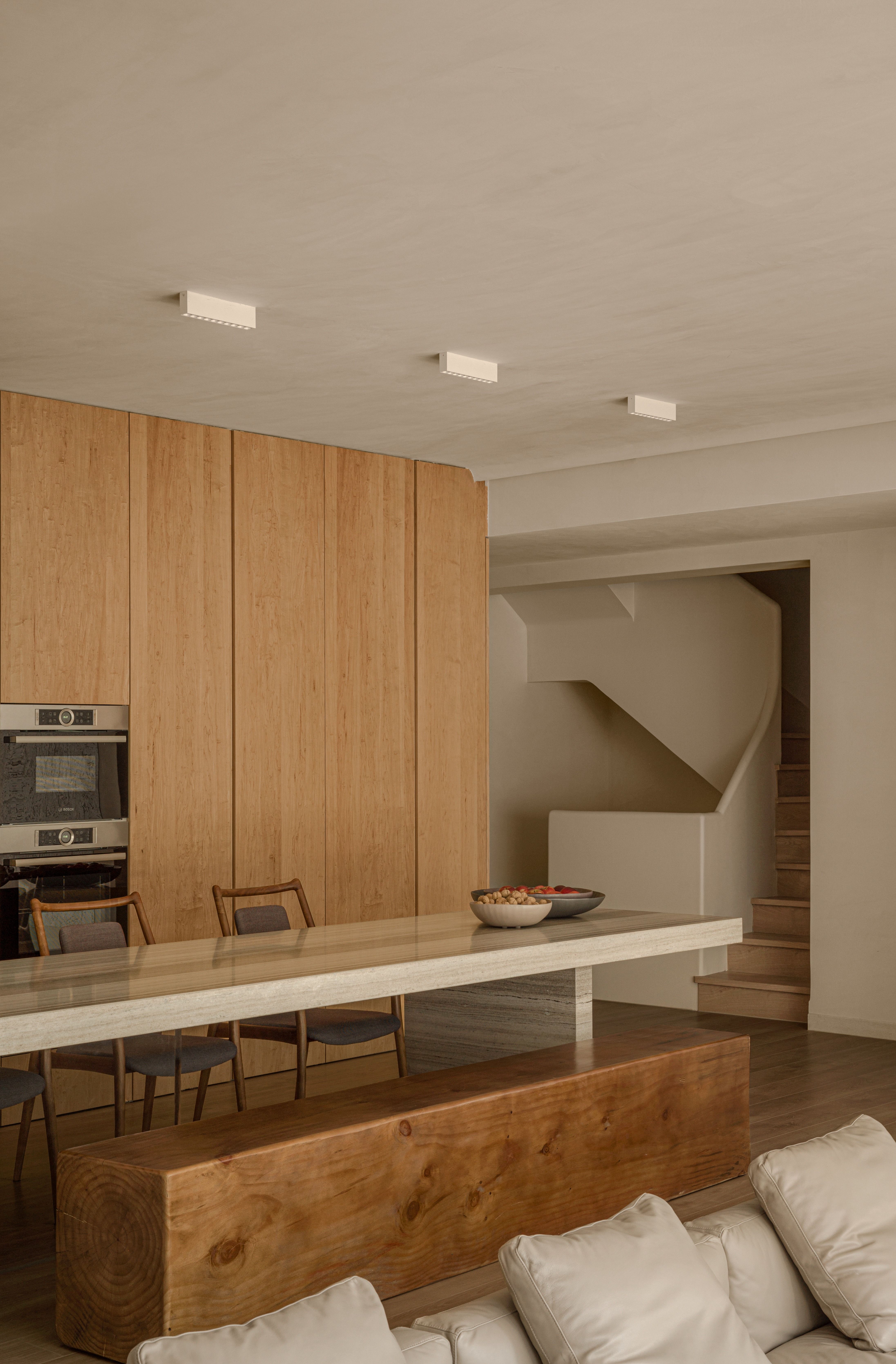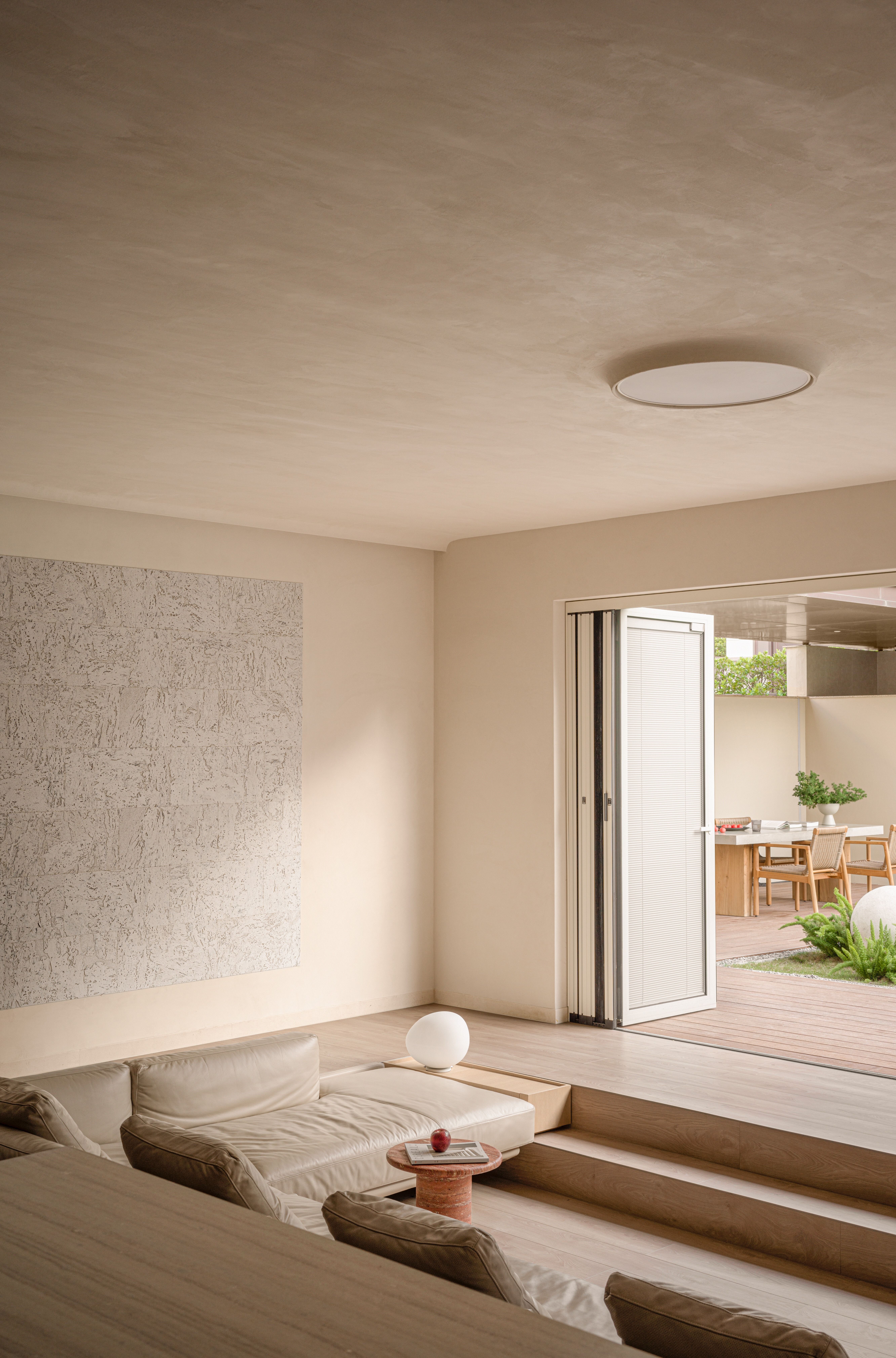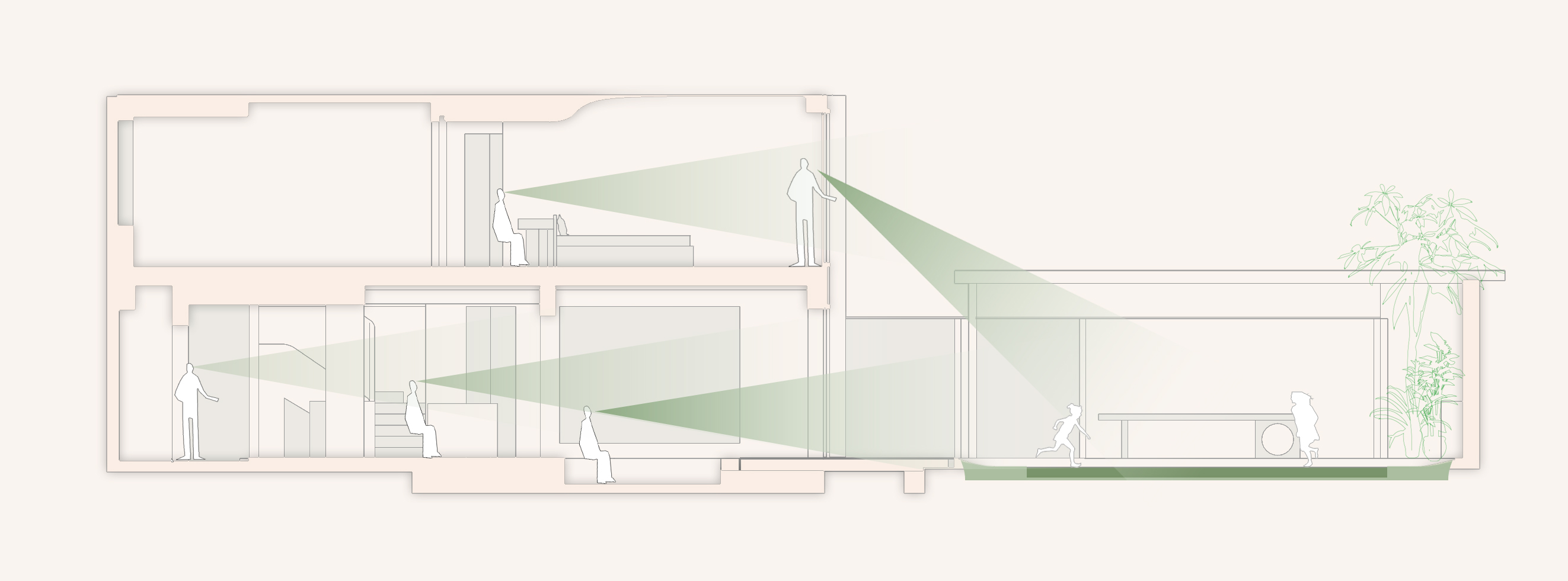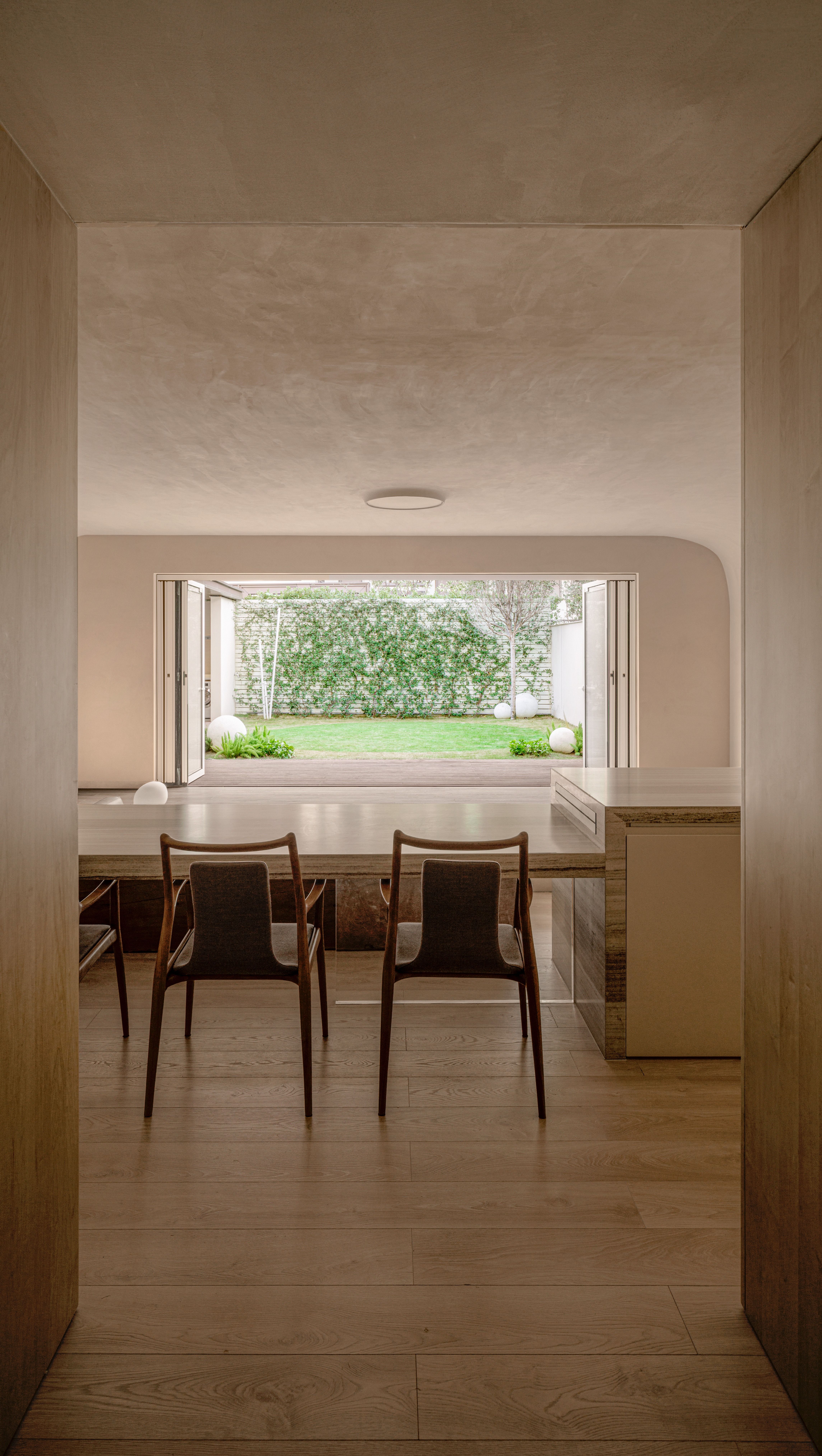 空间布局:从入户的第一眼开始,视觉焦点便在光的指引下顺着剧场,梯田式布局空间通透而充满层次地到达花园区域。利用向上攀爬的藤蔓以数量、体积、微运动的变化,转化为柔的坚韧,静的力量。为解决一层空间层高低矮的压抑感,我们将顶梁包裹起来拉通顶面,嵌入式顶灯和灯带腾出顶部空间,以开阔的横向视角减少纵向压迫感,下沉式会客厅将人围合的同时也为纵向空间创造更多层高。头排下沉式沙发休闲区模拟蹲下来与儿童交流,我们尽量把视点高度降低,仿佛父母希望传达给女儿们建立亲和的家庭关系、二排餐厅就餐、三排入户漫游。二层卧室更换原幕墙式小窗户为门窗栏杆一体系统,打开滑门让主卧室形成阳台式的灰色空间。将室外风景最大可能地纳入室内的同时,还让每个空间都和儿童奔跑的花园剧场产生了亲密的围合关系。唤起对自然、对外界的亲昵本能,以及空间和家人之间关注与被关注的关系。将原本两间独立的儿童房连通为一间,让姐妹俩再日复一日的光阴中互帮互助,相互滋养,真正做到「同生共长」,在设计中注入家文化的表现和传承,决定将花园作为最重要阶层区域的瞬间,便决定了这所房子将承载,孩子健康成长和家人互相关注的使命,潜移默化给予女儿成长养分。