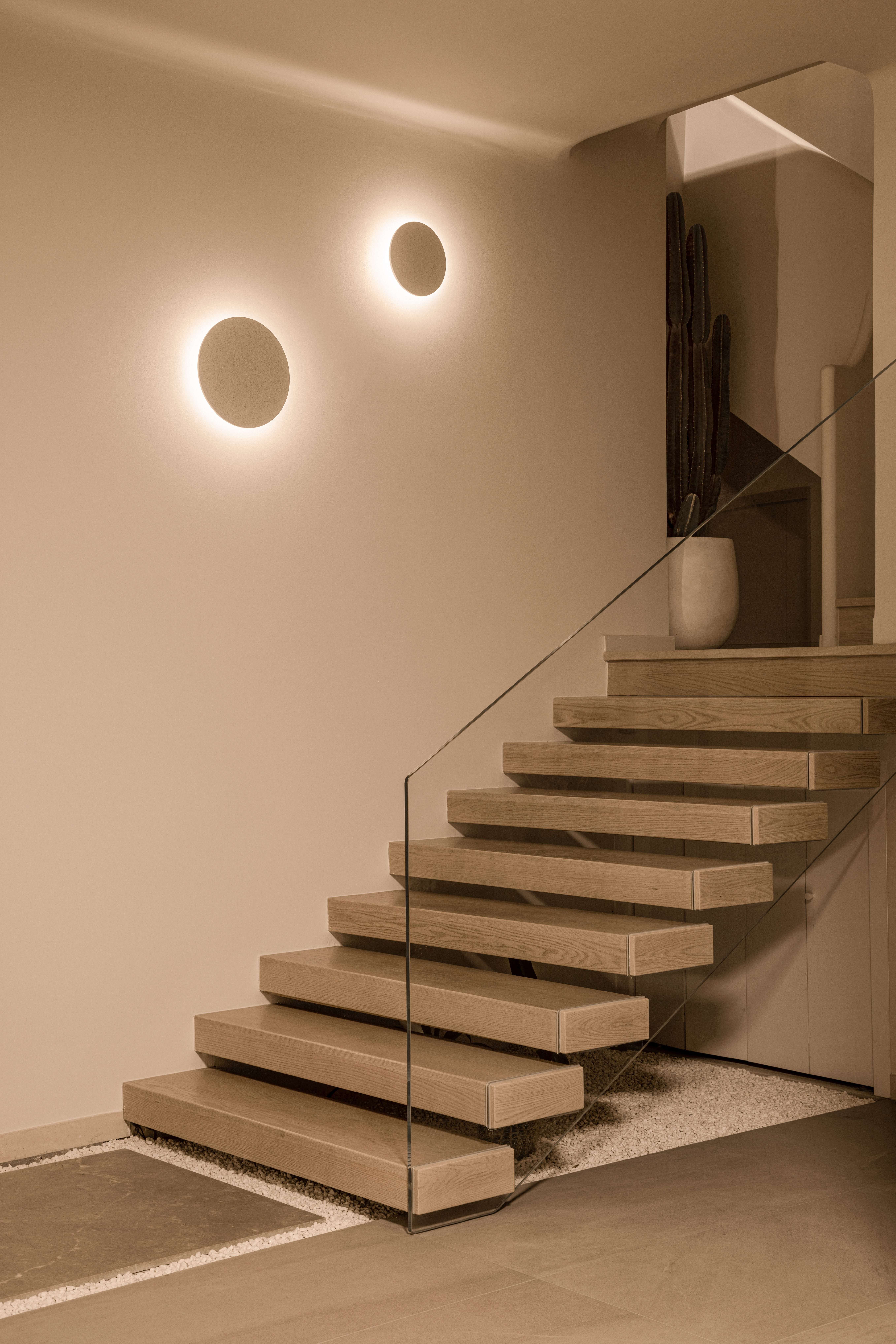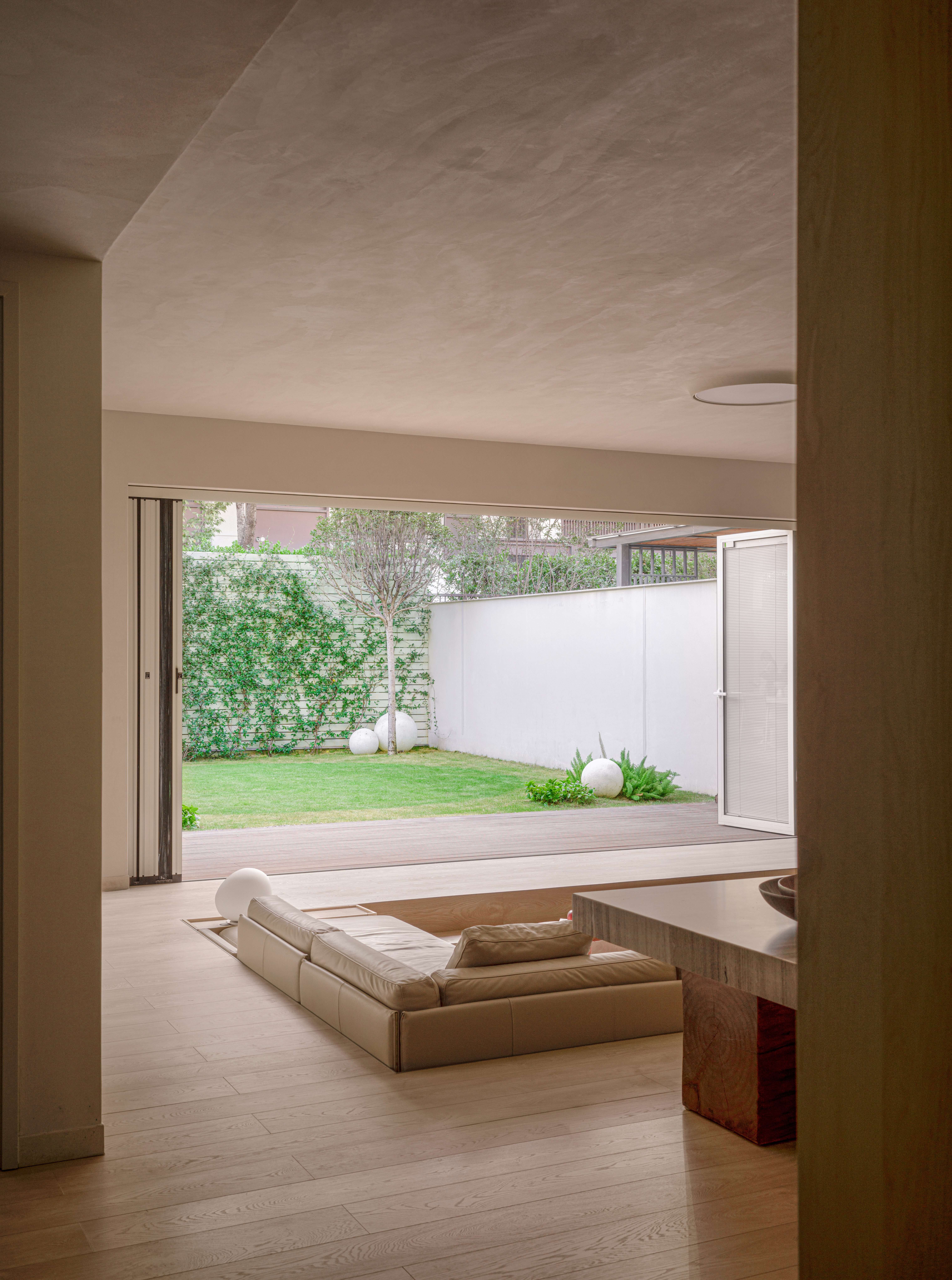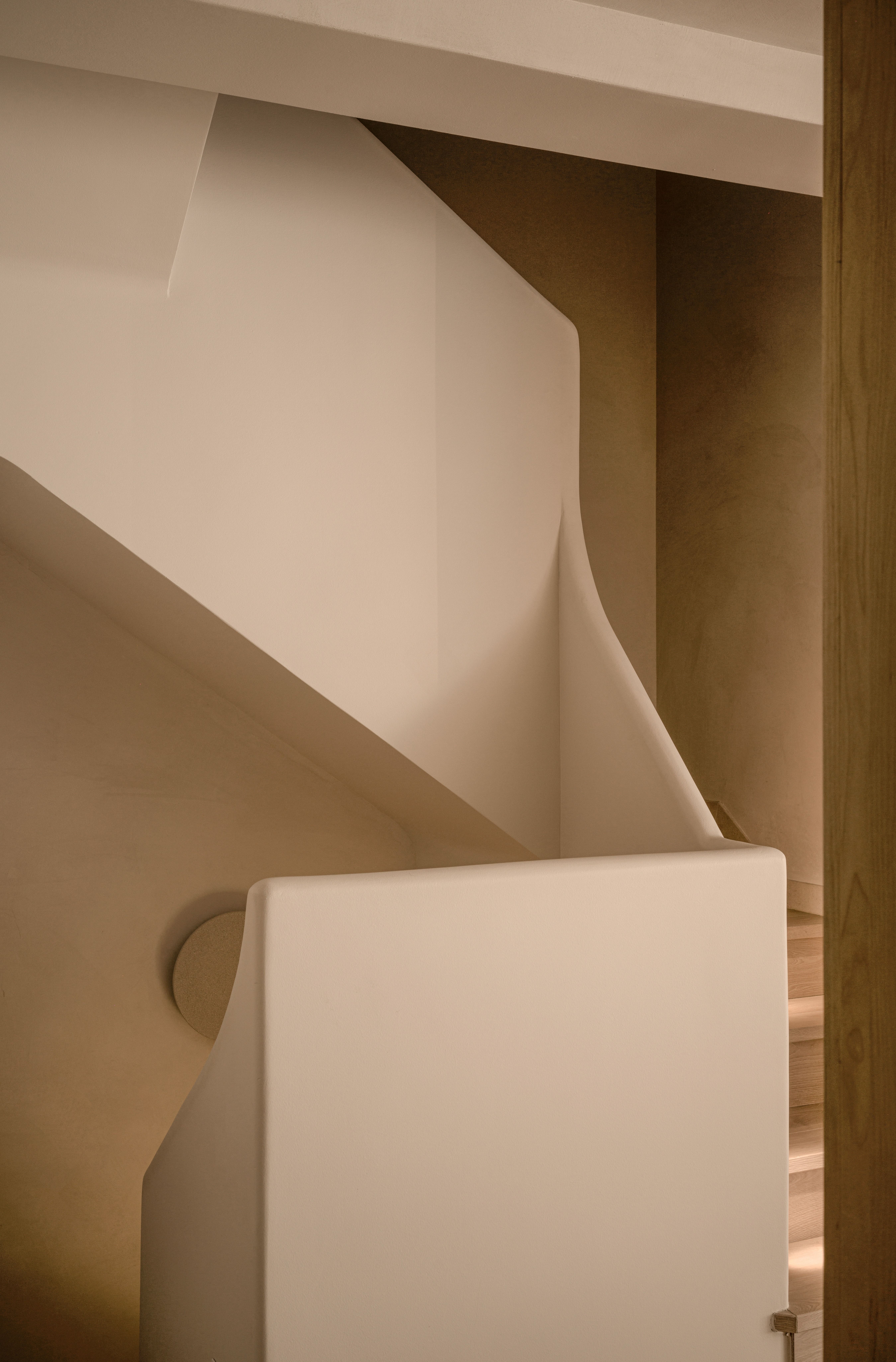 空间布局:从入户的第一眼开始,视觉焦点便在光的指引下顺着剧场,梯田式布局空间通透而充满层次地到达花园区域。利用向上攀爬的藤蔓以数量、体积、微运动的变化,转化为柔的坚韧,静的力量。为解决一层空间层高低矮的压抑感,我们将顶梁包裹起来拉通顶面,嵌入式顶灯和灯带腾出顶部空间,以开阔的横向视角减少纵向压迫感,下沉式会客厅将人围合的同时也为纵向空间创造更多层高。头排下沉式沙发休闲区模拟蹲下来与儿童交流,我们尽量把视点高度降低,仿佛父母希望传达给女儿们建立亲和的家庭关系、二排餐厅就餐、三排入户漫游。二层卧室更换原幕墙式小窗户为门窗栏杆一体系统,打开滑门让主卧室形成阳台式的灰色空间。将室外风景最大可能地纳入室内的同时,还让每个空间都和儿童奔跑的花园剧场产生了亲密的围合关系。唤起对自然、对外界的亲昵本能,以及空间和家人之间关注与被关注的关系。将原本两间独立的儿童房连通为一间,让姐妹俩再日复一日的光阴中互帮互助,相互滋养,真正做到「同生共长」,在设计中注入家文化的表现和传承,决定将花园作为最重要阶层区域的瞬间,便决定了这所房子将承载,孩子健康成长和家人互相关注的使命,潜移默化给予女儿成长养分。
