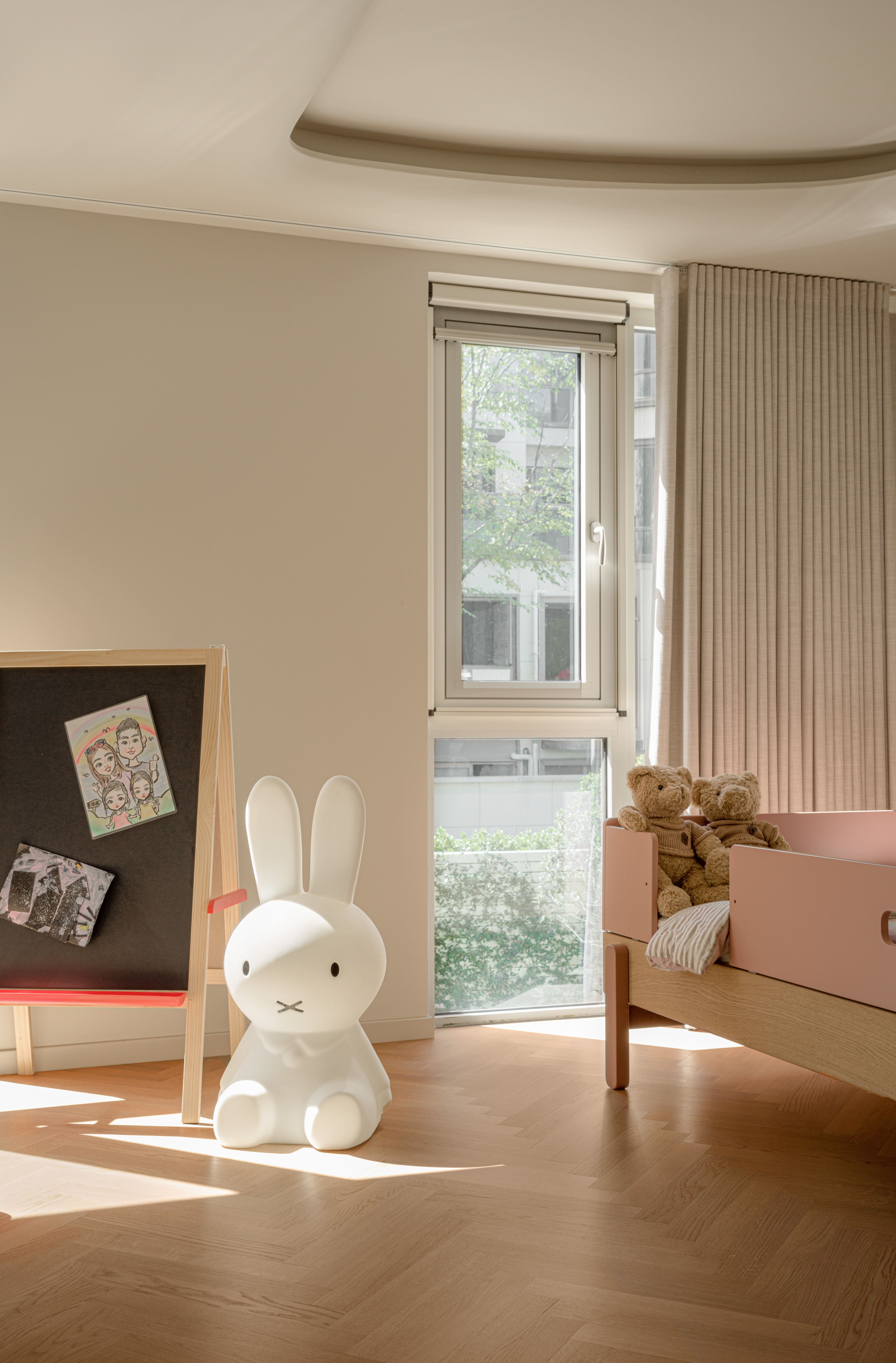 项目定位:“既然欣喜相逢、亲昵相伴,我们就一起成长,勇敢走向未来的每一个日子”。屋主是一对年轻夫妻,拥有两个可爱的女儿,年纪相差不到2岁,愿这座房子能成为她们当下乃至将来都感受到治愈的能量场所,山点水决定为她们打造一座「同生共长」的家宅乐园。