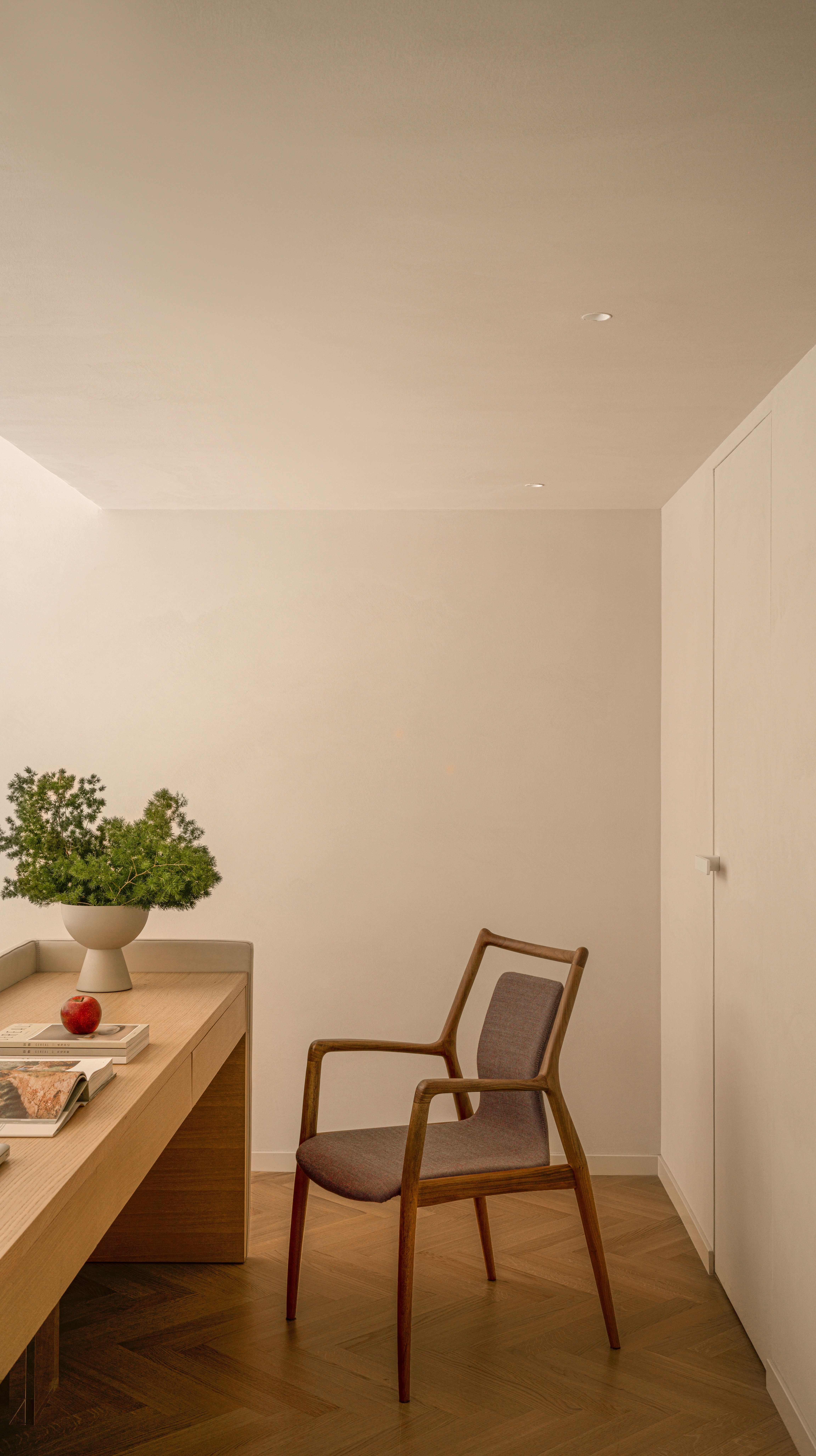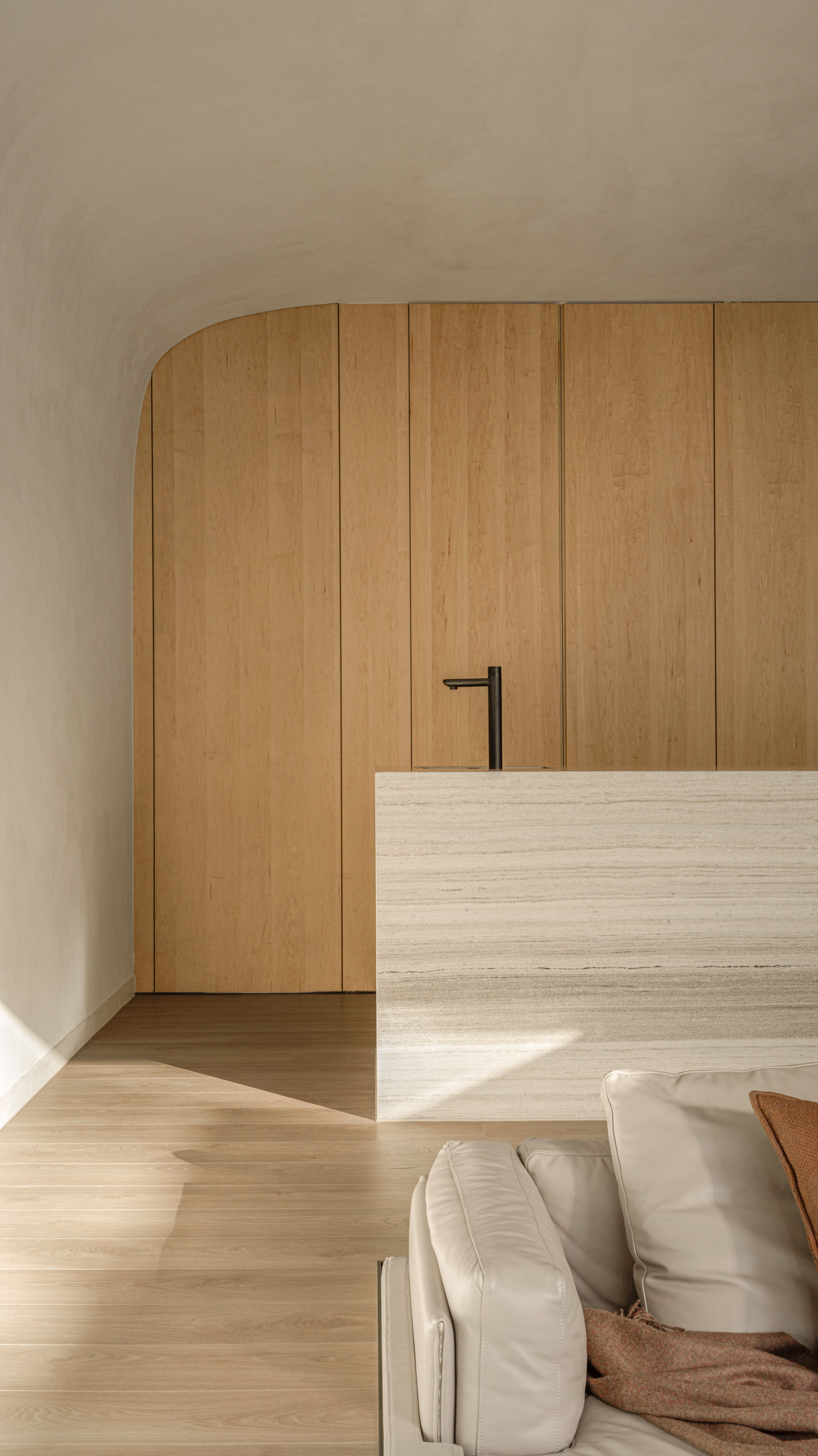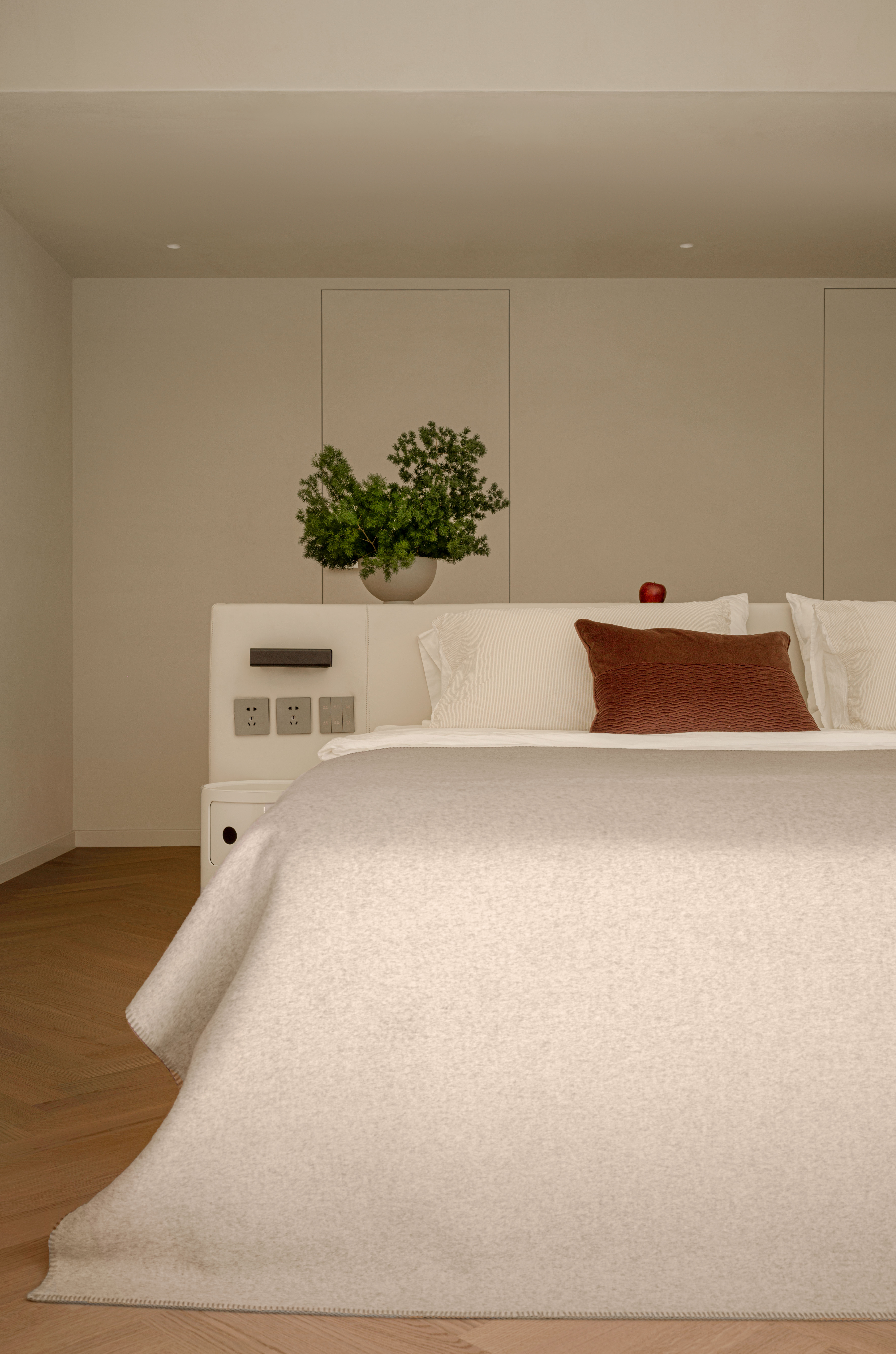 设计选材:室内整体铺设温柔简洁,随性的基调,木与石的材质,特有的生长纹理,就像毛孔,呼吸着,每一寸肌肤都能感受到空间带来的柔软与舒适。