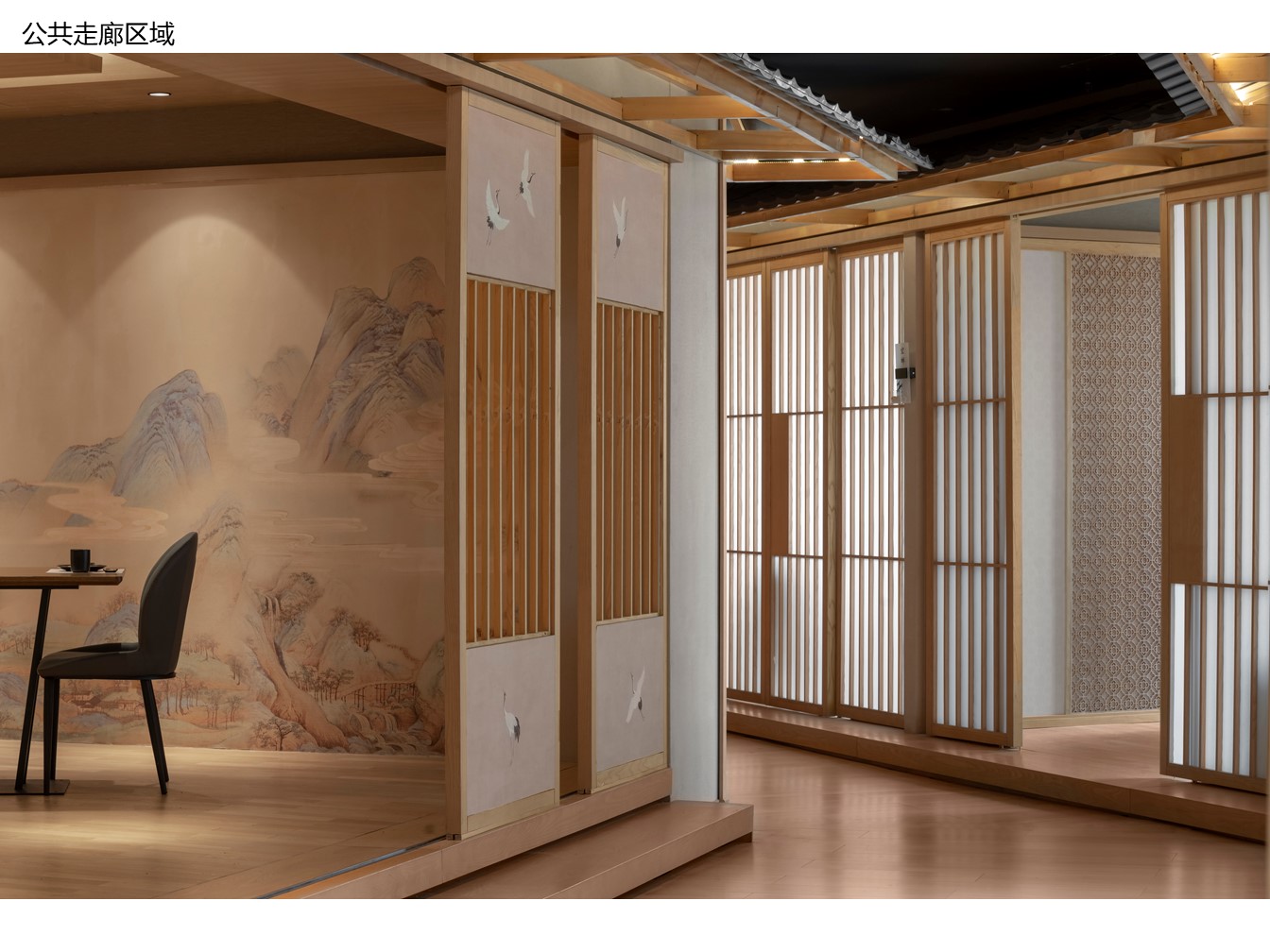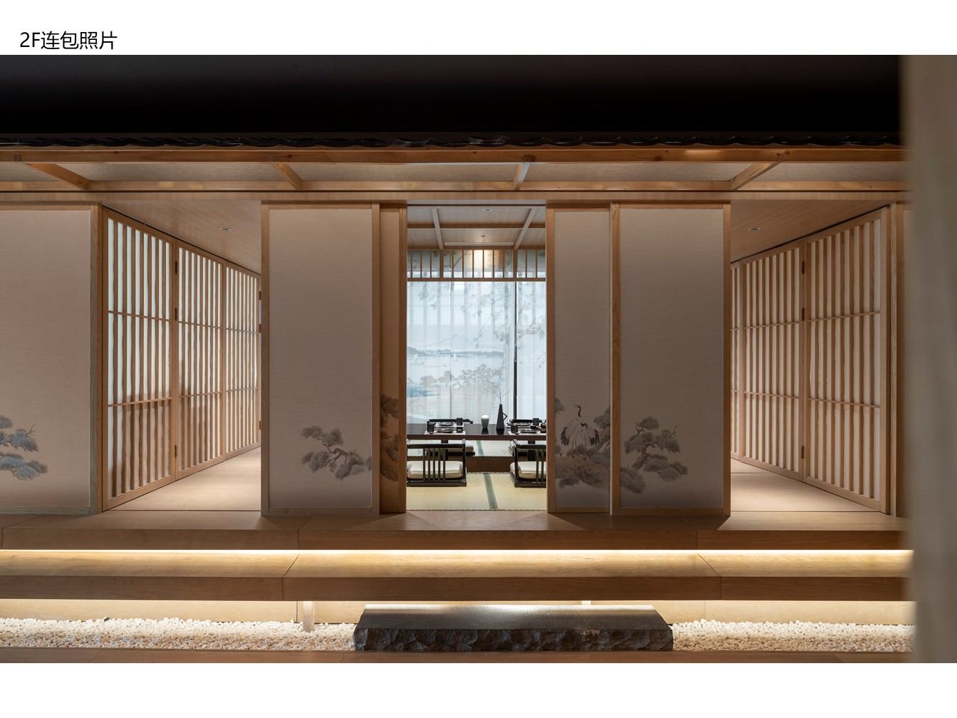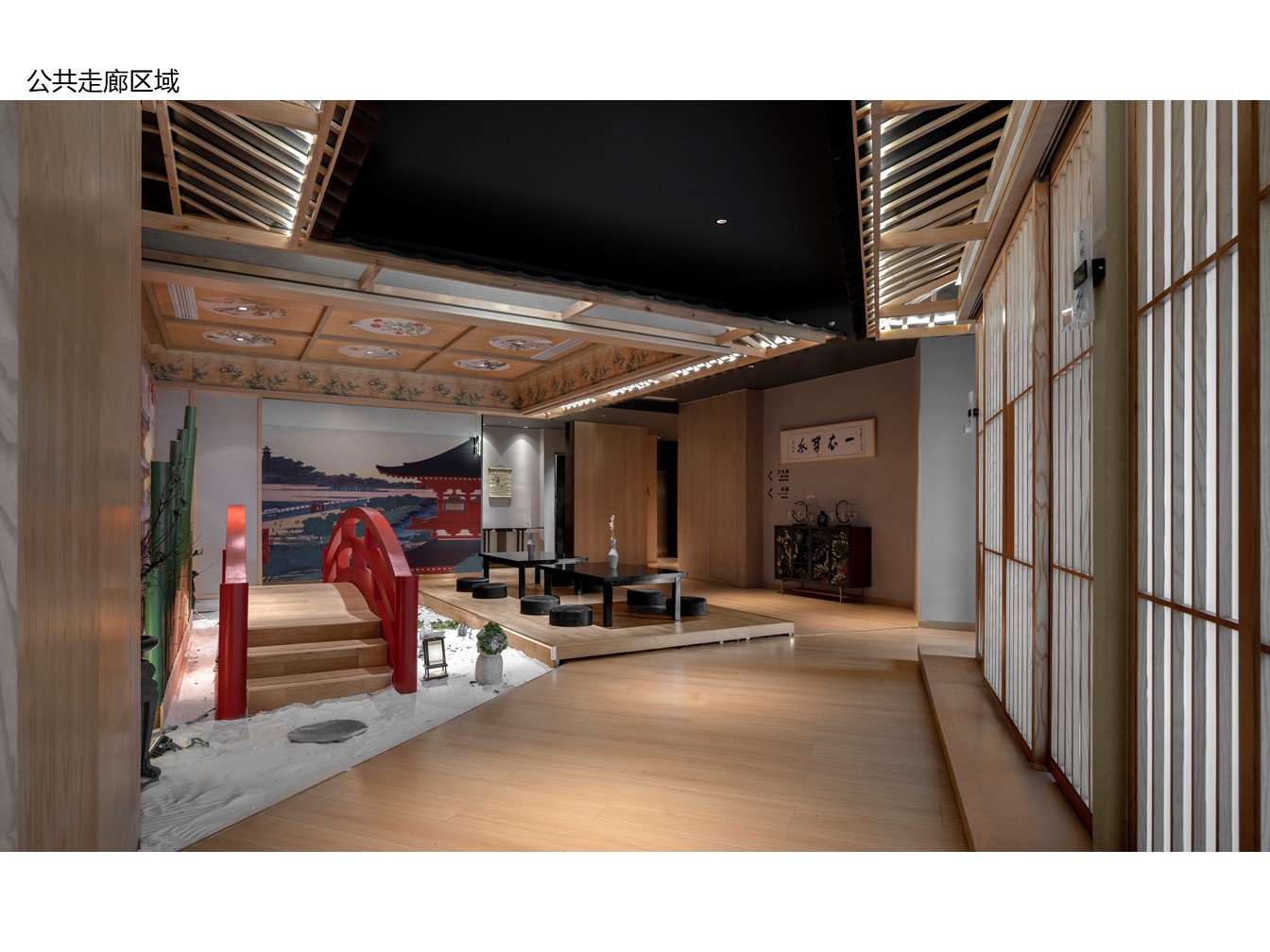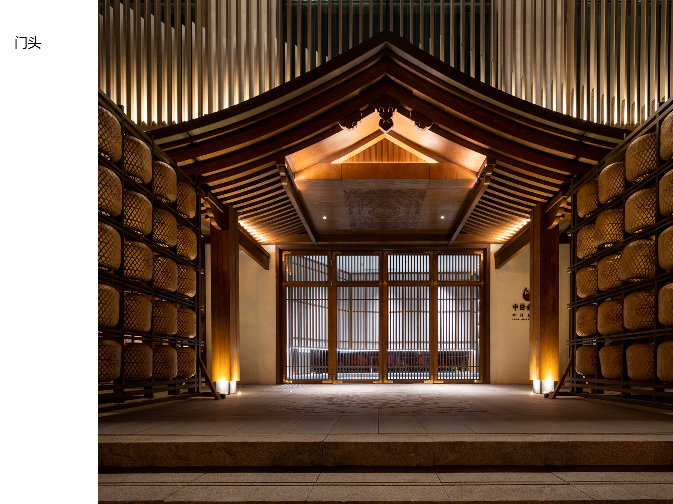 空间意境:为了体现中日文化的融合,建筑外观选择了中国传统唐宋风格与日式相结合的设计,尝试在景观、装饰、器物等各方面挖掘两国文化特质,呈现出一种全新的风貌。项目硬装及室内视觉画面会贯穿使用宝相花元素,以此增添整体的传统古韵感。在建筑立面的设计上,项目整体样式采用了中国传统建筑形式,用木、瓦、土坯墙等材料(仿)作为整体立面效果。在正立面的设计上,模仿了汉至北宋时期惯用的直棂窗做法形成整体竖向格栅,体现了中国传统建筑的特色。为了突出日式风格并兼顾南宋建筑的风格改变,局部使用了南宋时期形成的方格子木窗作为装饰,进一步强化了建筑的文化内涵。