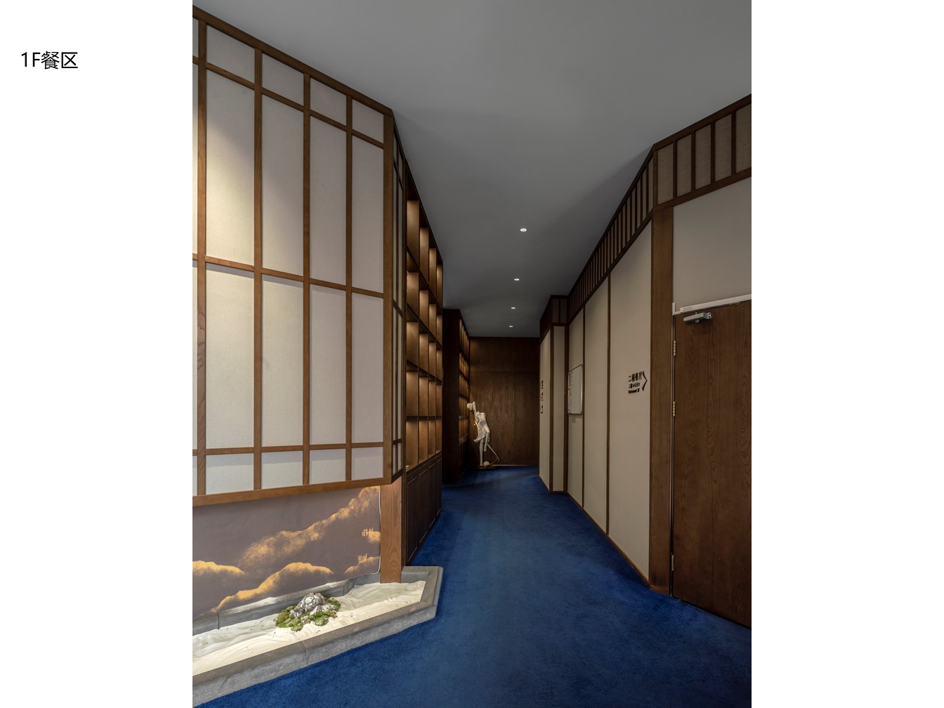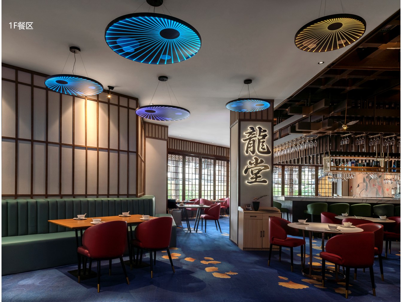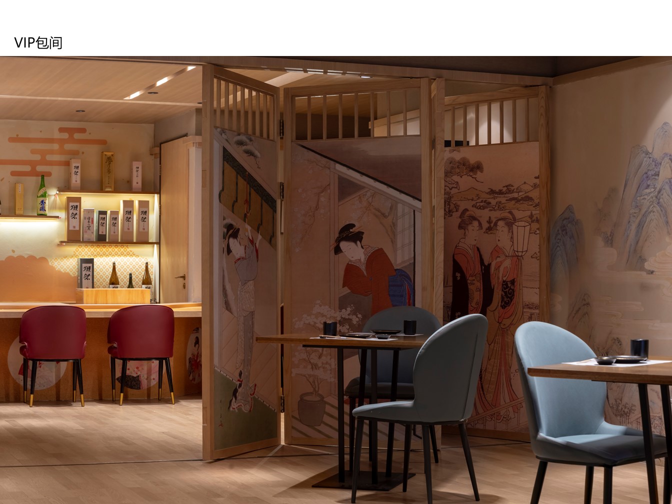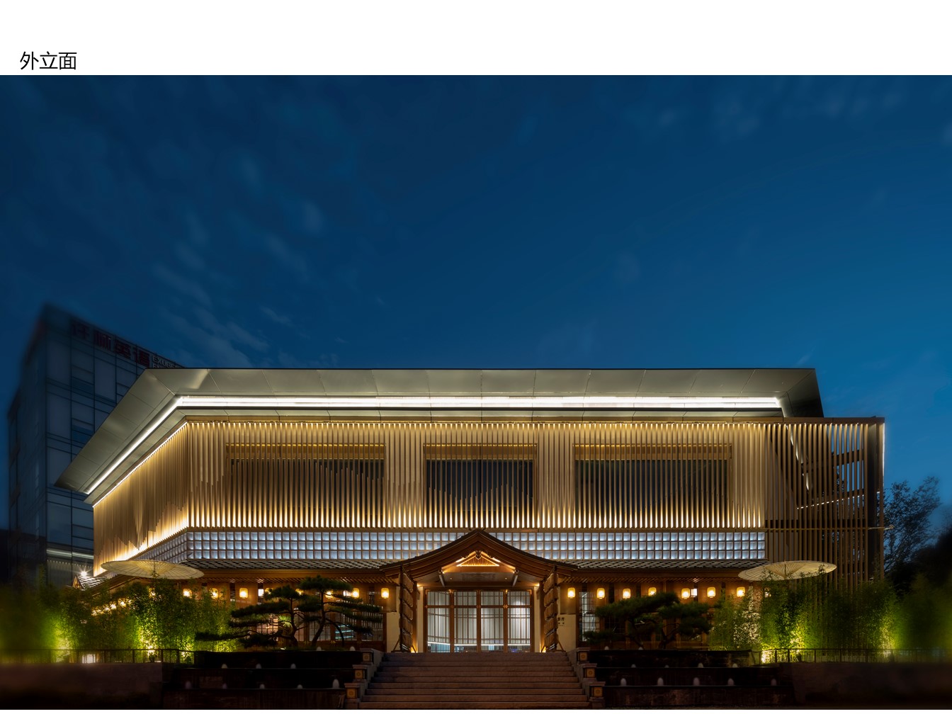 空间意境:为了体现中日文化的融合,建筑外观选择了中国传统唐宋风格与日式相结合的设计,尝试在景观、装饰、器物等各方面挖掘两国文化特质,呈现出一种全新的风貌。项目硬装及室内视觉画面会贯穿使用宝相花元素,以此增添整体的传统古韵感。在建筑立面的设计上,项目整体样式采用了中国传统建筑形式,用木、瓦、土坯墙等材料(仿)作为整体立面效果。在正立面的设计上,模仿了汉至北宋时期惯用的直棂窗做法形成整体竖向格栅,体现了中国传统建筑的特色。为了突出日式风格并兼顾南宋建筑的风格改变,局部使用了南宋时期形成的方格子木窗作为装饰,进一步强化了建筑的文化内涵。