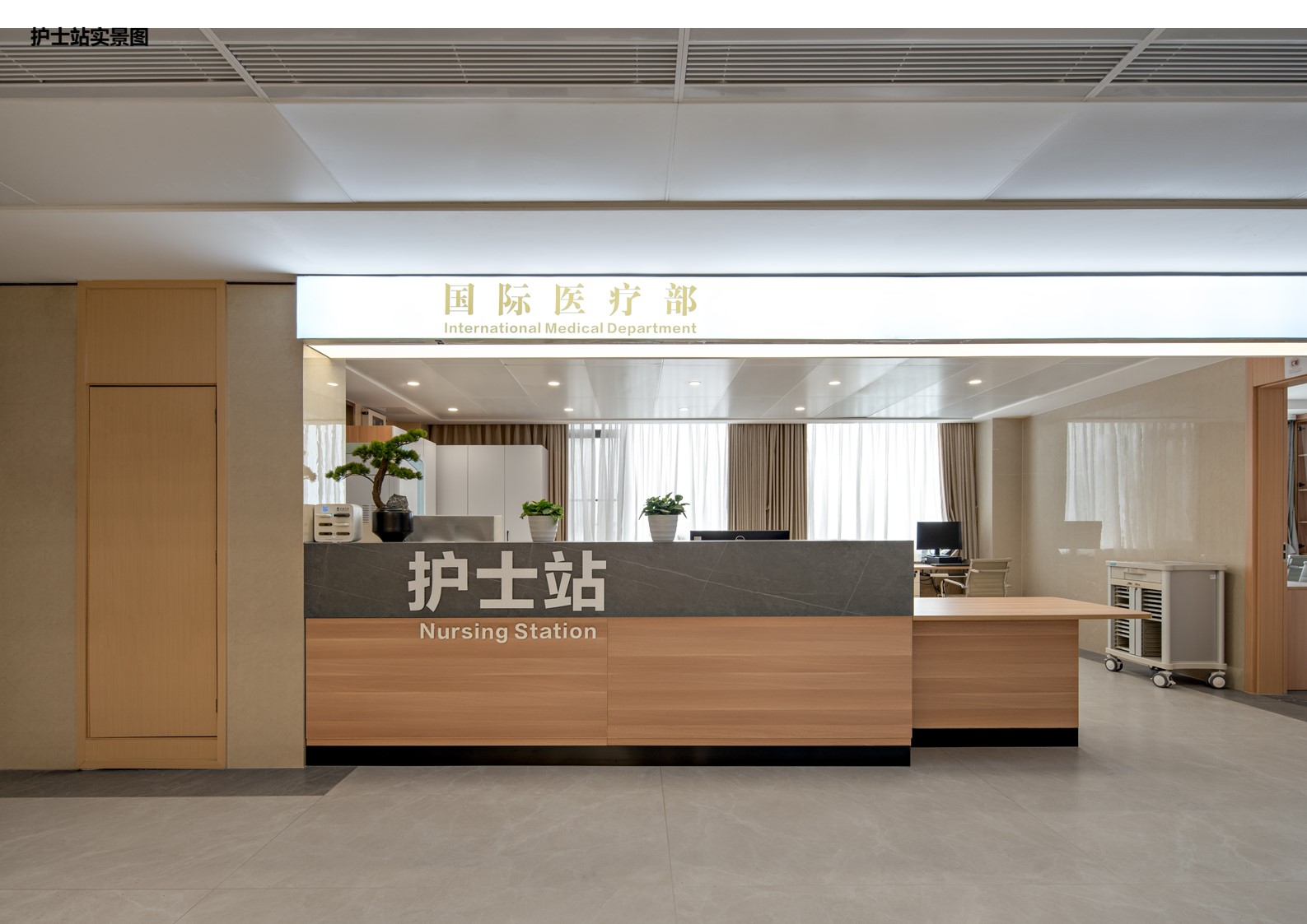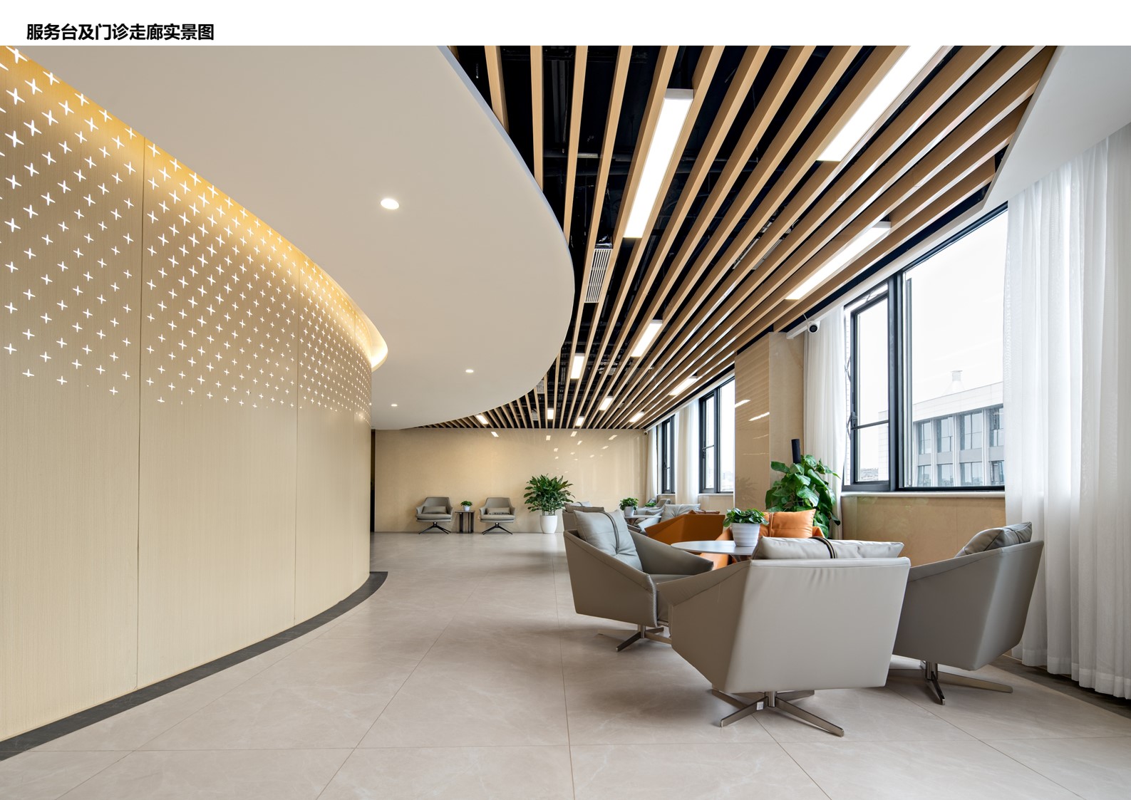 设计选材:项目运用环保舒适、节能化、耐久性好的材料,体现人本关怀,处处细节体现国际化品质和精细化的设计,达到了去医院化的效果。天花设计上以天花以轻钢龙骨石膏板、斜角暗架钢质天花板铝方通等材料吊顶,兼顾吸音、防霉、质轻、易清洁、易切割。小型的公区等候区,采用木纹铝单板,并进行穿孔设计。其余走道区域, 采用模数化的钢制板、米色及木纹色彩穿插搭配。地面材料以PVC地板、锁扣式SPC木纹地板为主,考虑抗菌和抗酸碱能力,以达到无菌的要求,避免医院内交叉感染的发生,同时要求地材能有效降低噪音并防滑。
