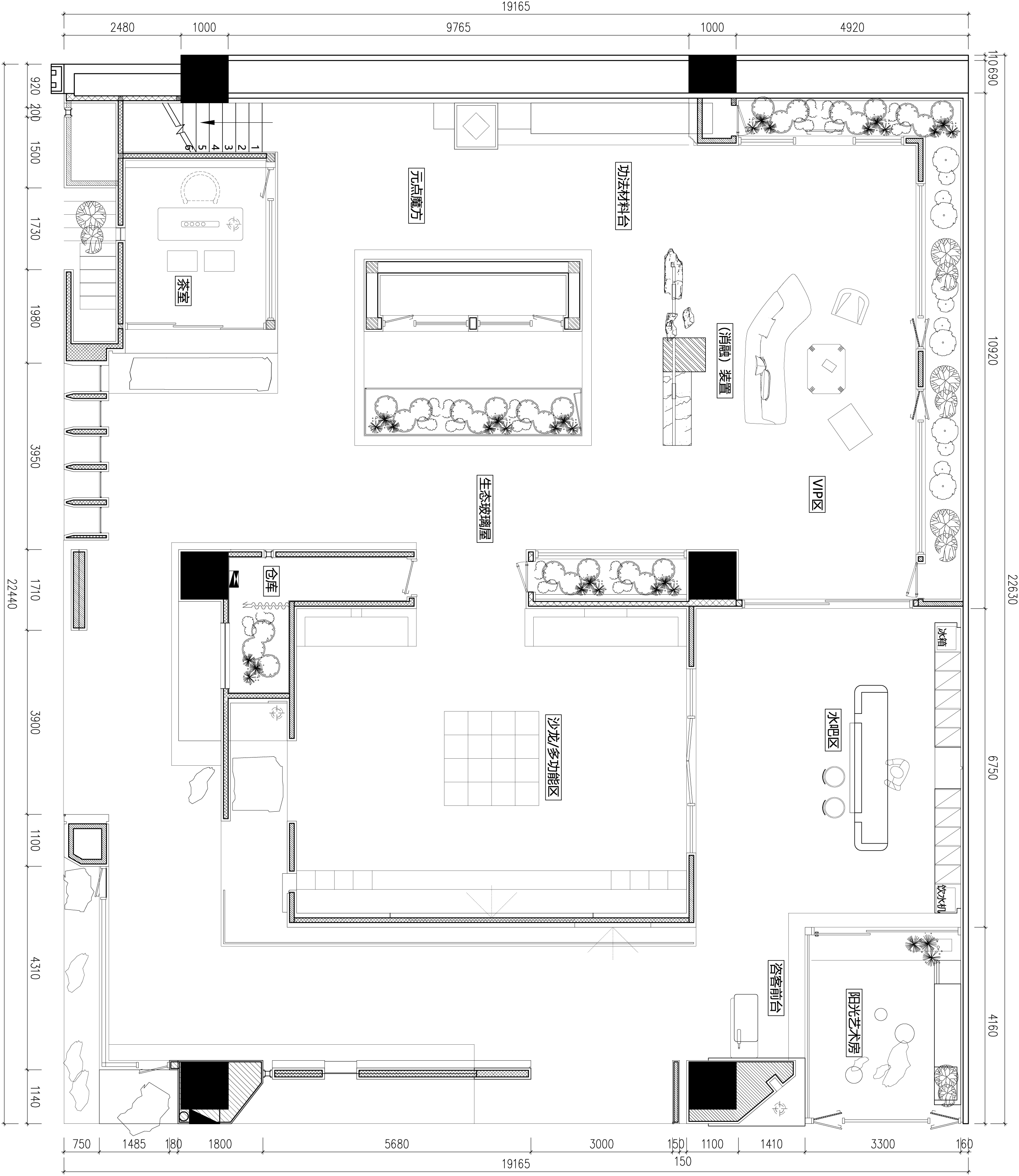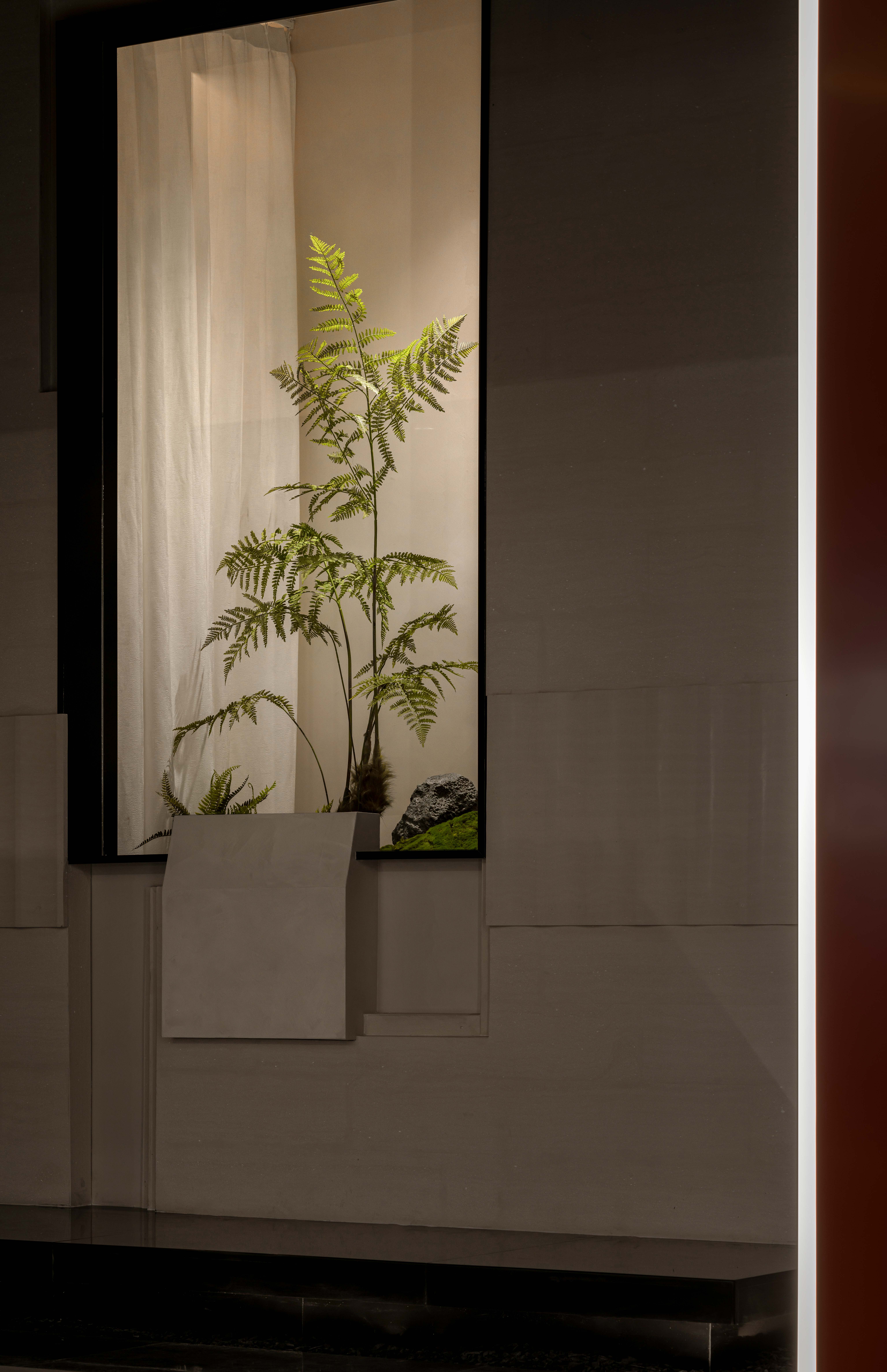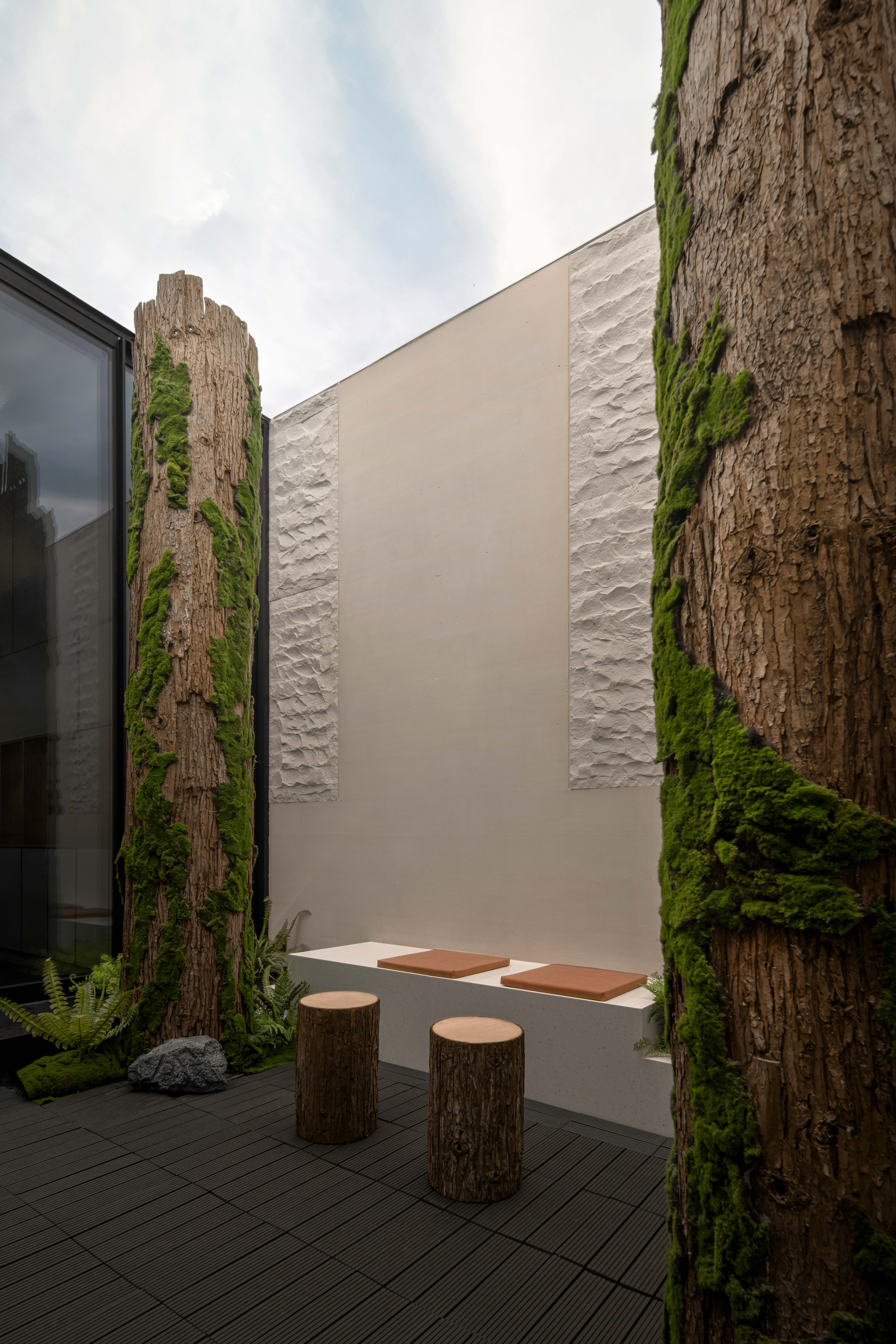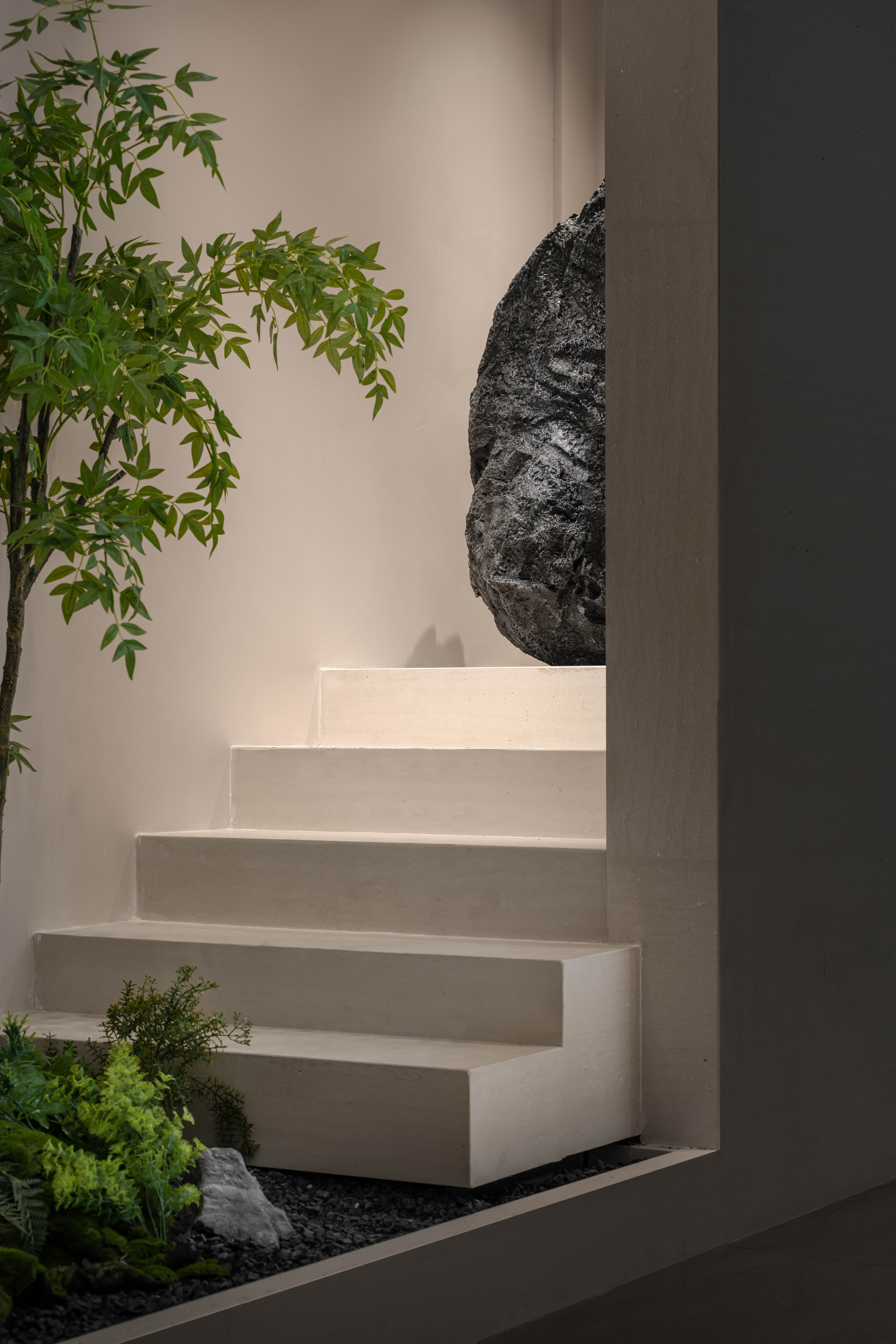 生态阳光房:空间是显性的品牌叙述,阳光房作为橱窗形式展示,与展厅门面形成内外链接的空间体块,亦是来访者与品牌建立深链接的核心区域之一。舍弃同质化阳光房的设计模式,而是通过模拟“自然丛林”的场景,淡化商业感,营造更加轻松的空间栖息地,引导着来访者逐步深入品牌体验,产生共鸣。