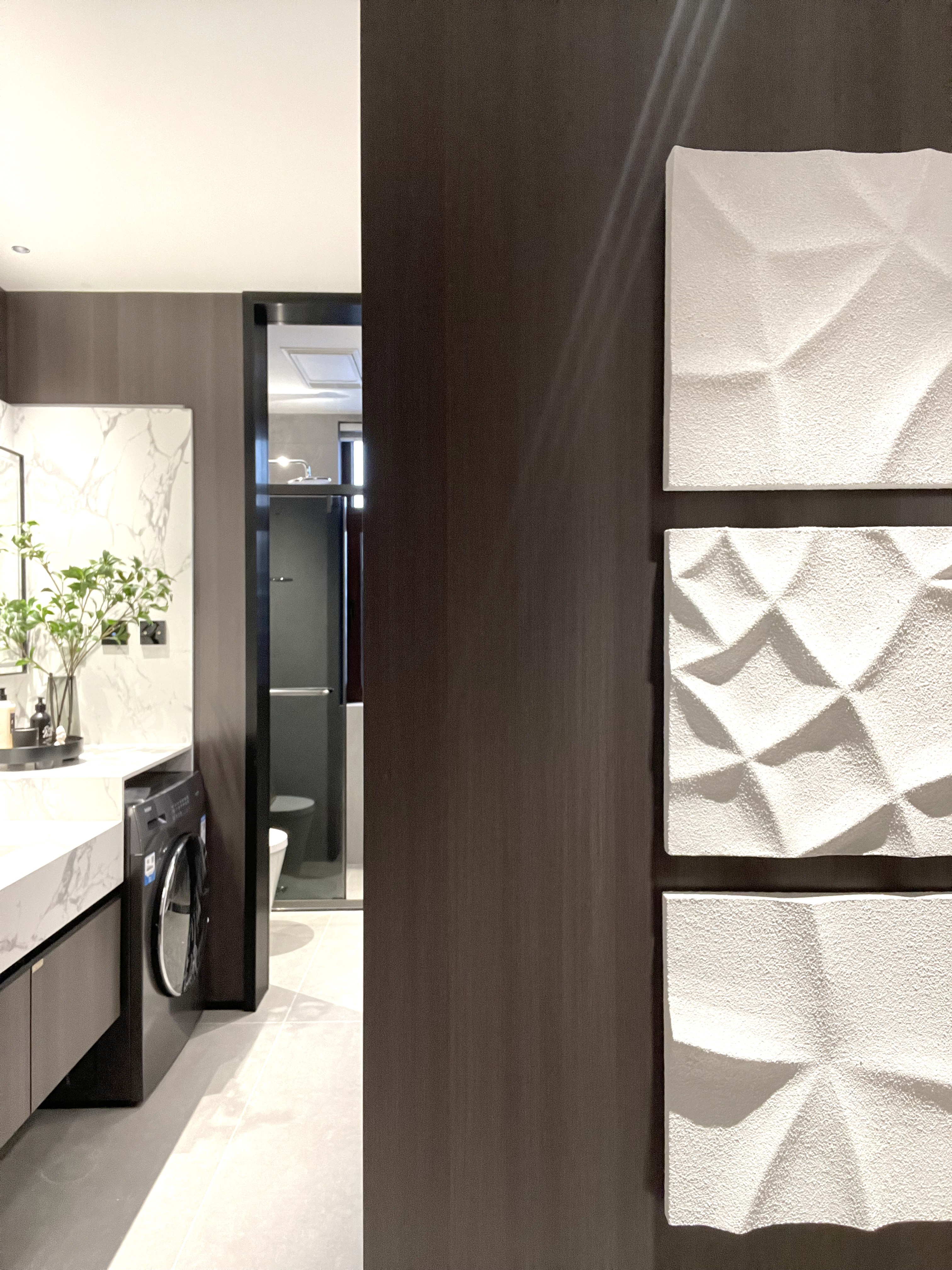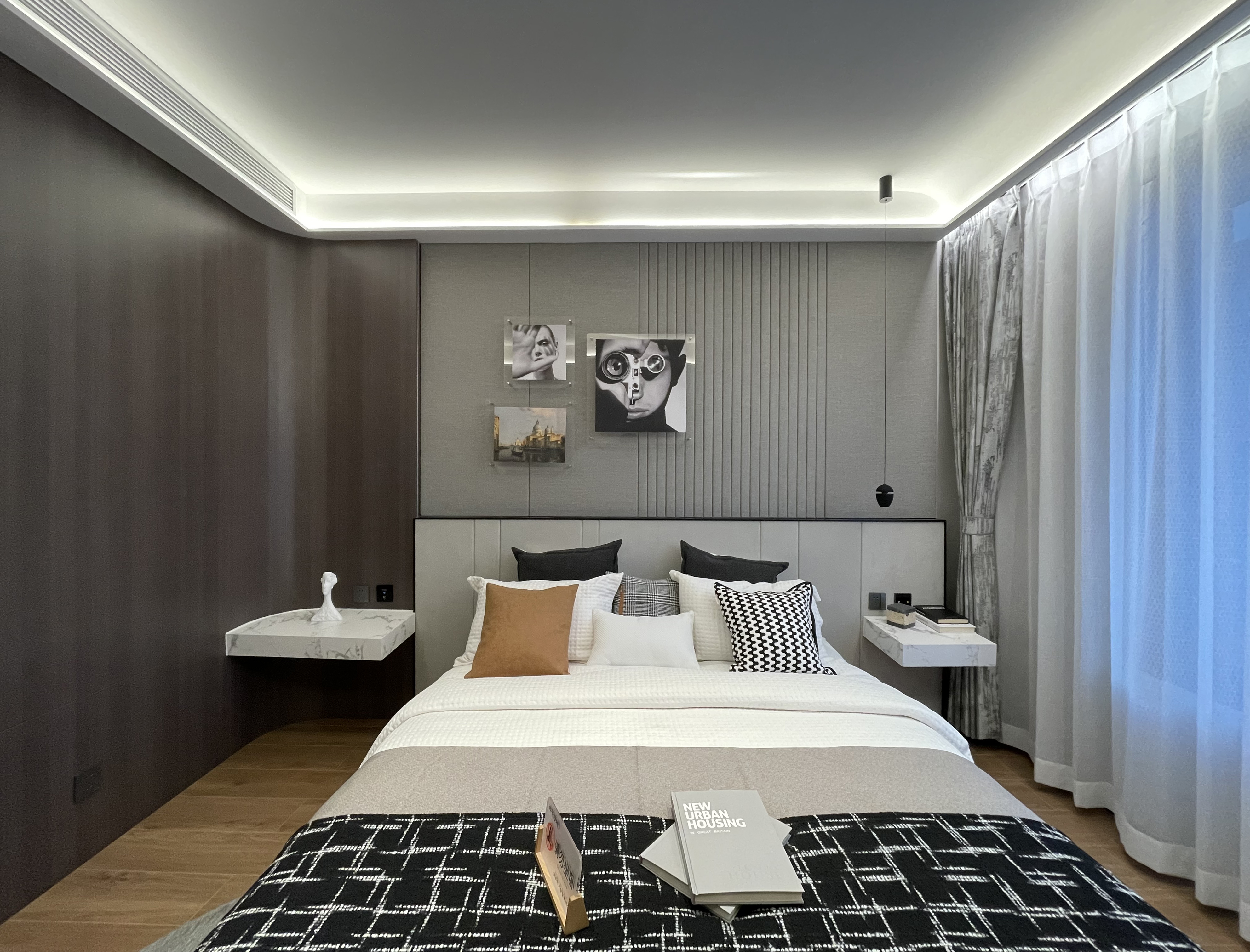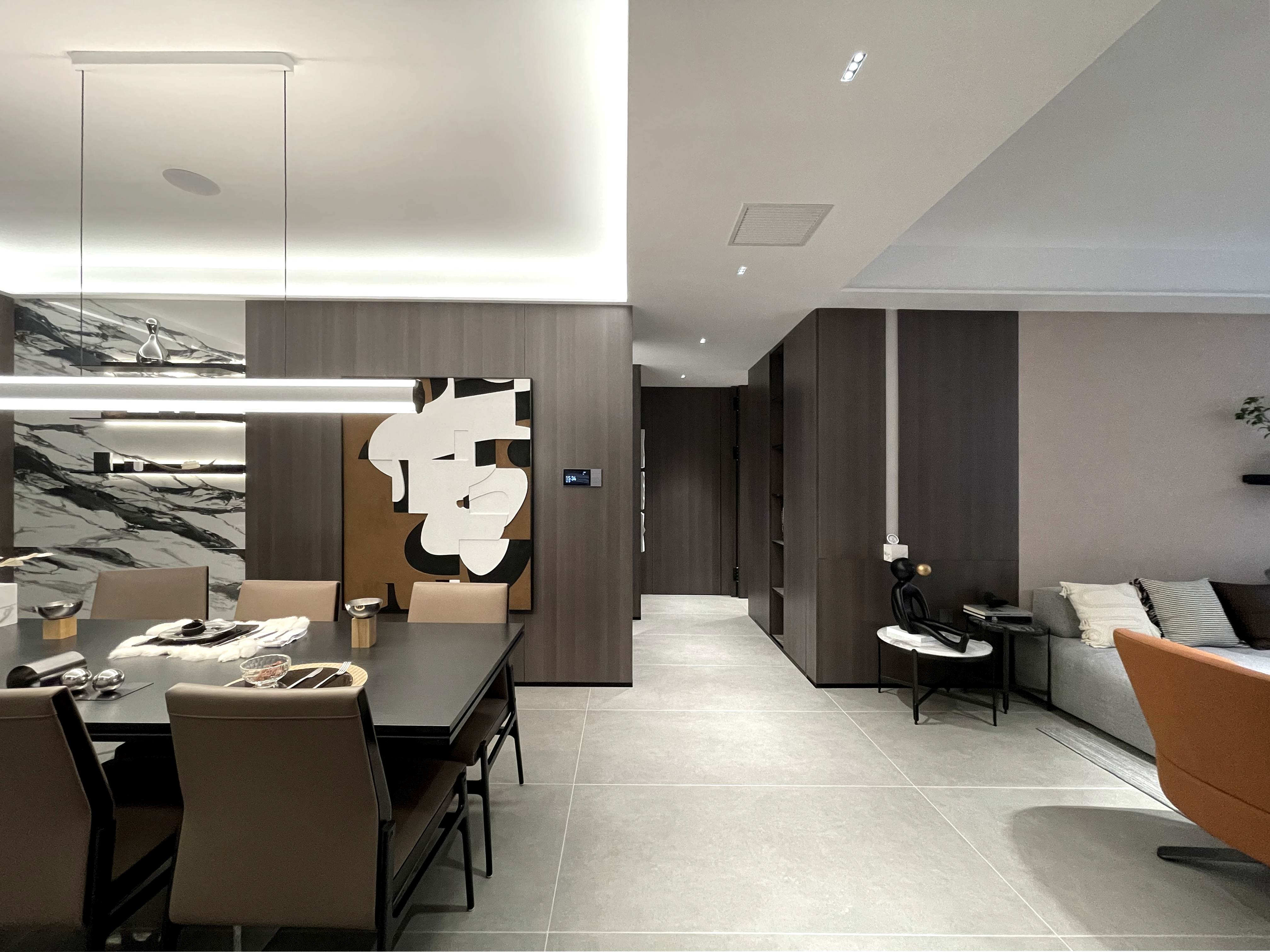 实木与岩板结合,利用壁布柔软的特性,体现了空间的质感。
