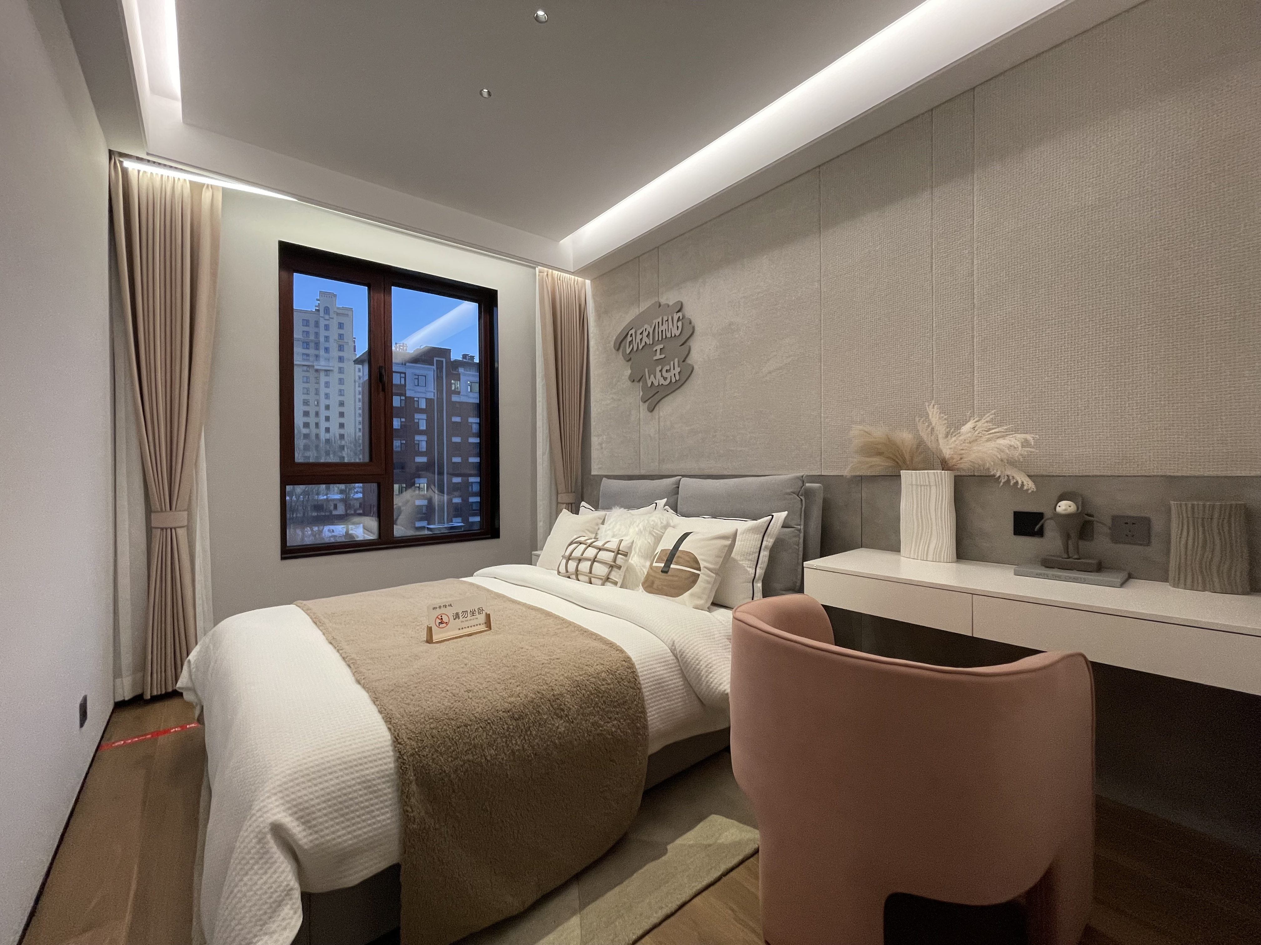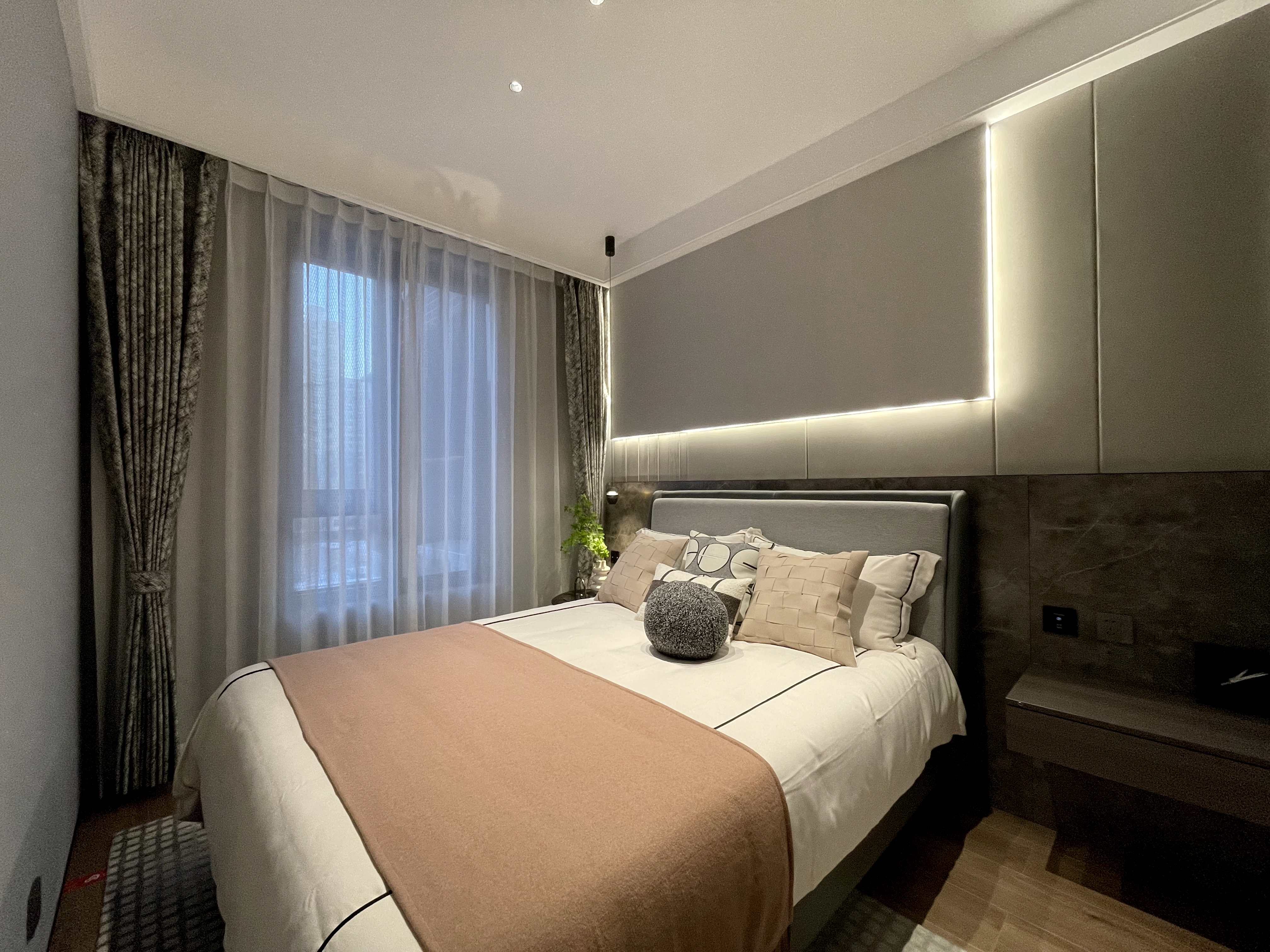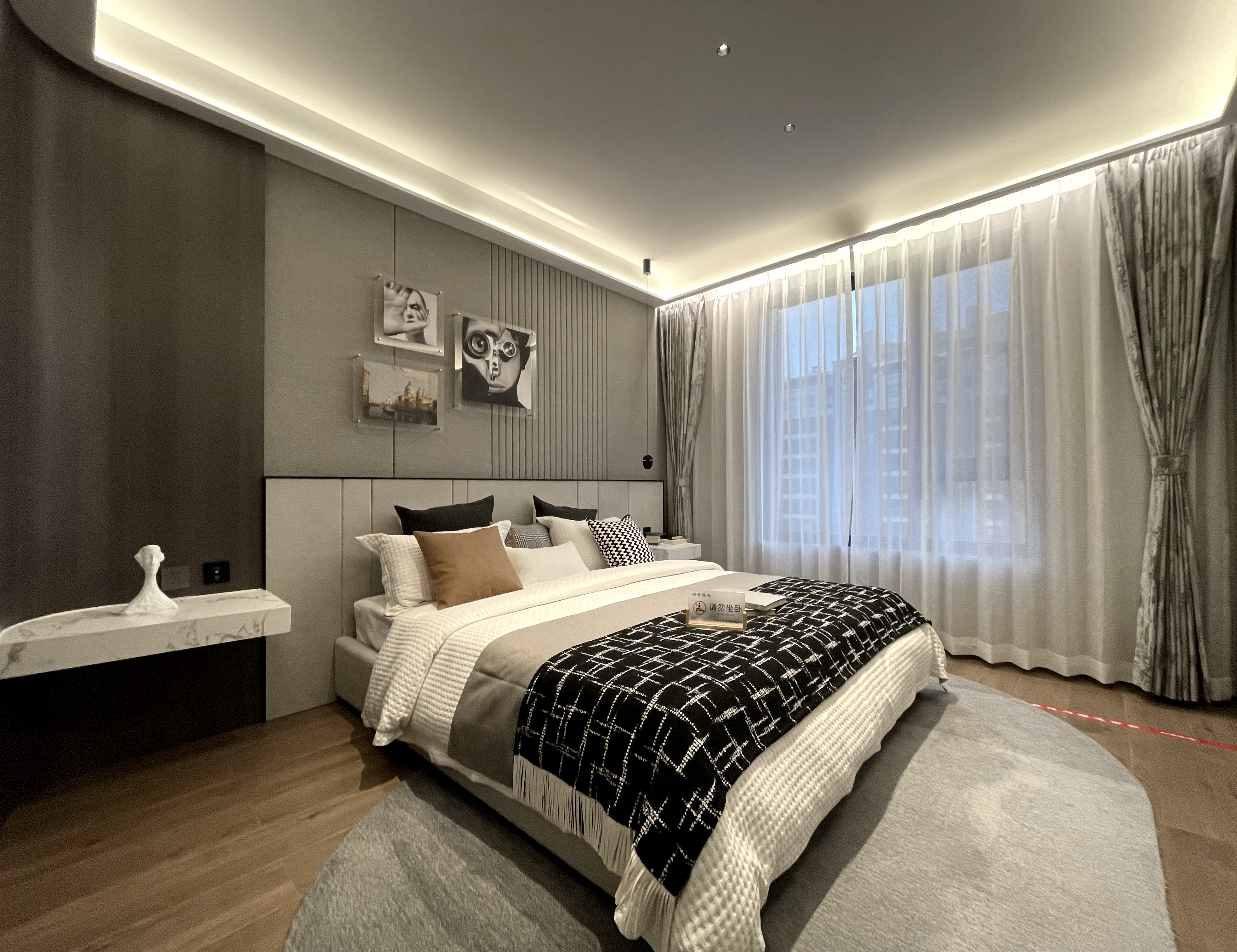实木与岩板结合,利用壁布柔软的特性,体现了空间的质感。