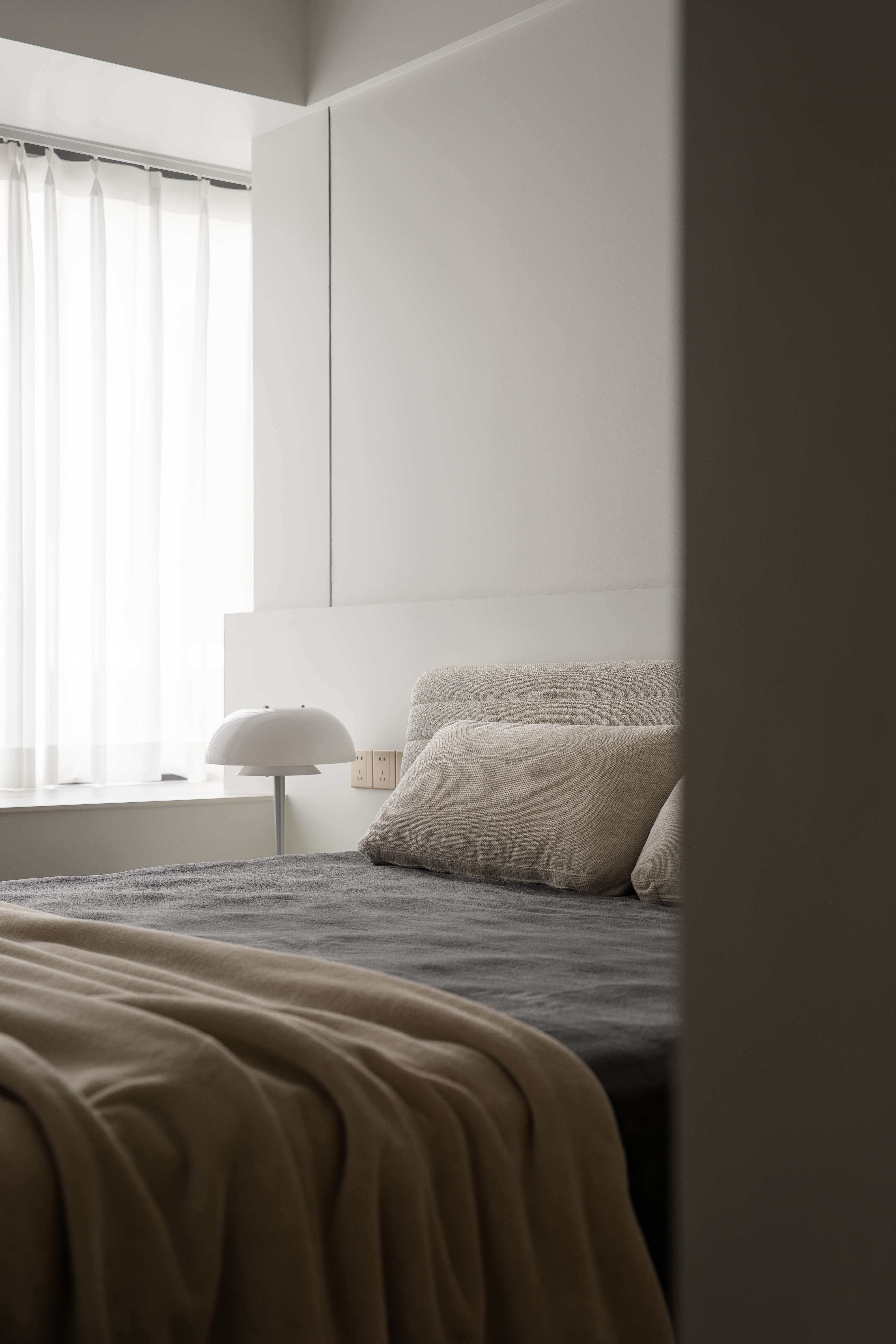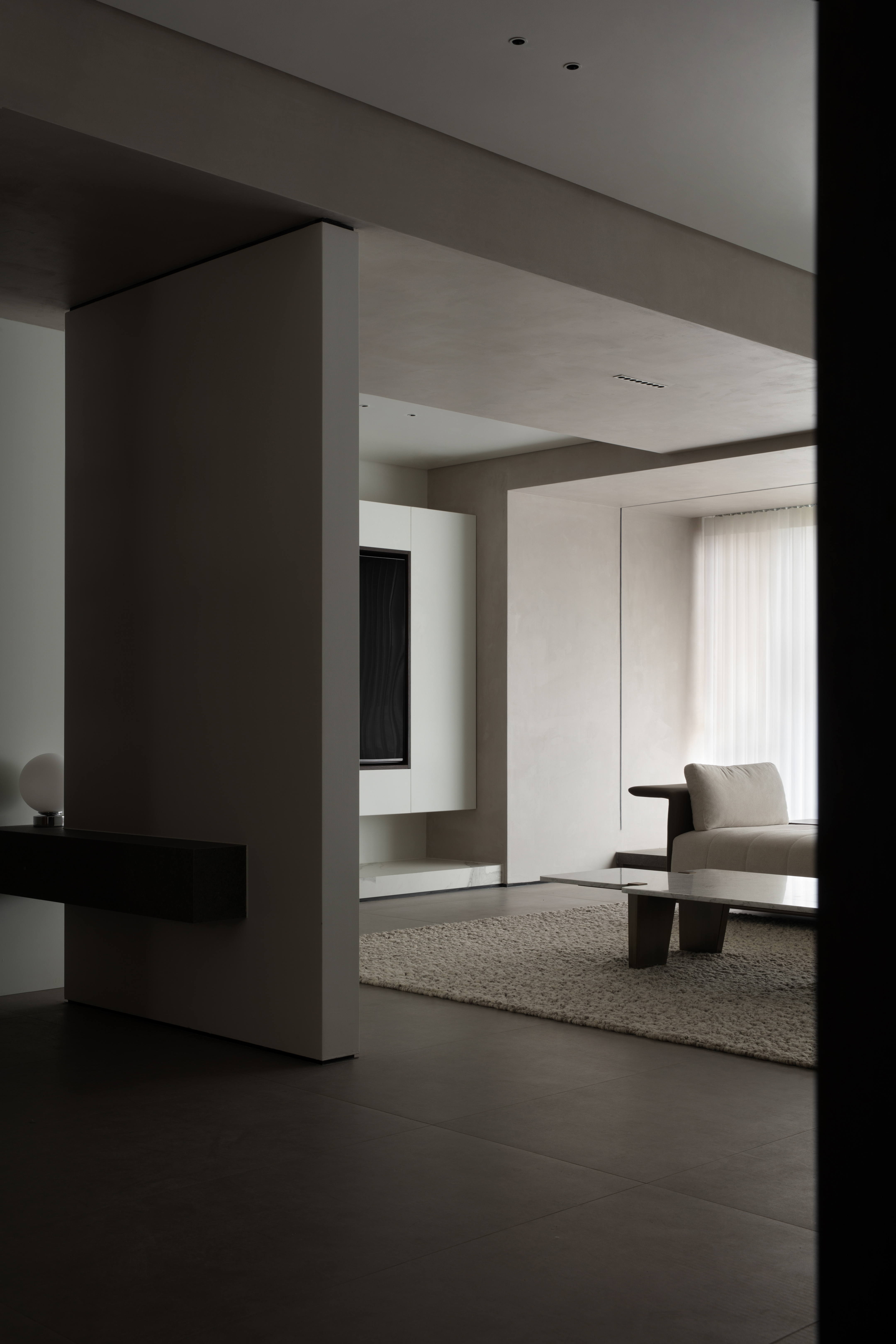阳光透过建筑室外的窗户洒进室内,光影倾泻在细腻的涂料墙面上,光影之间的转变显得层次分明,阴影和光斑随着时间而流动,居住者一进入此区域即可感受到明亮舒适的氛围。