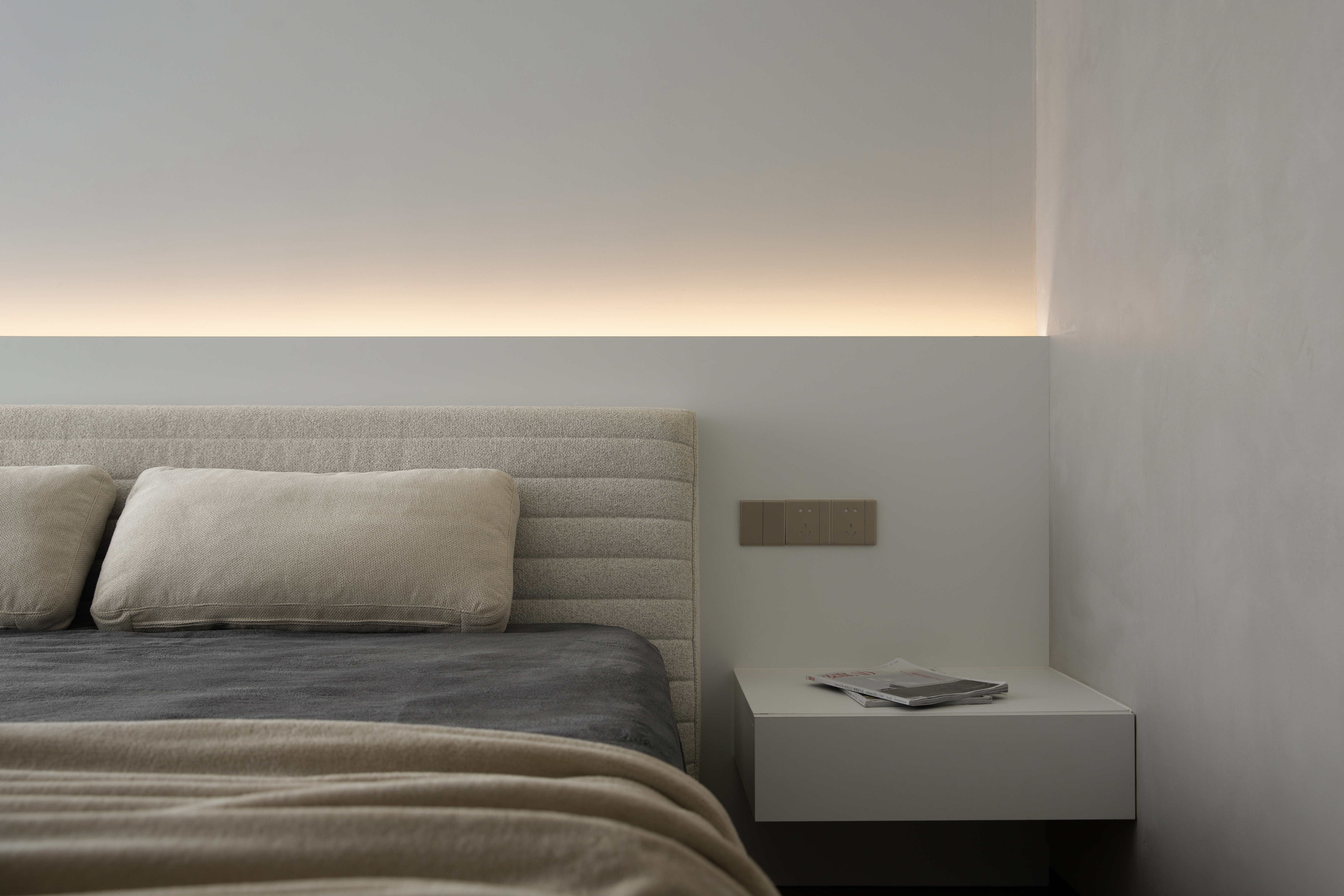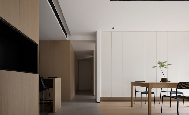 设计选材:整体案例选择质朴哑光质感的材质来营造低调内敛的空间形态。极窄黑色铝合金扫脚的运用提升扫脚本身的精致度,拉伸墙面的视觉高度同时让层高也得到了视觉和感受的升高。