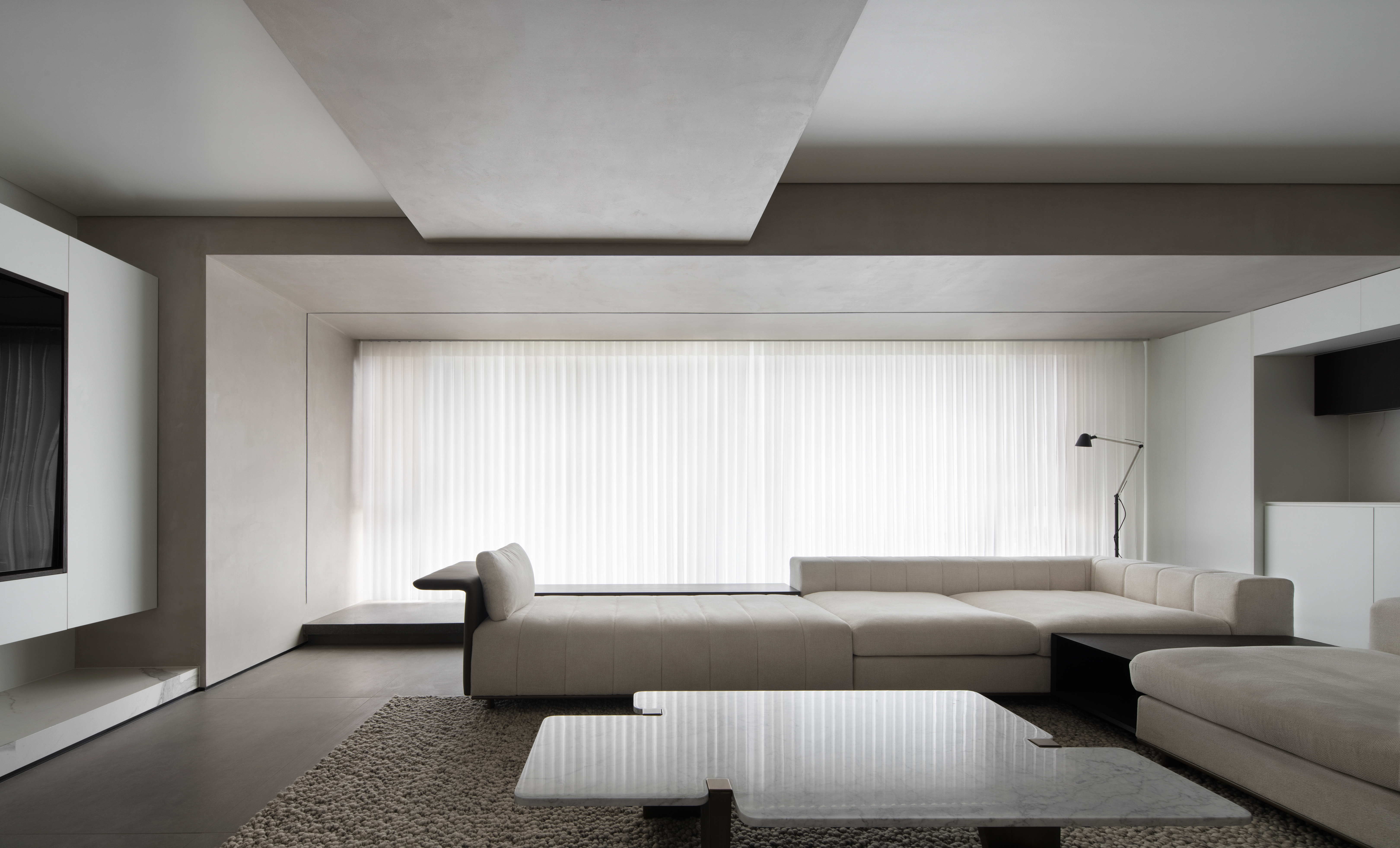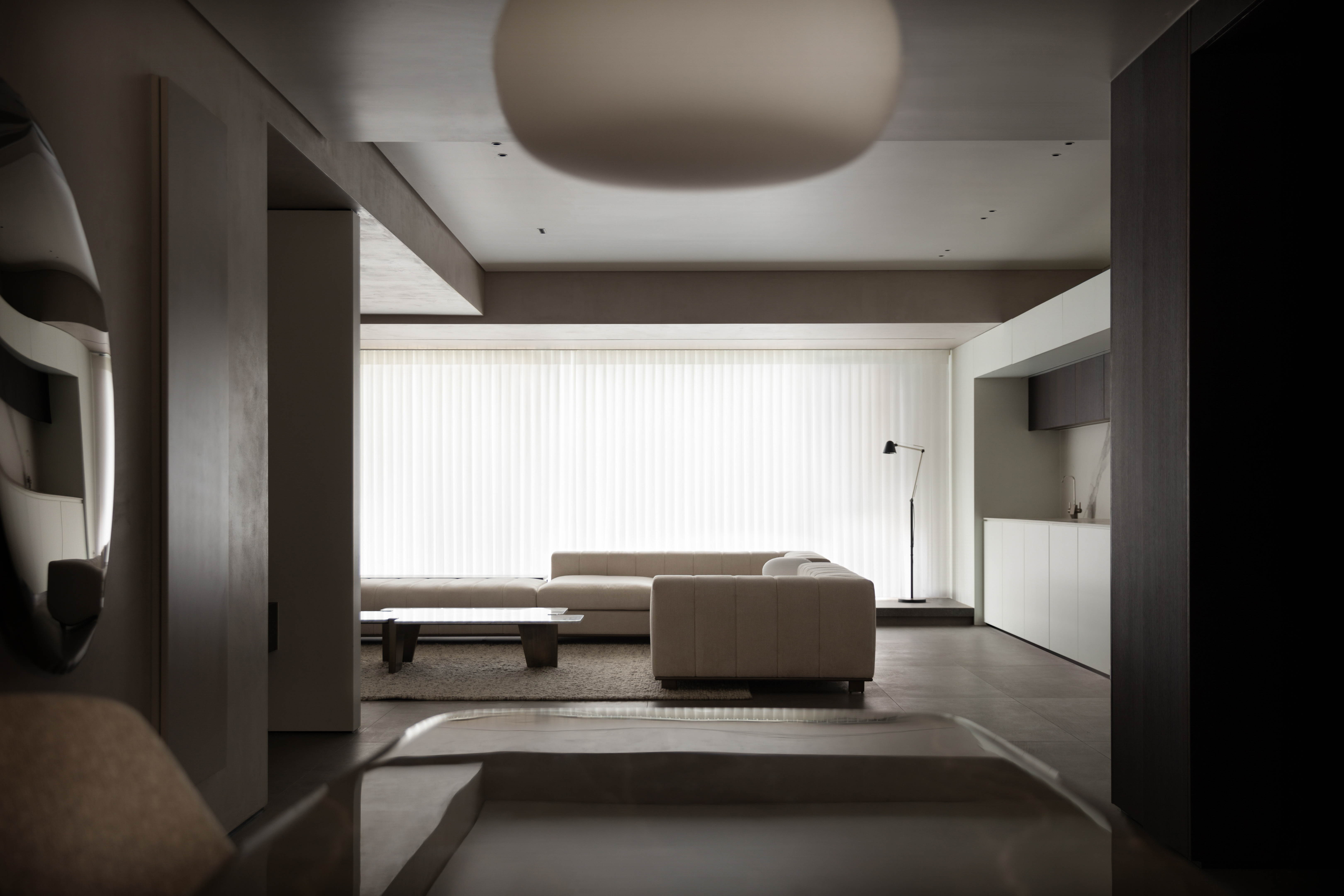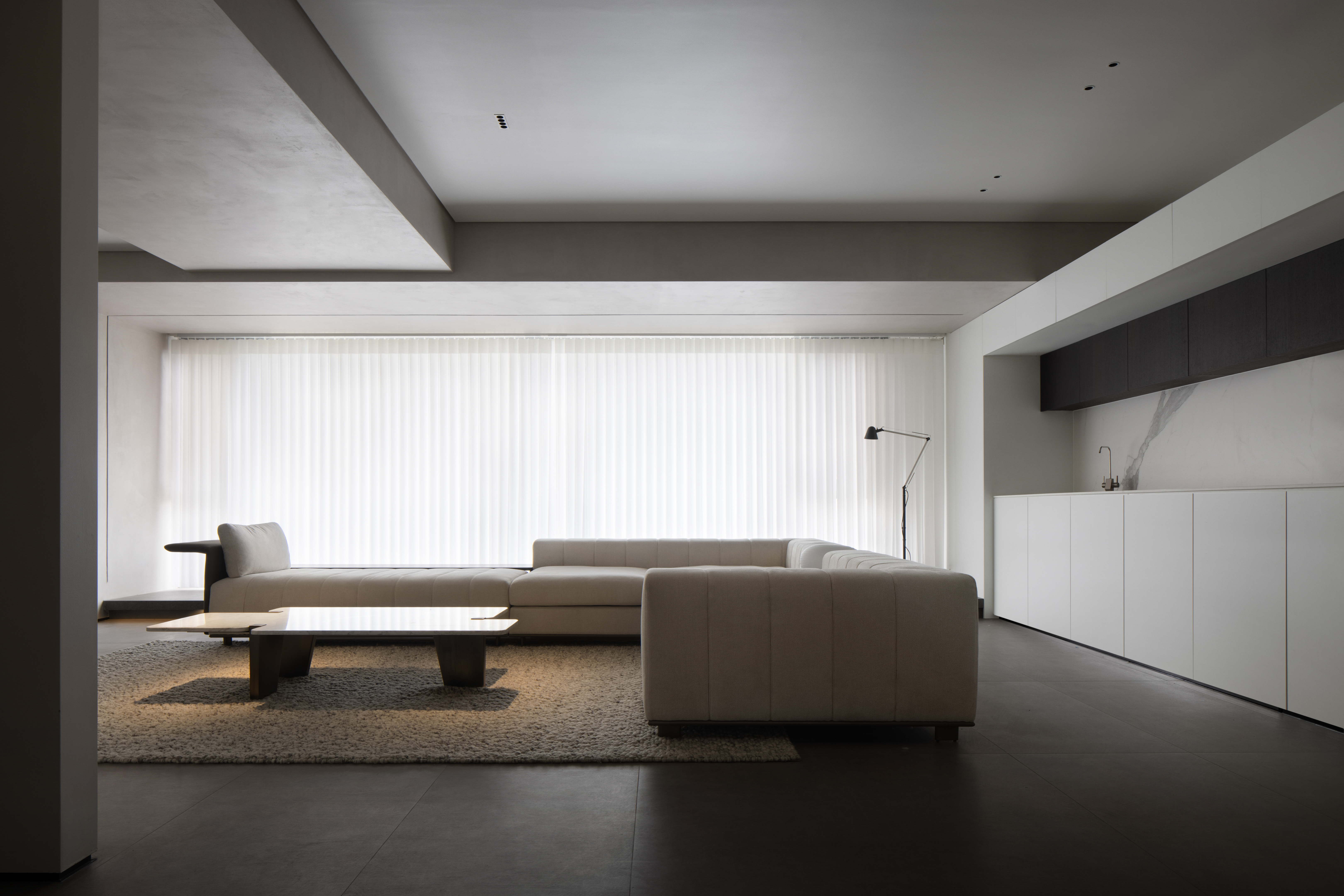 在客厅布局中,以大片落地窗形式与低位沙发呈现,阳光由此可照射至整体空间中,确保室内可视性,白色电视机柜体以及灰色的结构体块相结合,色彩协调淡雅,在阳光下呈现出一种宁静且明亮的氛围。