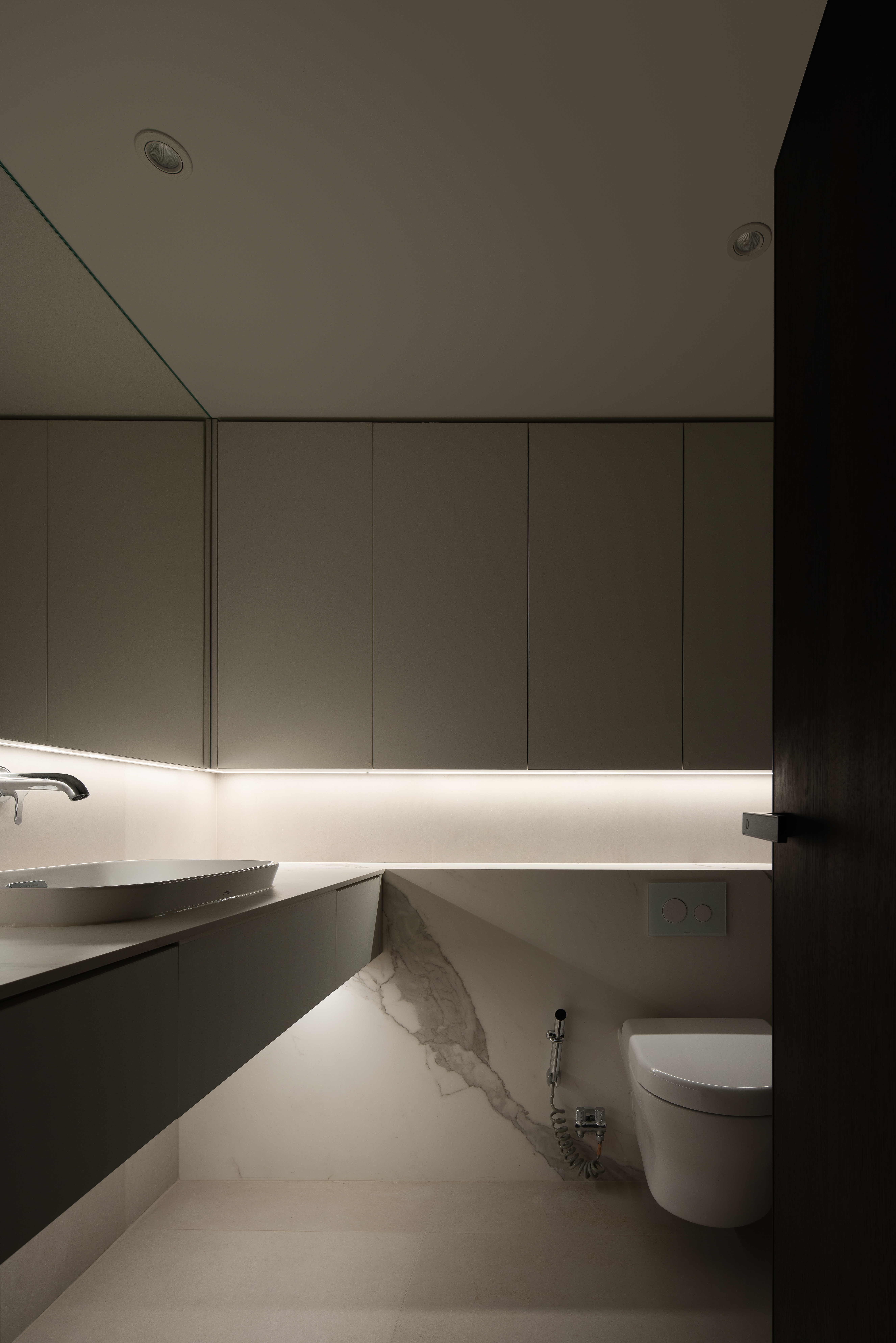 入户大理石造型在满足美学功能的同时也兼顾换鞋凳的实用性功能,利用悬挑的结构顺势在底部嵌入感应式灯带,巧妙地解决了门厅区域的采光问题