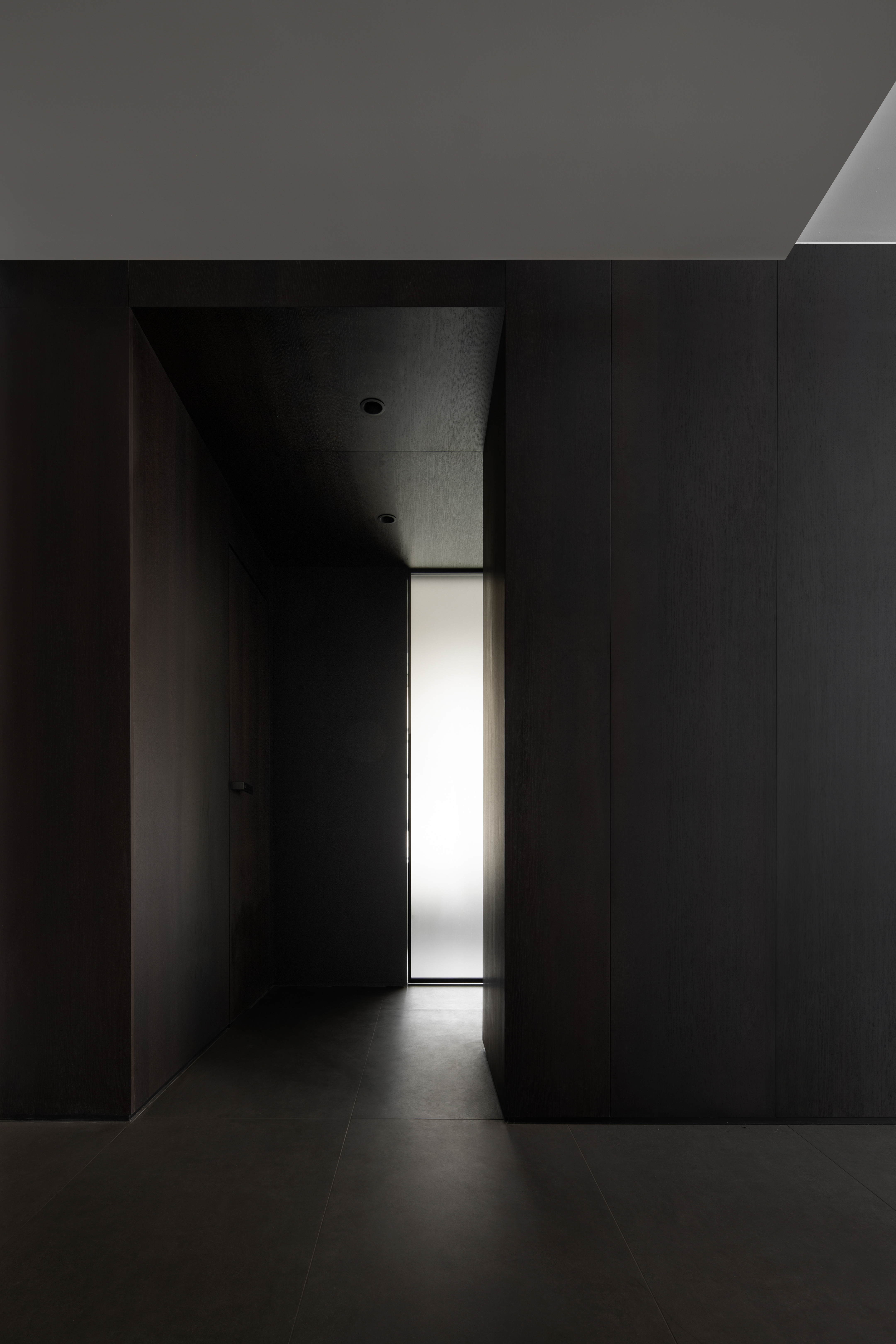 在黑色木盒体块两侧“挖洞”,将原有墙体包裹在结构之中,保持结构完整性的的同时形成过道空间,顺应墙体结构将日常生活的收纳藏于其中。