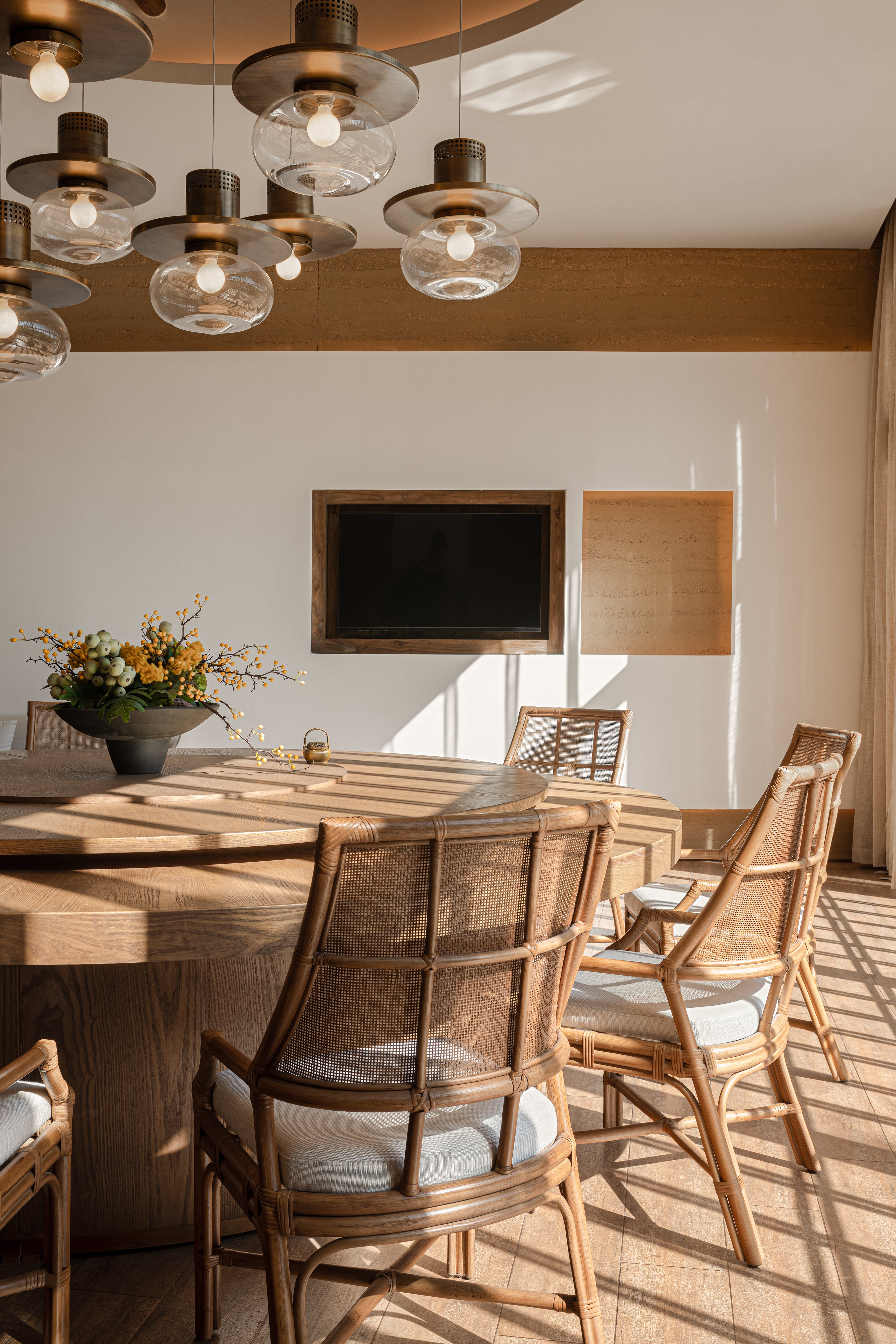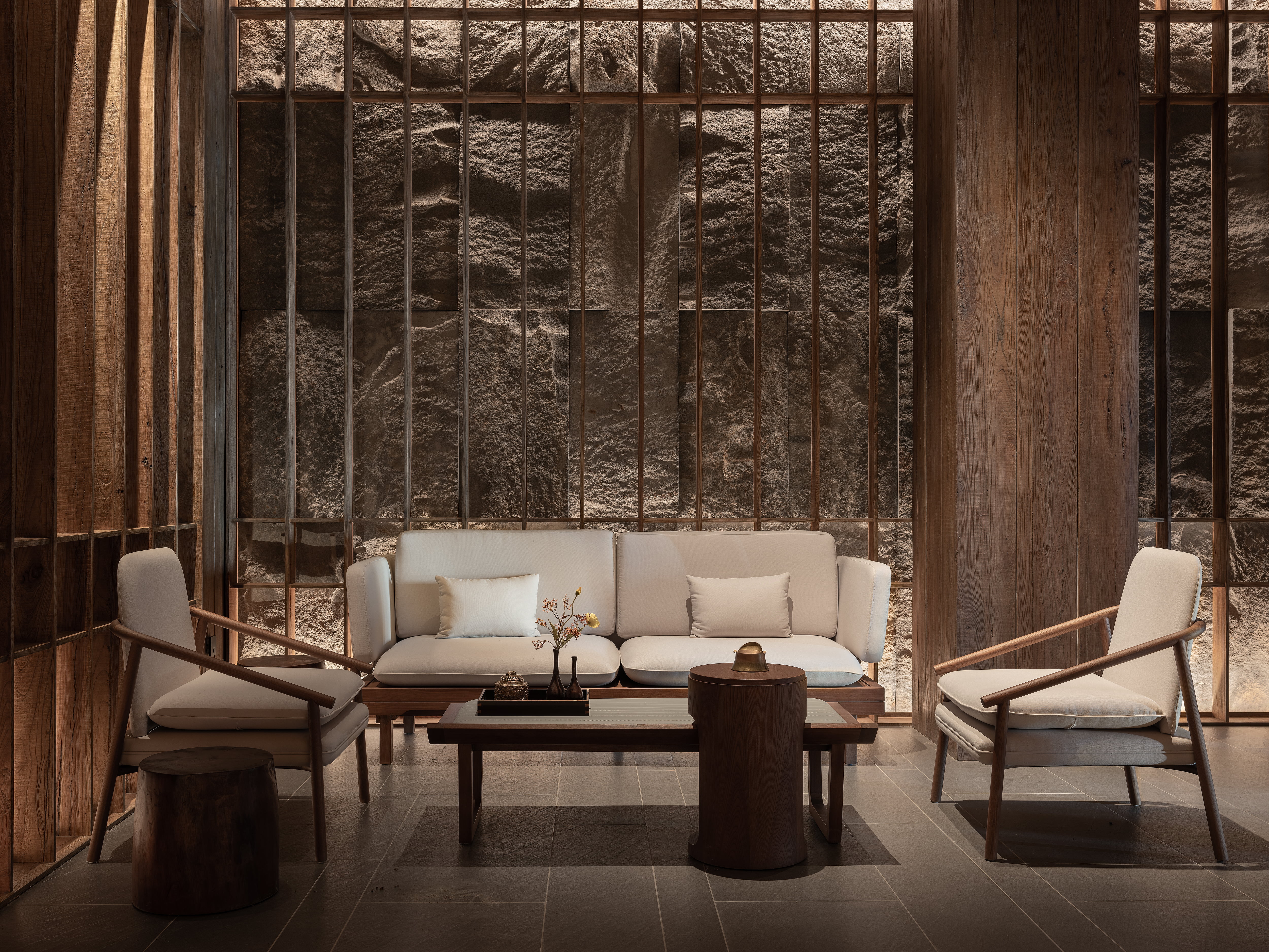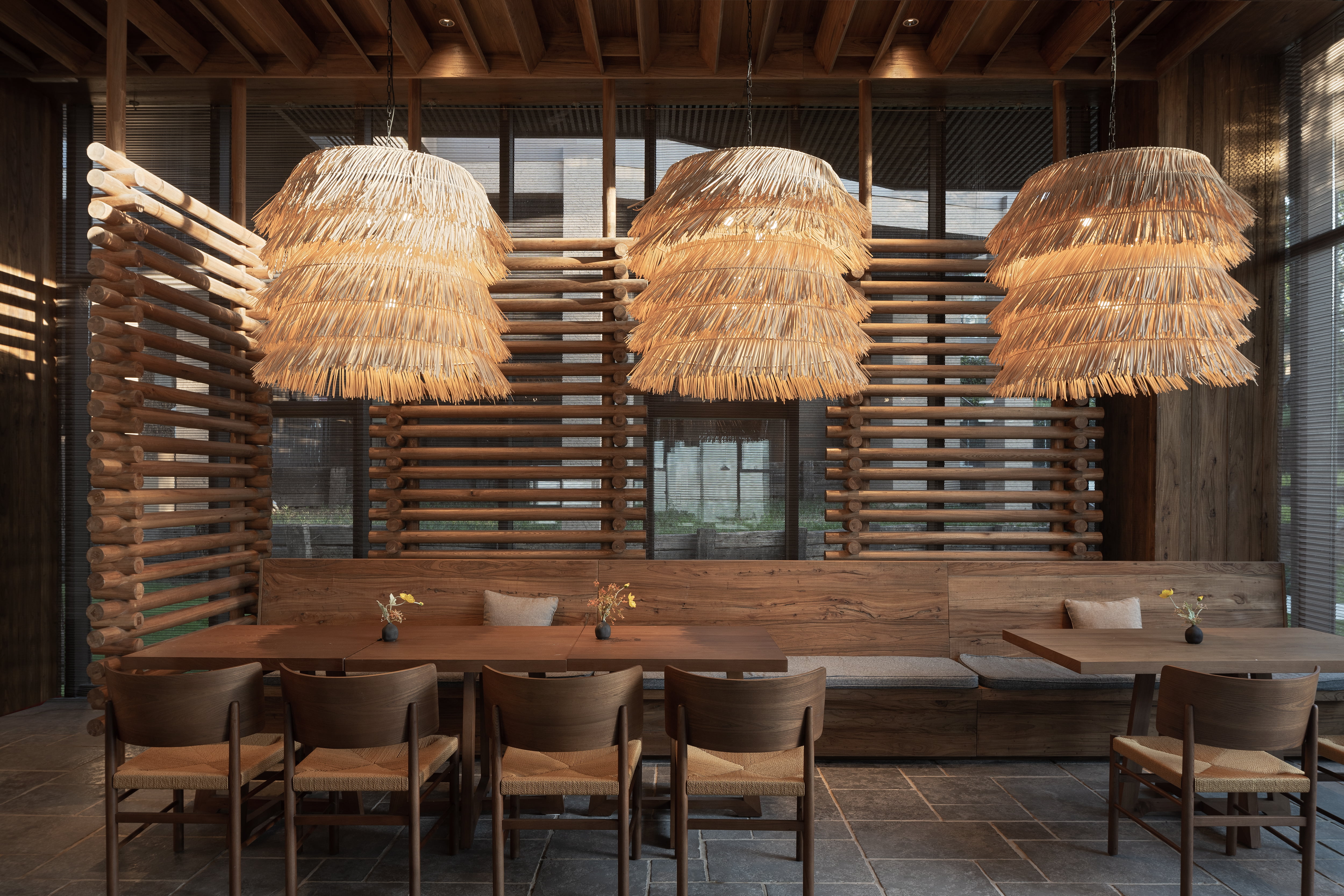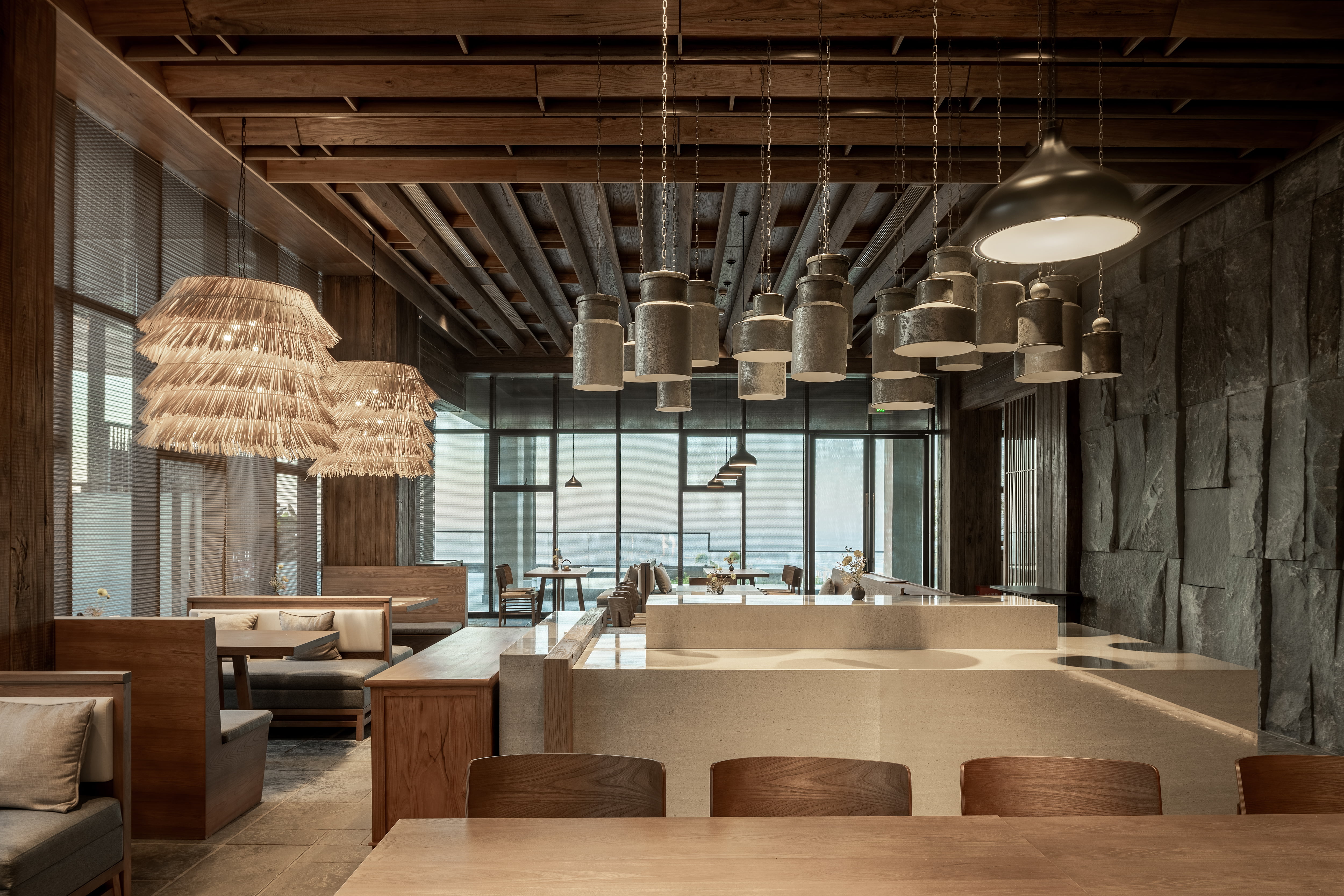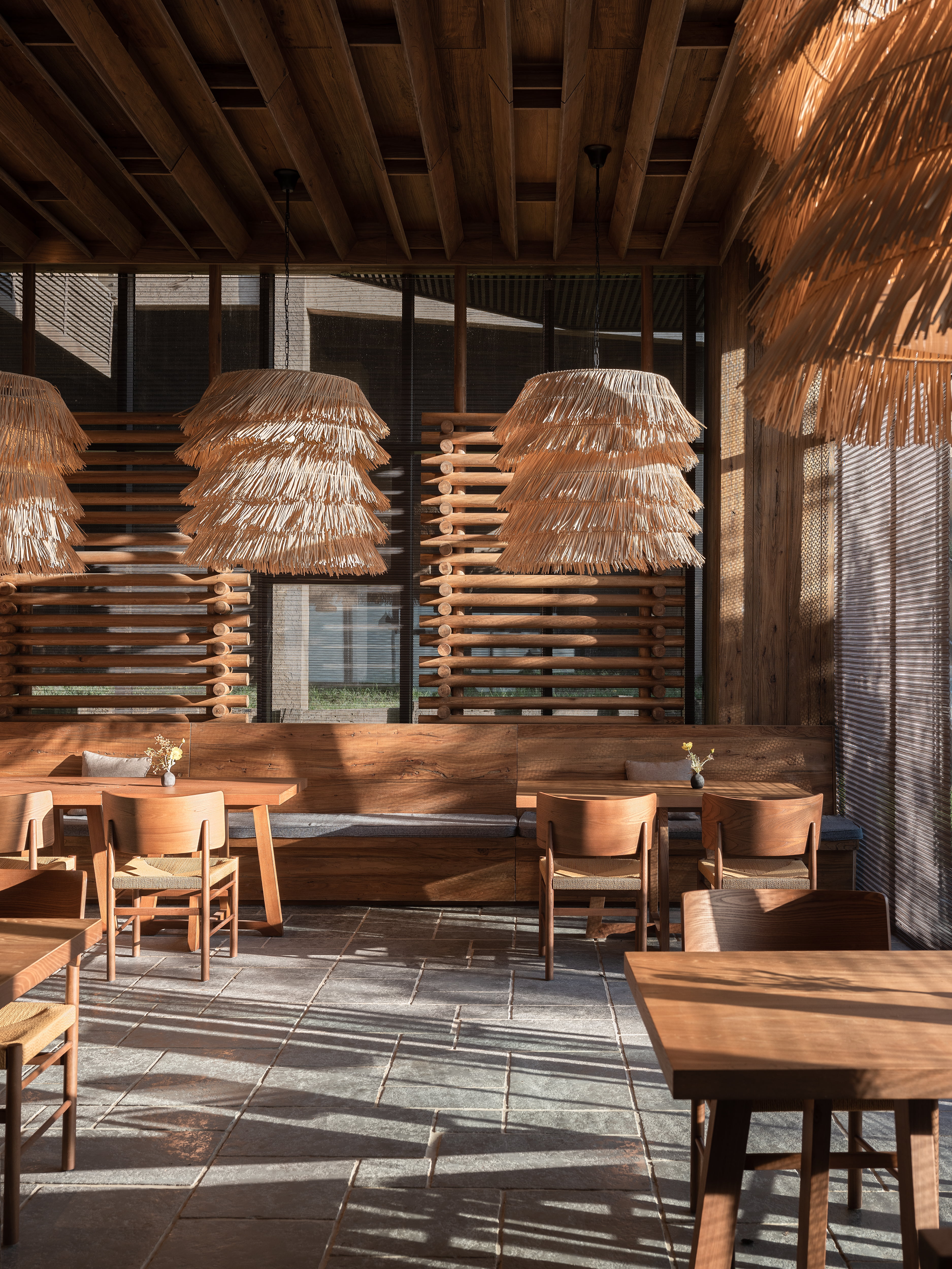 设计选材:融合了石材、瓦片、藤编等天然材质